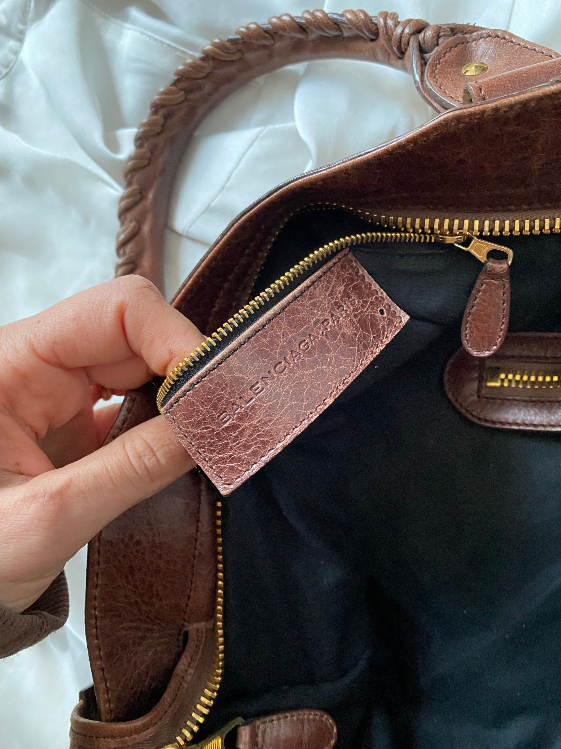 Iconica balenciaga city color chataigne f/w 2009 in giant hardware 21 gold. colore rinvigorito, qualche segno sulla pelle e leggerissimo scurimento dei manici. Cordino e hardware perfetti. buonissime condizioni generali.