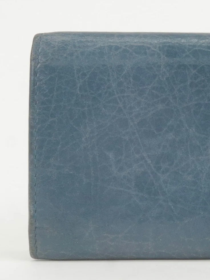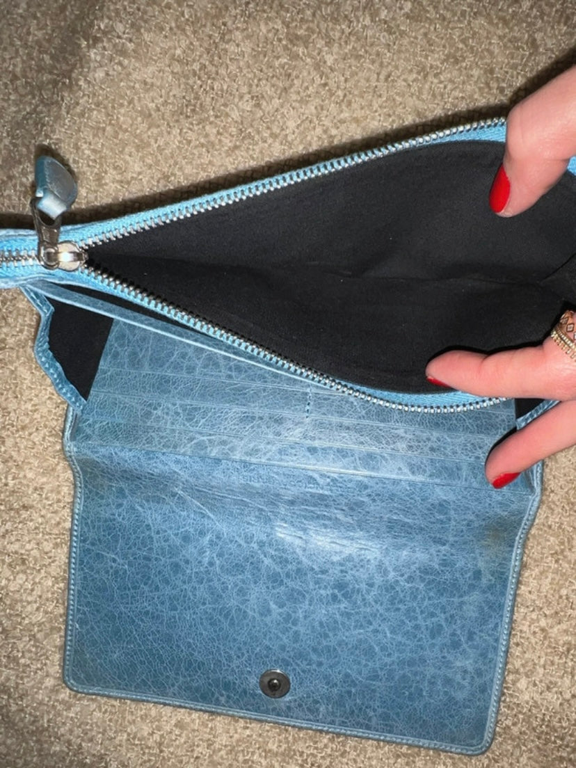 Balenciaga sky blue city mini wallet on chain ☁️👼 Catena aggiunta. Qualche segno sulla pelle, ma come tutte le balenciaga l’effetto distressed è ancora più bello. Colore blu indaco, hardware argento. Entra un iPhone 15, carte e bancomat. Bellissima!