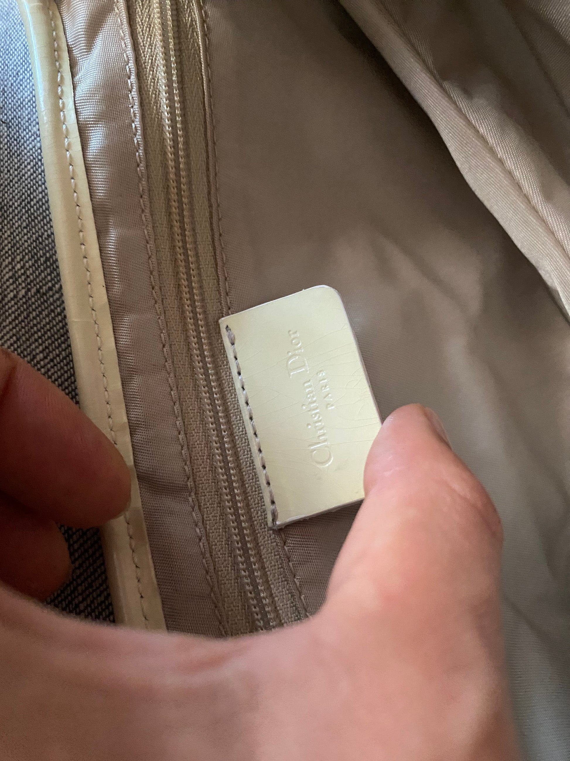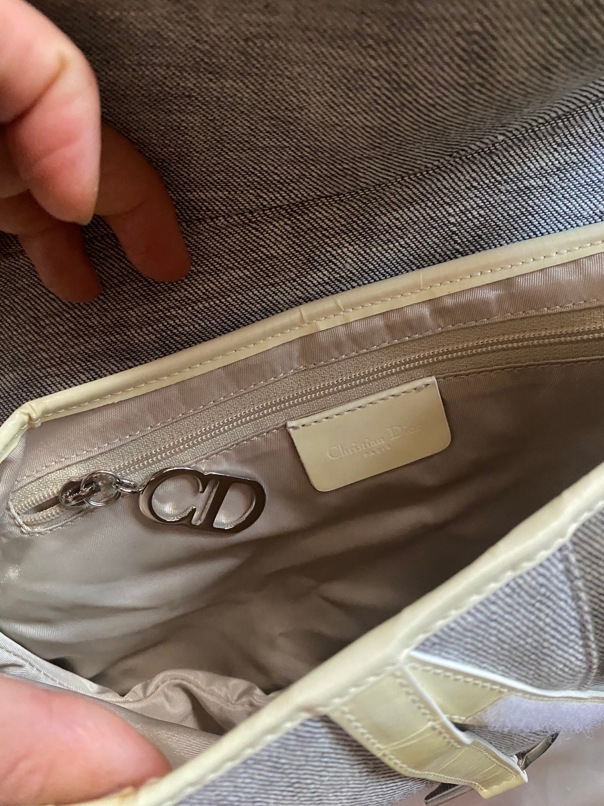 iconica dior saddle in denim grigio e pelle verniciata burro. Usata con qualche segno sulla parte in vernice (foto), buonissime condizioni generali.