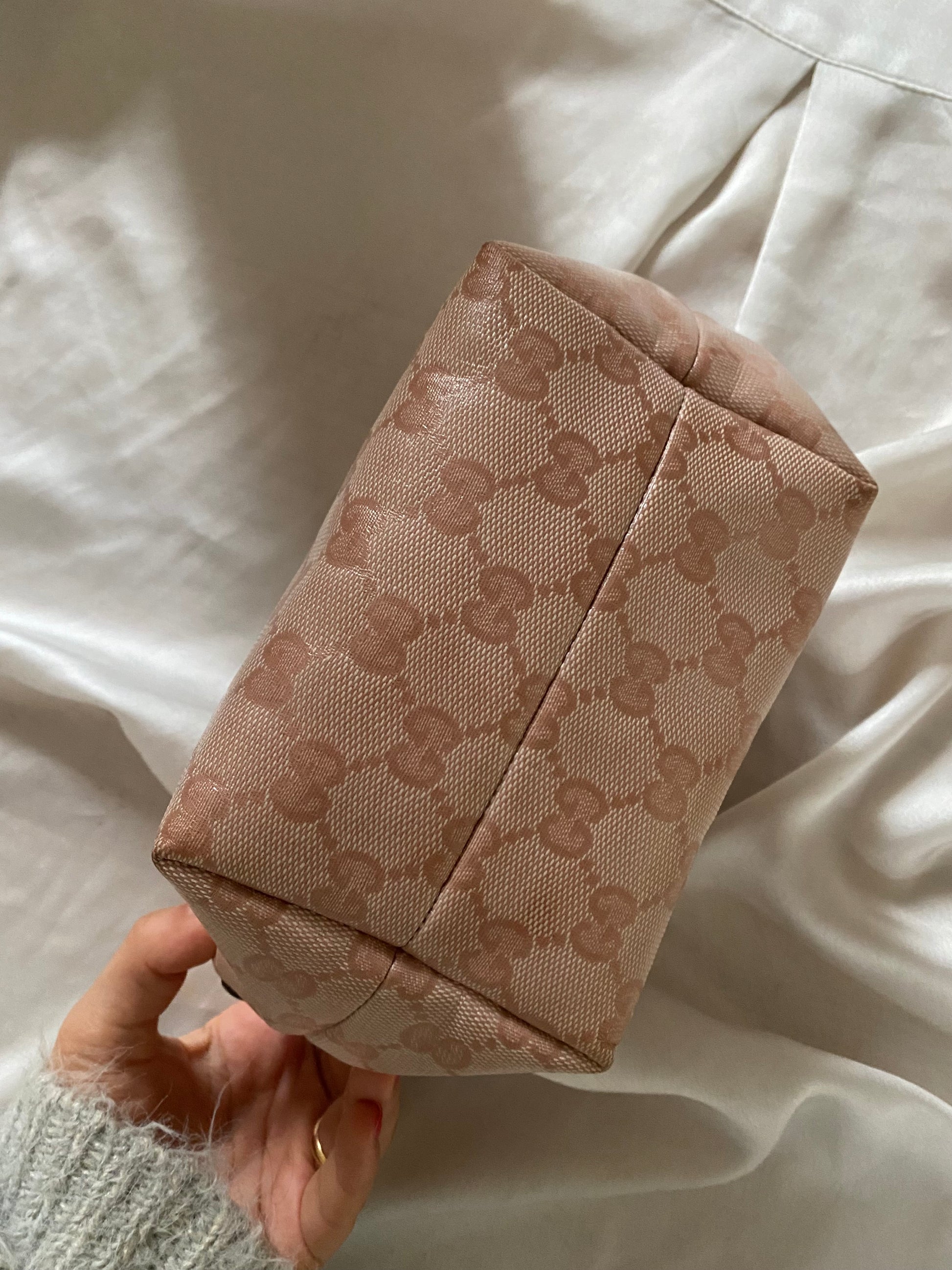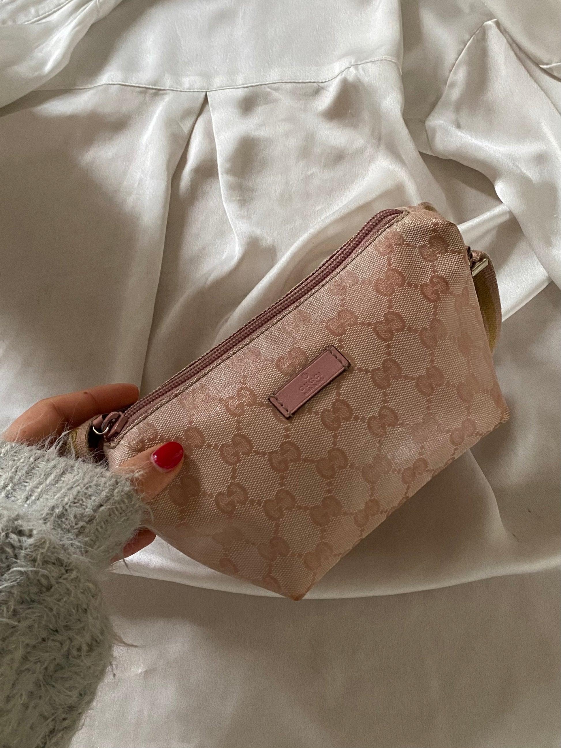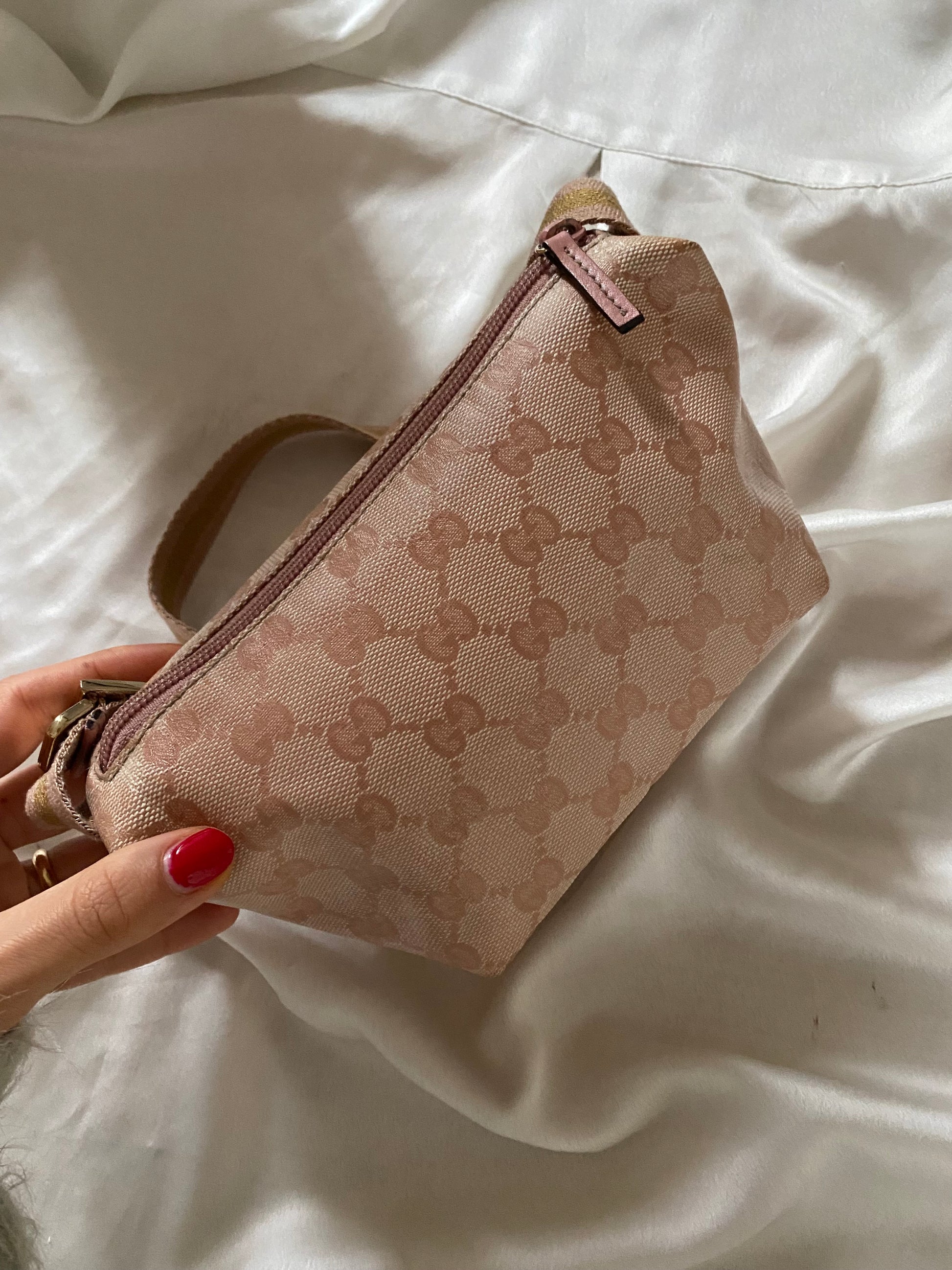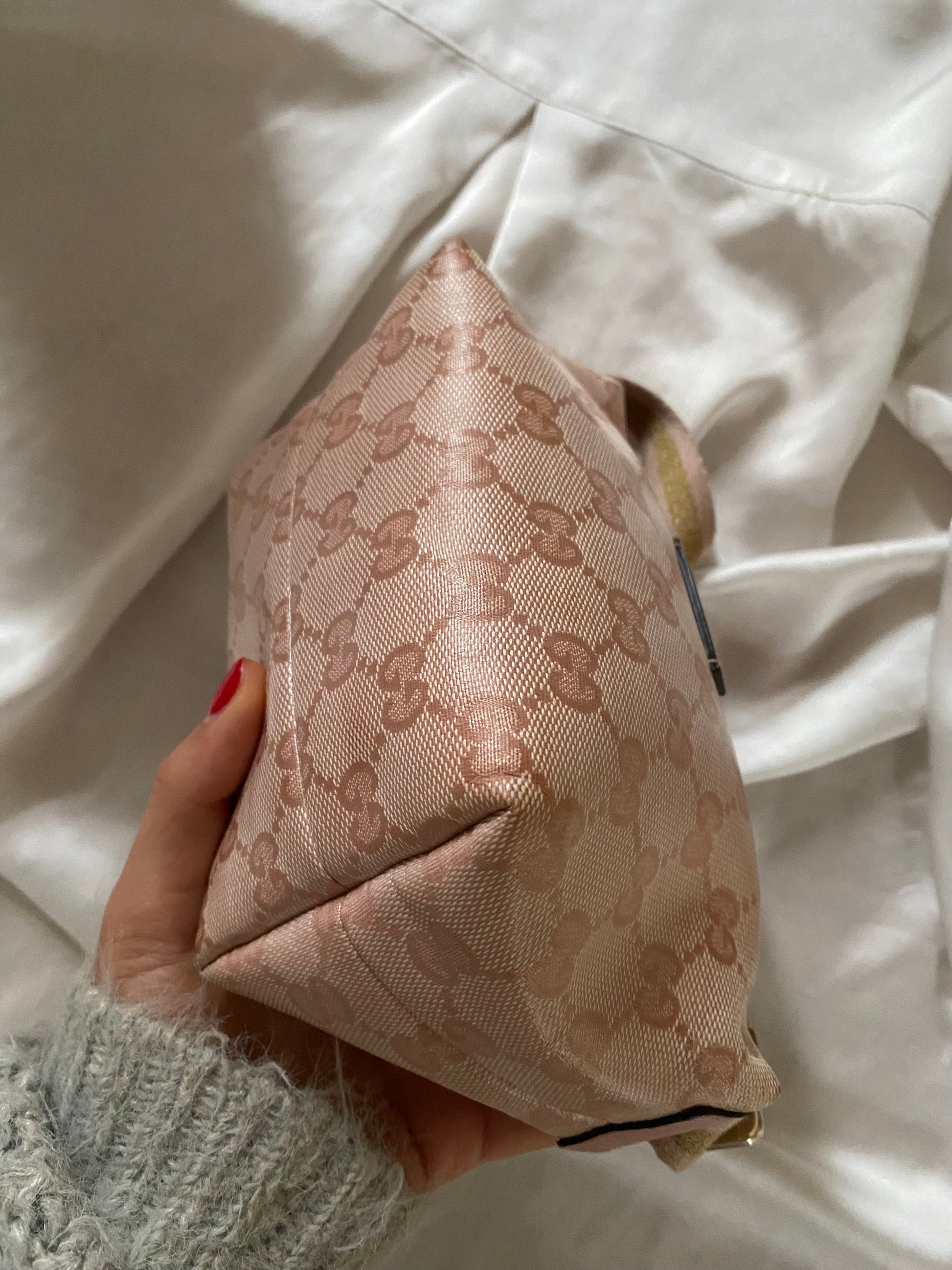 Stupenda Gucci crystal cosmetic case in monogram rosa. Tela cerata. Piccola e bellissima ma molto spaziosa. Ottime condizioni. Si porta a spalla o a mano regolando il laccio (no tracolla). Con la sua dustbag/tote.