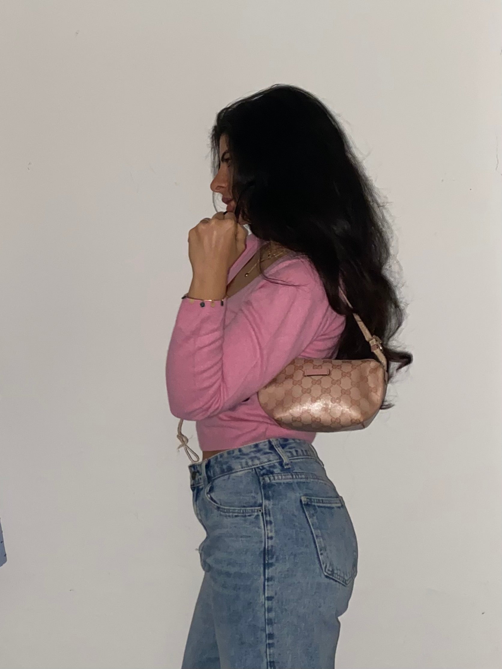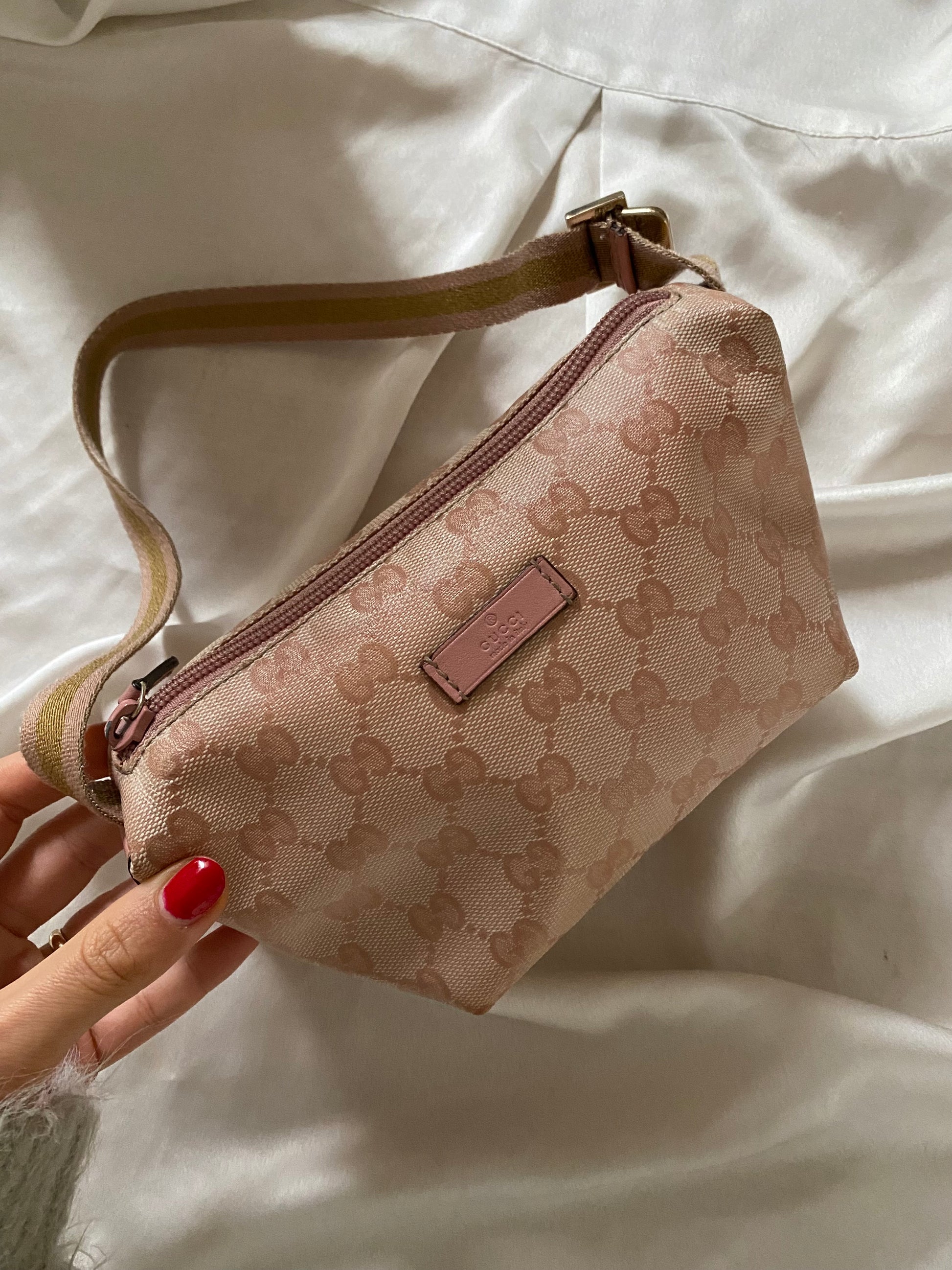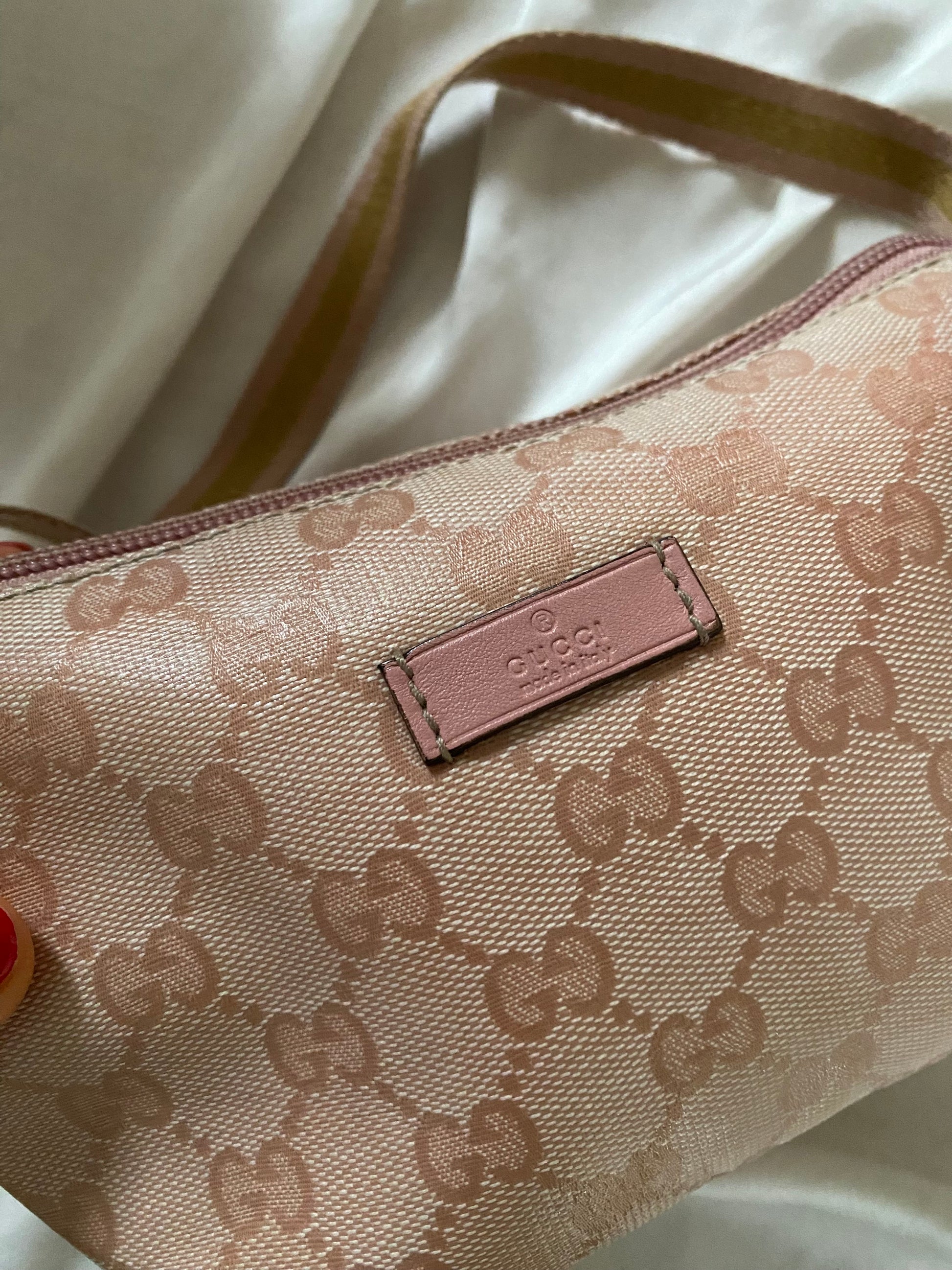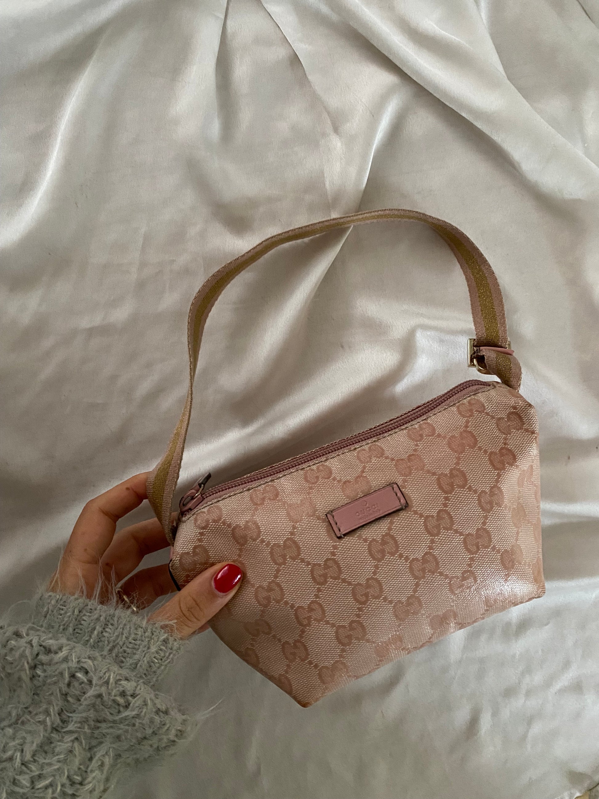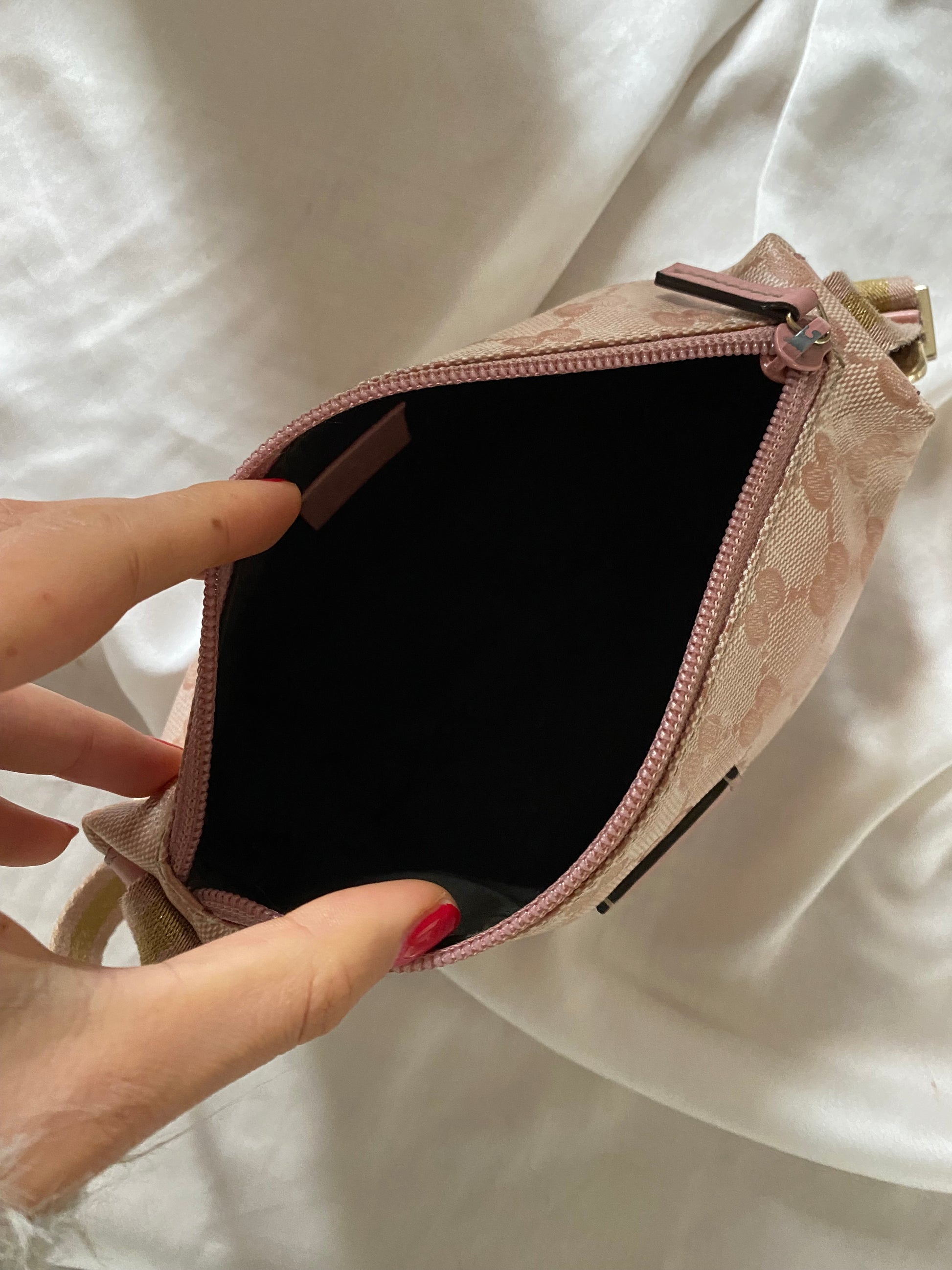 Stupenda Gucci crystal cosmetic case in monogram rosa. Tela cerata. Piccola e bellissima ma molto spaziosa. Ottime condizioni. Si porta a spalla o a mano regolando il laccio (no tracolla). Con la sua dustbag/tote.