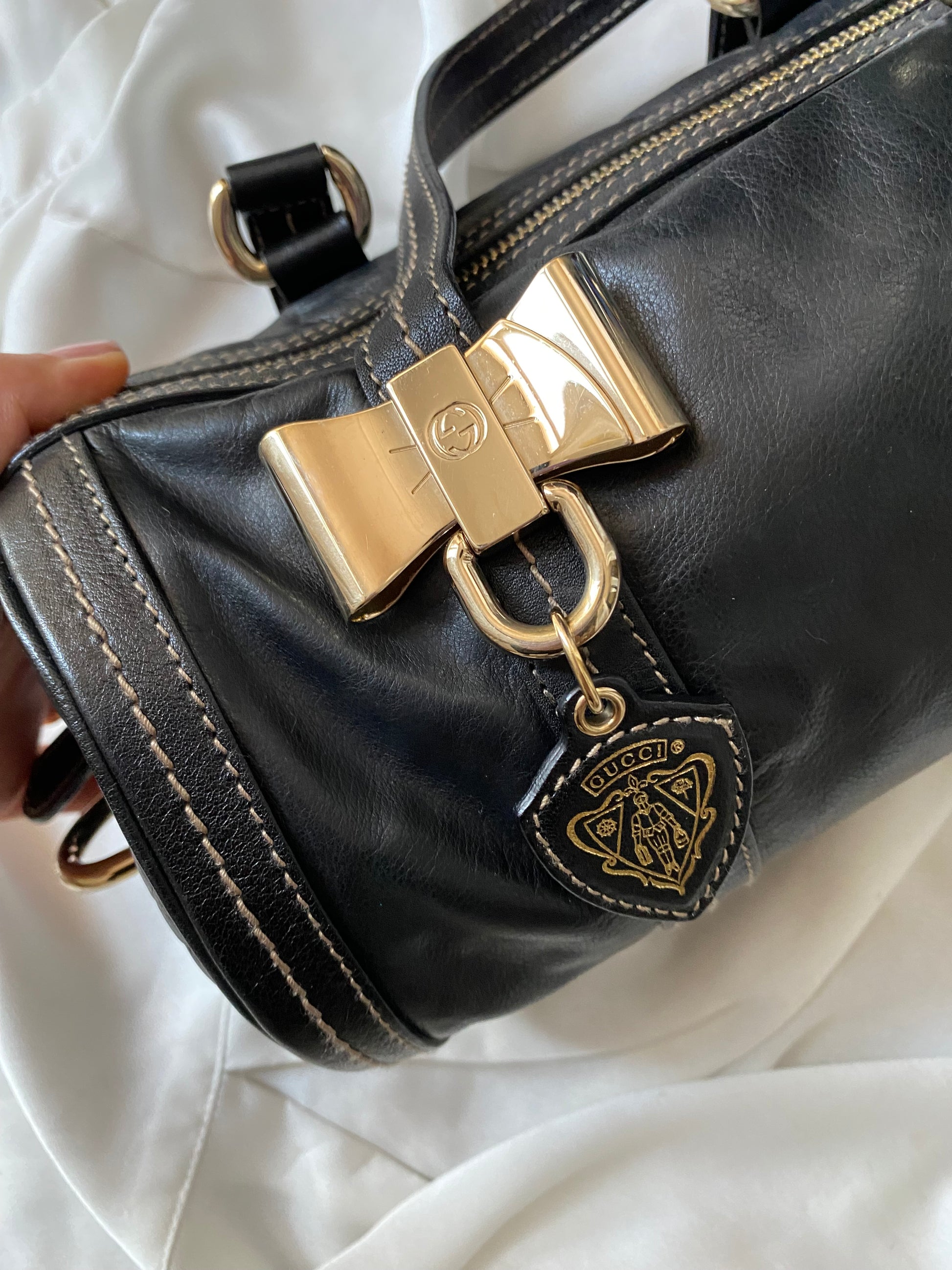 Stupenda Gucci duchessa modello boston in pelle nera. Questo modello NON prevede la tracolla, ma la precedente proprietaria ne ha fatta realizzare una per portarla a spalla o crossbody 😍