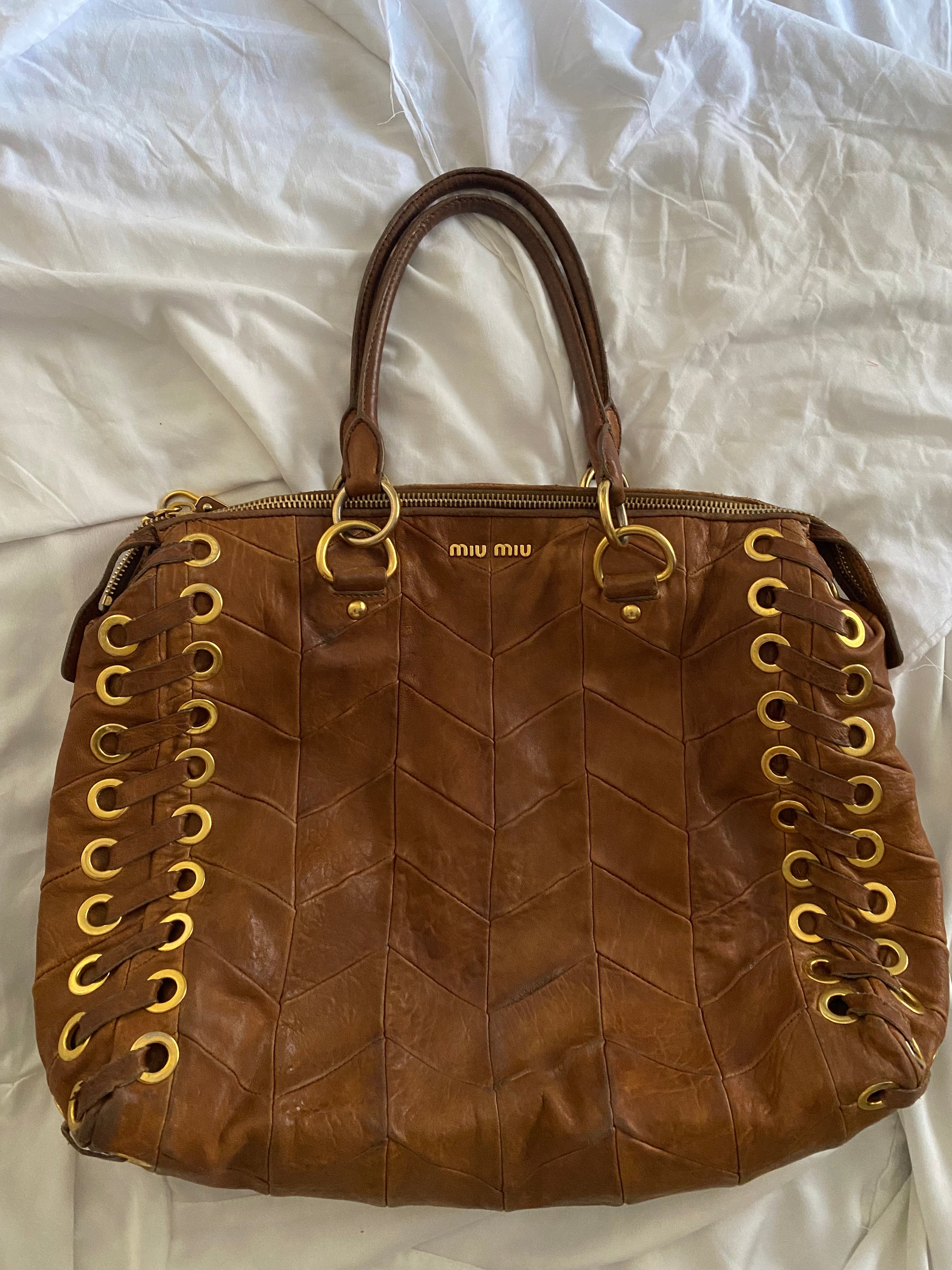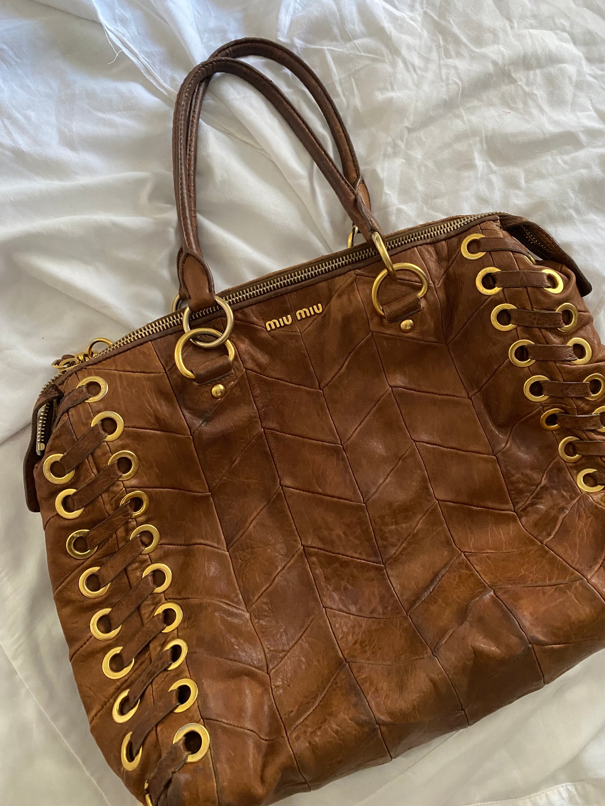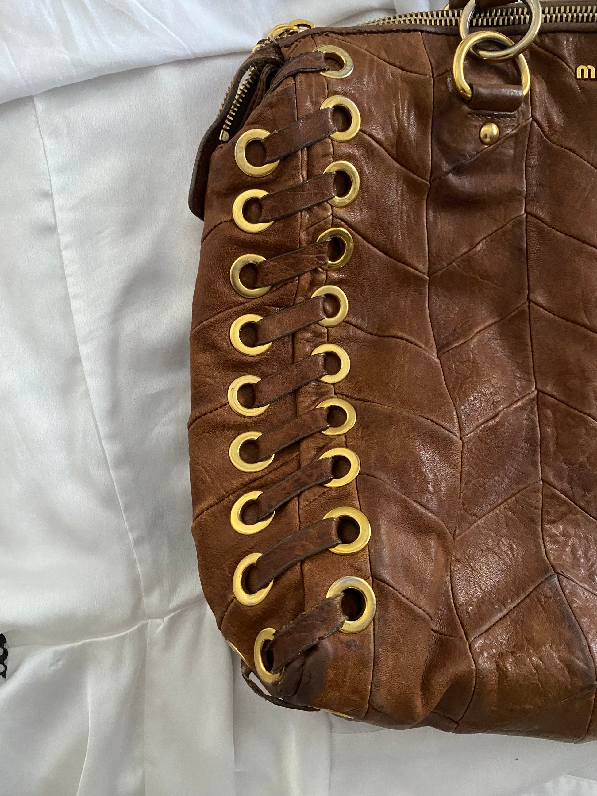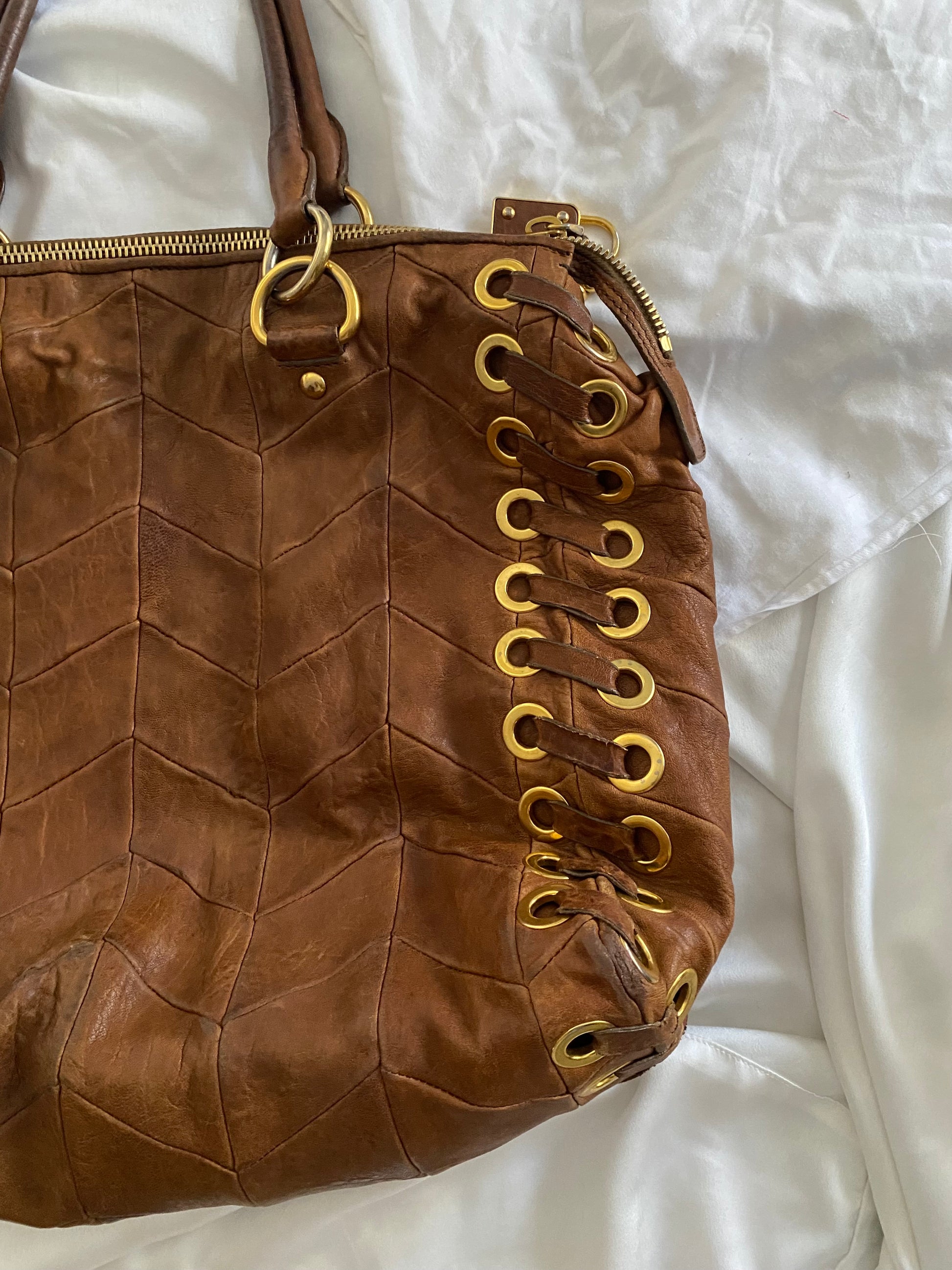 Miu Grommet Tote in pelle unica! Questa è la borsa con il potenziale da IT bag più alto di tutte 🥵 pelle nappa morbidissima, color cuoio naturale. La pelle presenta alcuni segni, irregolarità sui bordi della fettuccia in pelle laterale (corsetto) e delle parti più scure, l’effetto finale è comunque pazzesco, molto grunge, ed esattamente come vedete in foto. Si chiude con una zip ed è estremamente capiente.