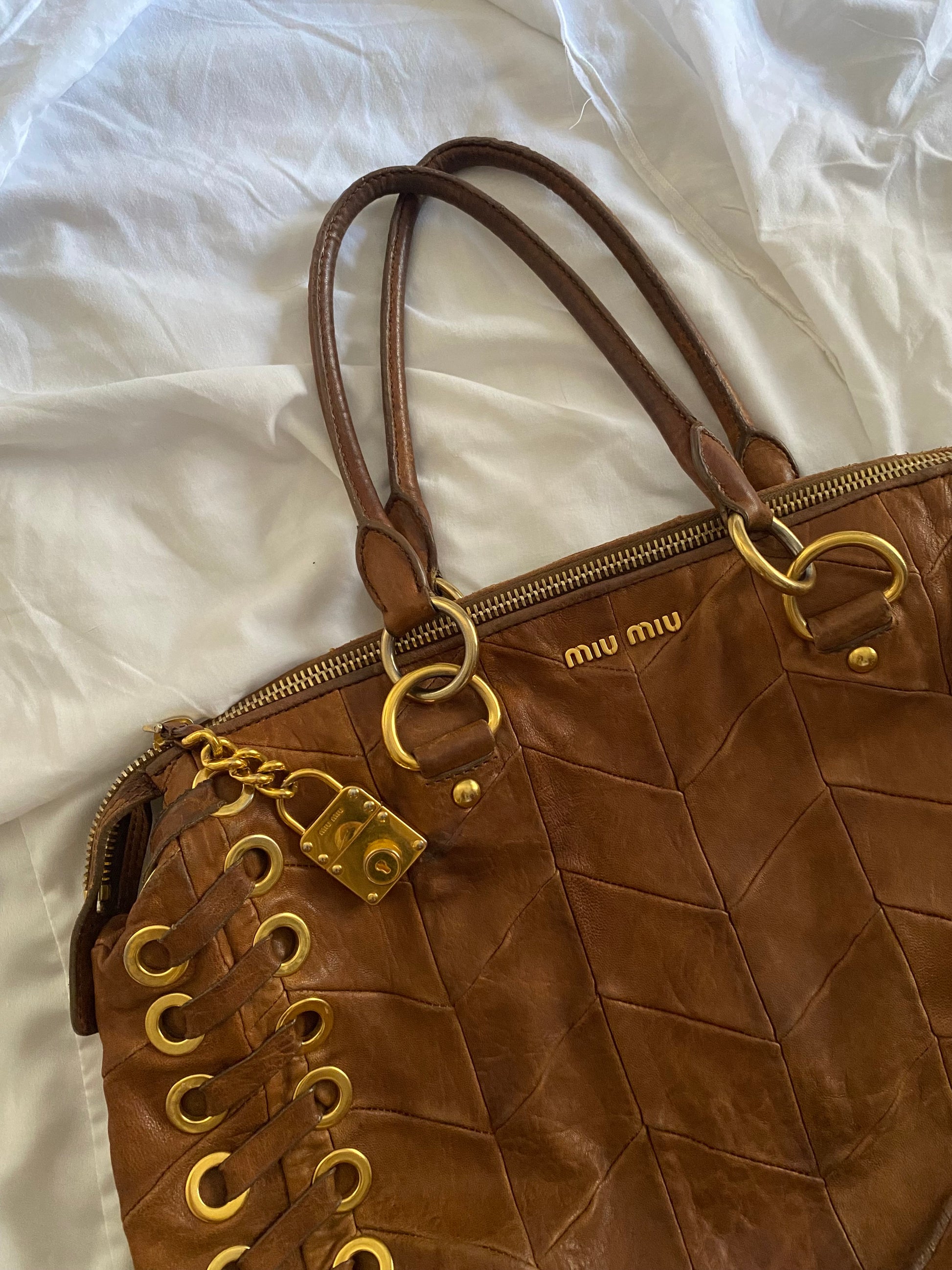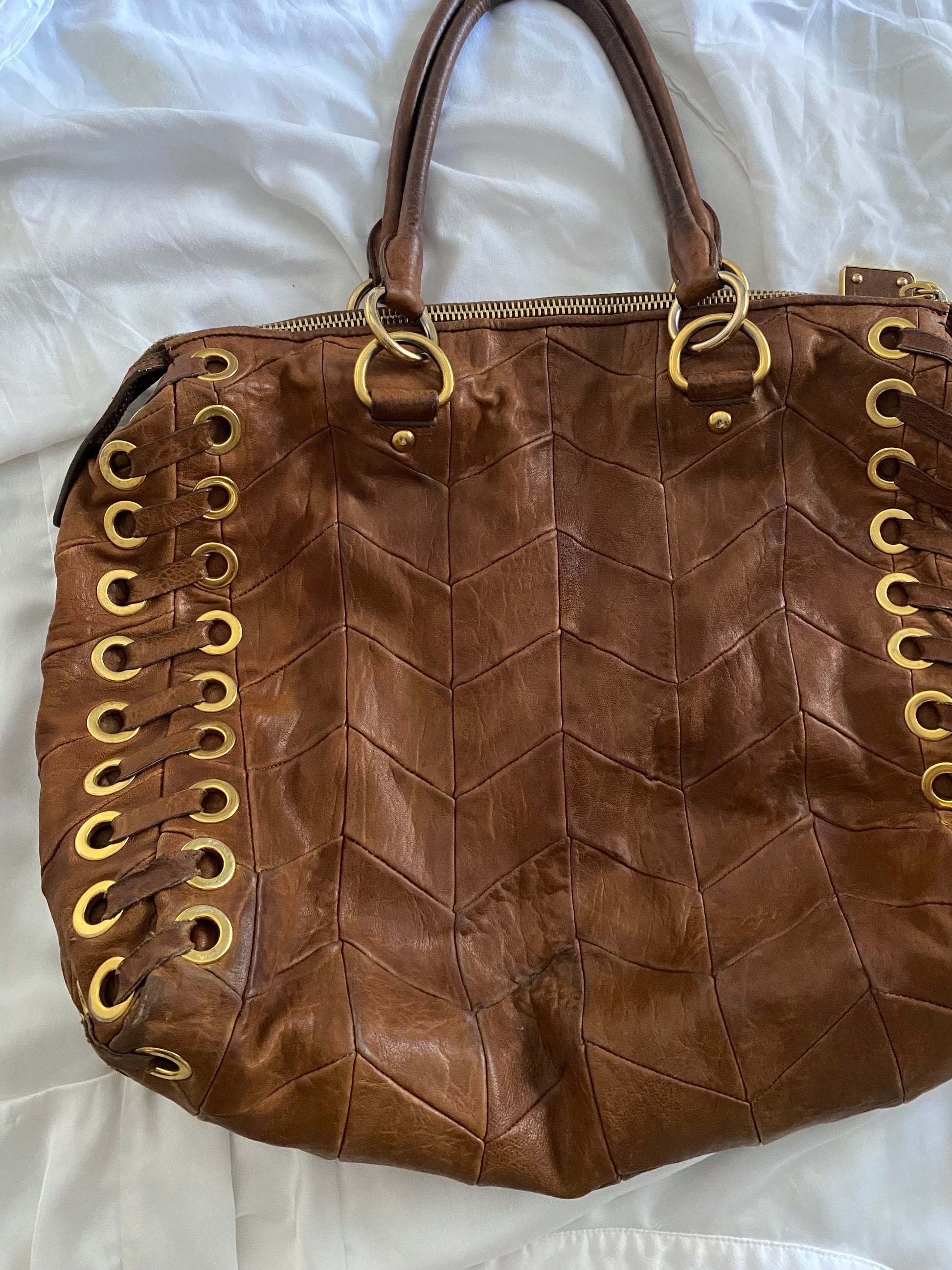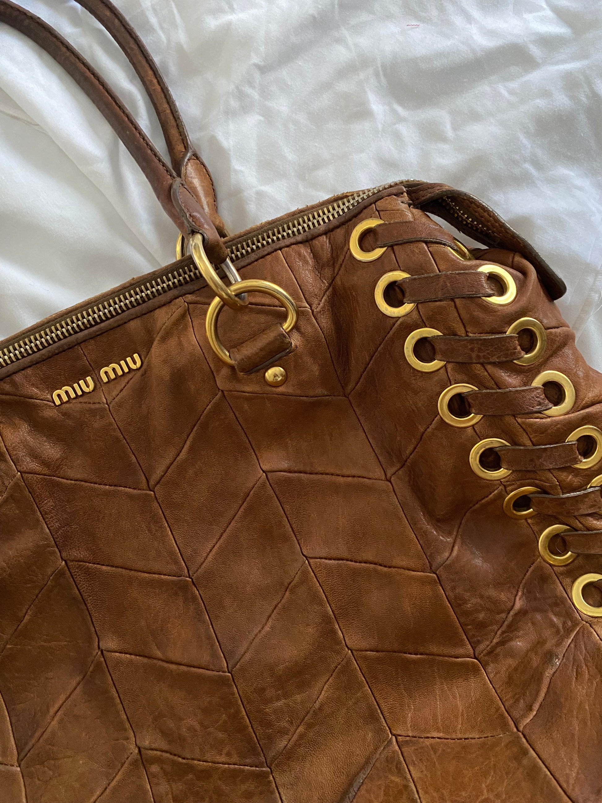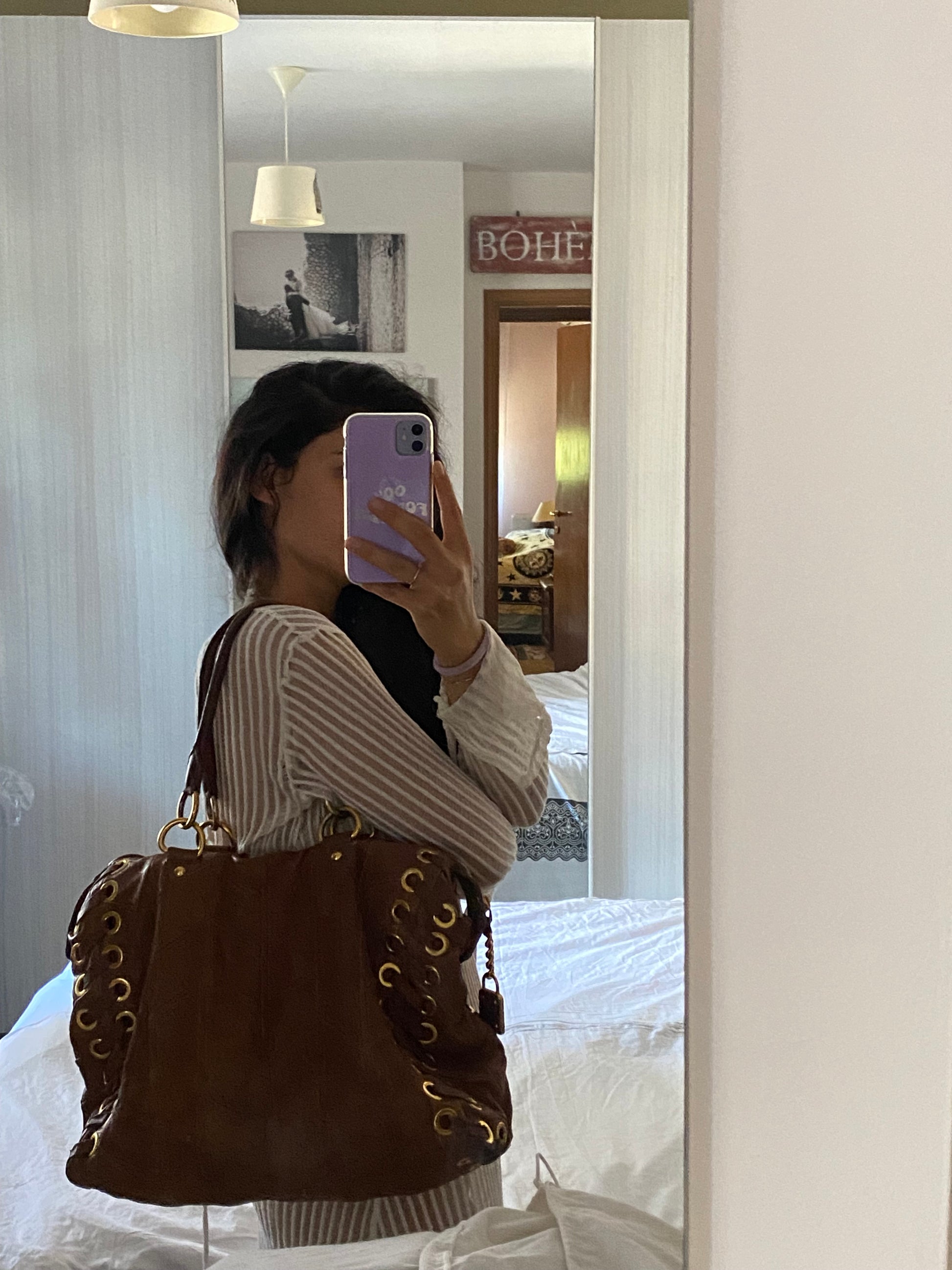 Miu Grommet Tote in pelle unica! Questa è la borsa con il potenziale da IT bag più alto di tutte 🥵 pelle nappa morbidissima, color cuoio naturale. La pelle presenta alcuni segni, irregolarità sui bordi della fettuccia in pelle laterale (corsetto) e delle parti più scure, l’effetto finale è comunque pazzesco, molto grunge, ed esattamente come vedete in foto. Si chiude con una zip ed è estremamente capiente.