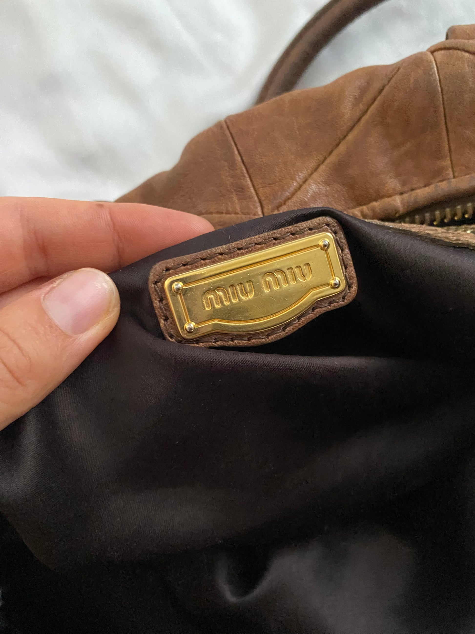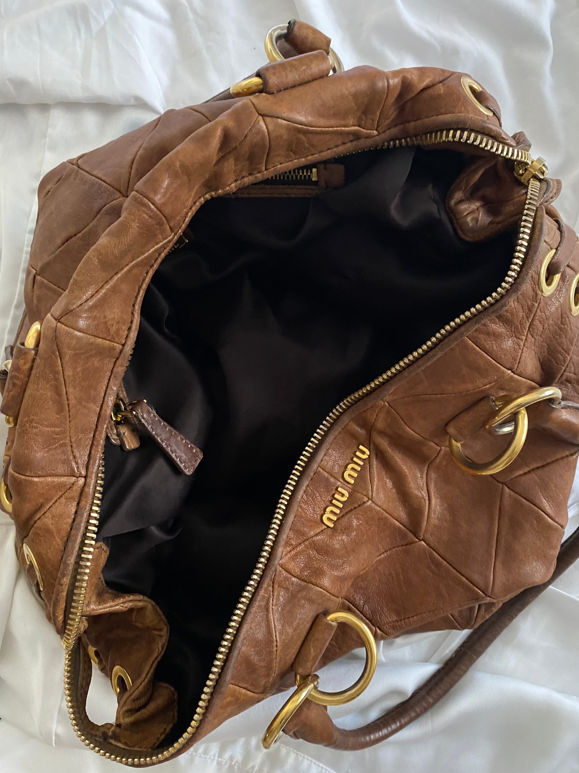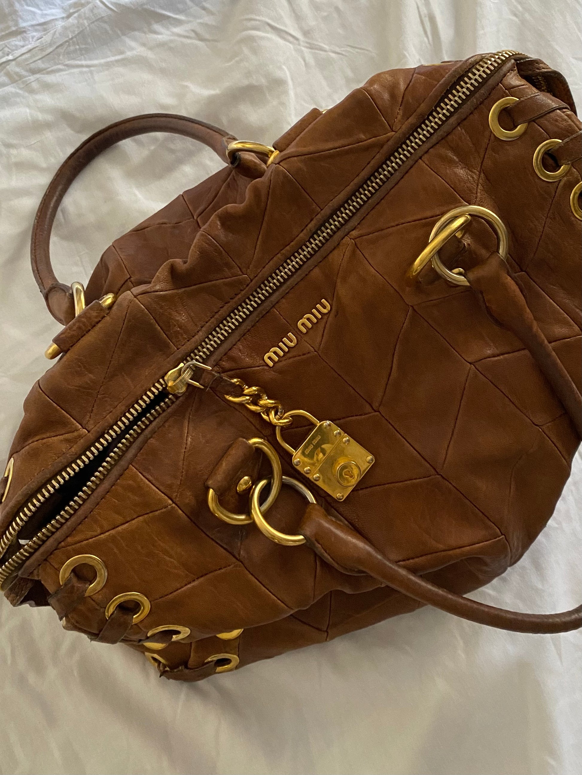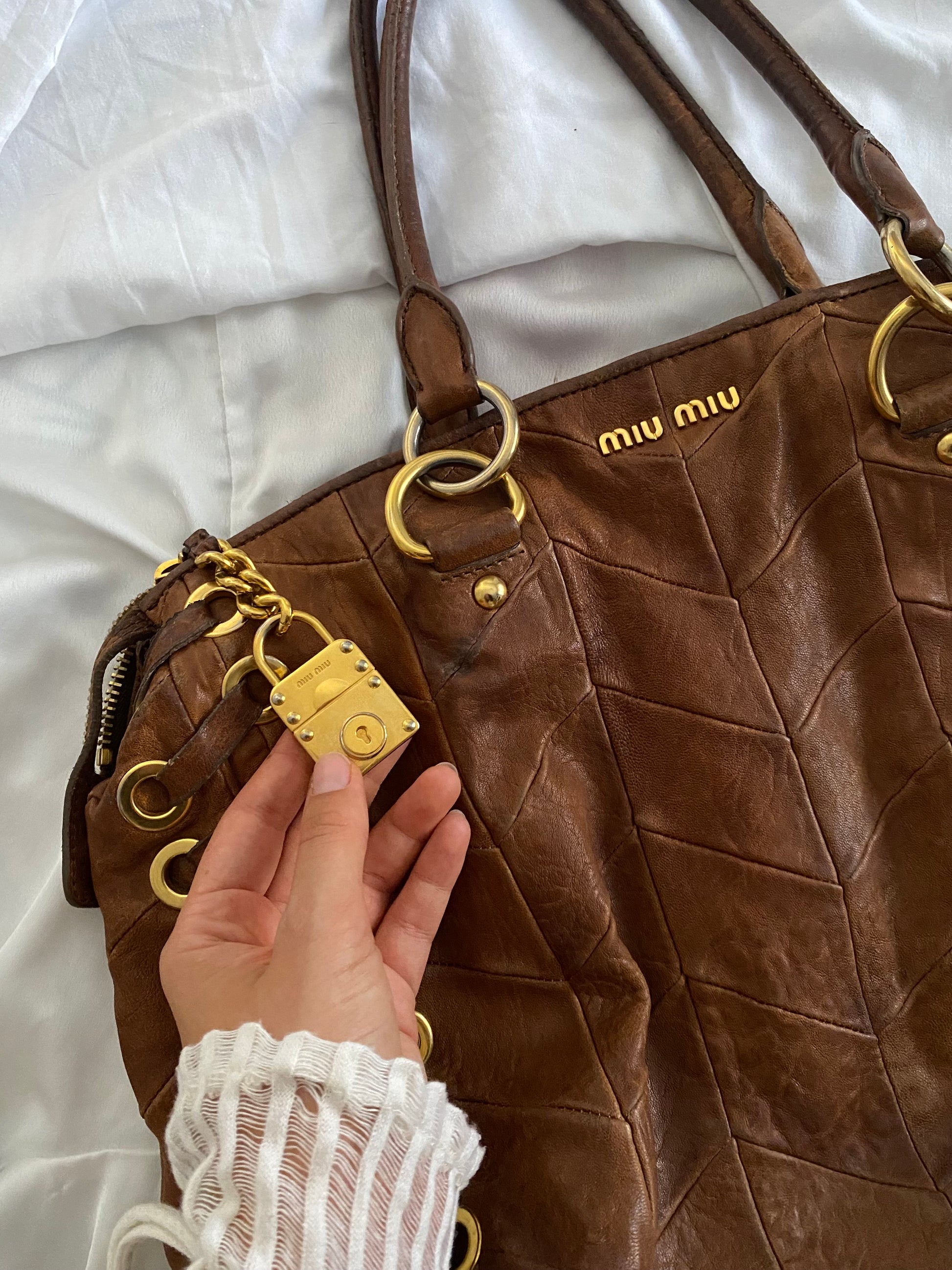 Miu Grommet Tote in pelle unica! Questa è la borsa con il potenziale da IT bag più alto di tutte 🥵 pelle nappa morbidissima, color cuoio naturale. La pelle presenta alcuni segni, irregolarità sui bordi della fettuccia in pelle laterale (corsetto) e delle parti più scure, l’effetto finale è comunque pazzesco, molto grunge, ed esattamente come vedete in foto. Si chiude con una zip ed è estremamente capiente.