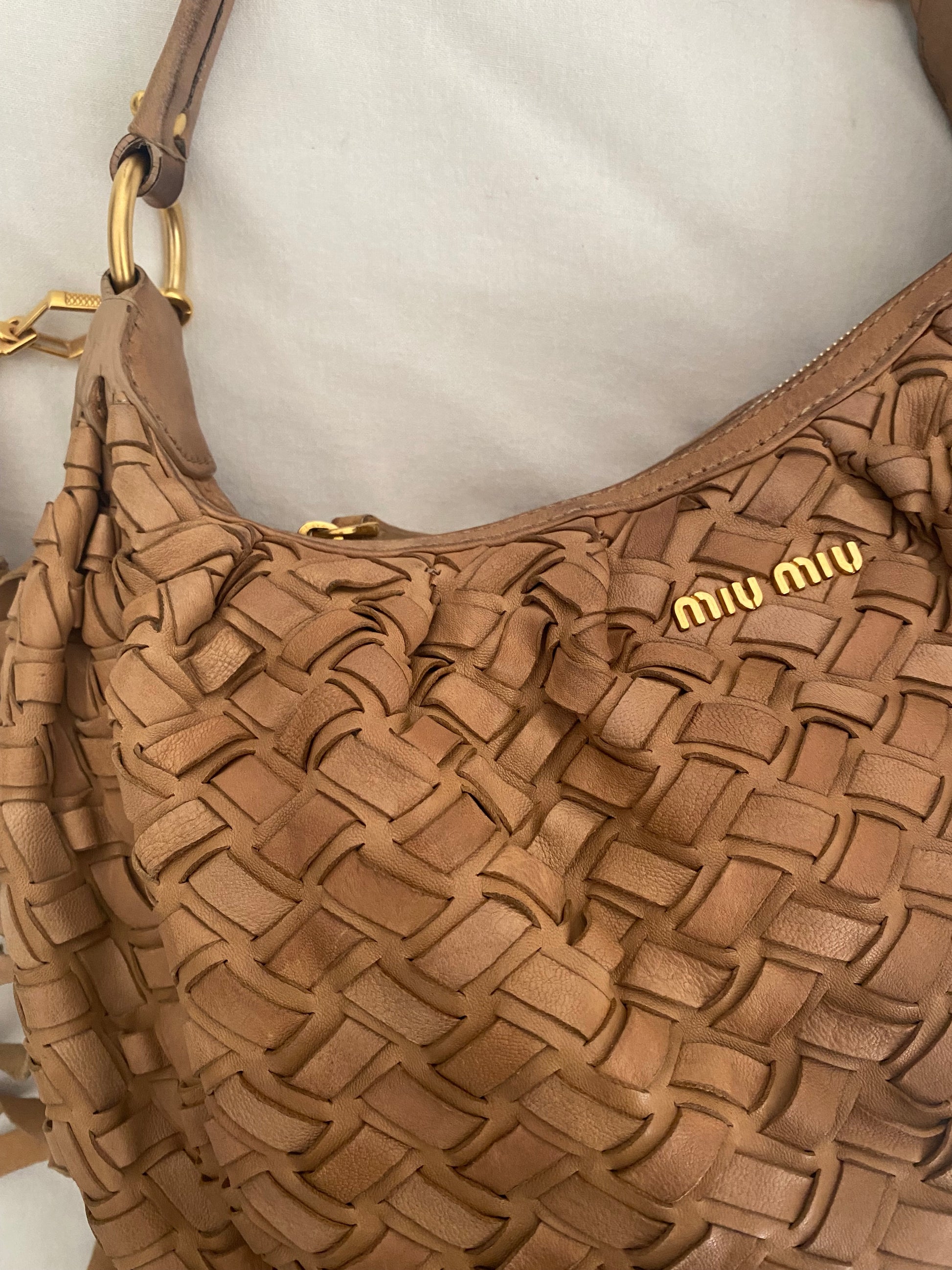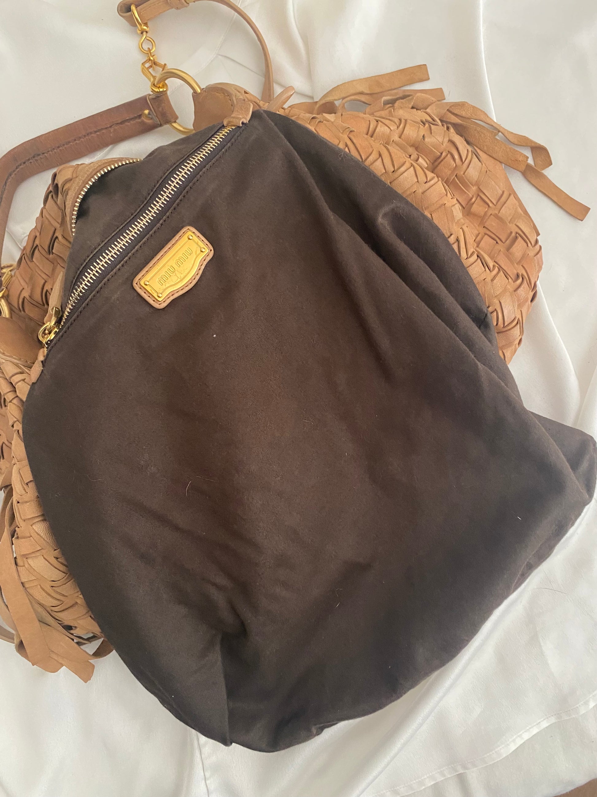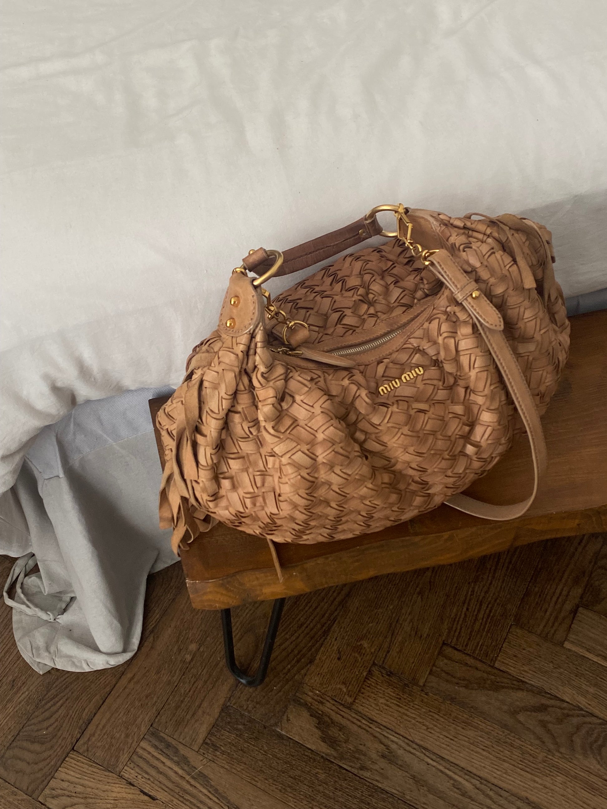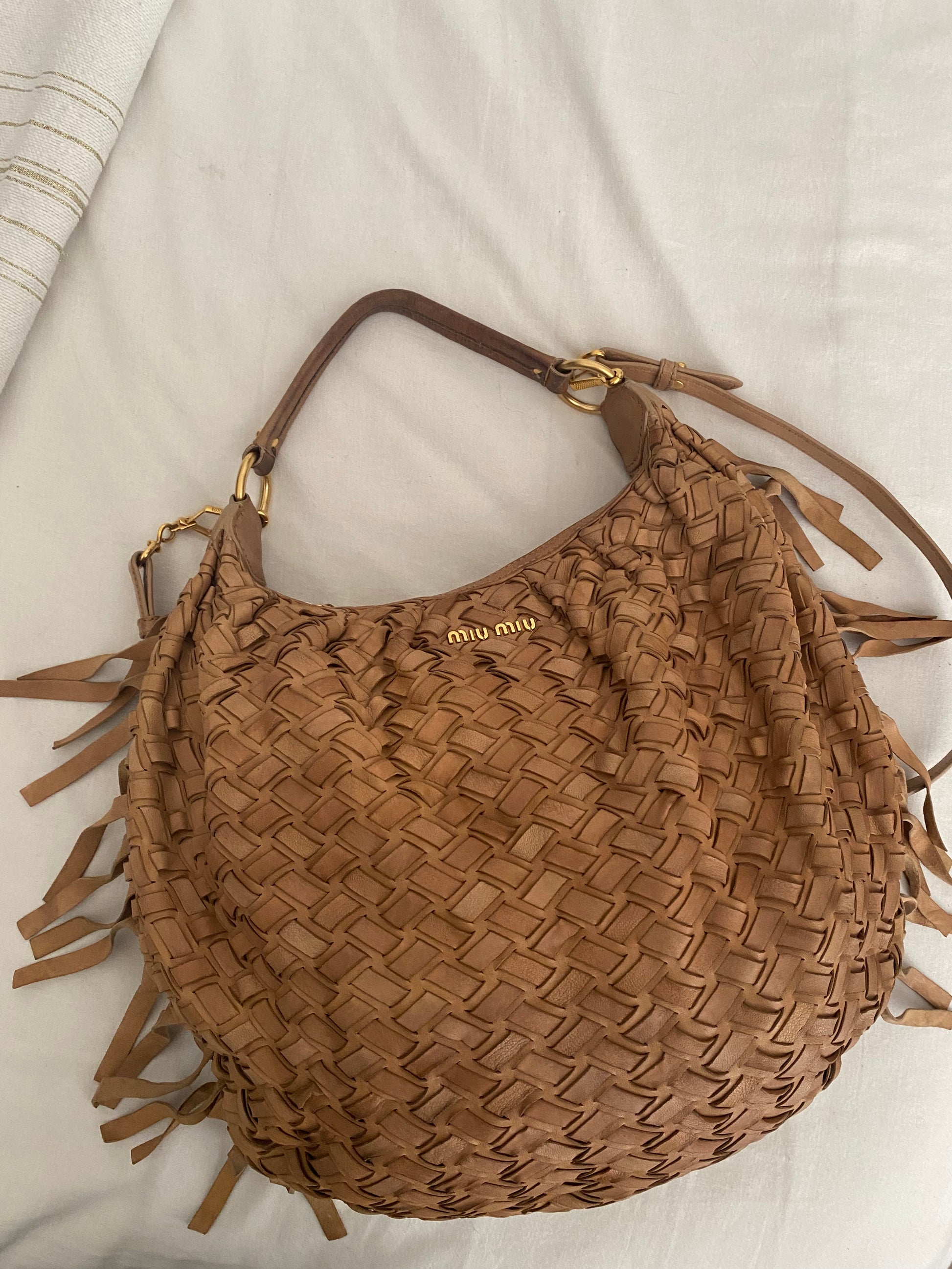 Bellissima miu miu pelle intrecciata con frange color cammello. Molto grande. Condizioni davvero molto buone. Con tracolla originale.