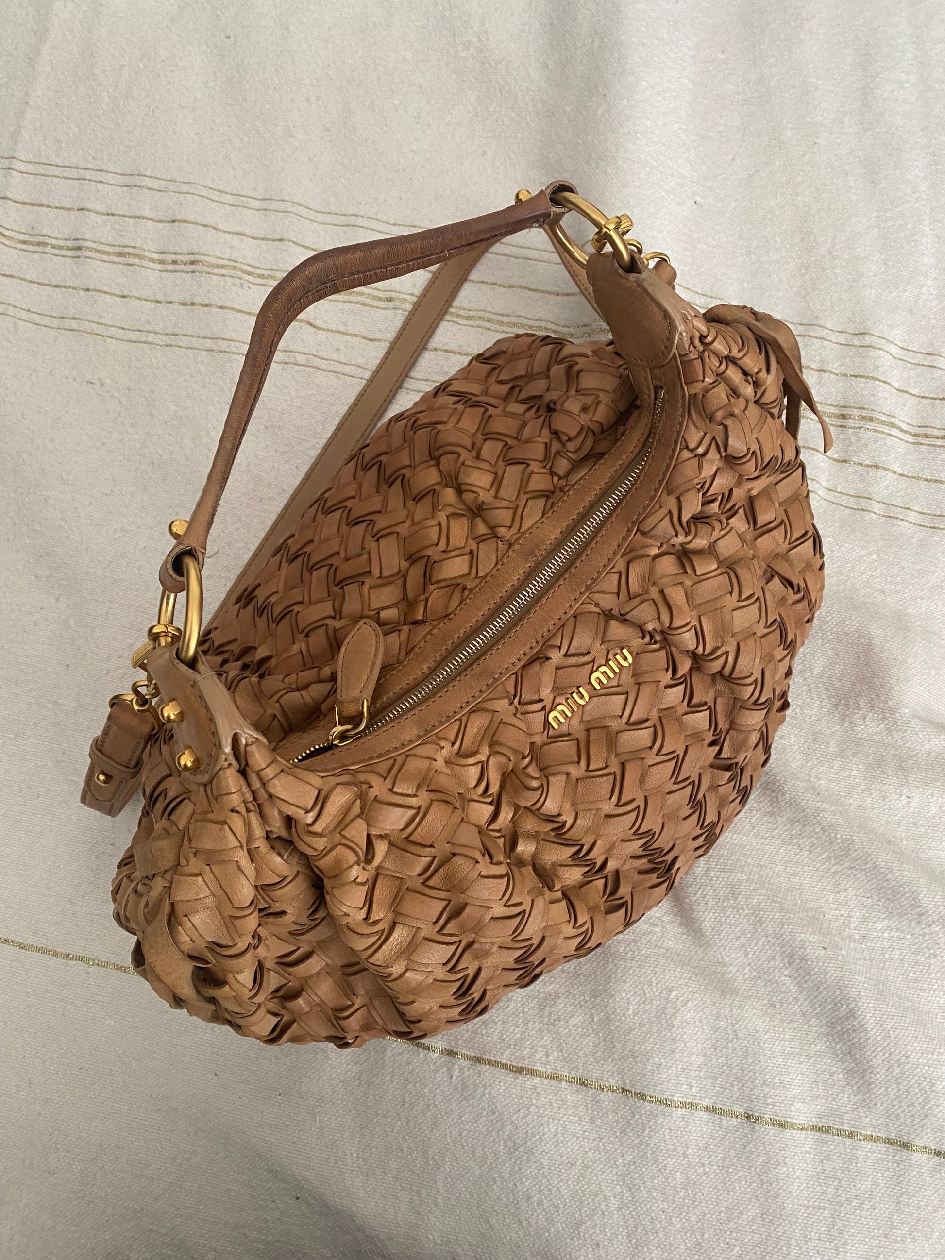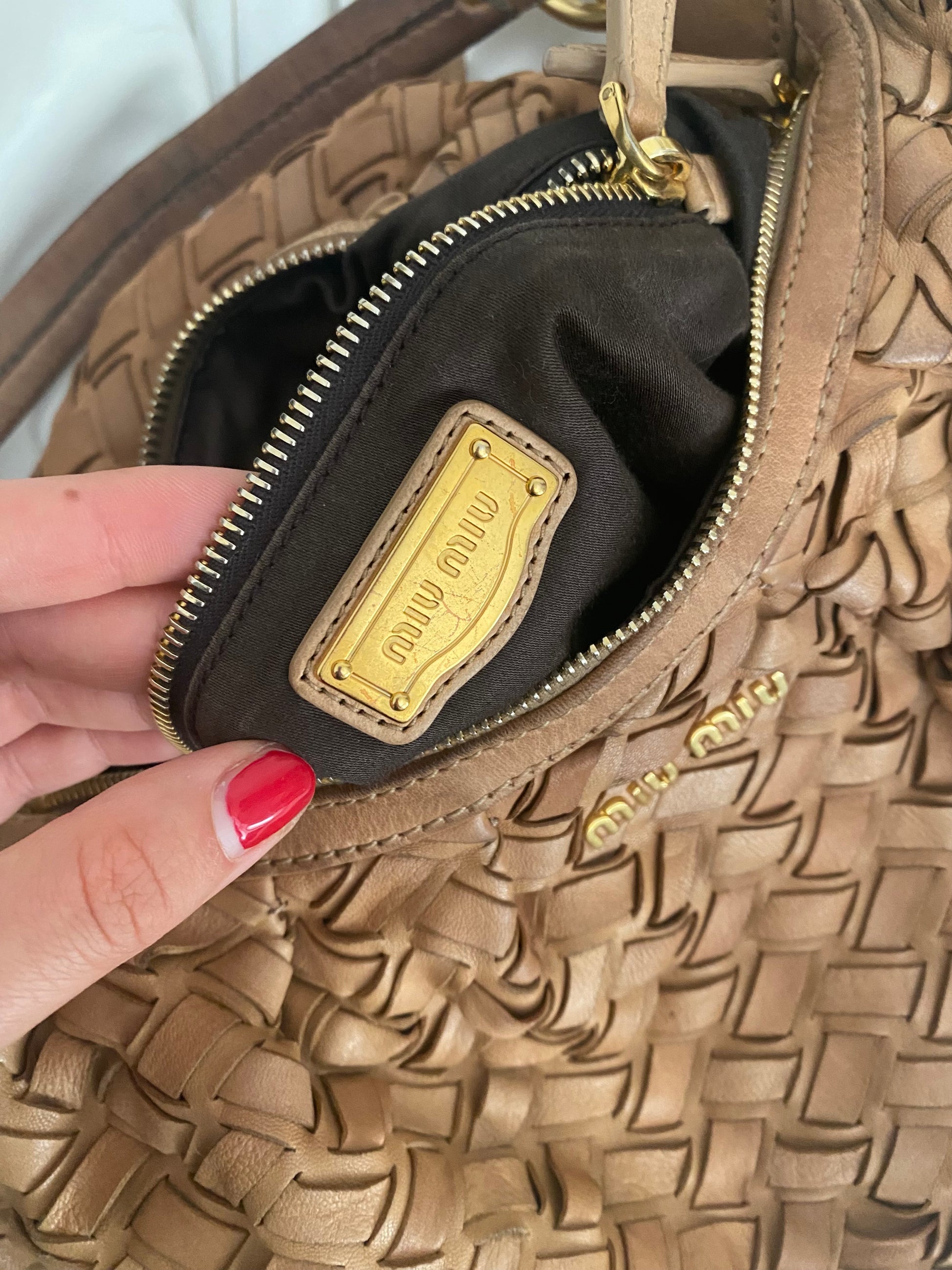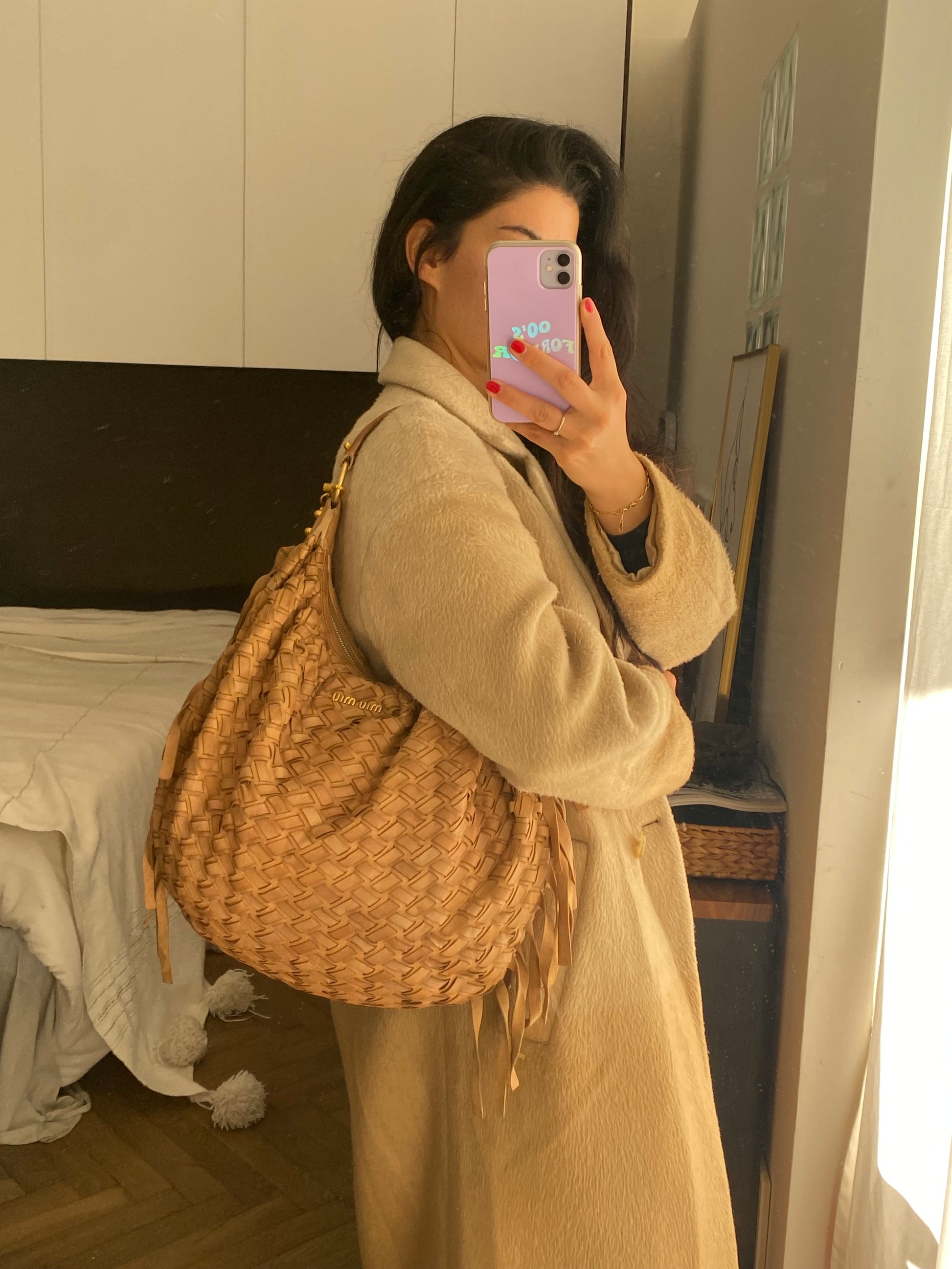 Bellissima miu miu pelle intrecciata con frange color cammello. Molto grande. Condizioni davvero molto buone. Con tracolla originale.