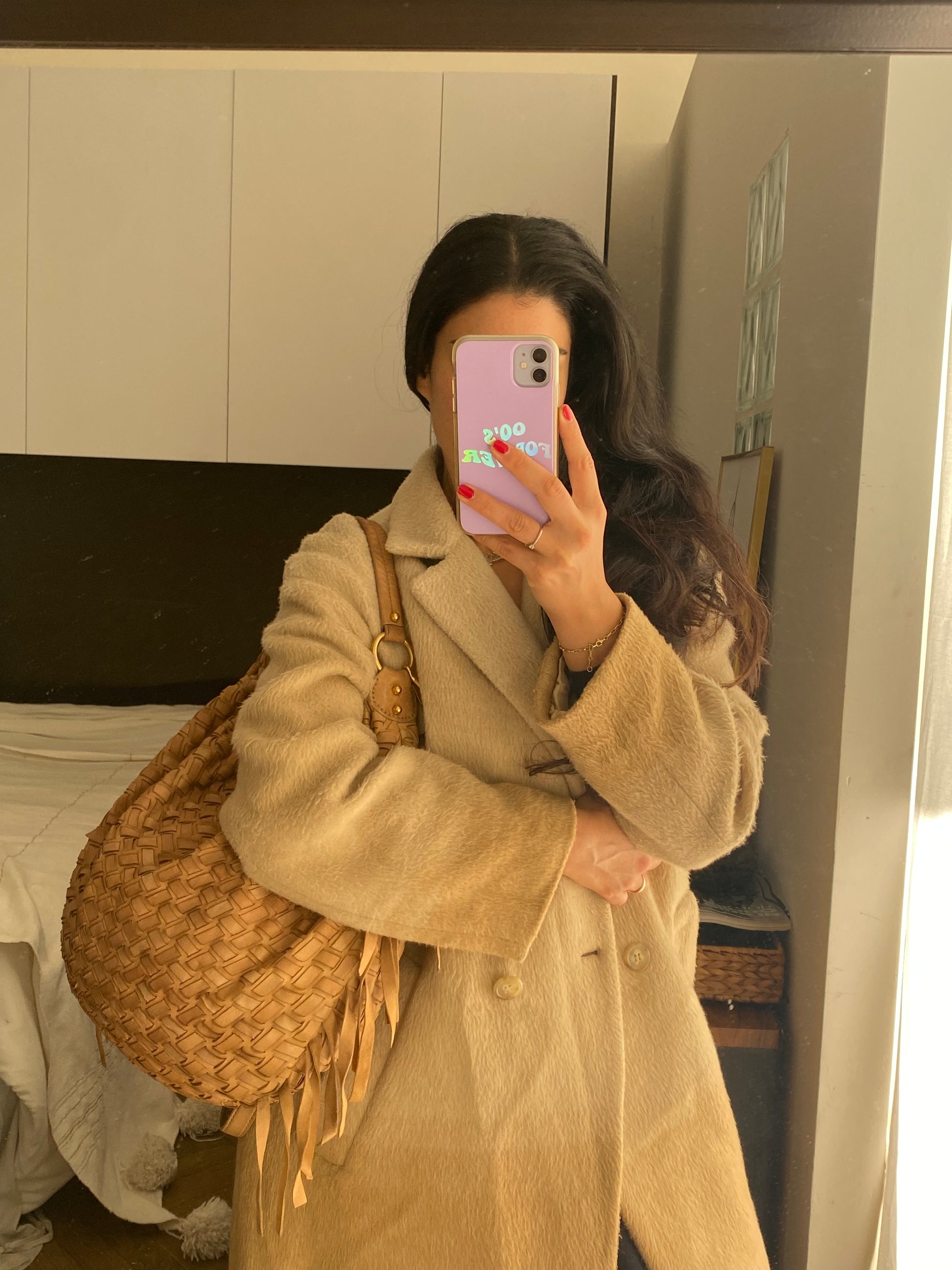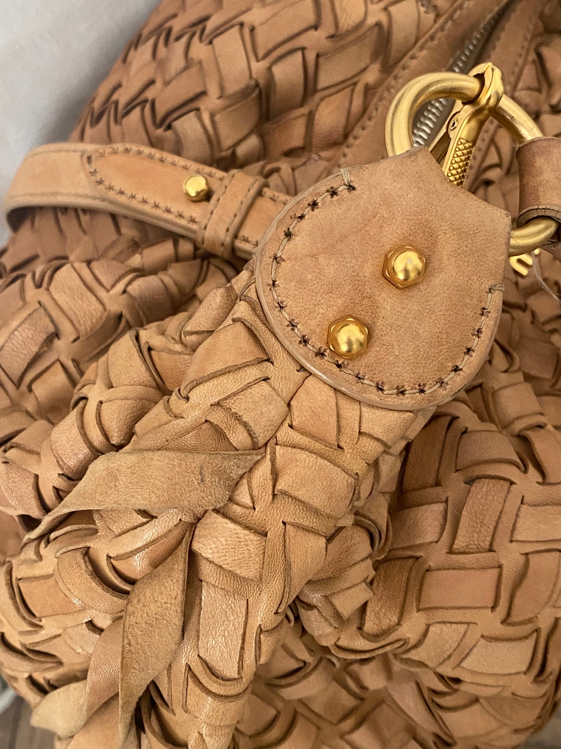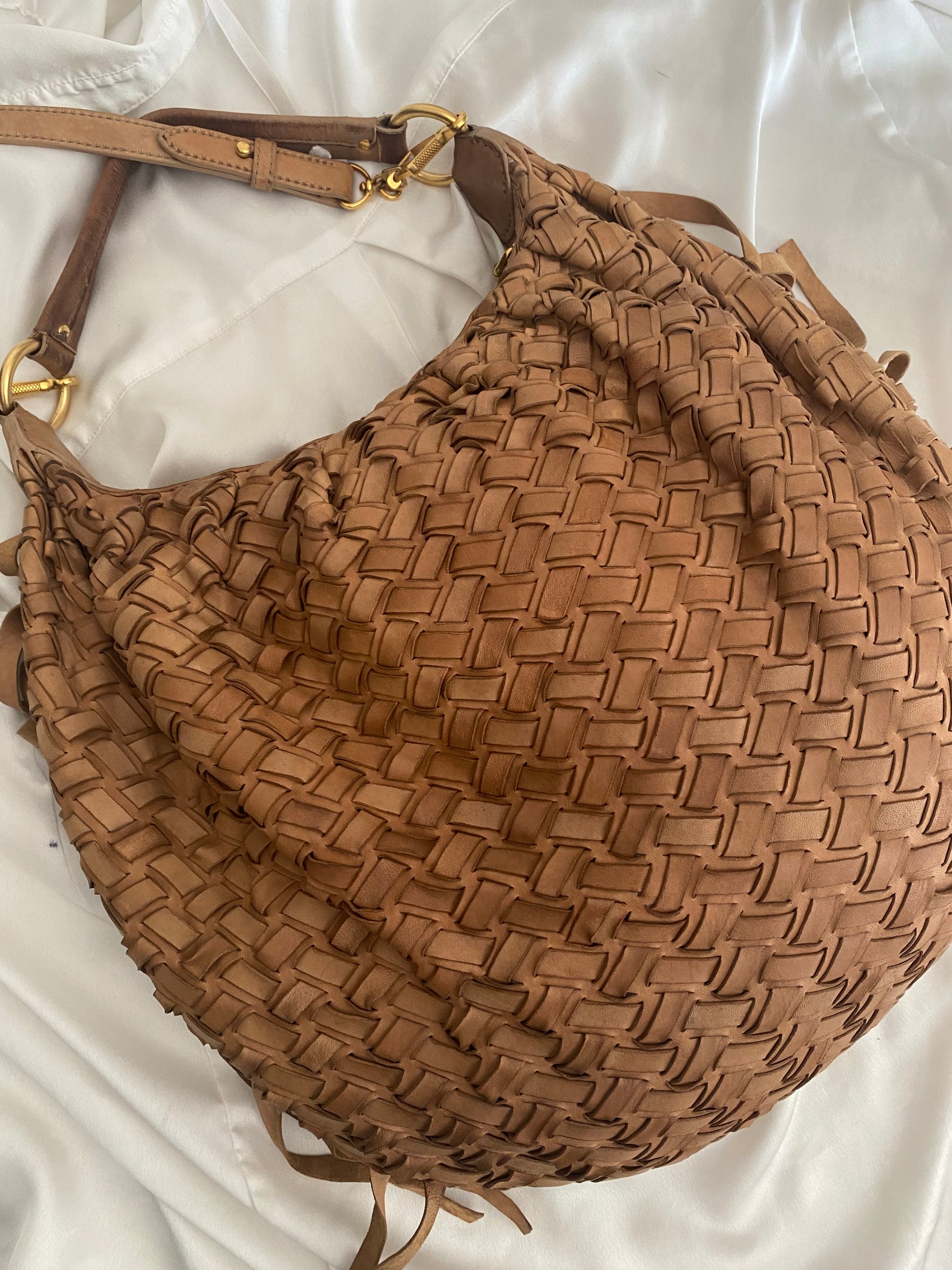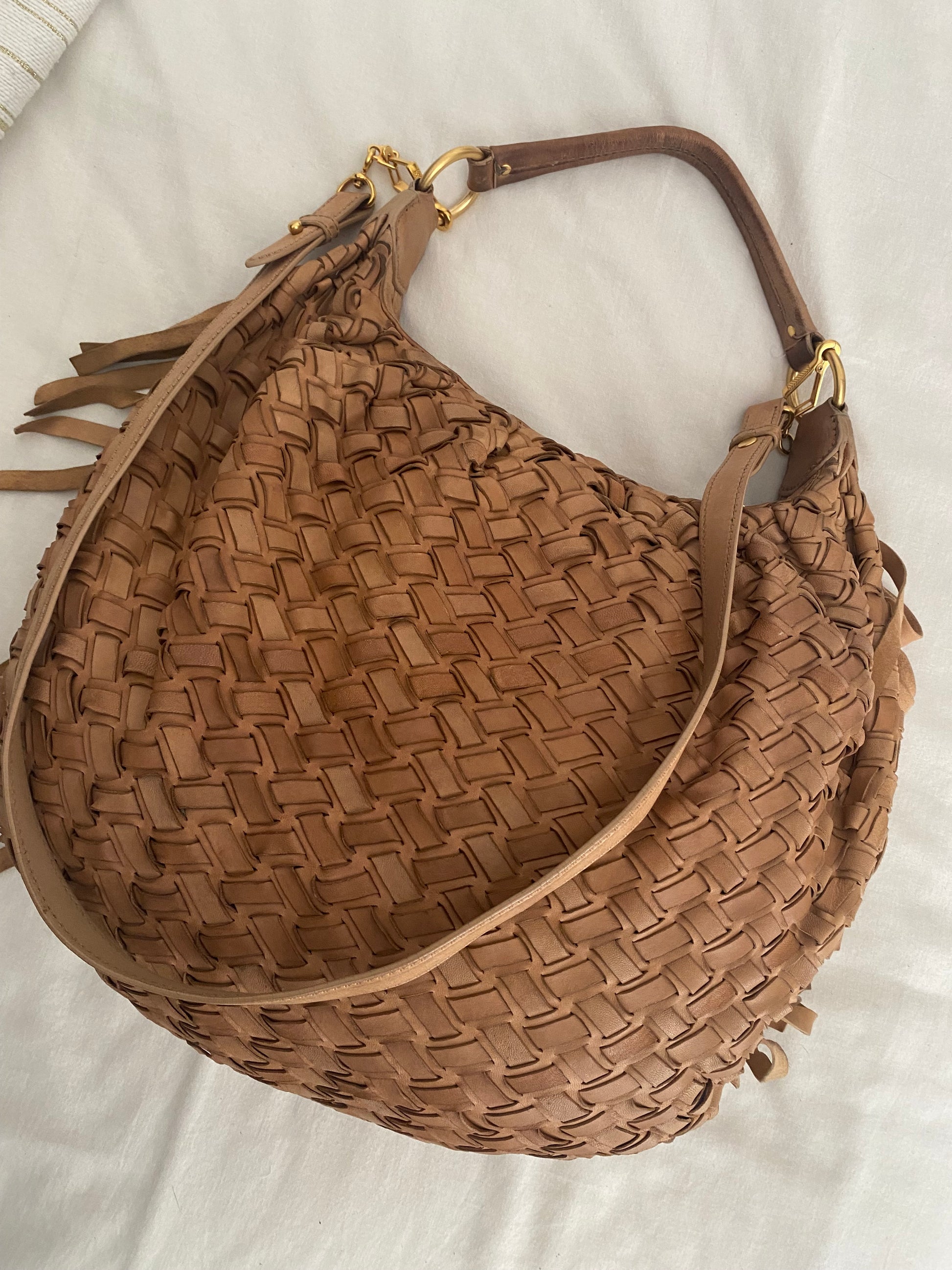 Bellissima miu miu pelle intrecciata con frange color cammello. Molto grande. Condizioni davvero molto buone. Con tracolla originale.