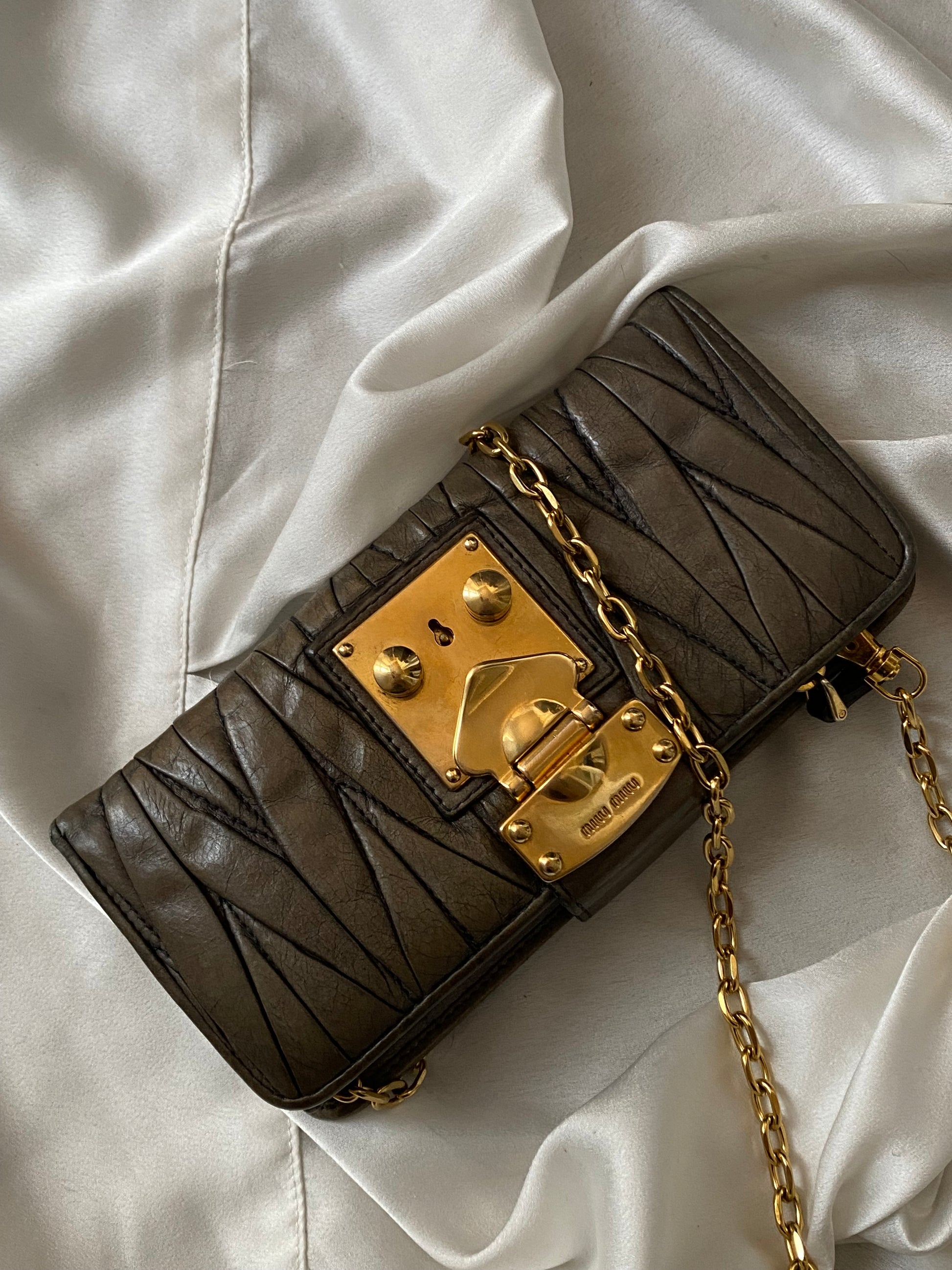 Pochette portafoglio Miu Miu antracite 3 in 1. Catena aggiunta: possibile portarla a spalla, a tracolla e come cintura.