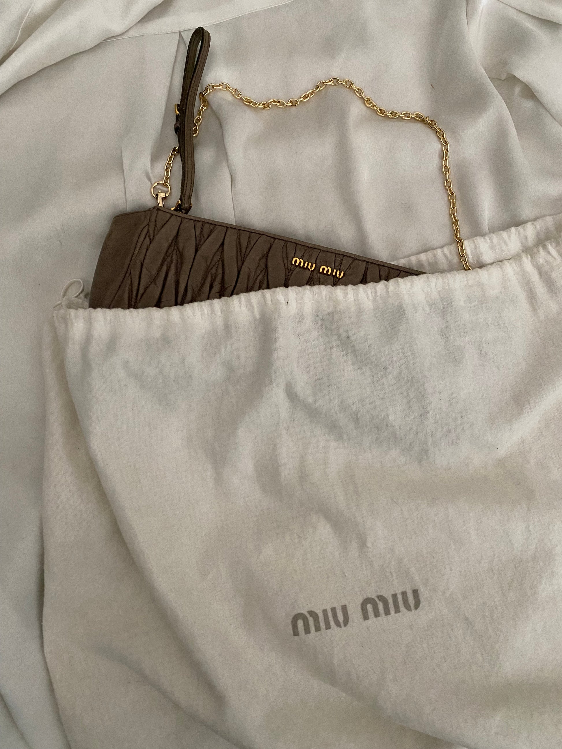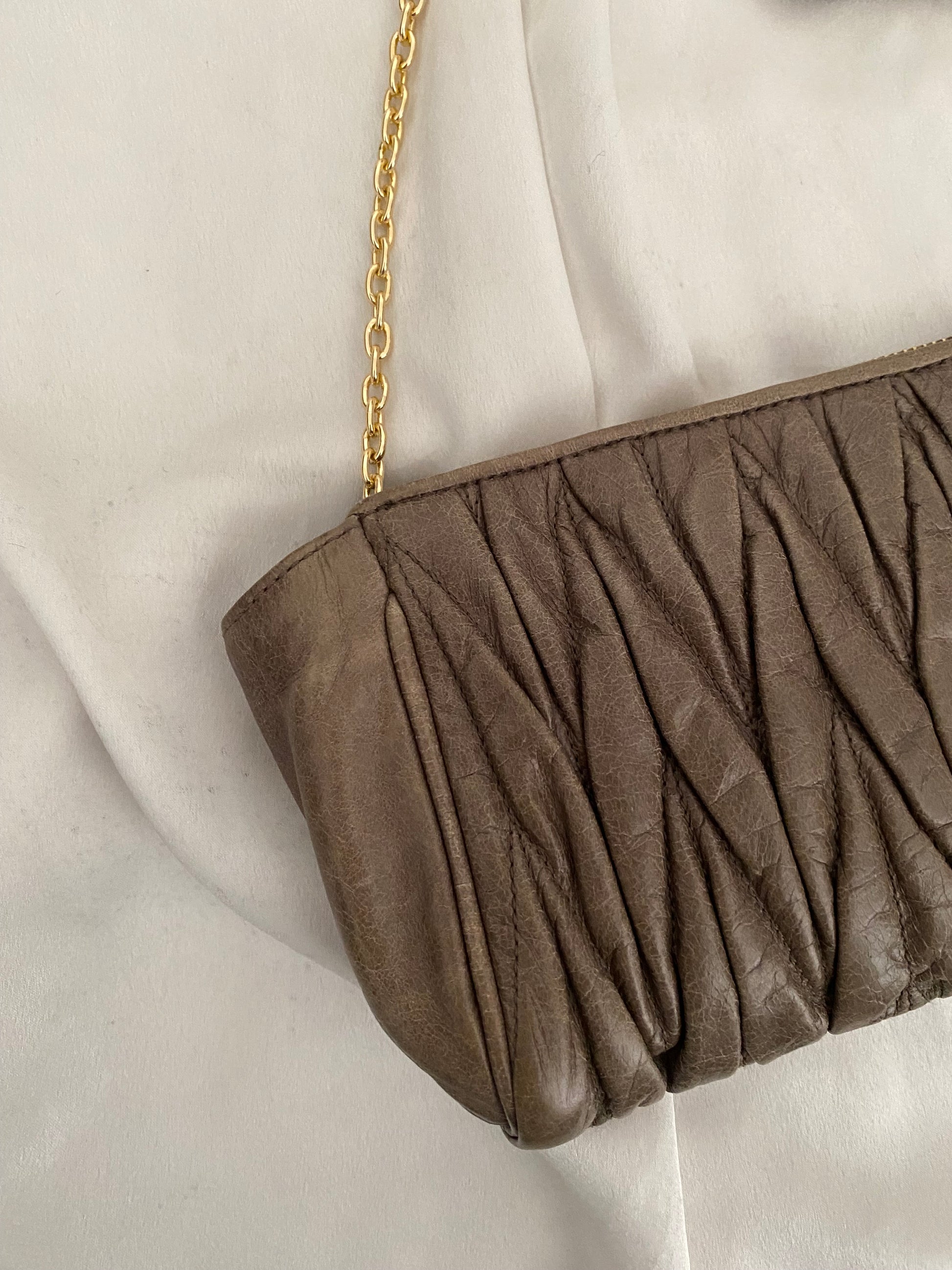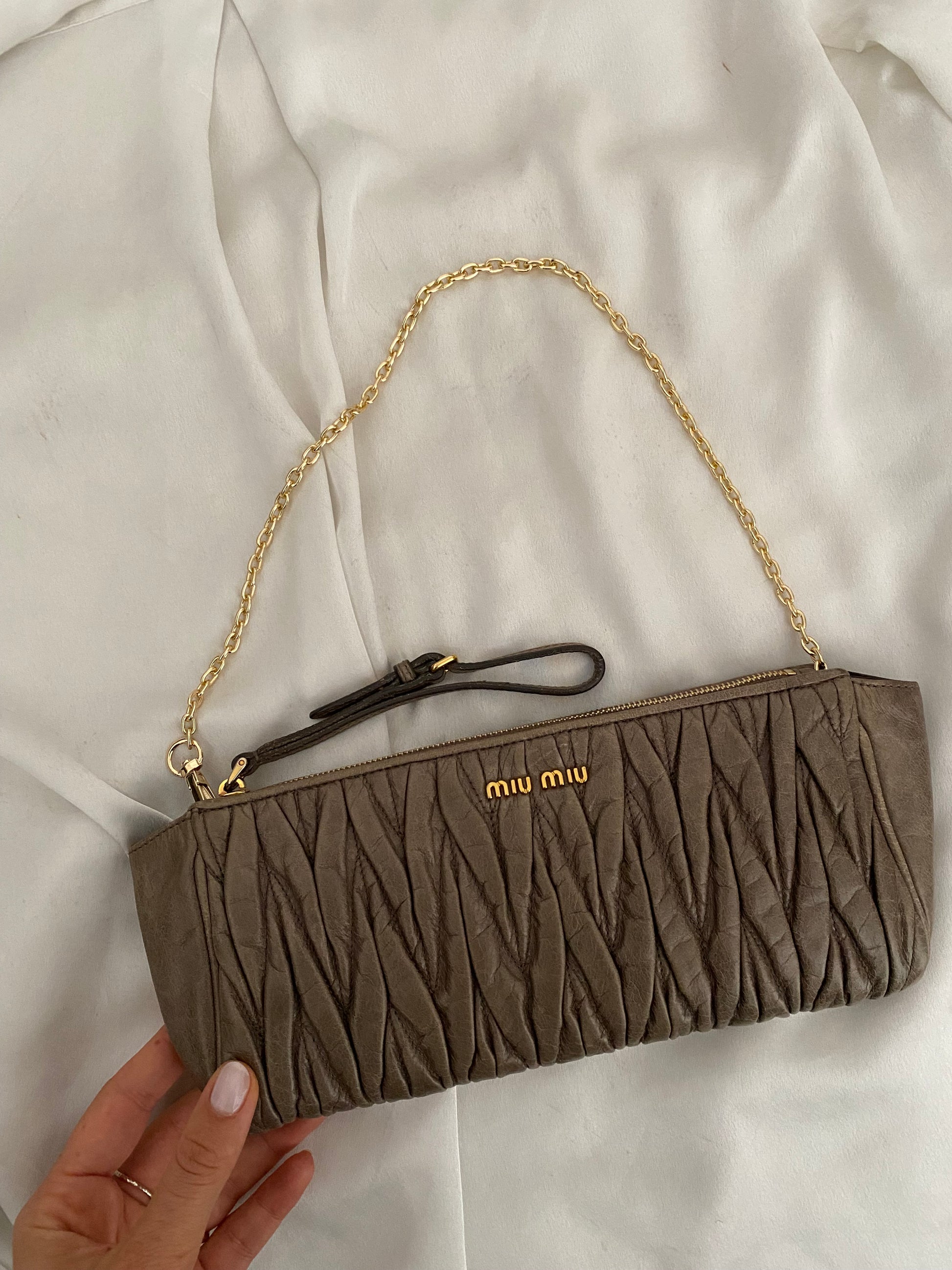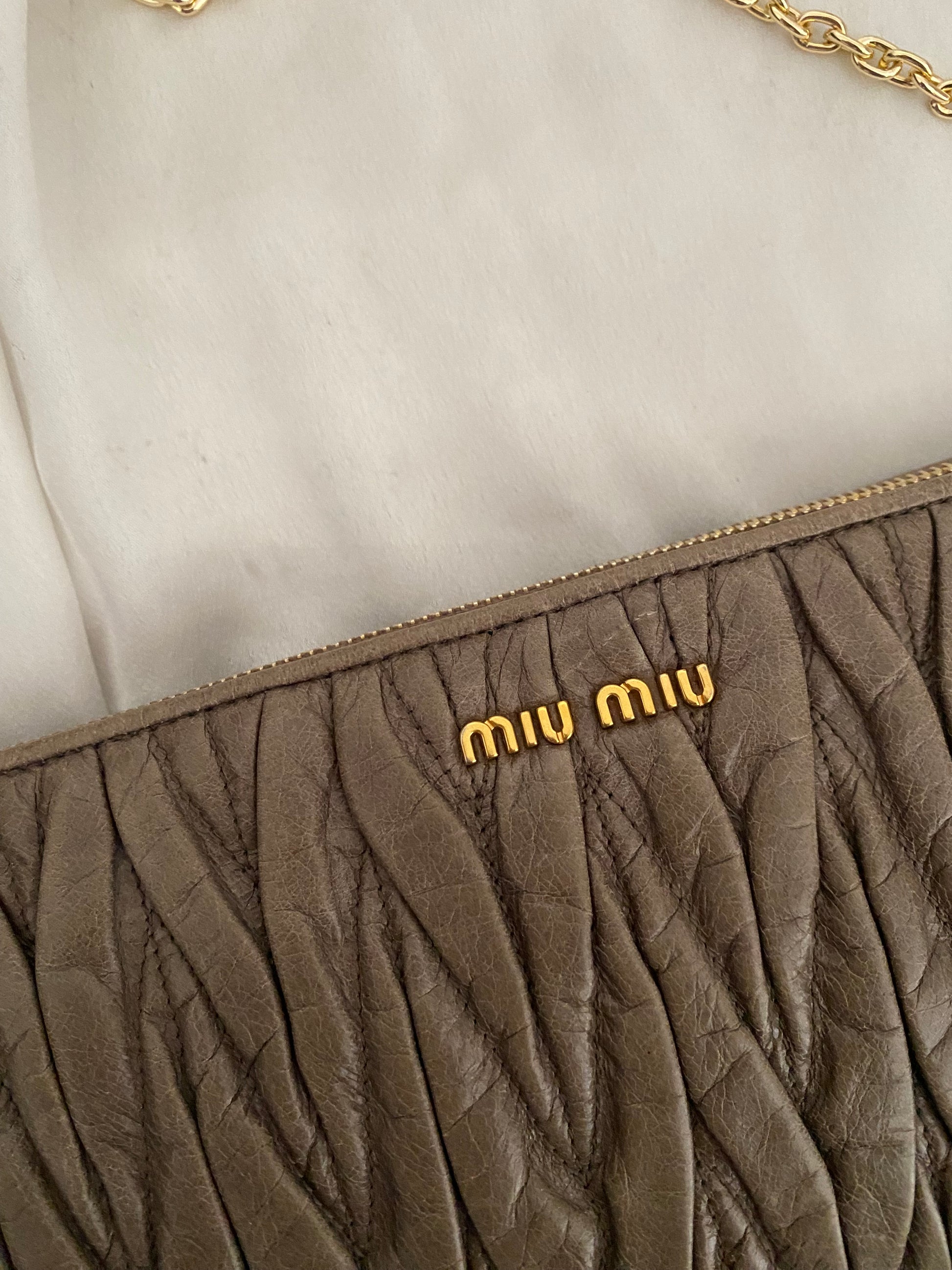 Pochette Miu Miu spettacolare in pregiatissima pelle semianilina antracite. Qualche lievissimo segno, ottime condizioni, le venature della pelle sono meravigliose. Catena aggiunta. Si può portare sia a spalla che a tracolla.