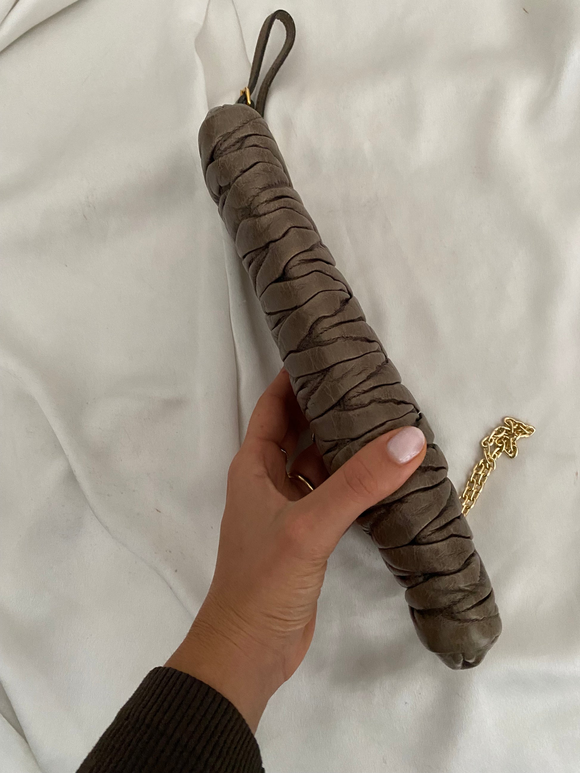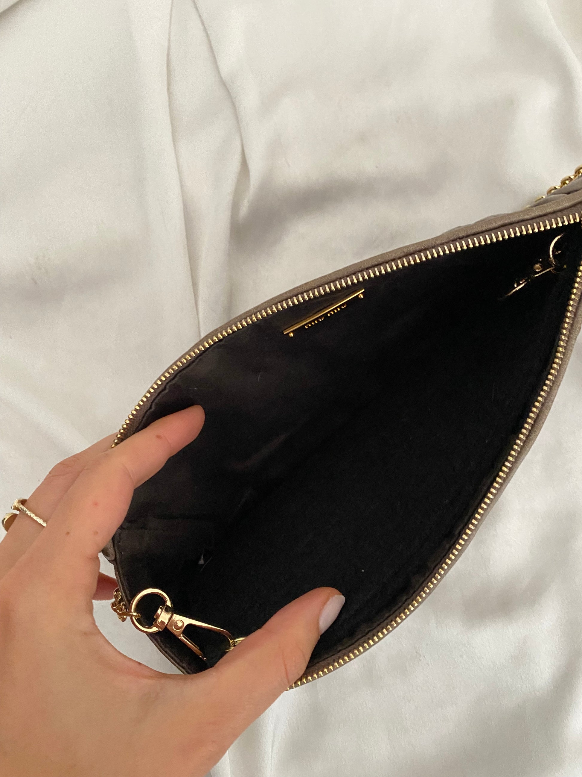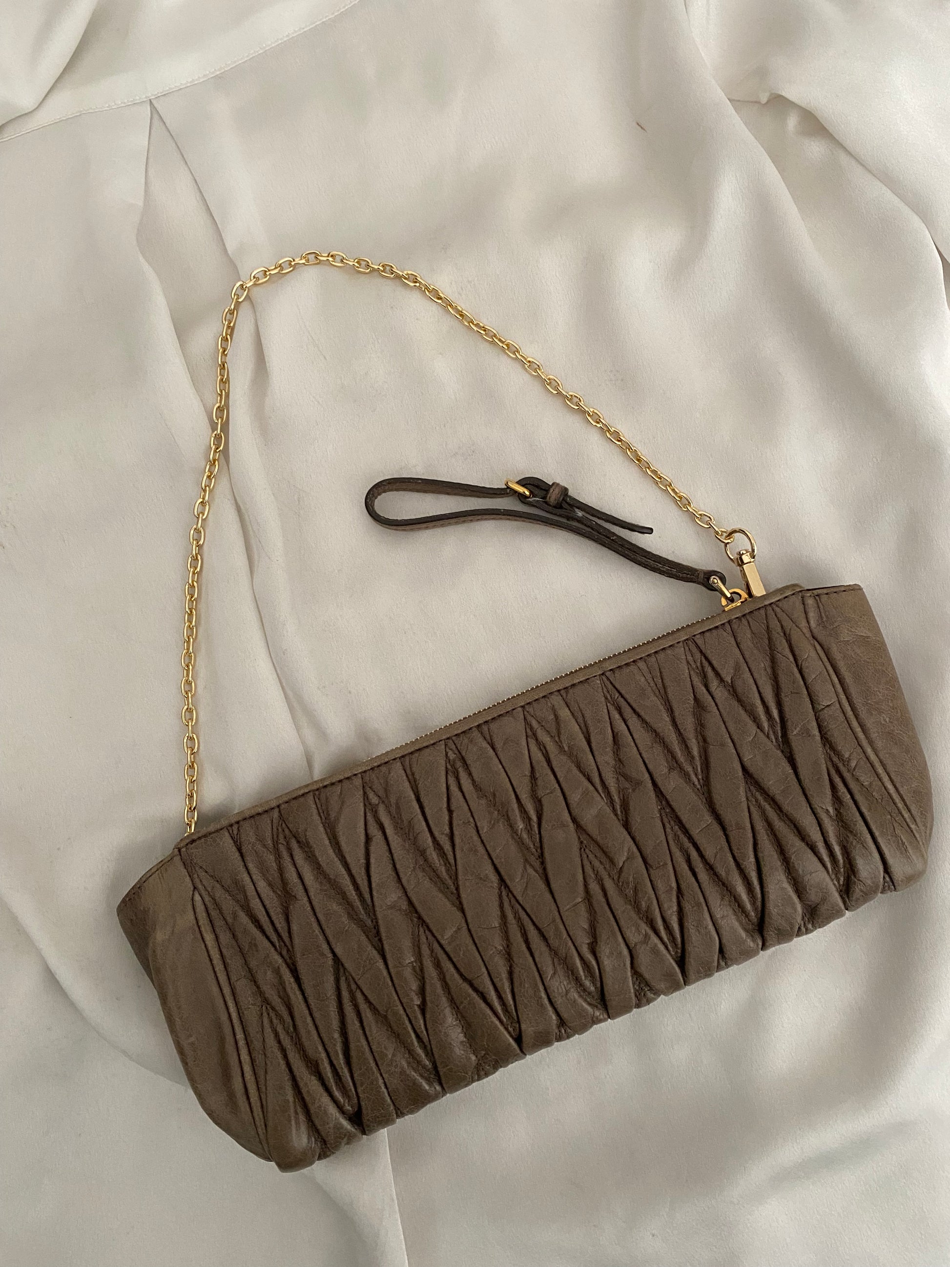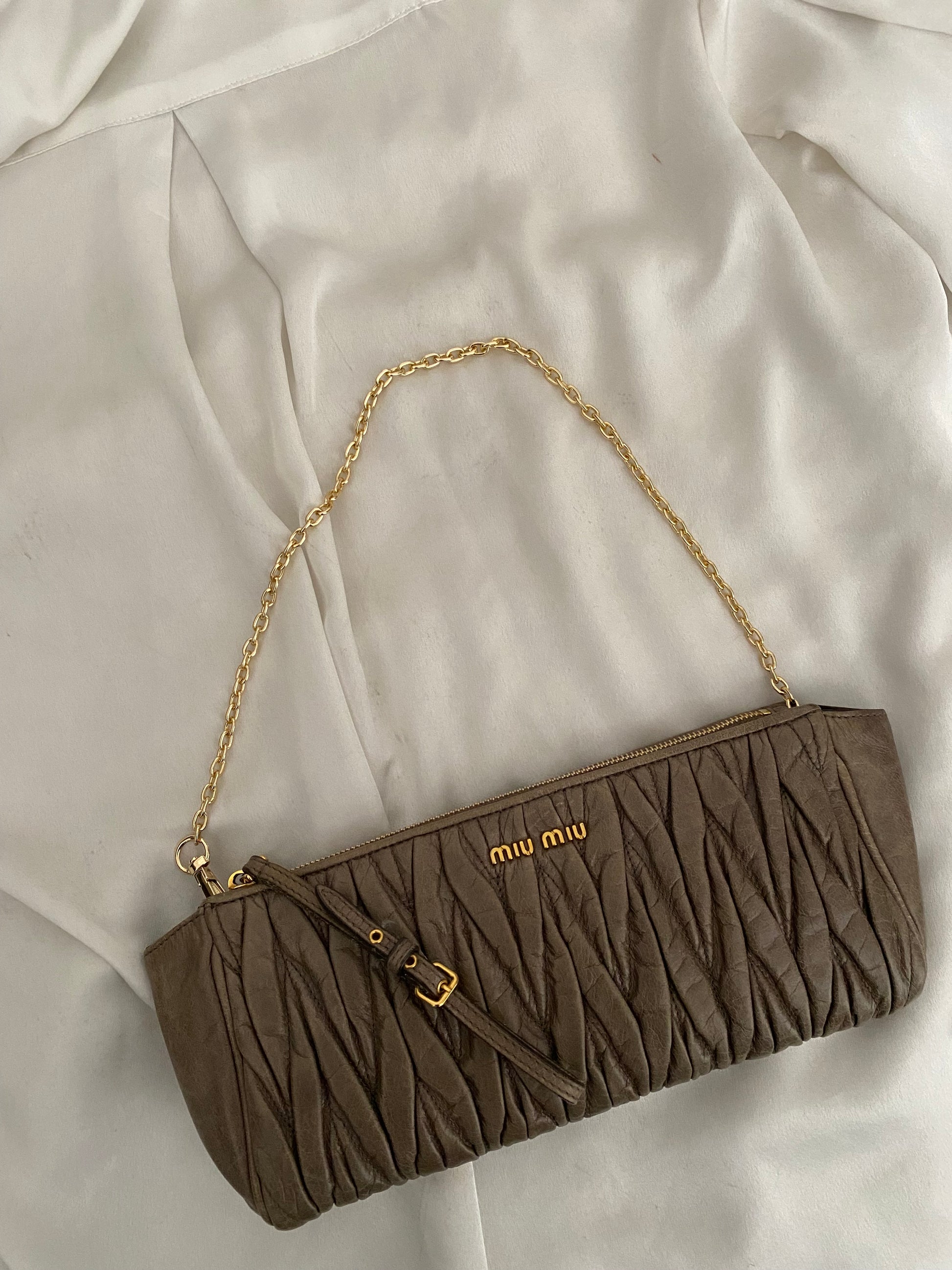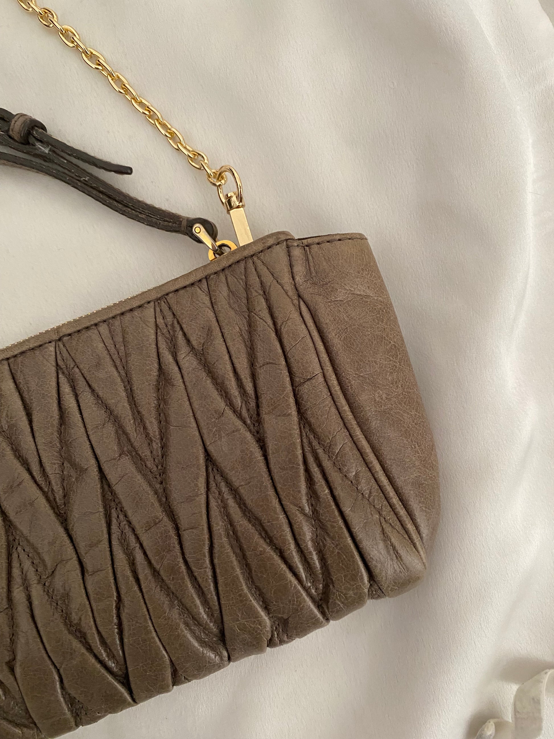 Pochette Miu Miu spettacolare in pregiatissima pelle semianilina antracite. Qualche lievissimo segno, ottime condizioni, le venature della pelle sono meravigliose. Catena aggiunta. Si può portare sia a spalla che a tracolla.