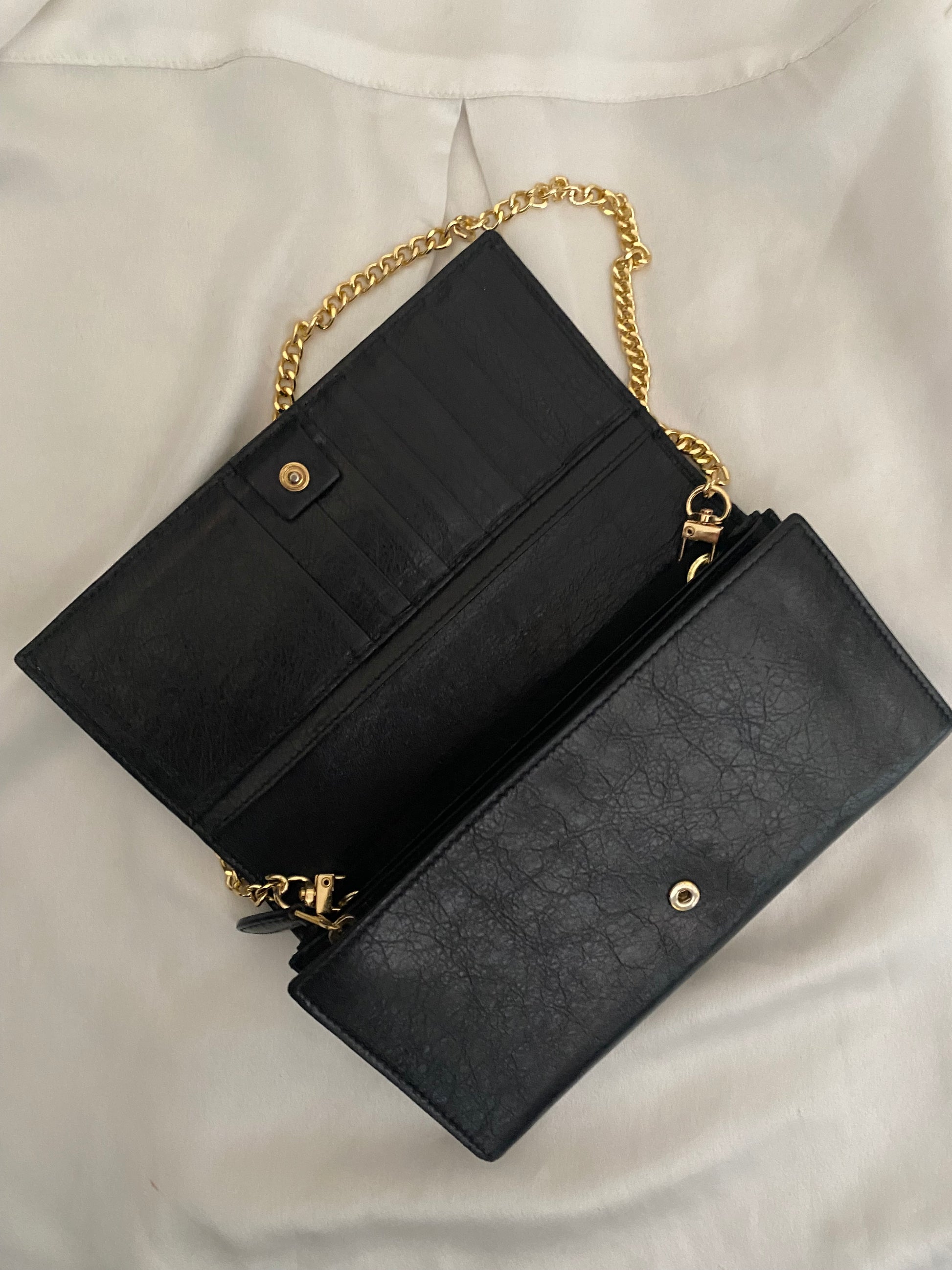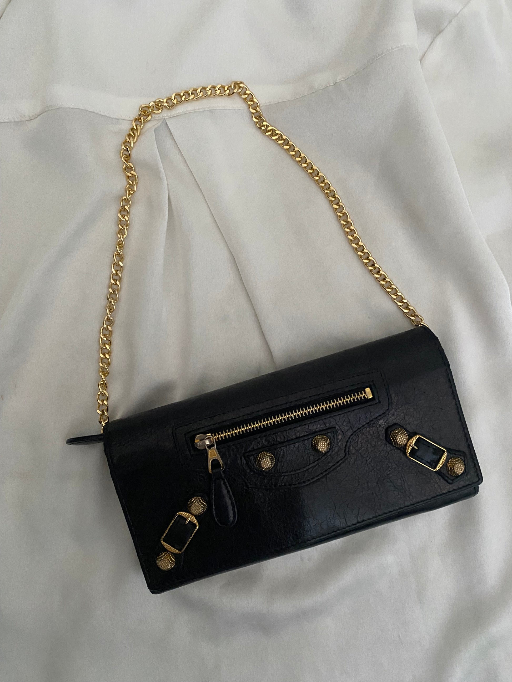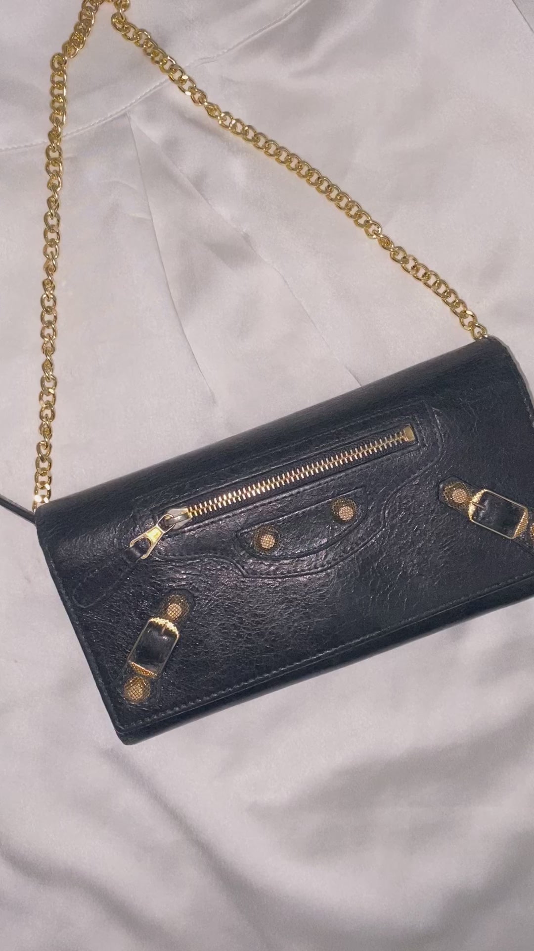 Balenciaga city WOC nero, hardware oro. Catena aggiunta per portarla a spalla. Entra un iPhone 15 pro Max, oltre a carte e bancomat. Pelle morbidissima. Qualche irregolarità sui bordi, buonissime condizioni generali.