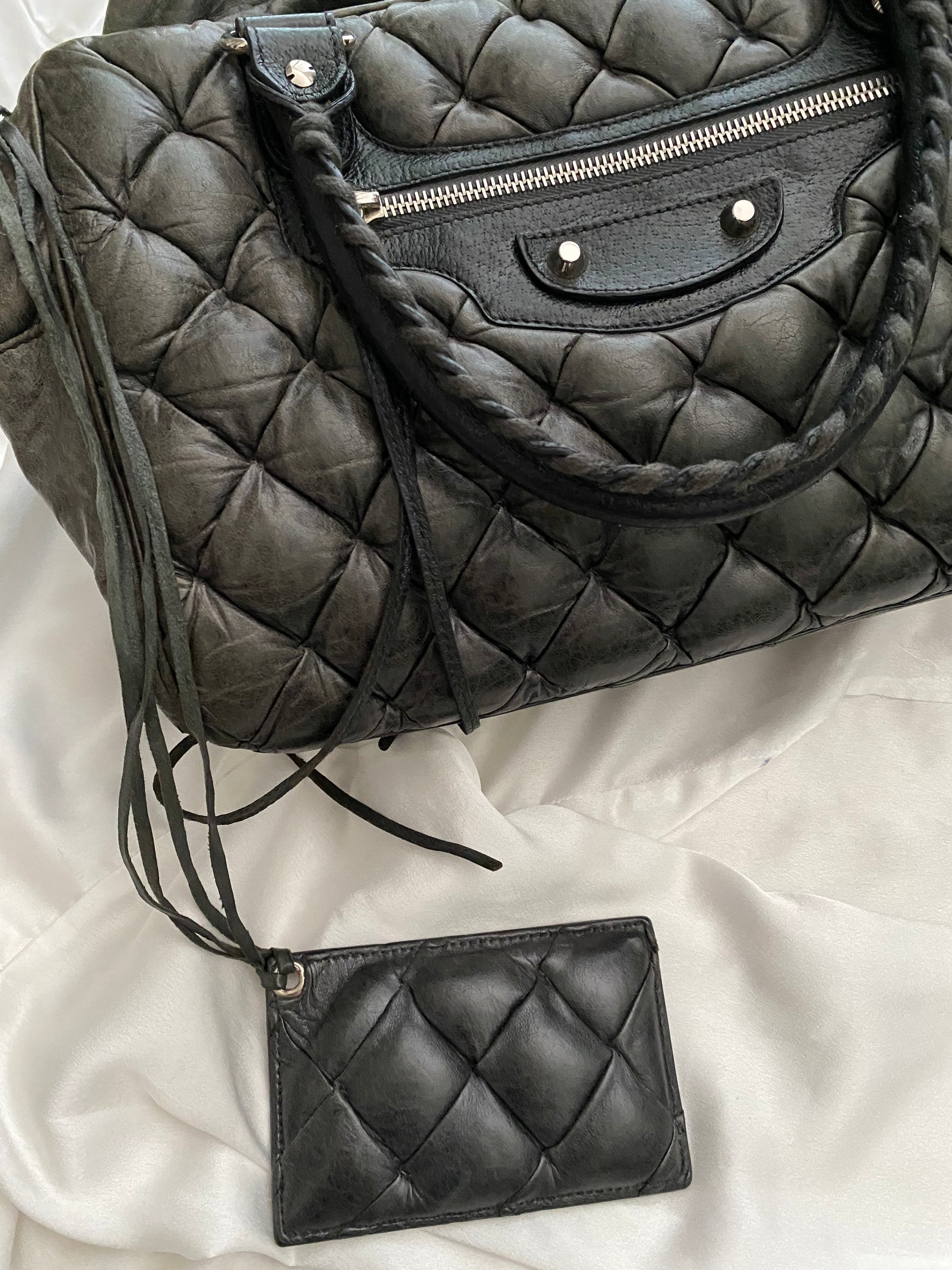 Iconica balenciaga city modello matelasse. Colore antracite ed effetto distressed unico. Alcuni difetti sugli angoli, per il resto fantastica. Disponibile anche il suo specchietto.