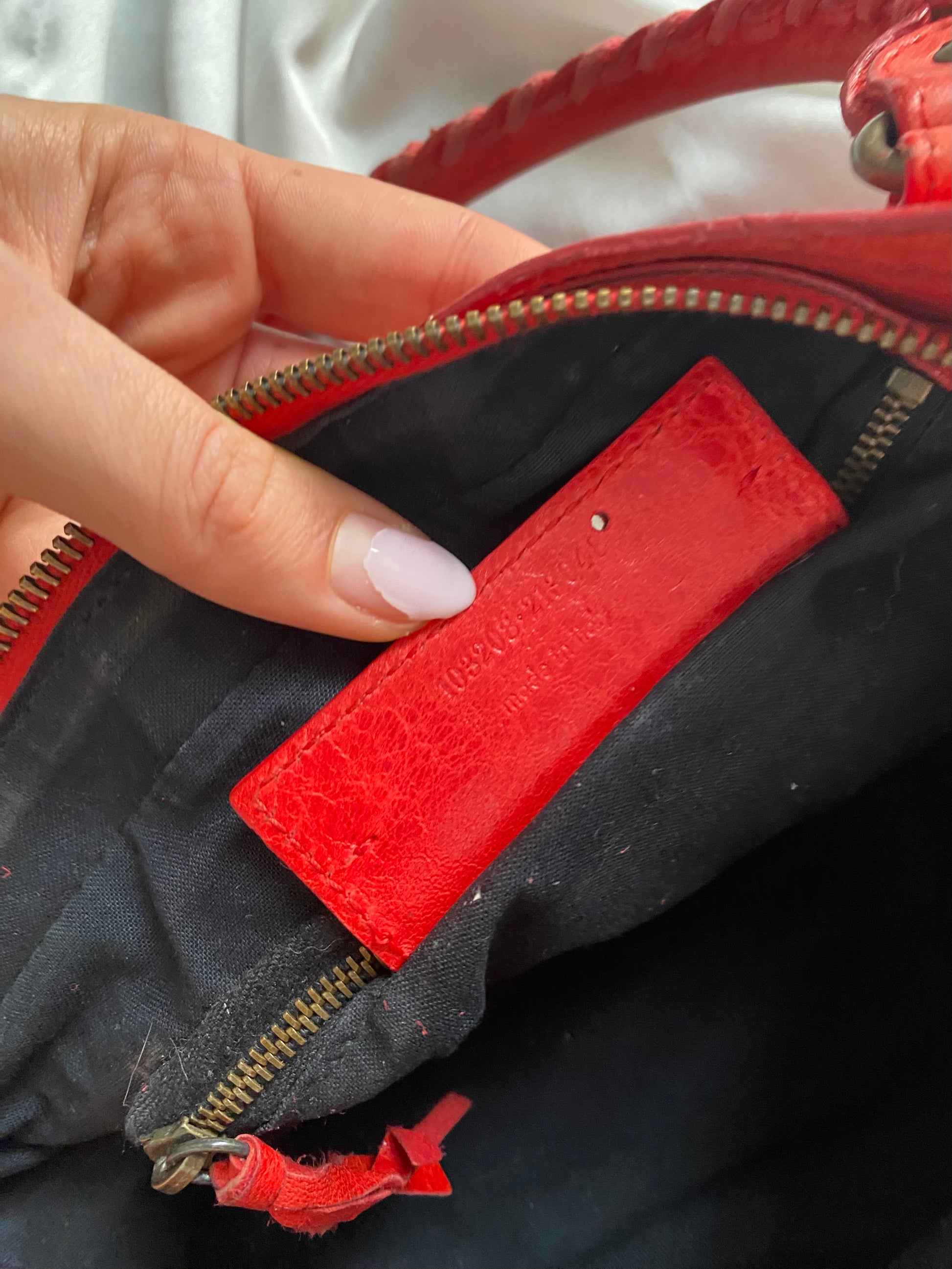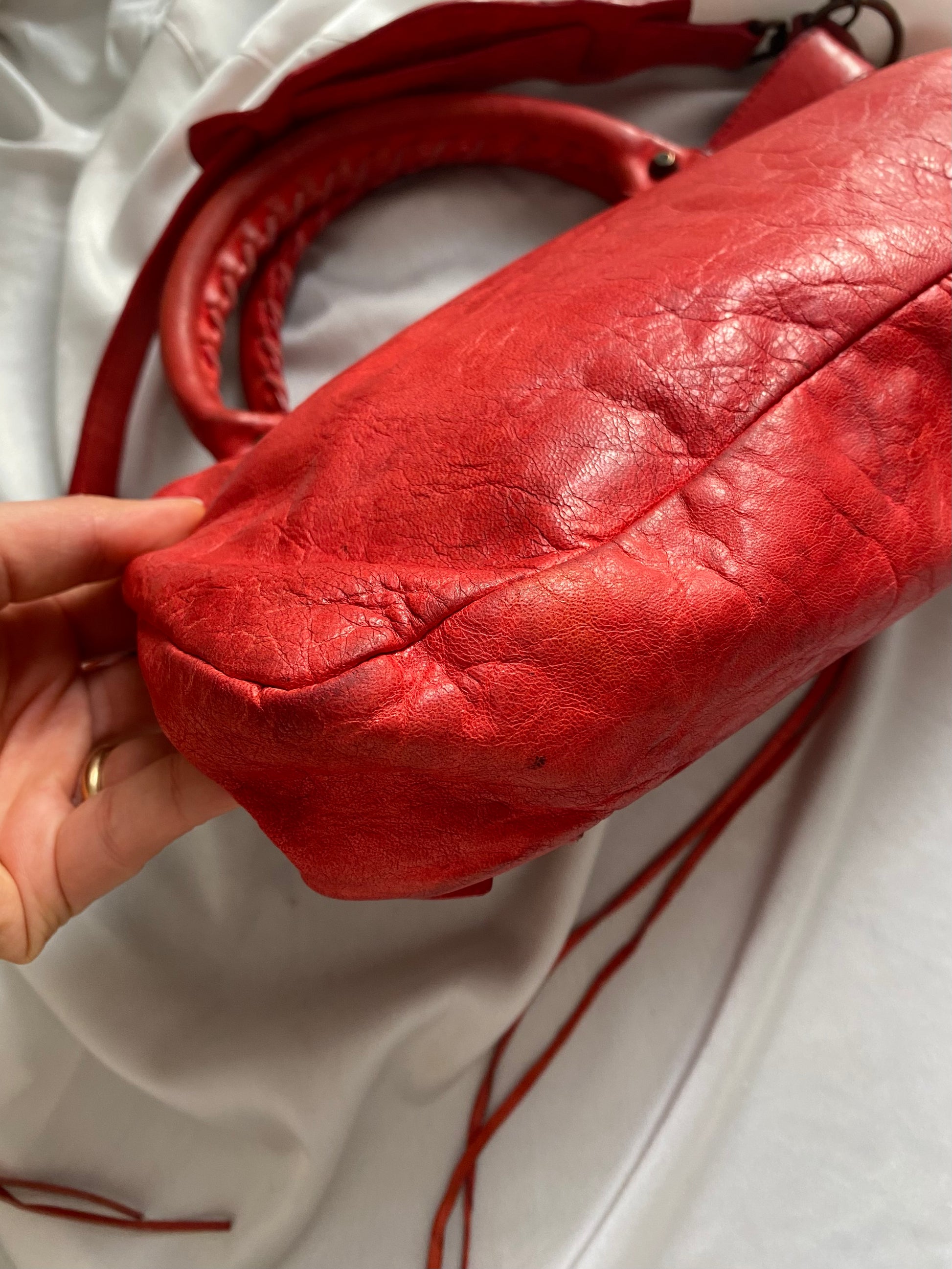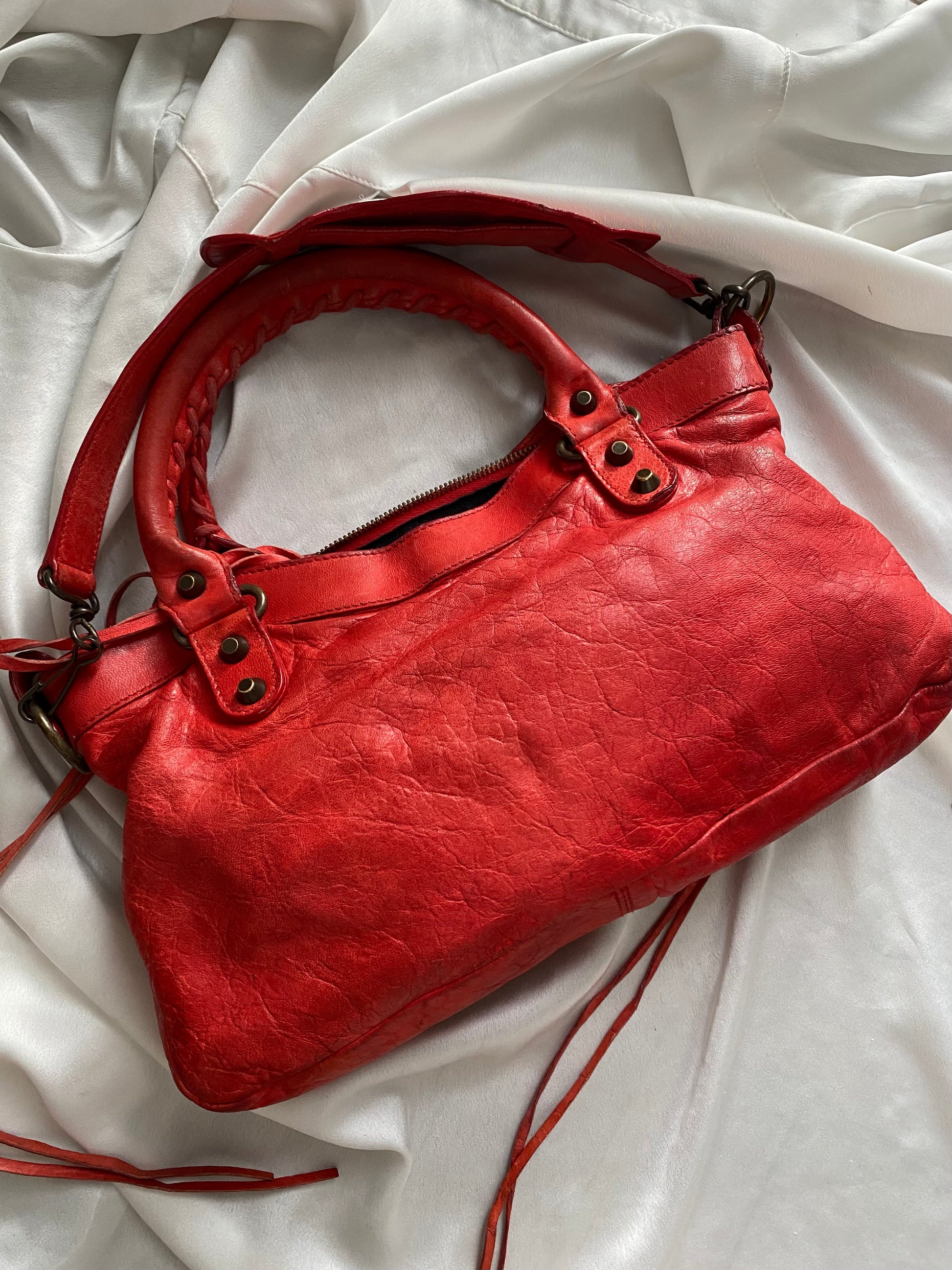 Balenciaga Motorcycle bag First cherry red in pelle d’agnello con Classic hardware. Ha qualche segno sulla pelle ma buone condizioni generali. Completa di cartellini, nastri di ricambio originali, specchio e tracolla.