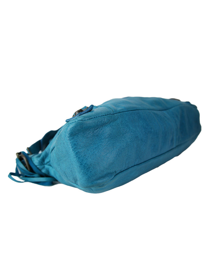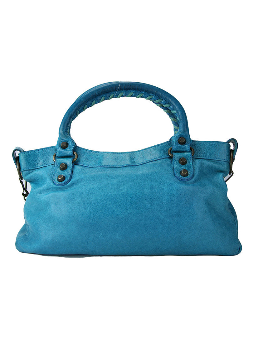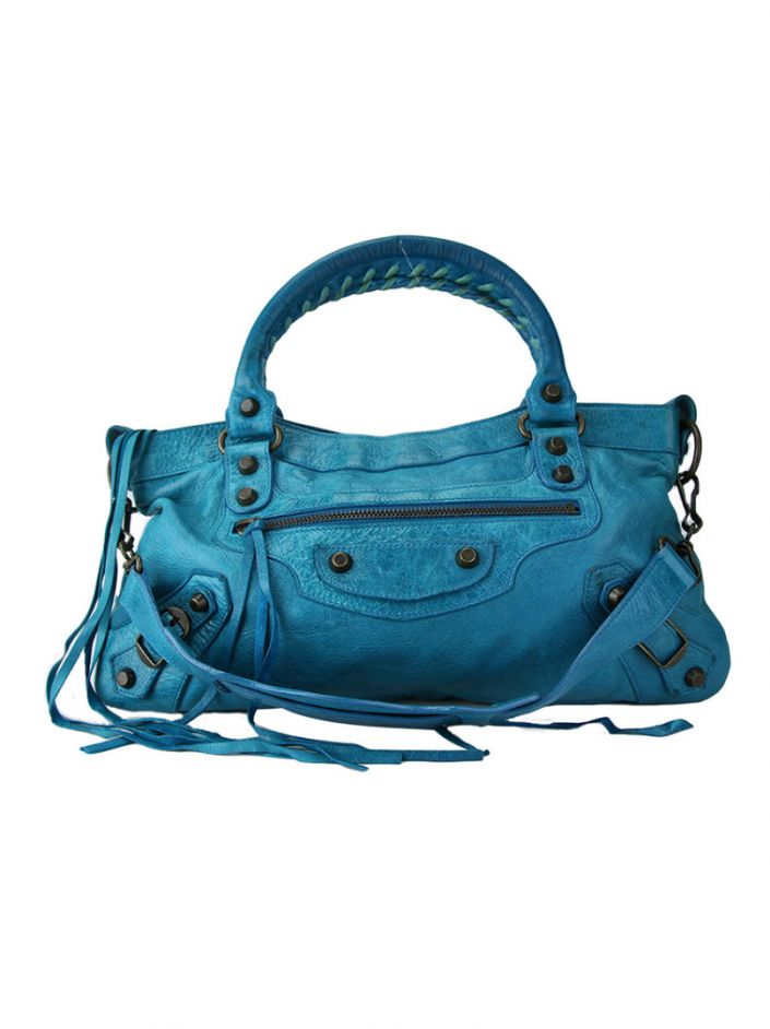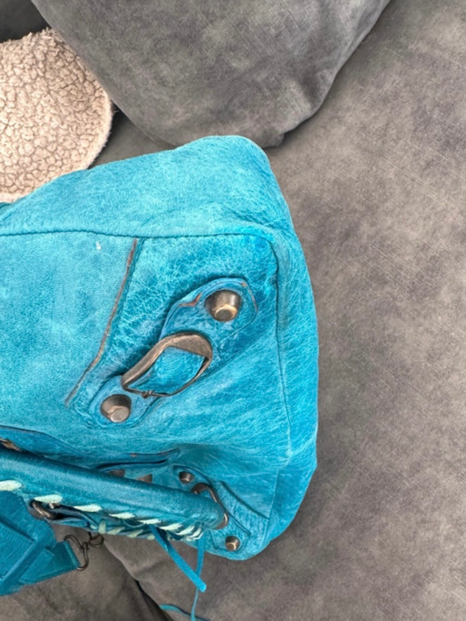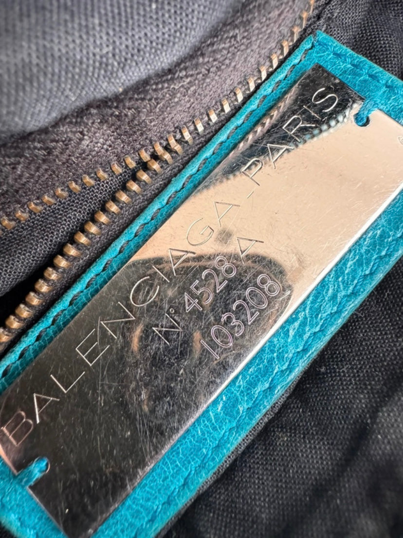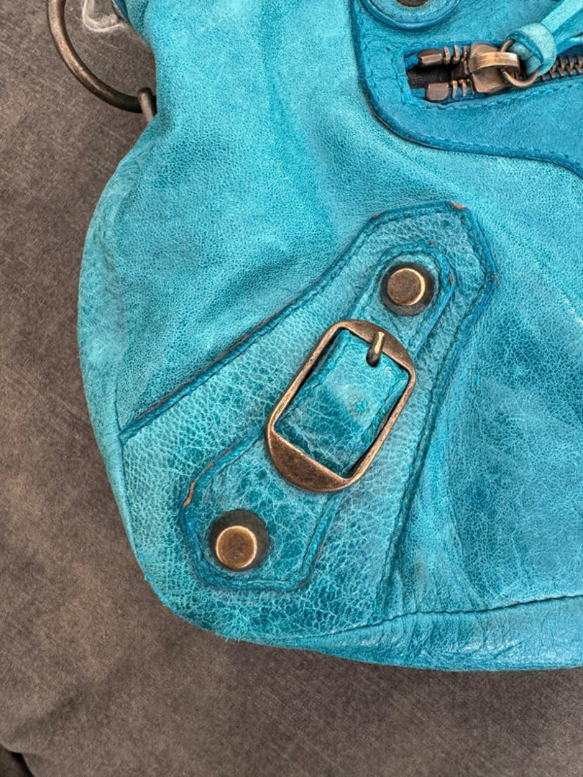 meravigliosa balenciaga first colore turquoise dello ss 2005 in ricercatissima pelle chévre con il tipico look distressed e targhetta in vero argento 925. colore meraviglioso. Pelle morbidissima. Qualche normale segno sulla pelle e manici leggermente più scuri. Buonissime condizioni generali.