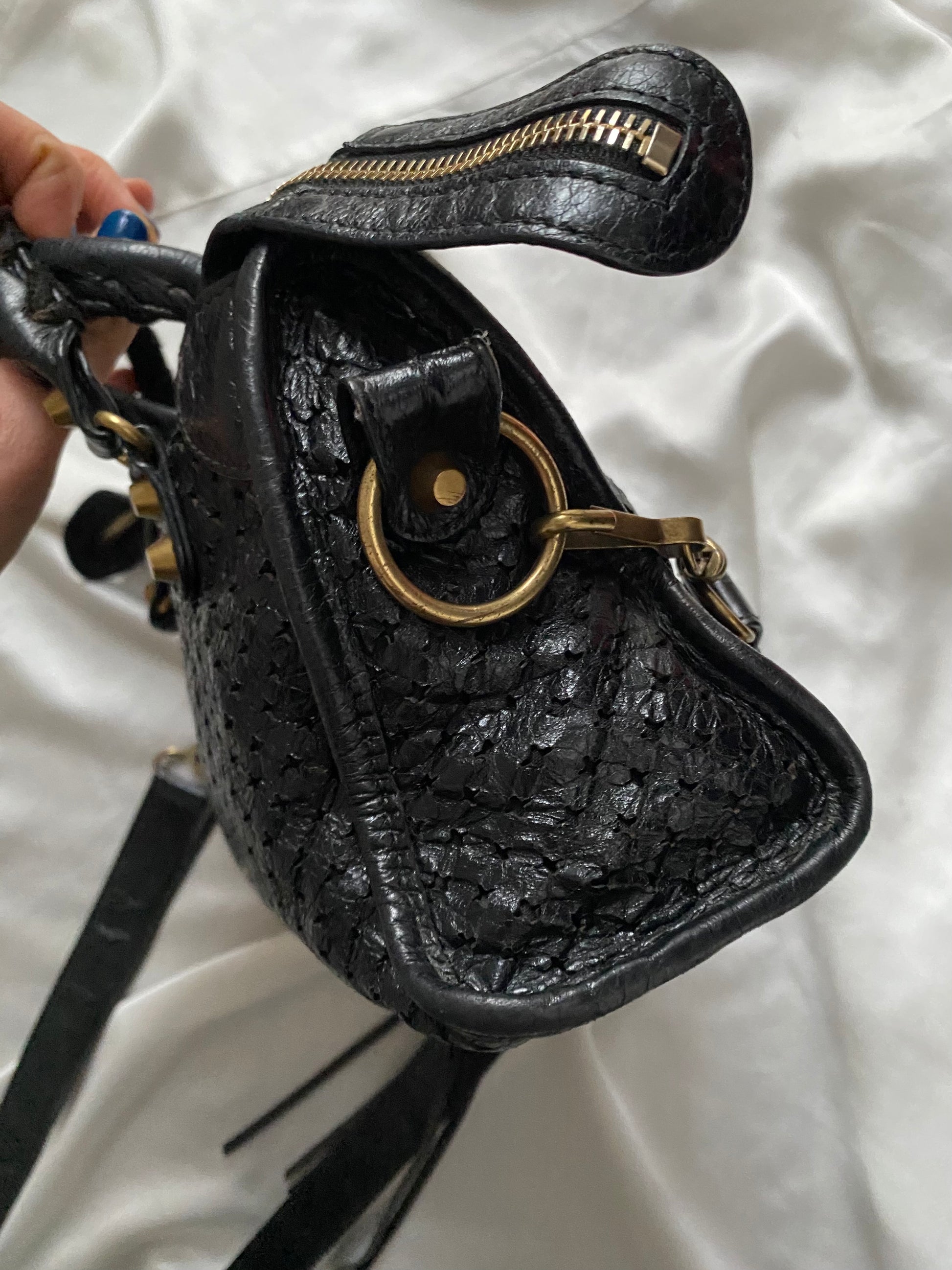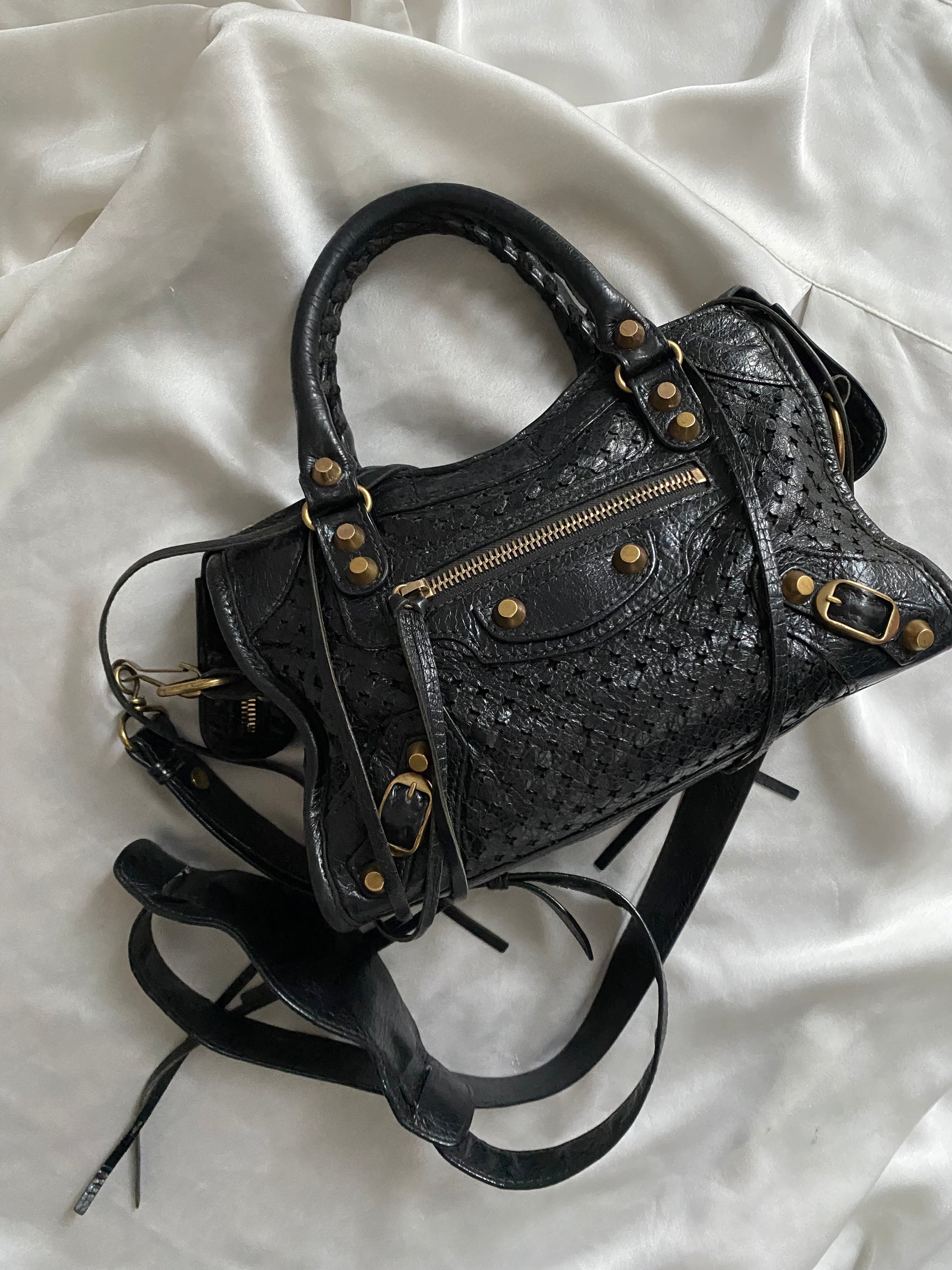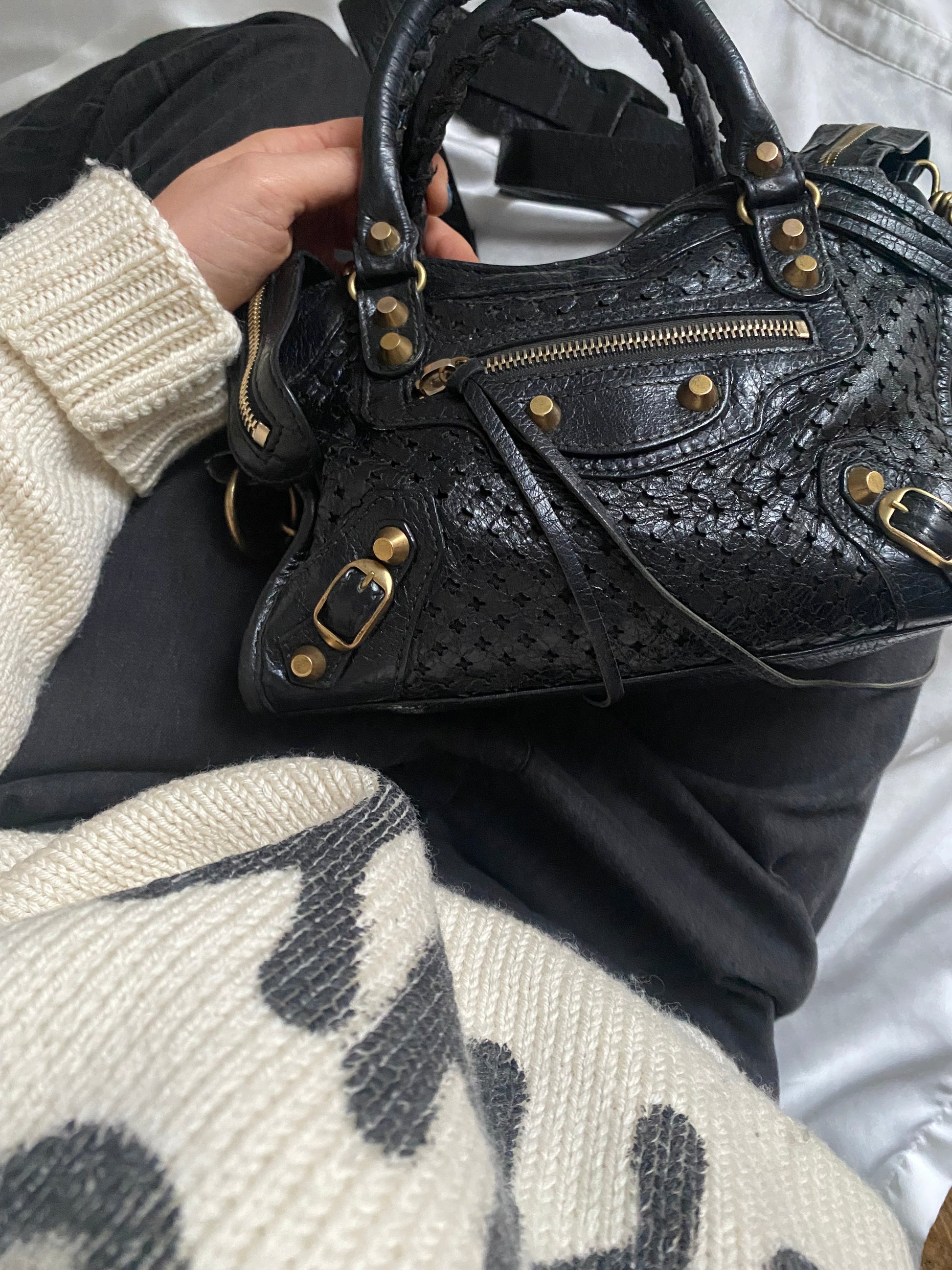 meravigliosa e unica balenciaga mini city del 2018 in pelle d’agnello. Modello veramente unico perché realizzato in pelle perforata. Qualche segno sull’hardware e sul cordoncino del manico, ma buonissime condizioni generali.