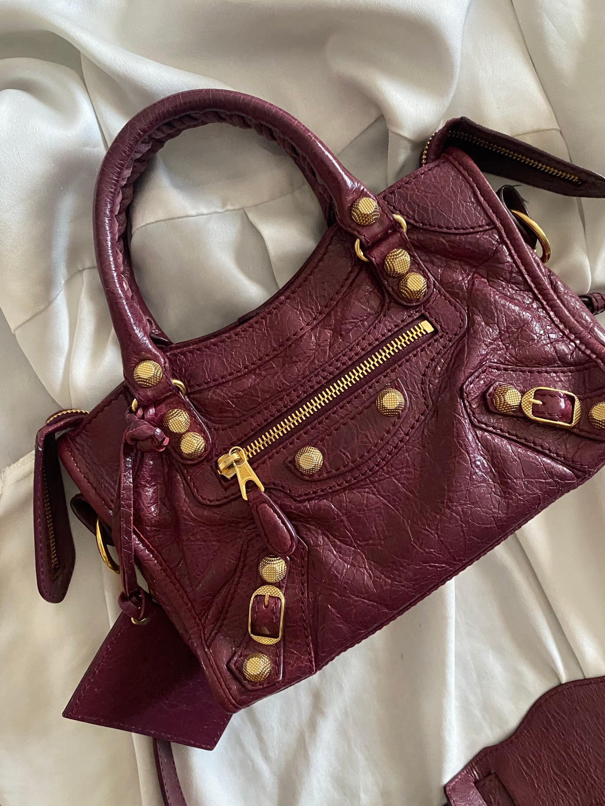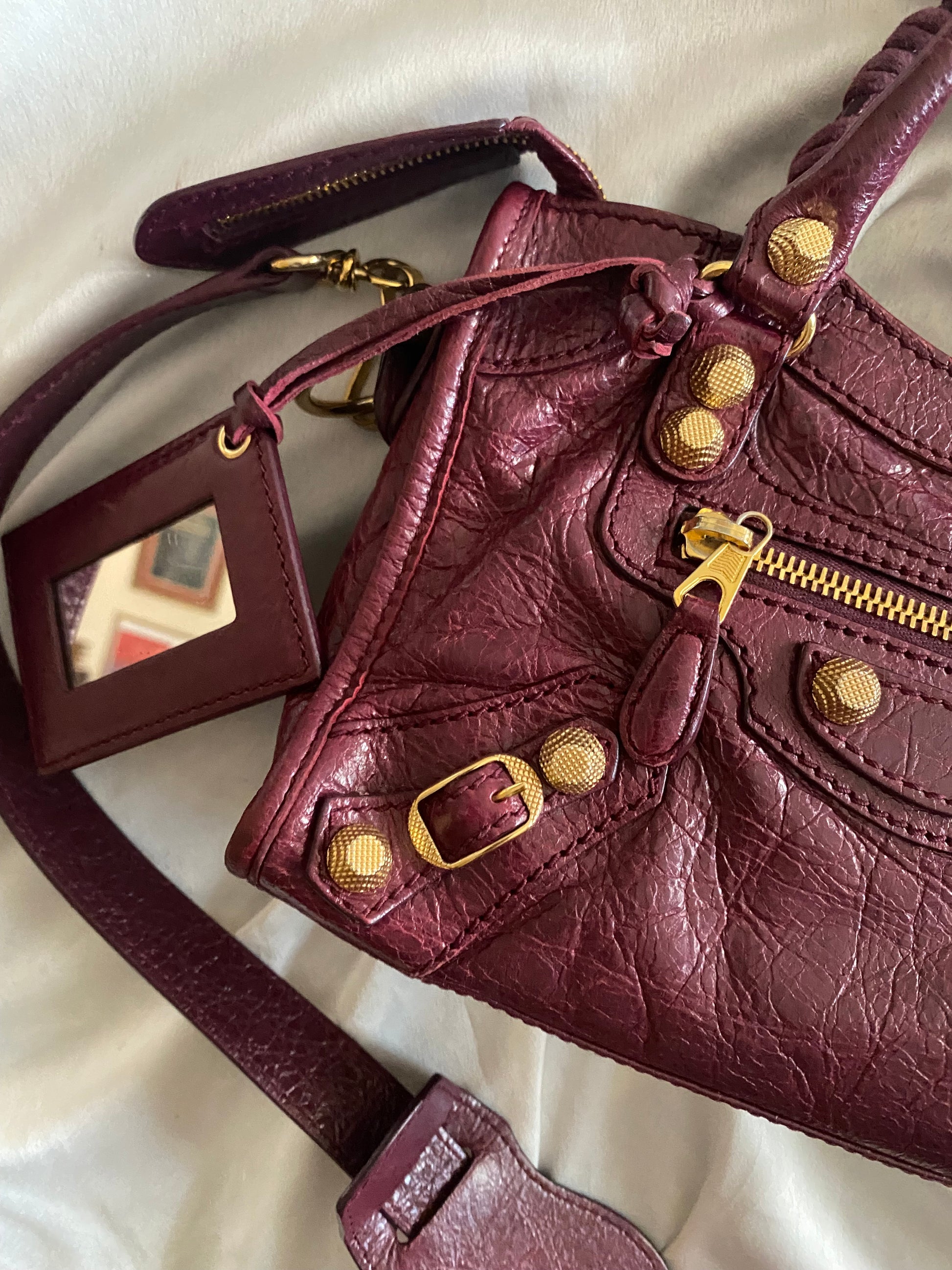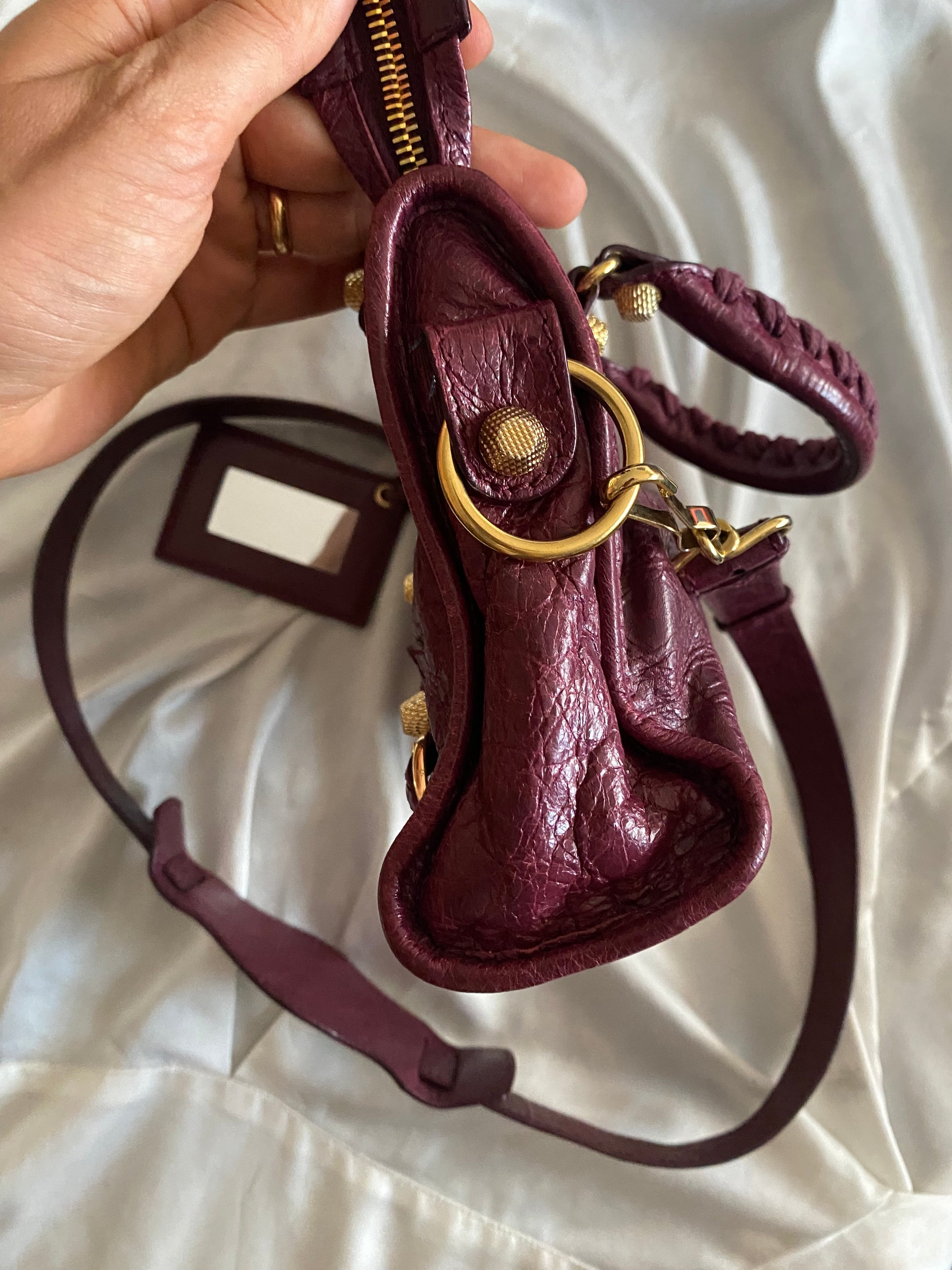 meravigliosa e unica balenciaga mini city del 2016 in pelle d’agnello arena in colore stupendo violet prune del f/w 2016 in giant hardware 12 oro. Usata con qualche segno su angoli e bordino. Cordino perfetto. buonissime condizioni generali.