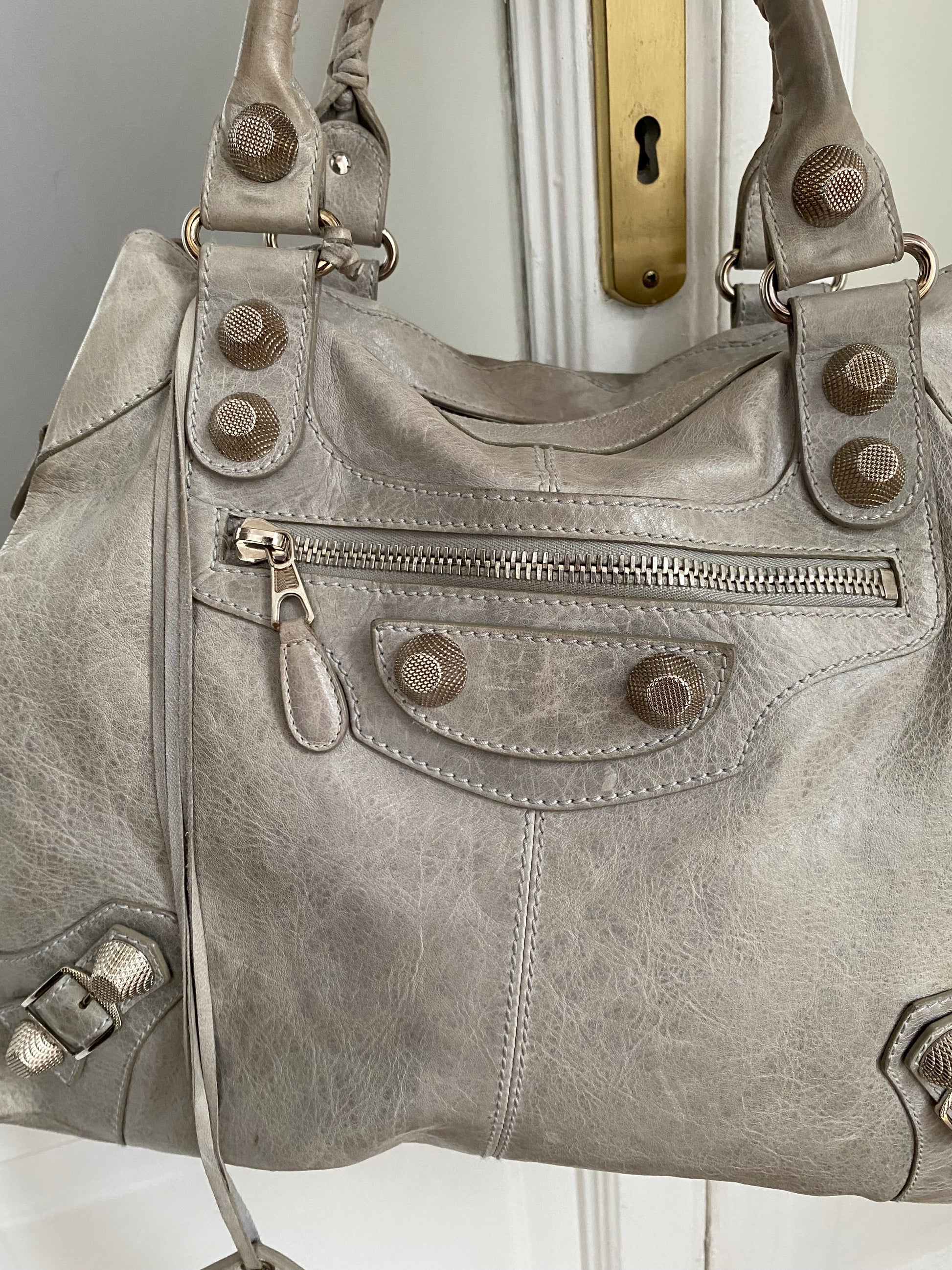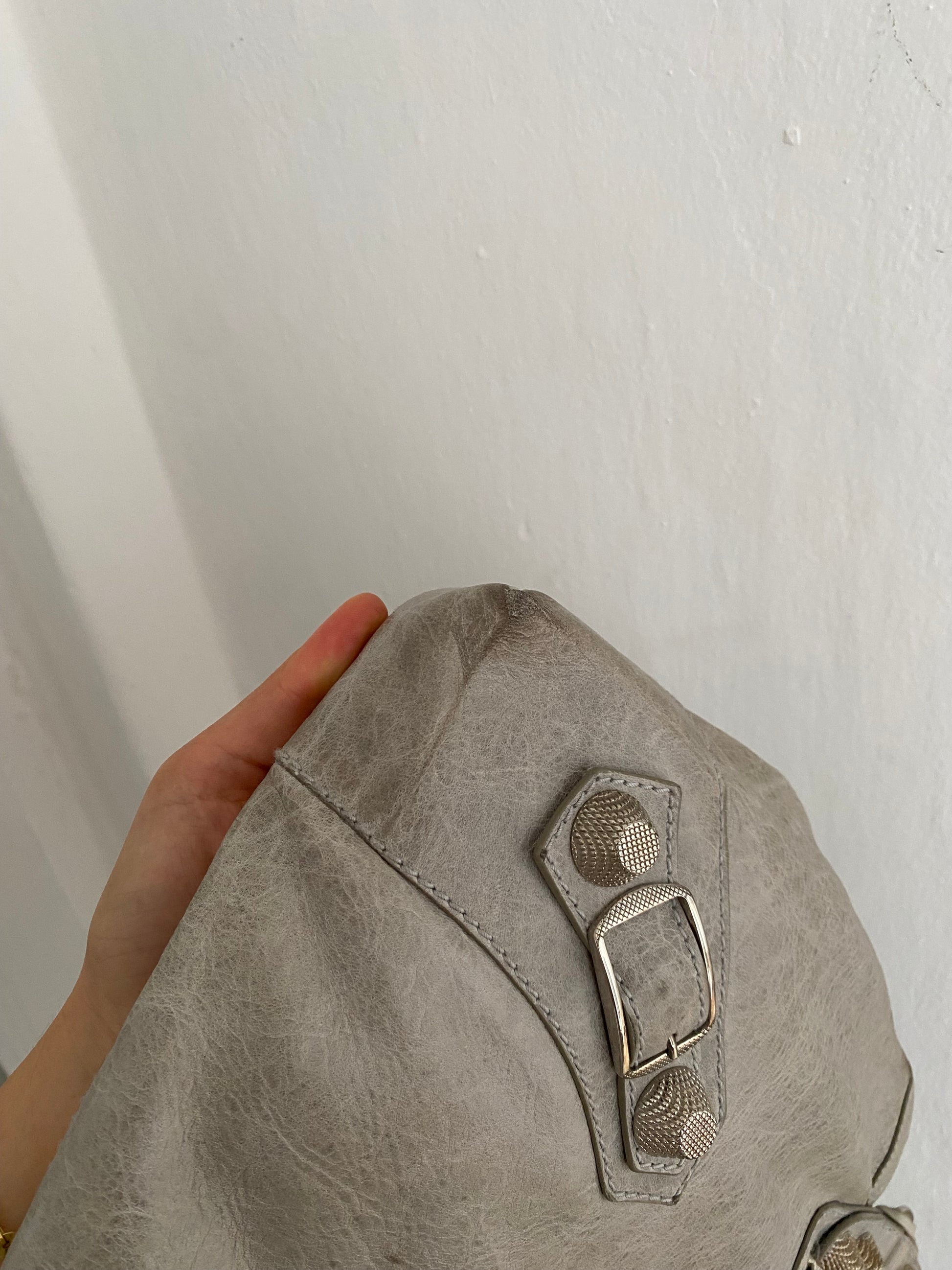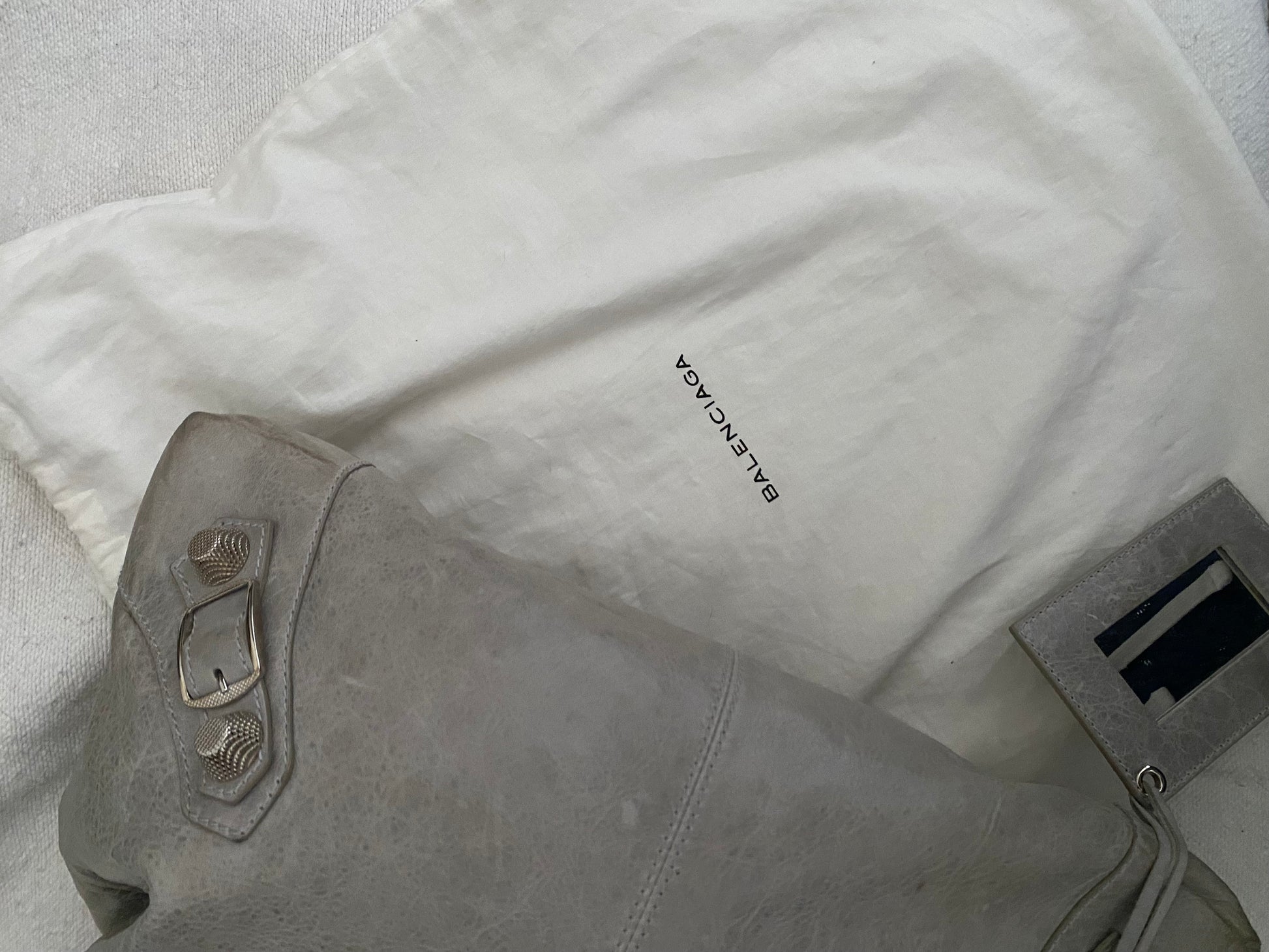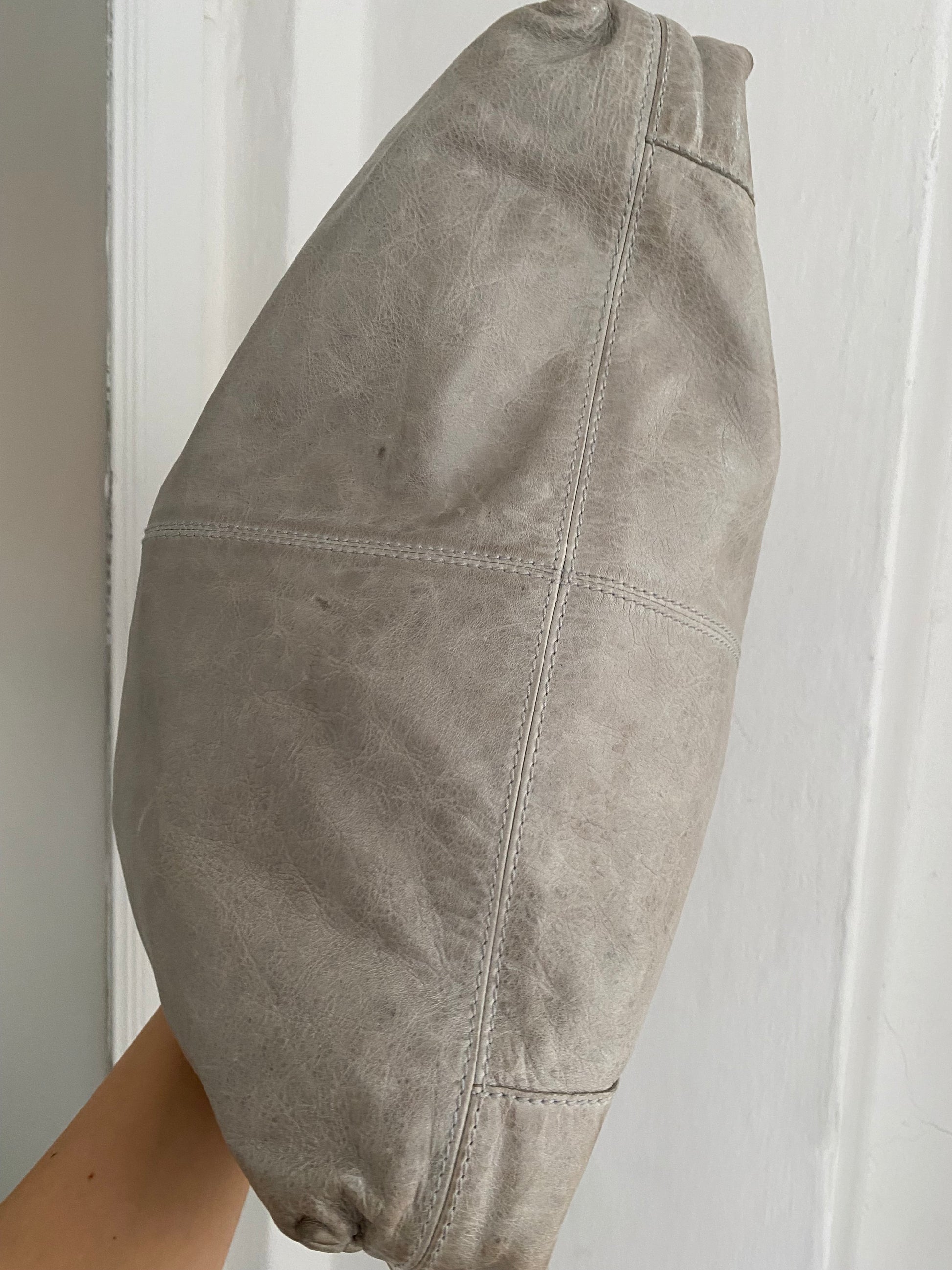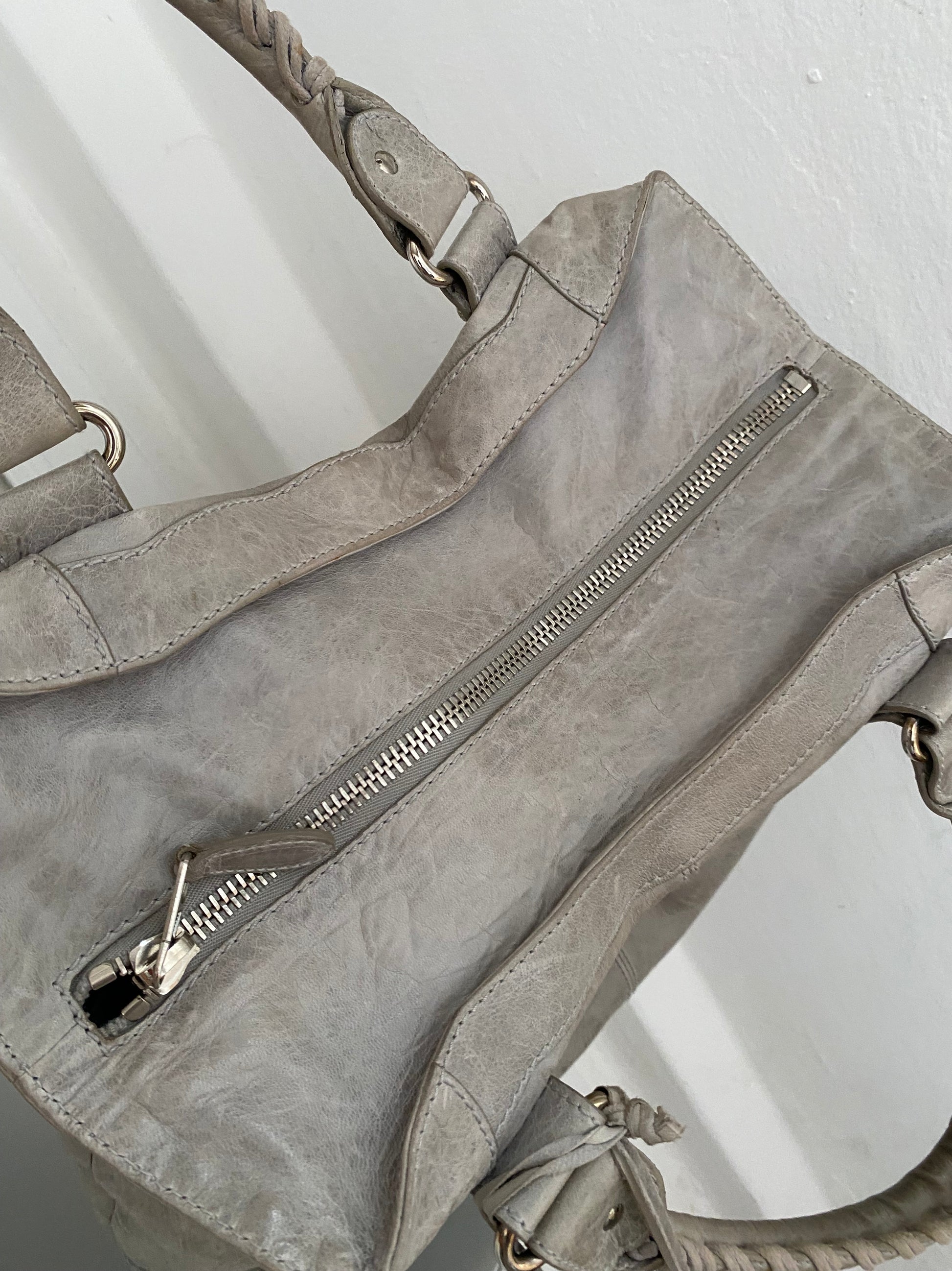 Balenciaga the brief colore argent f/w 2008. Caratteristica pelle invecchiata. Qualche segno sulla pelle e su un angolo, ma buonissime condizioni generali. Interno pulito, unica micro macchia sotto l’etichetta. Pazzesca e stupenda