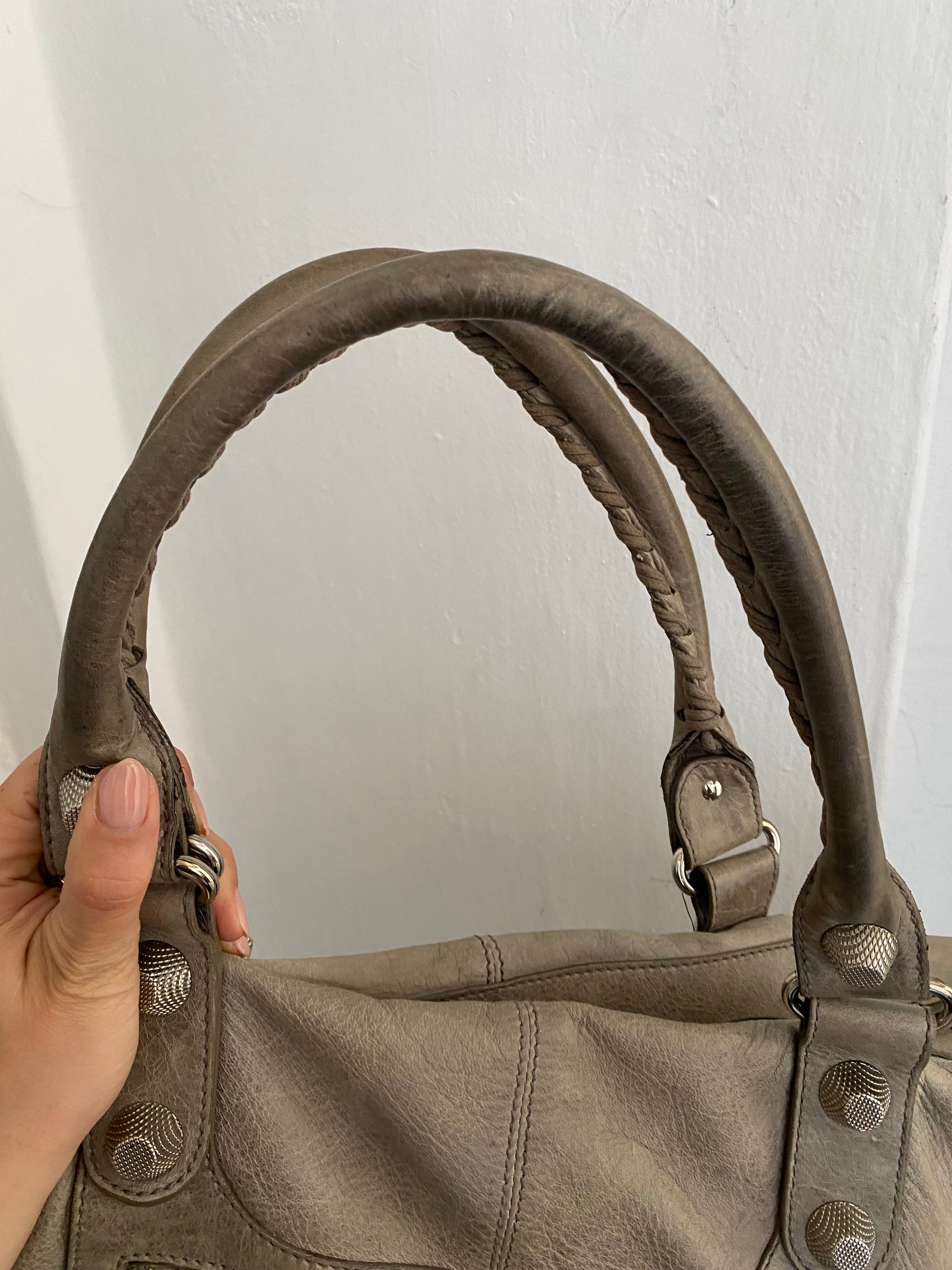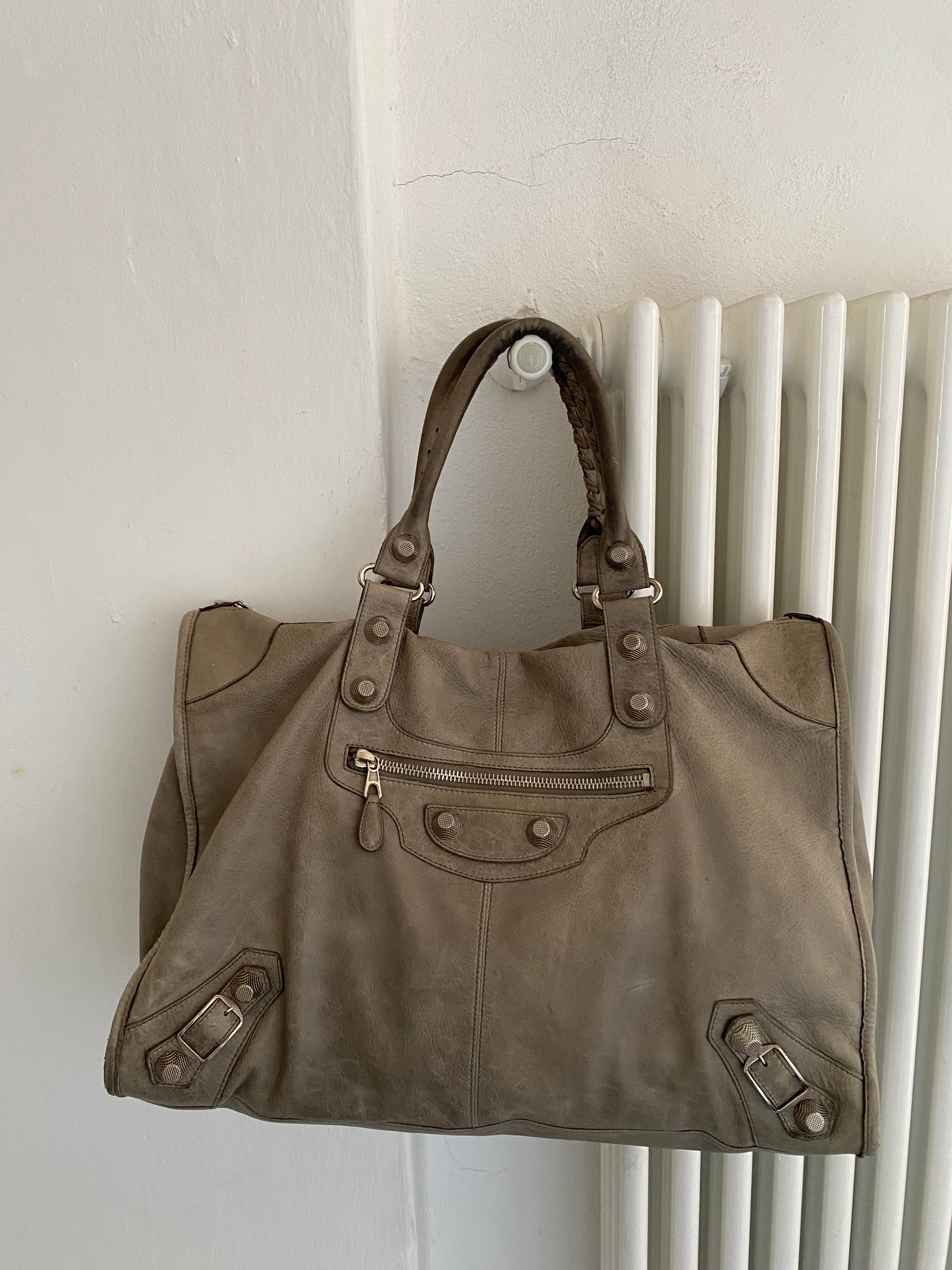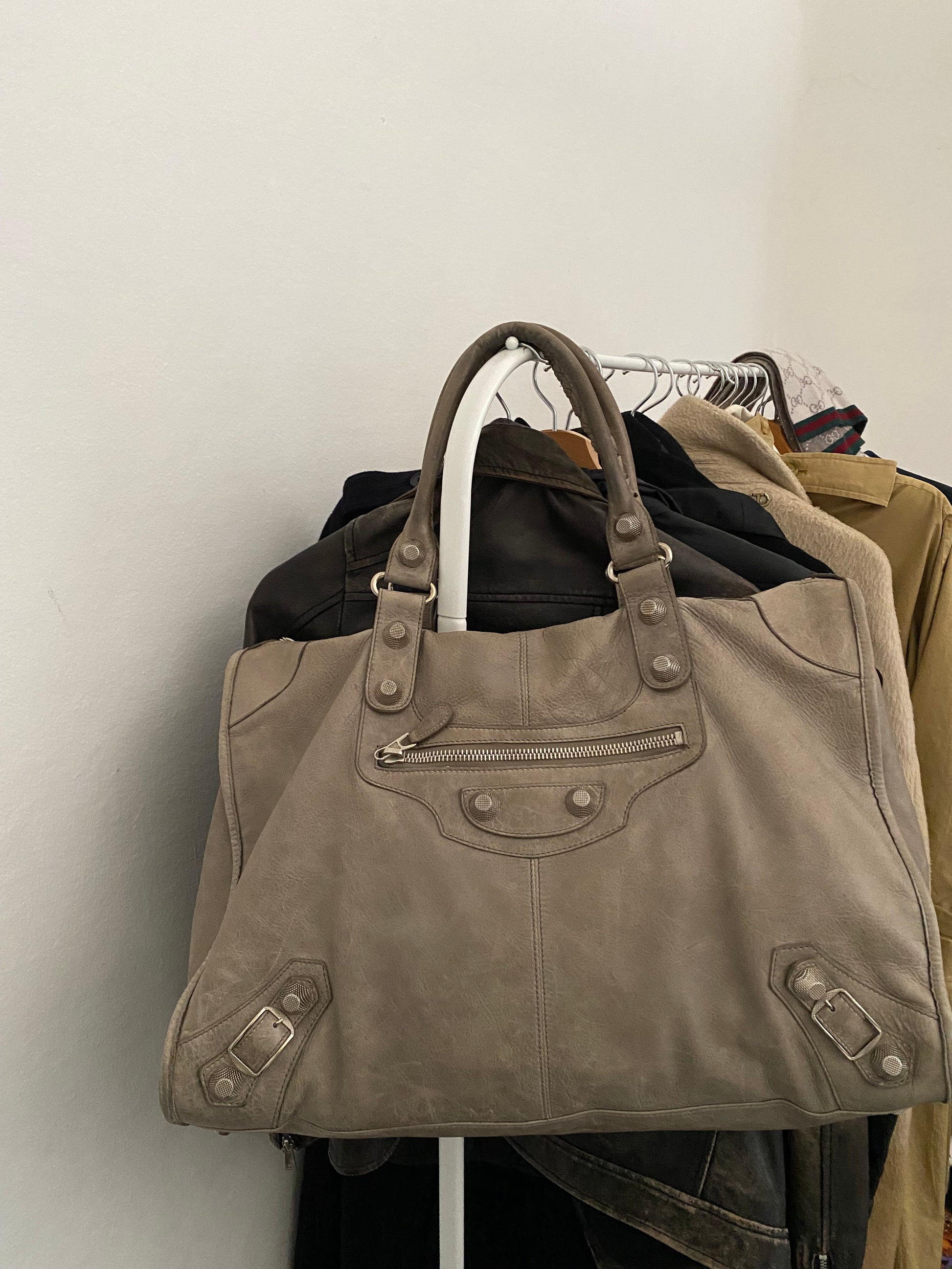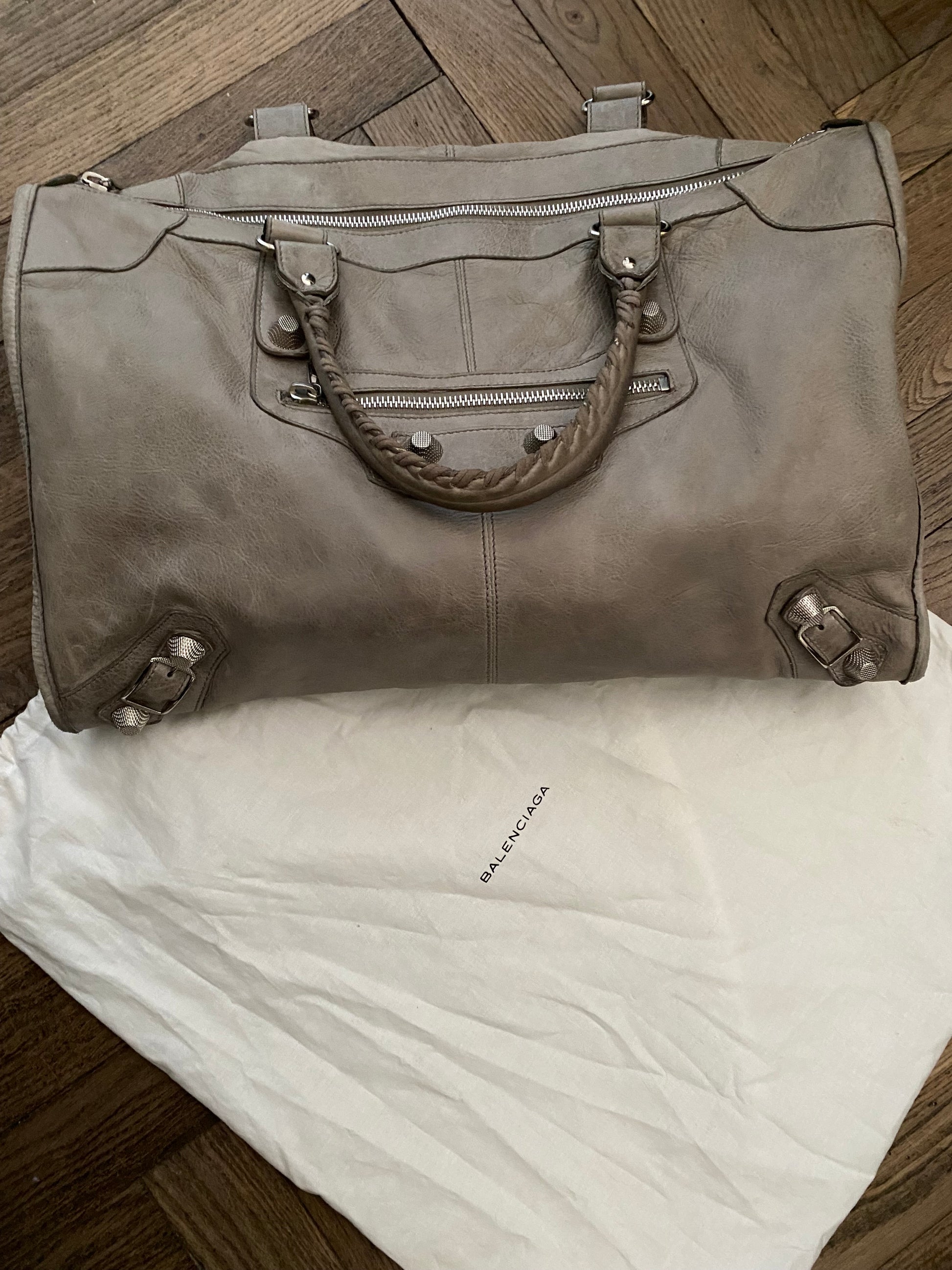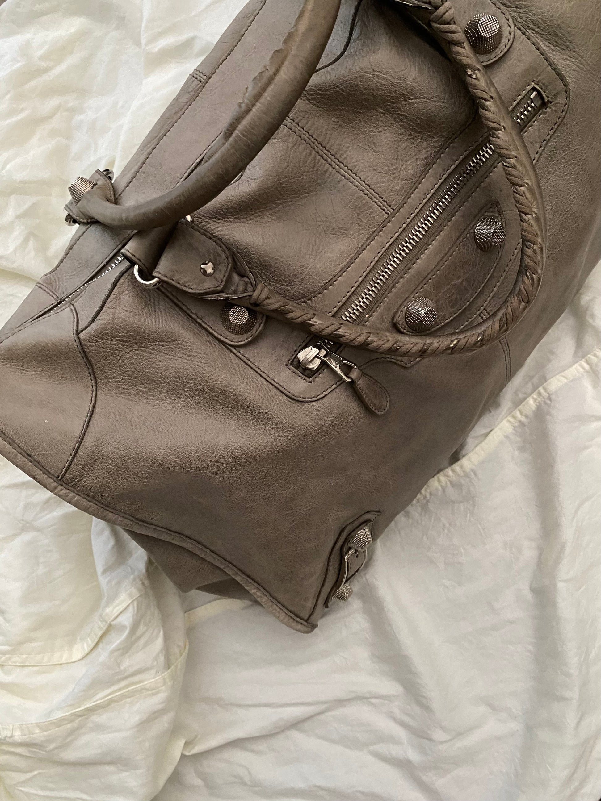 Pazzesca balenciaga weekender in giant hardware silver del fall winter 2009 (colore galet), enorme e bellissima. Qualche segno sulla pelle e sugli angoli, buonissime condizioni generali.