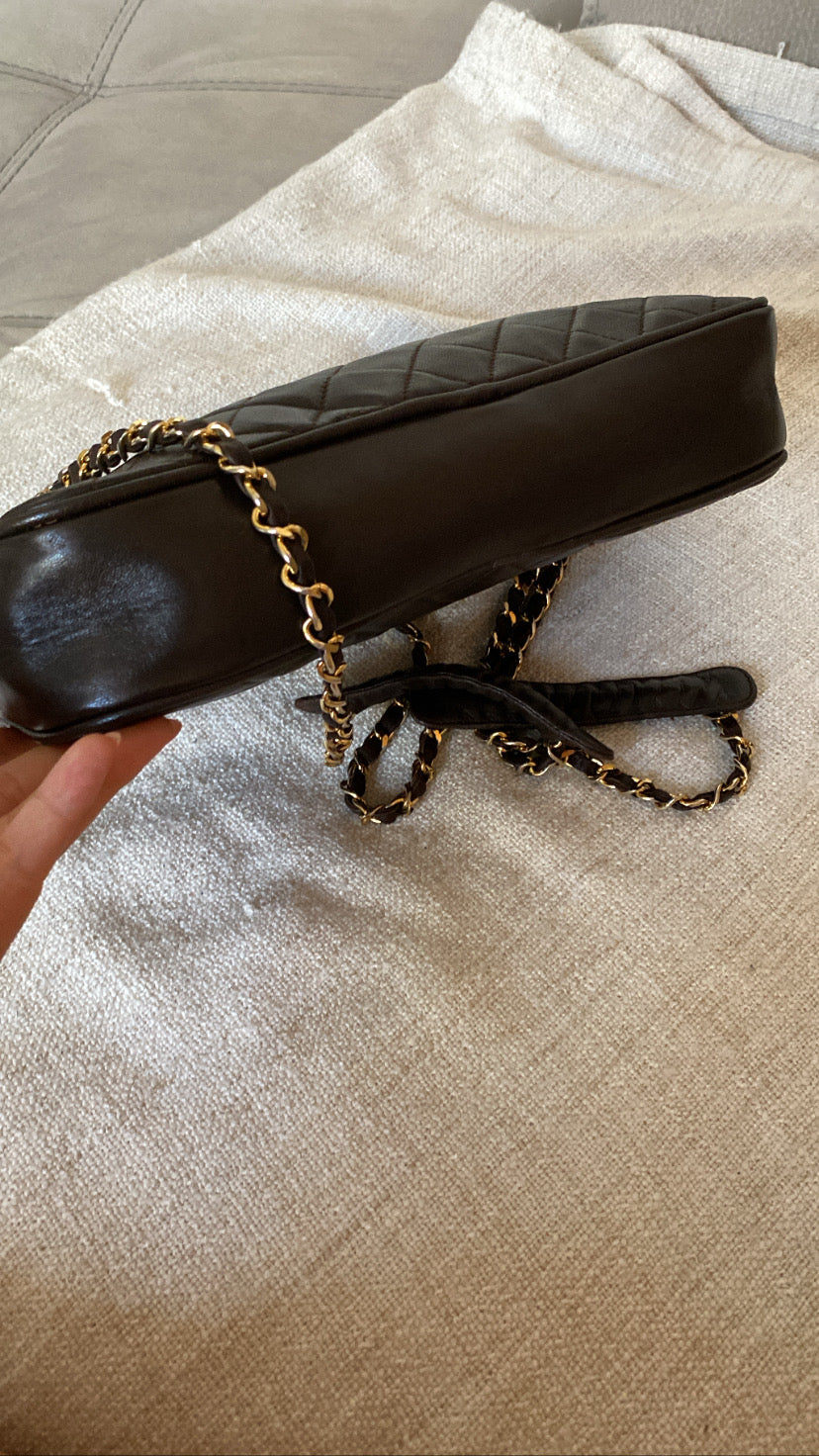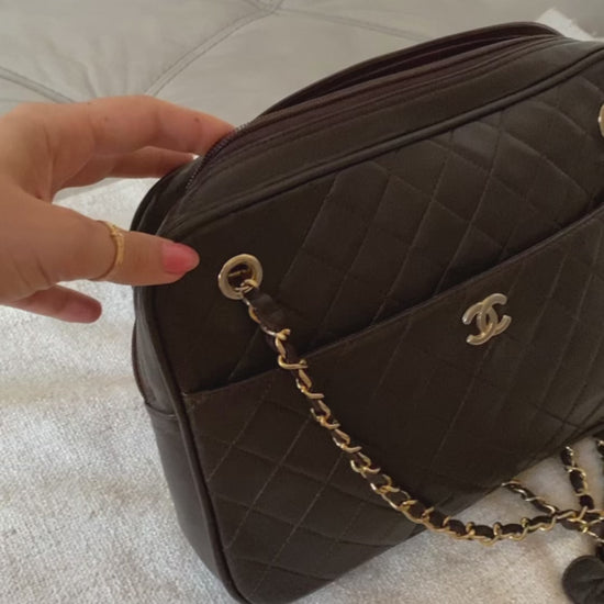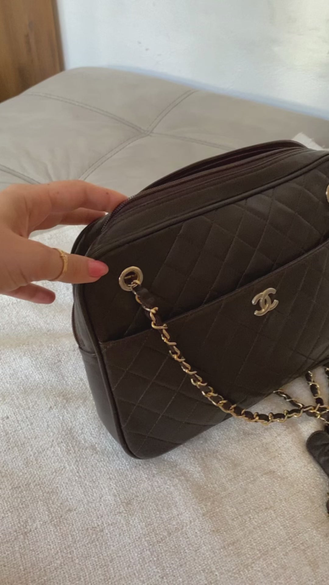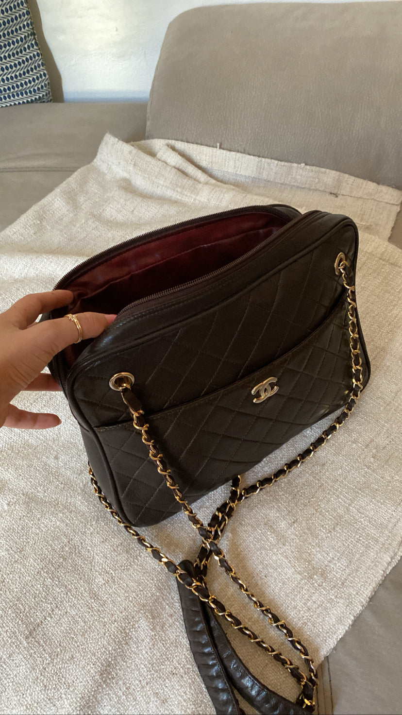 Chanel camera bag cioccolato in ottime condizioni. Pelle d’agnello e hardware oro. Bordi perfetti.