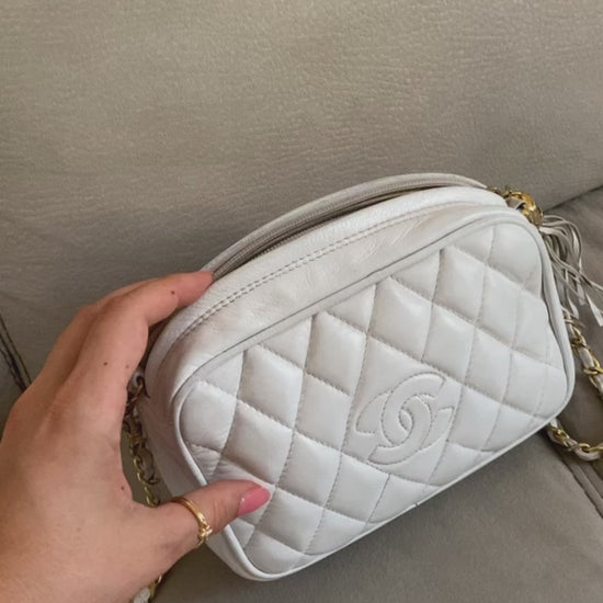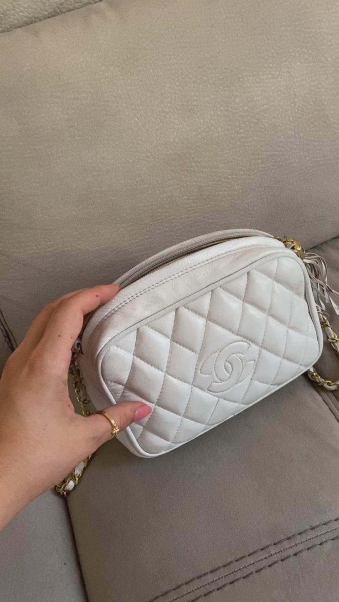 Stupenda mini camera bag di chanel Bianca in pelle d’agnello con classica lavorazione matalasse.