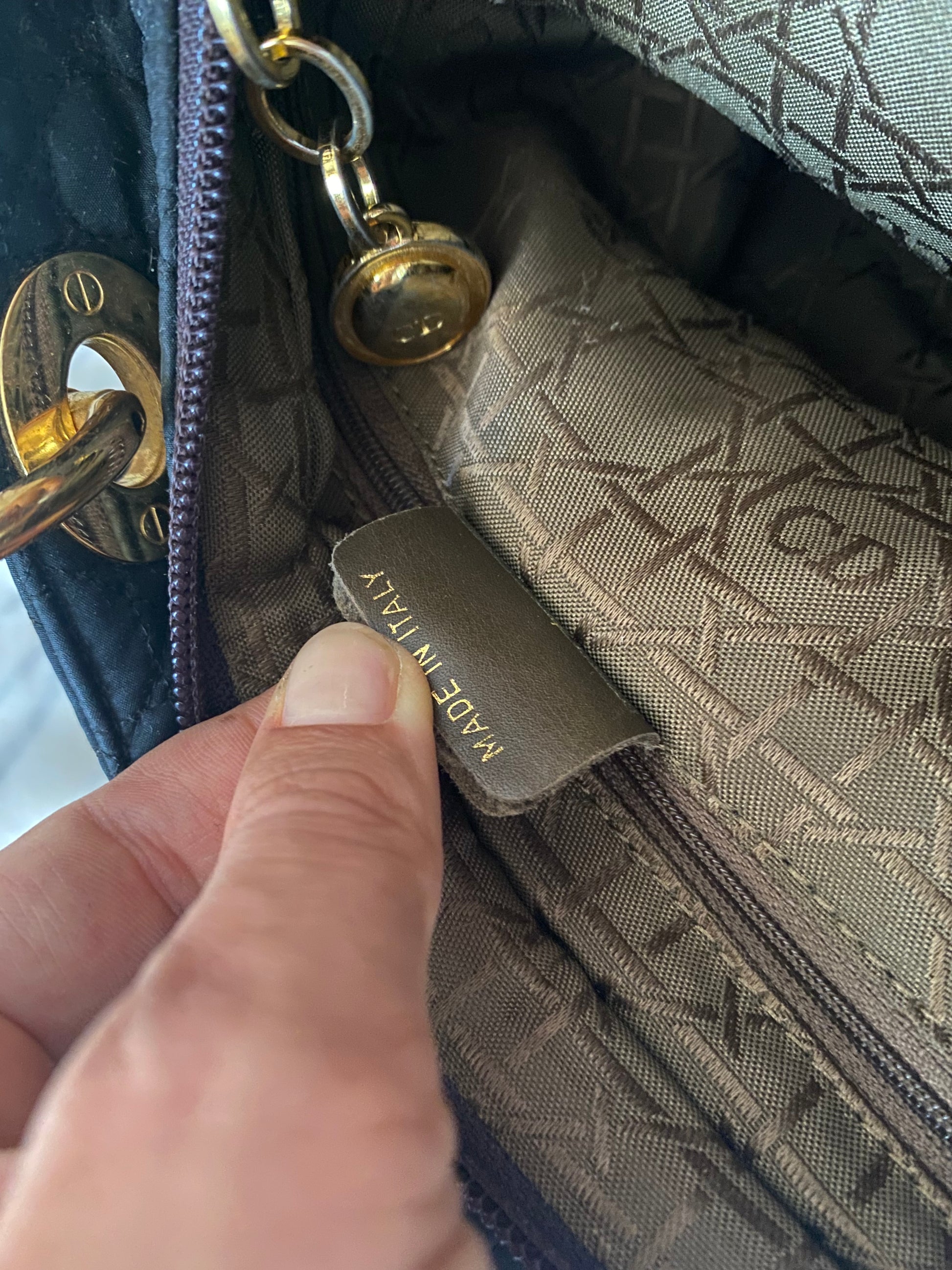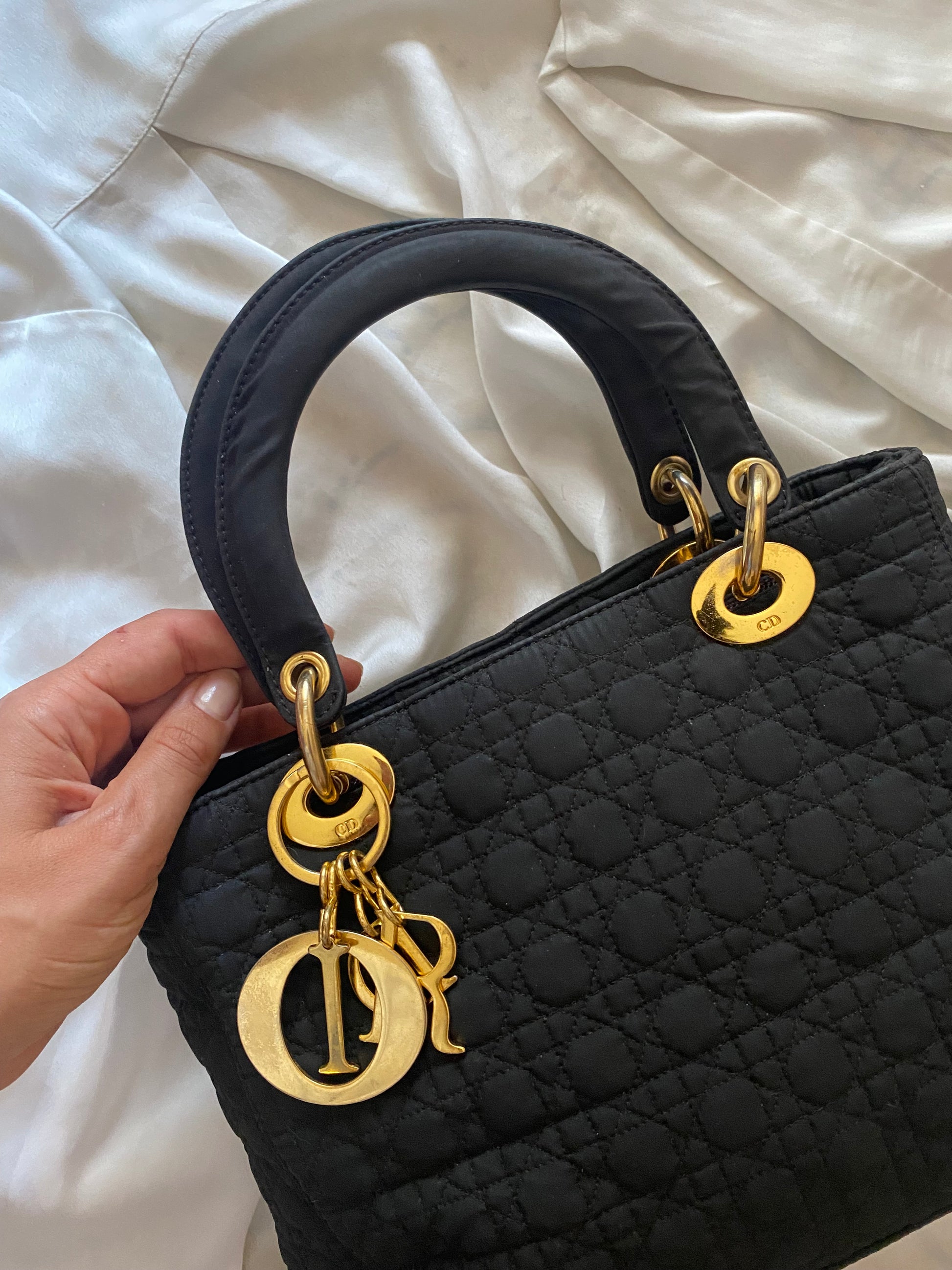 iconica lady Dior in tessuto cannage nero. Qualche segnetto sull’hardware, che è stato placcato in oro 24 carati. Forma solida, manici ottimi.