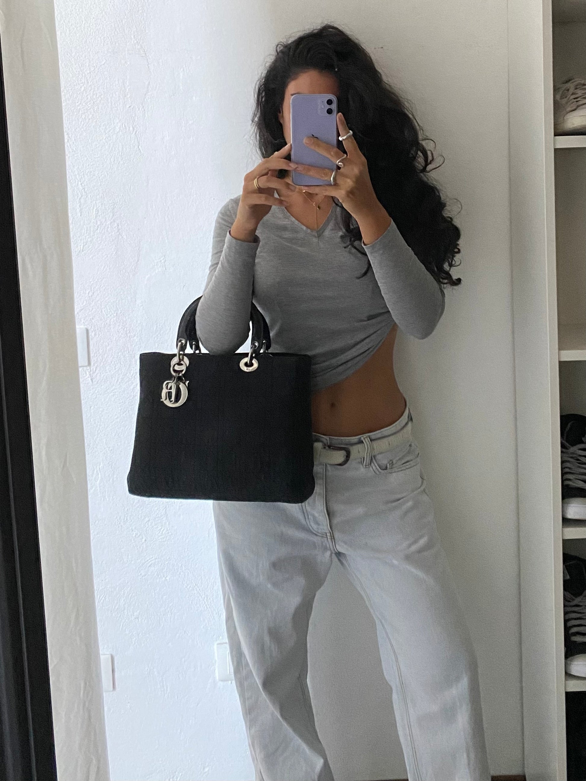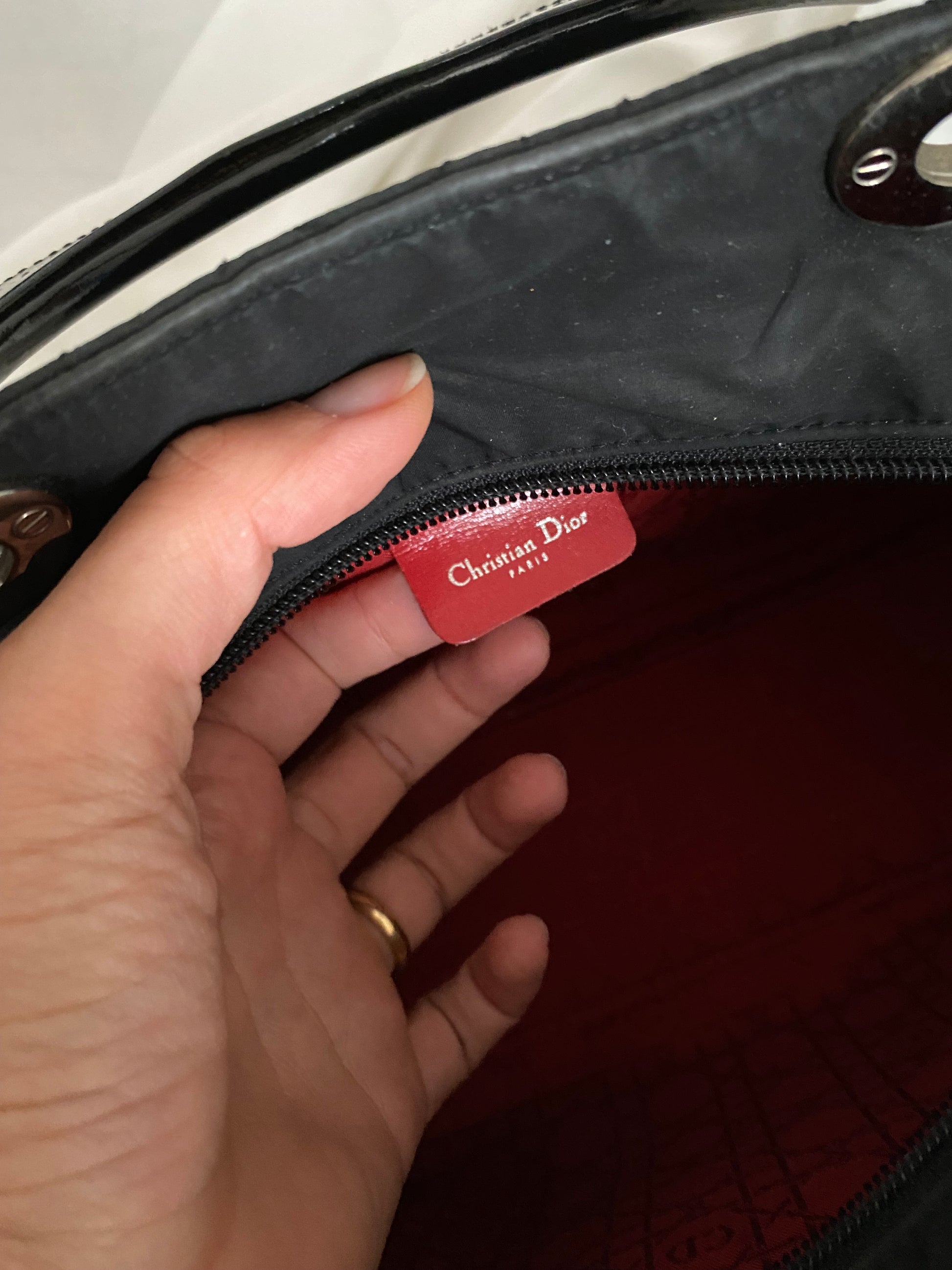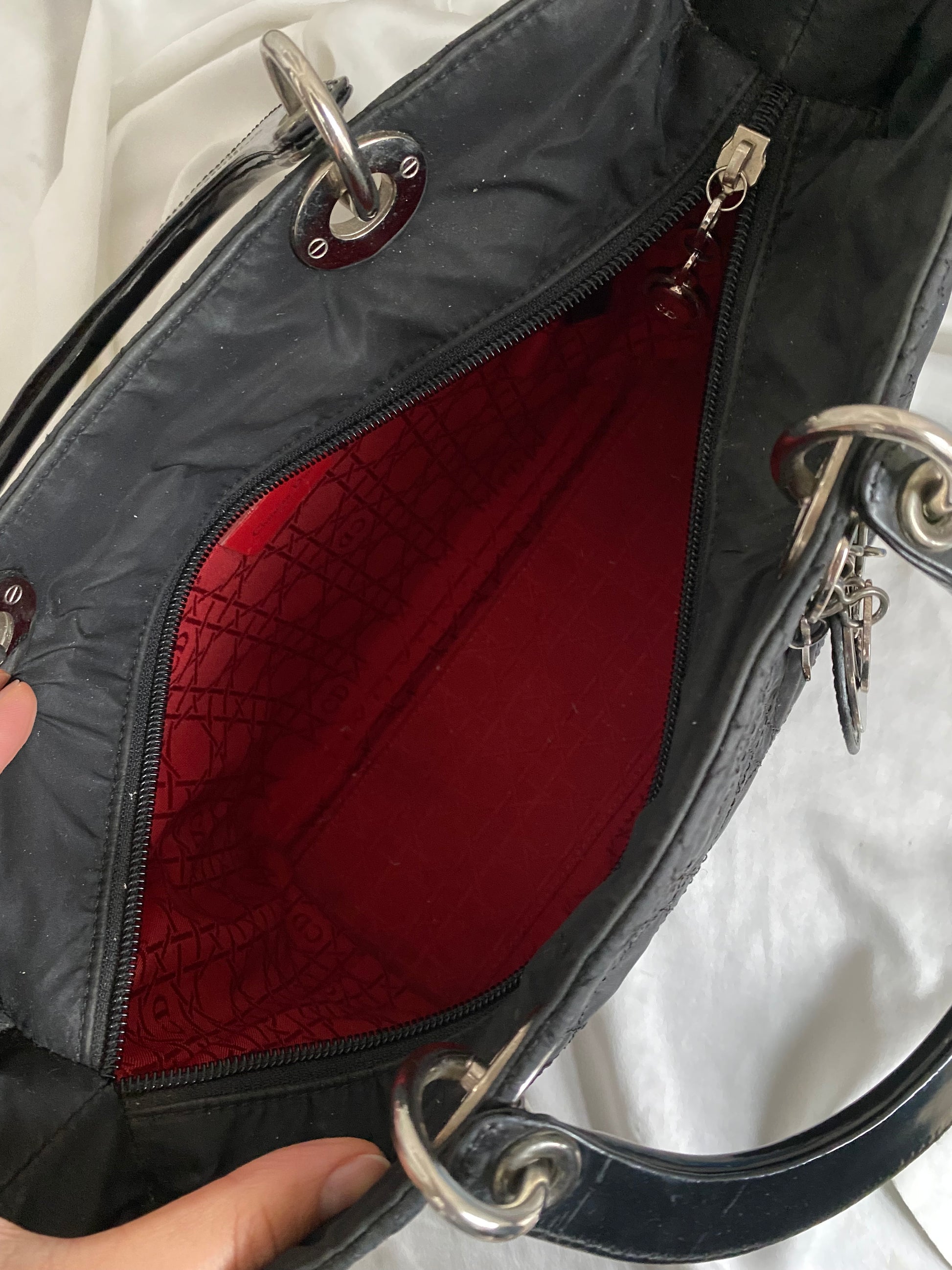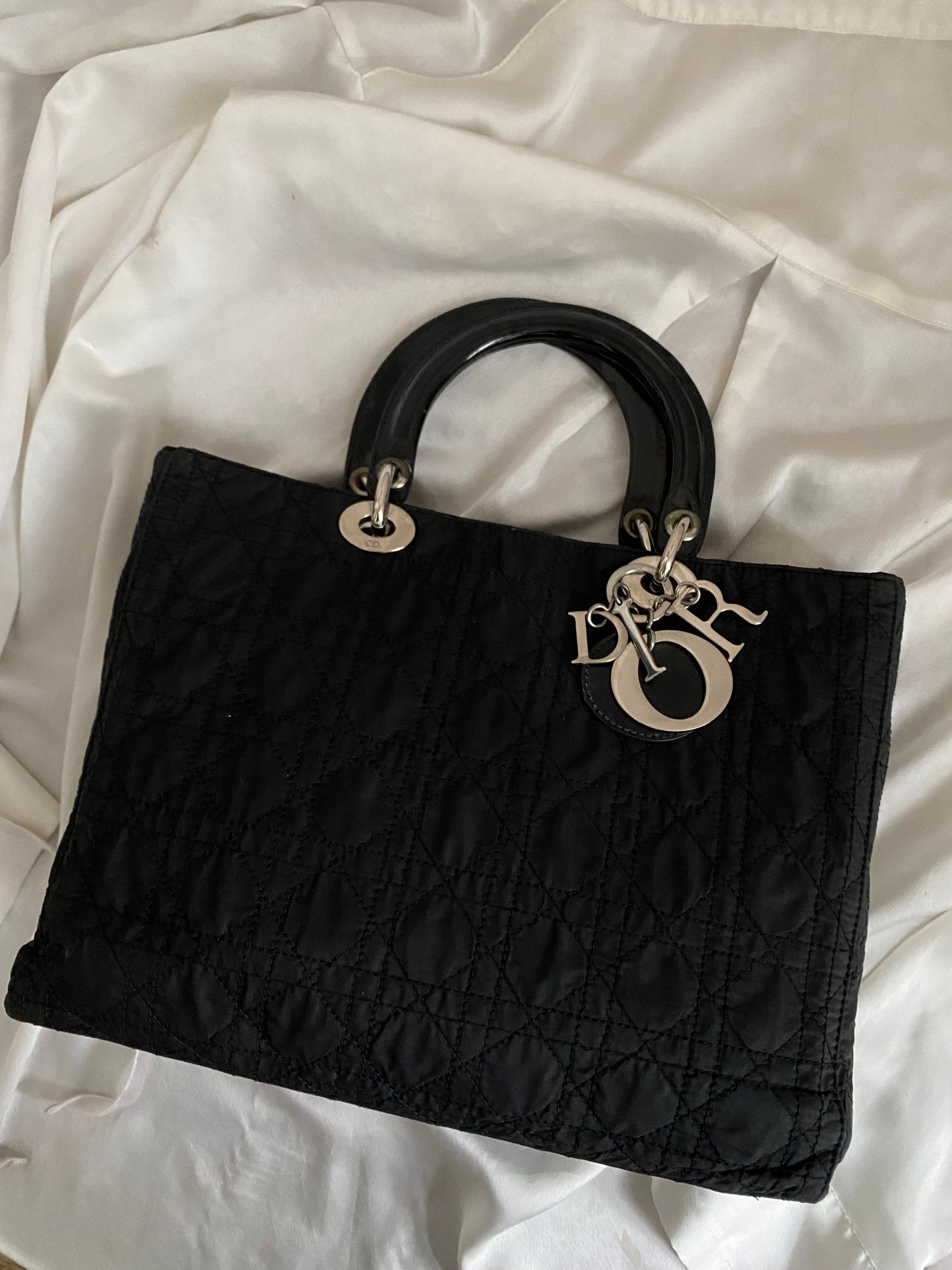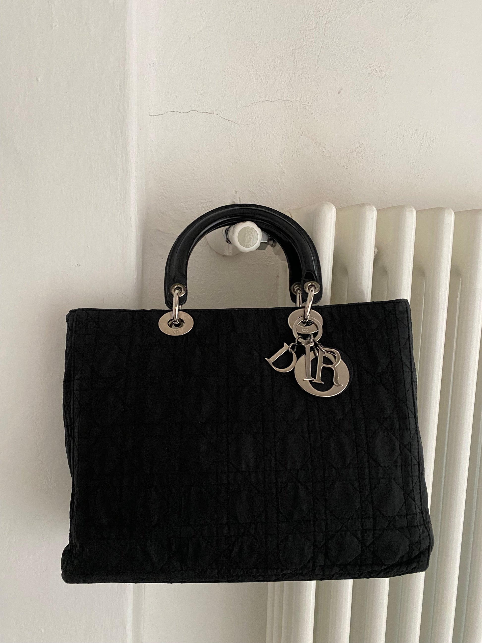 iconica lady Dior in tessuto cannage nero e misura media. Hardware lucente, struttura un po’ ammorbidita, manici solidi e stupendi in pelle verniciata.
