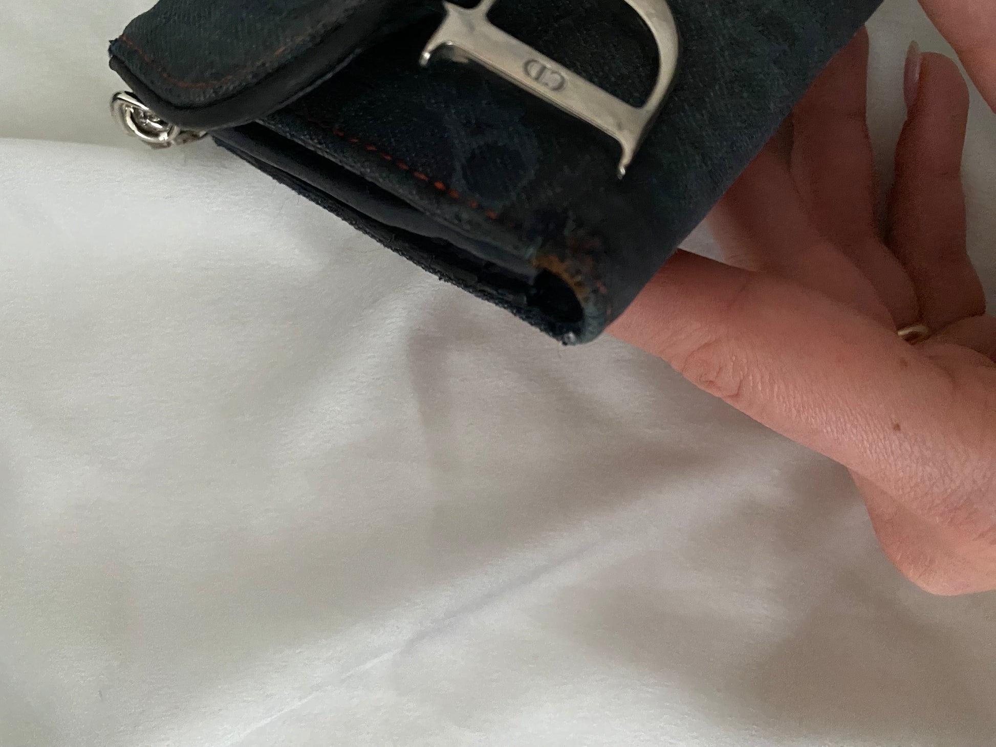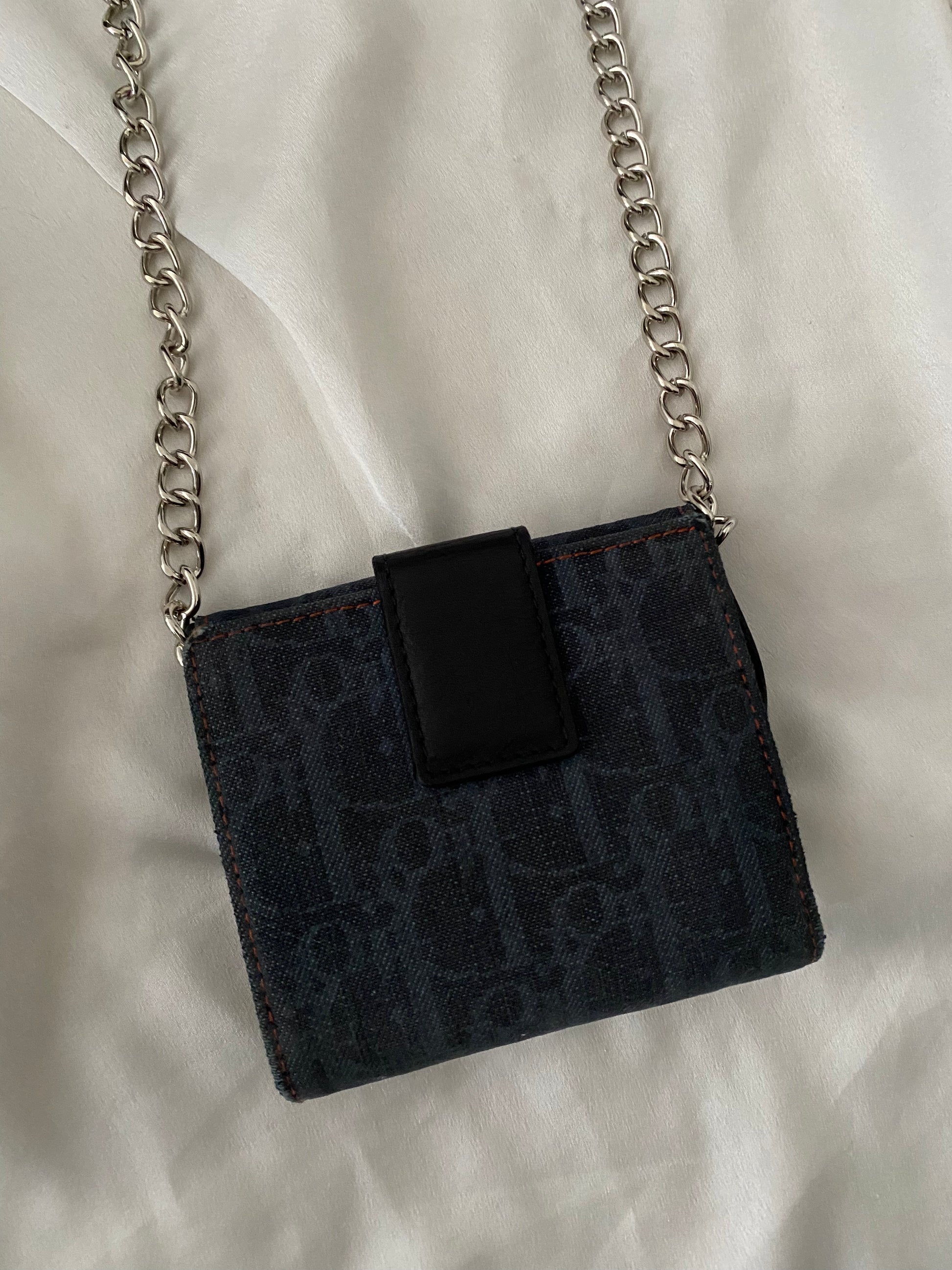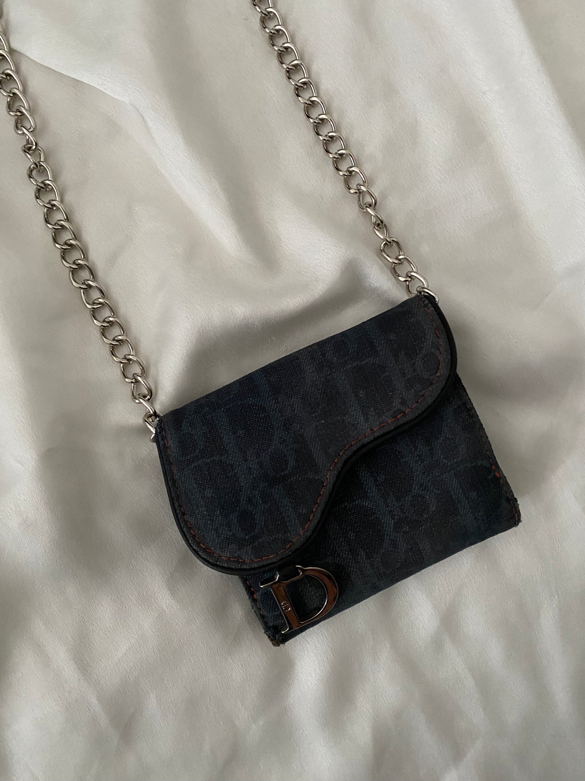 Mini saddle dior in jeans con classico monogram. Ricavata da un portafoglio. Alcune imperfezioni sui bordi (foto) ma perfetta una volta indossata. Buone condizioni generali. Catena aggiunta.