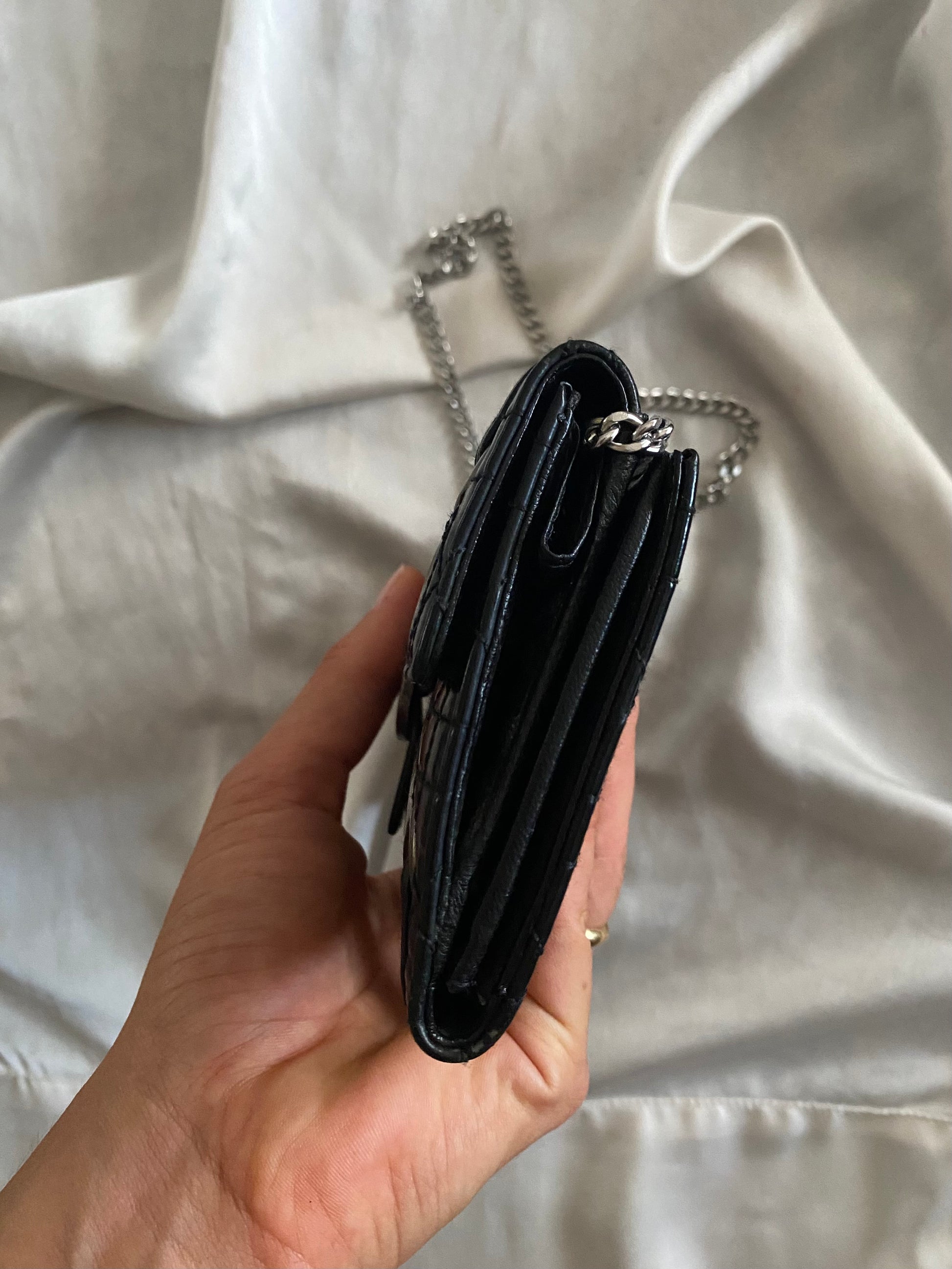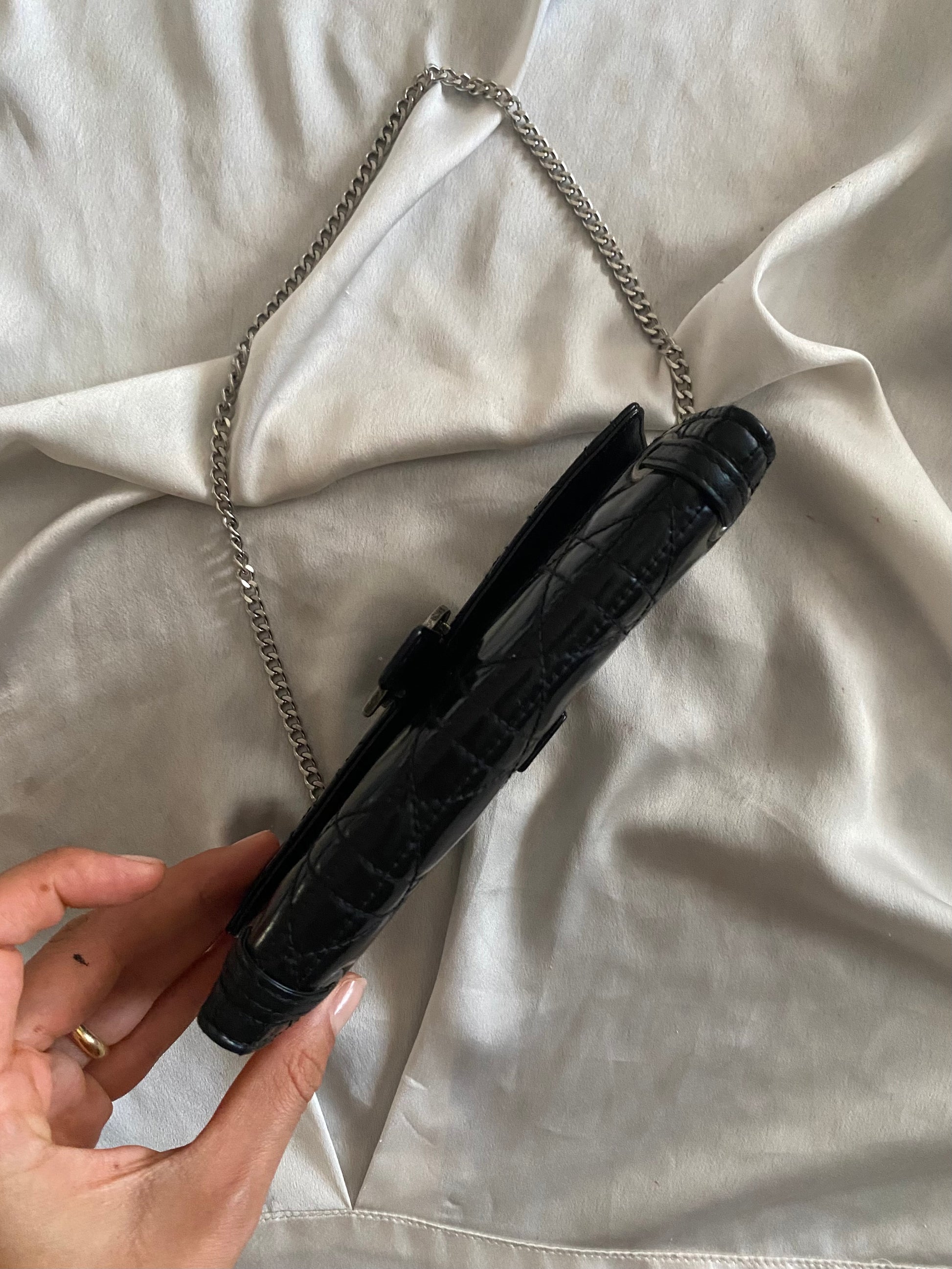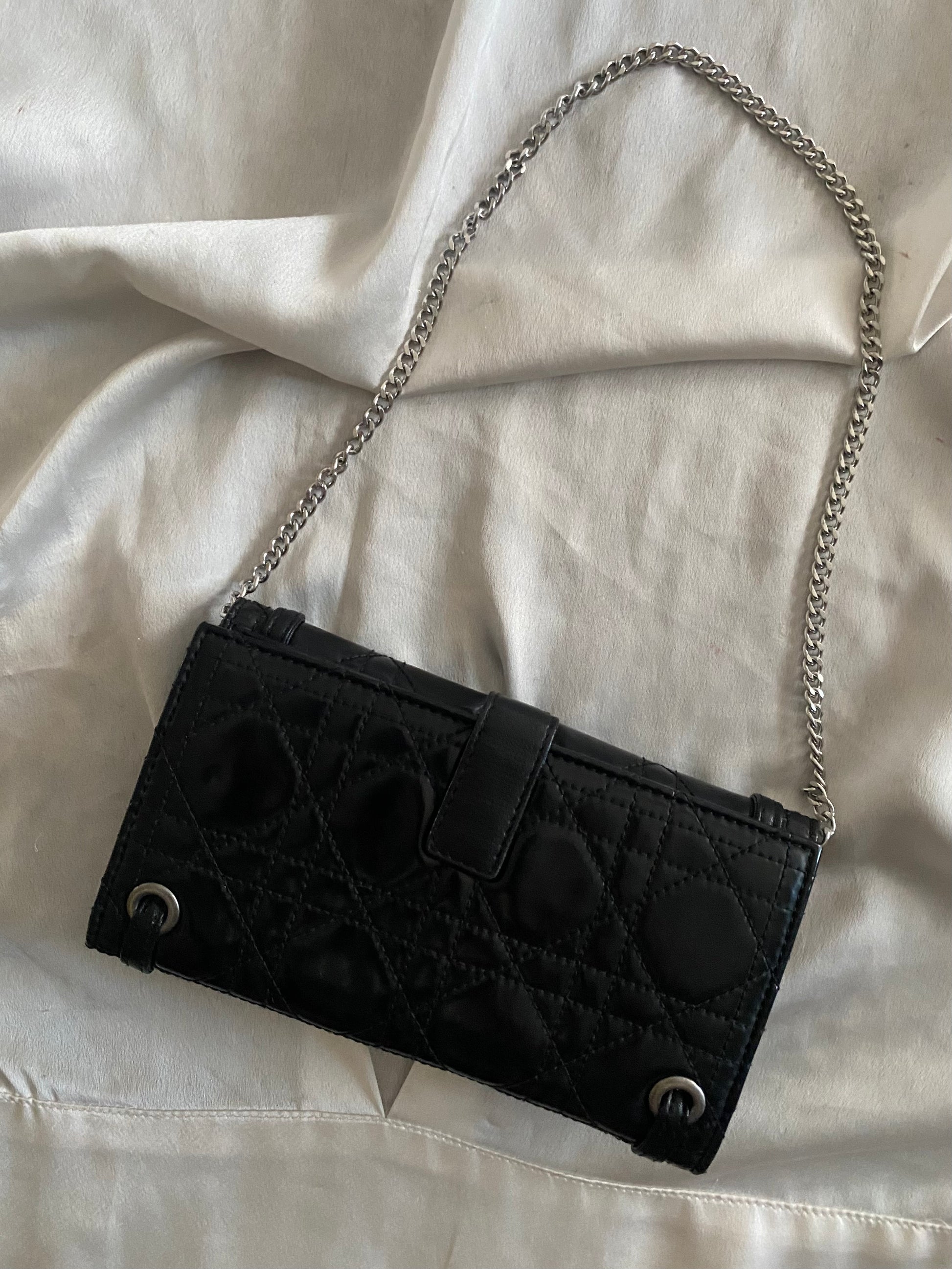 meravigliosa pochette/portafoglio dior dragonne in pelle nera con iconico cannage, lacci e logo silver effetto grunge. Era John galliano. Qualche segno poco visibile, buonissime condizioni generali.