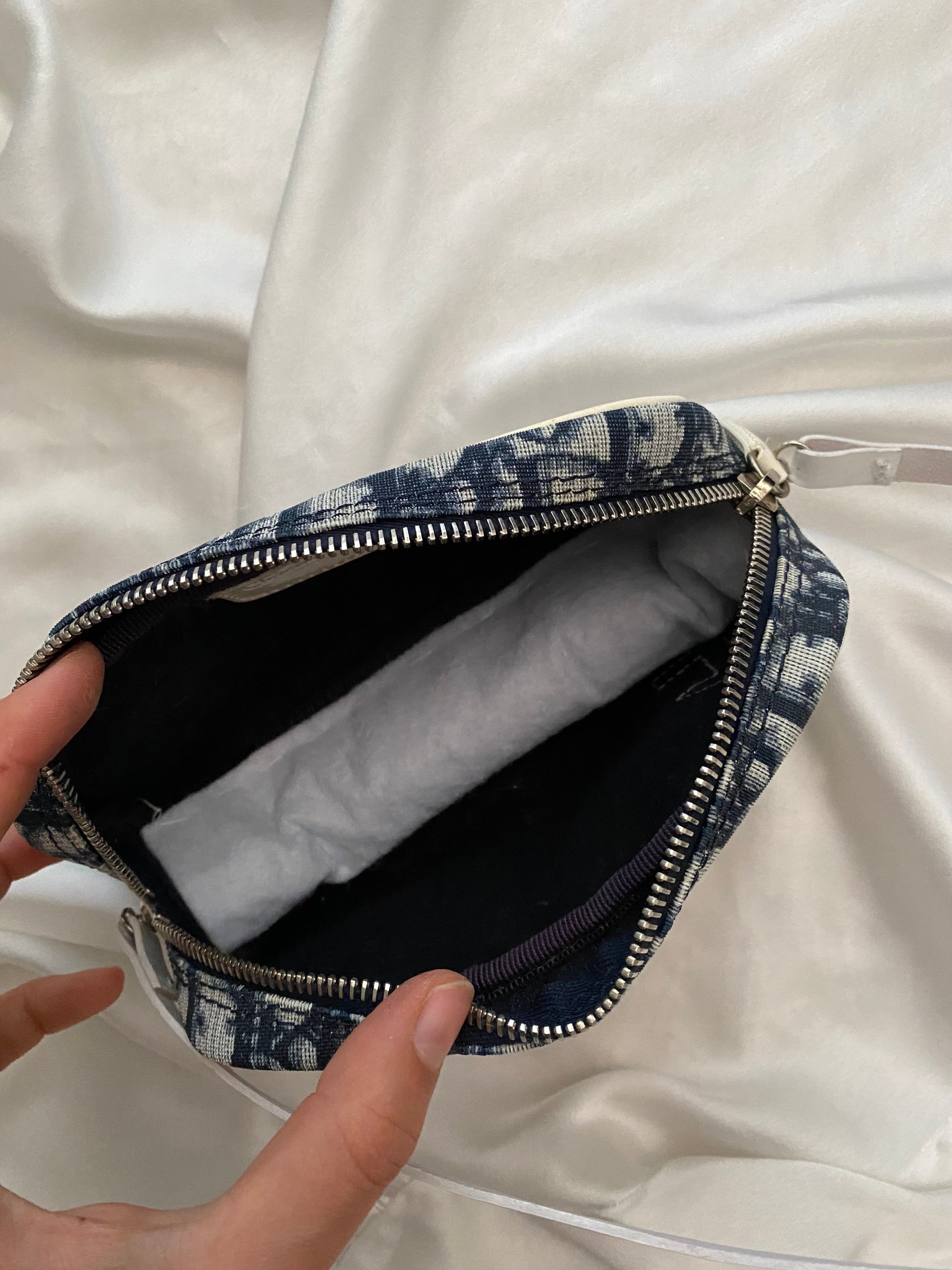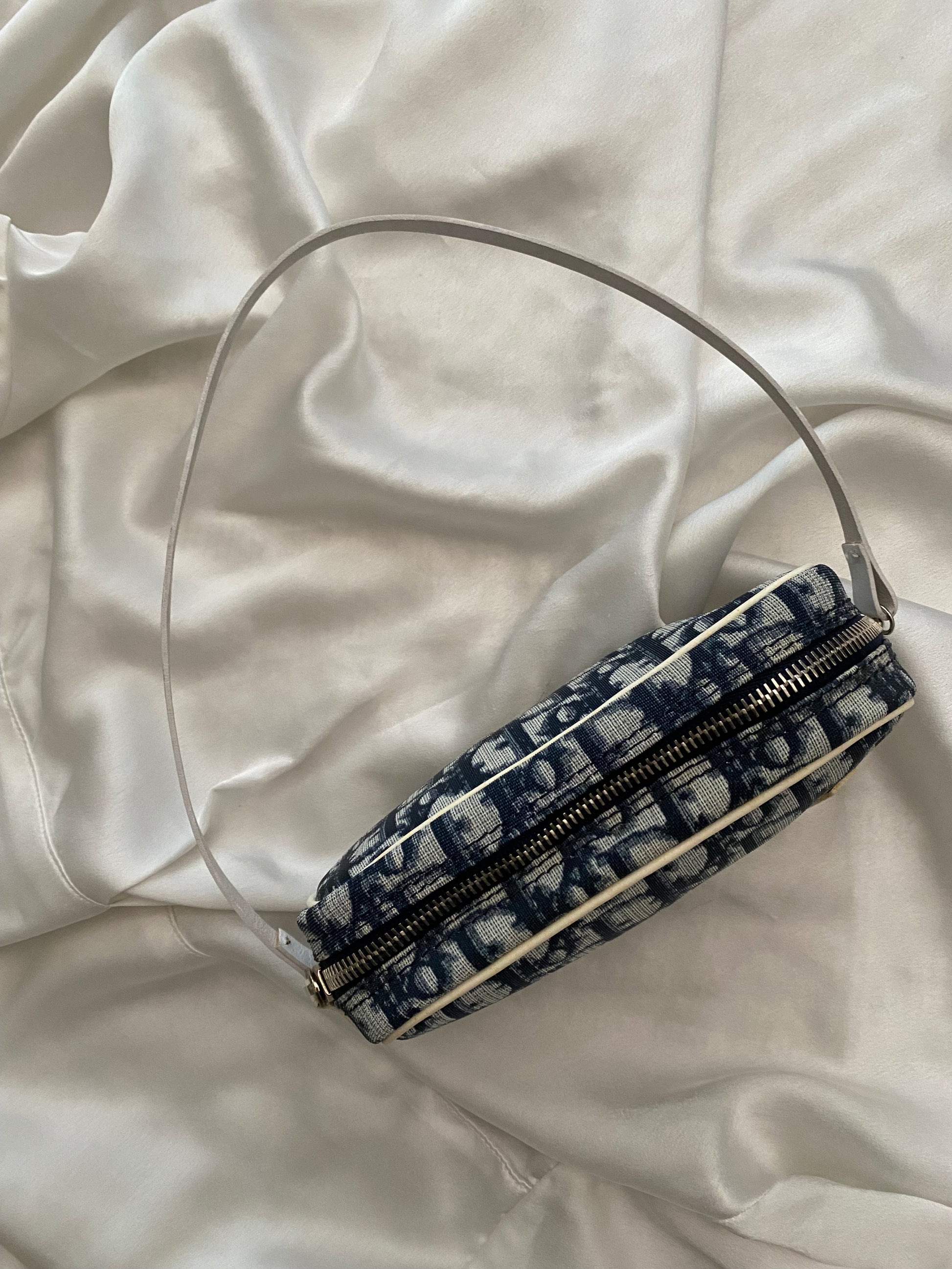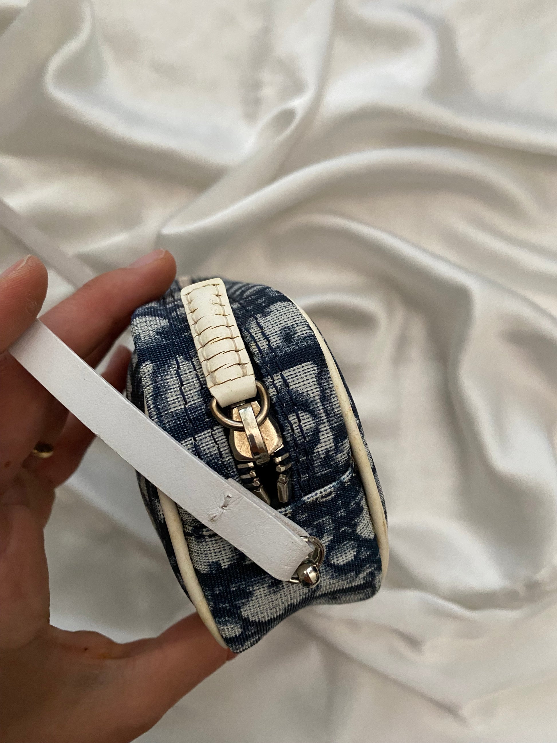 Mini dior trotter Pochette con monogram blu in tela. Pezzo iconico degli anni 2000. È stata aggiunta una tracollina in pelle bianca. Cursore con qualche crepa, per il resto perfetta. Venduta con fondo salvaborsa pesante per mantenere pulito l’interno e la borsa stabile.