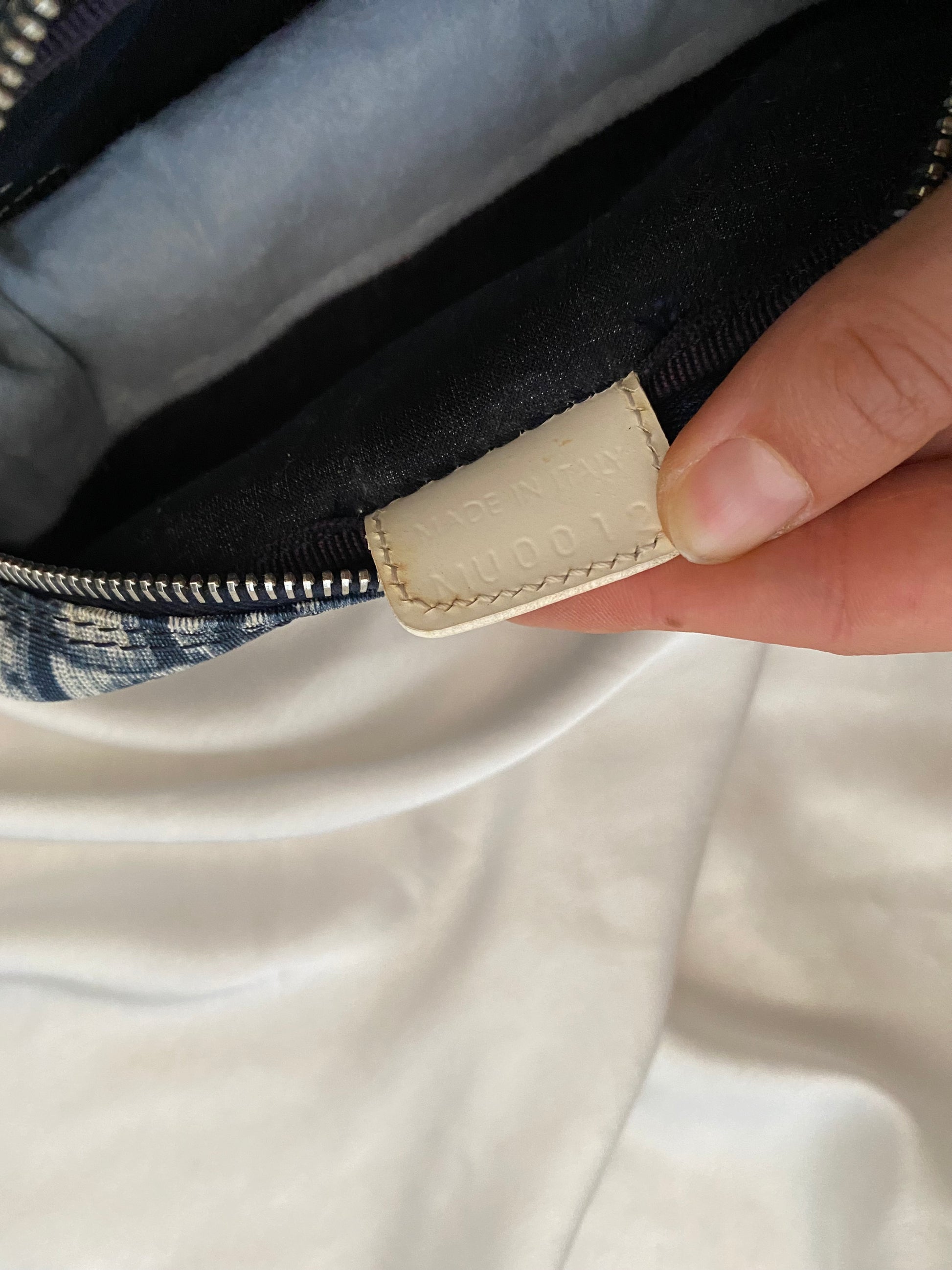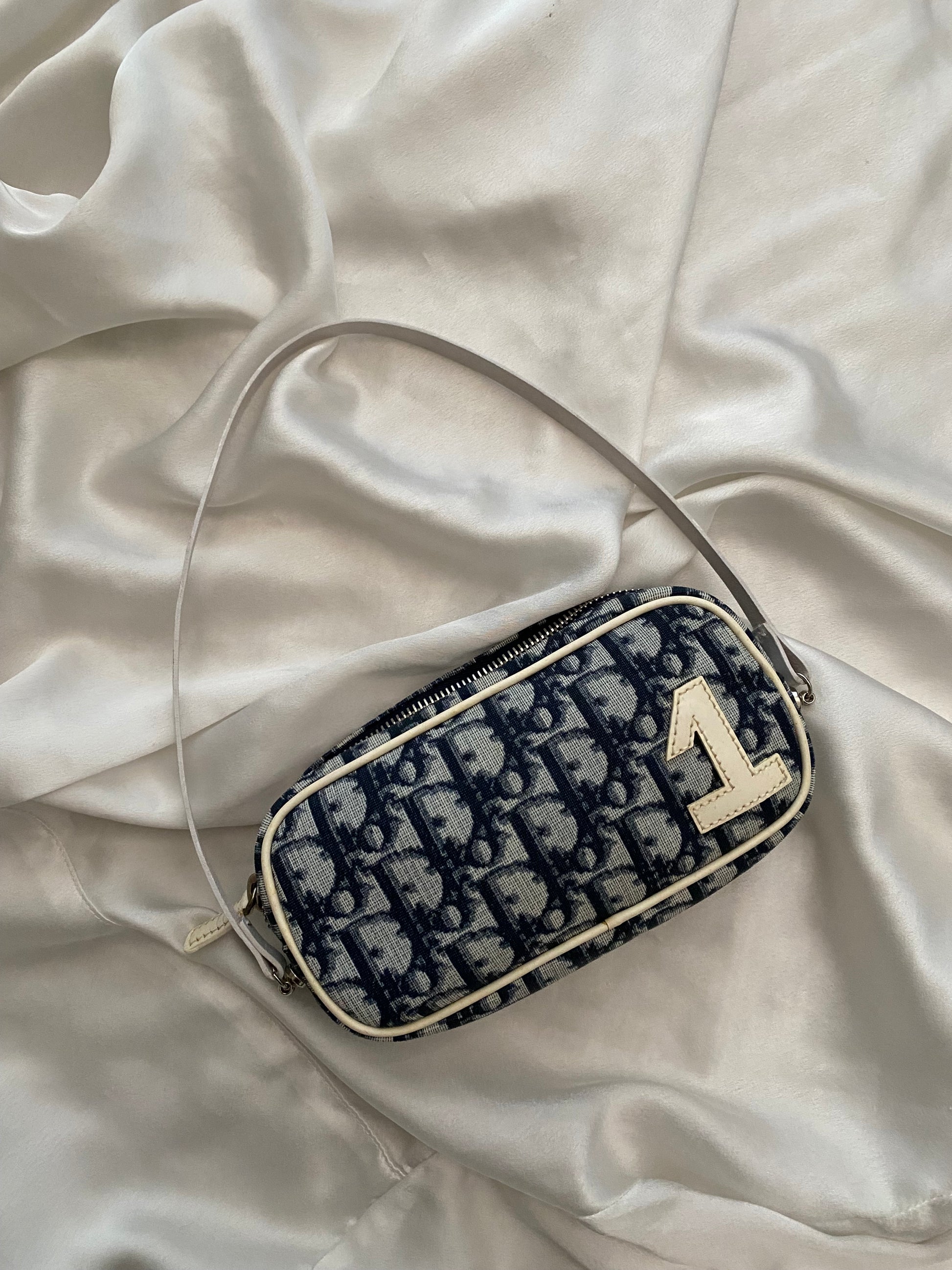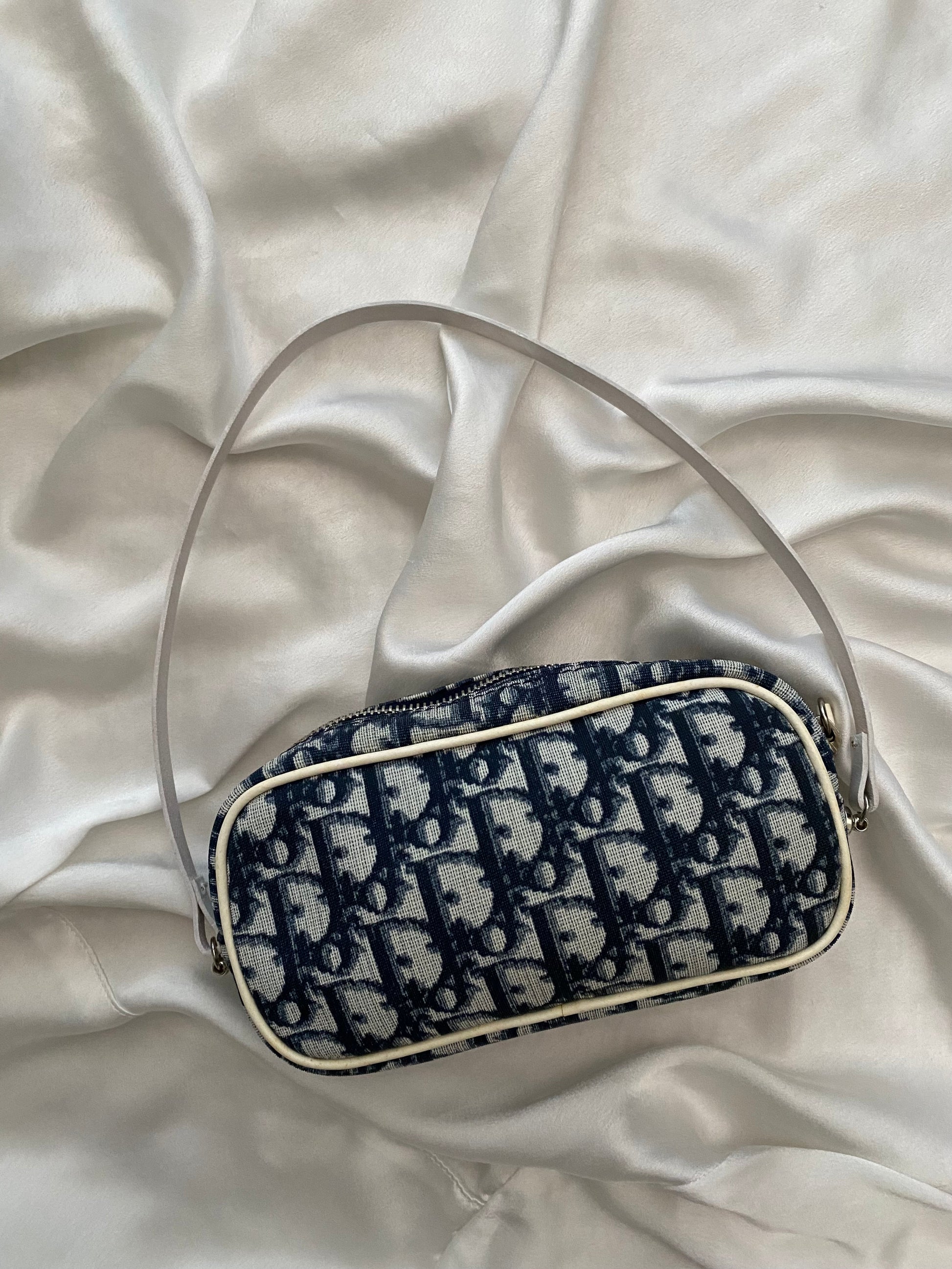 Mini dior trotter Pochette con monogram blu in tela. Pezzo iconico degli anni 2000. È stata aggiunta una tracollina in pelle bianca. Cursore con qualche crepa, per il resto perfetta. Venduta con fondo salvaborsa pesante per mantenere pulito l’interno e la borsa stabile.