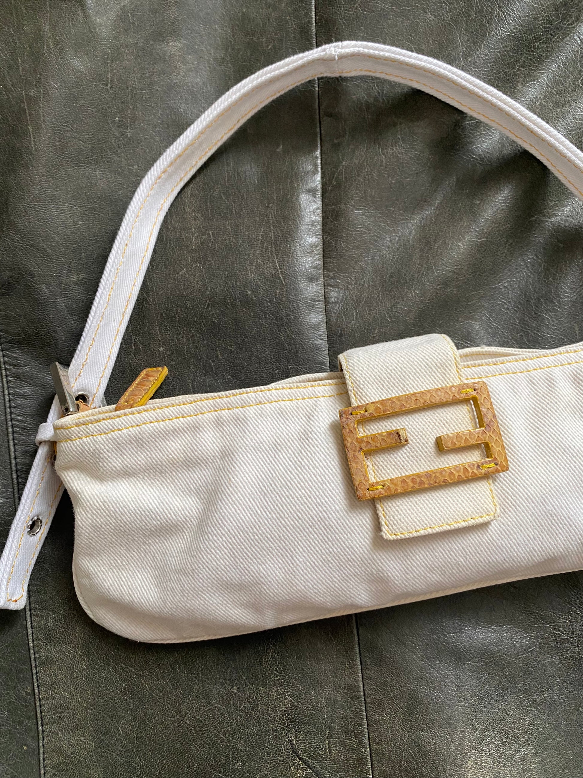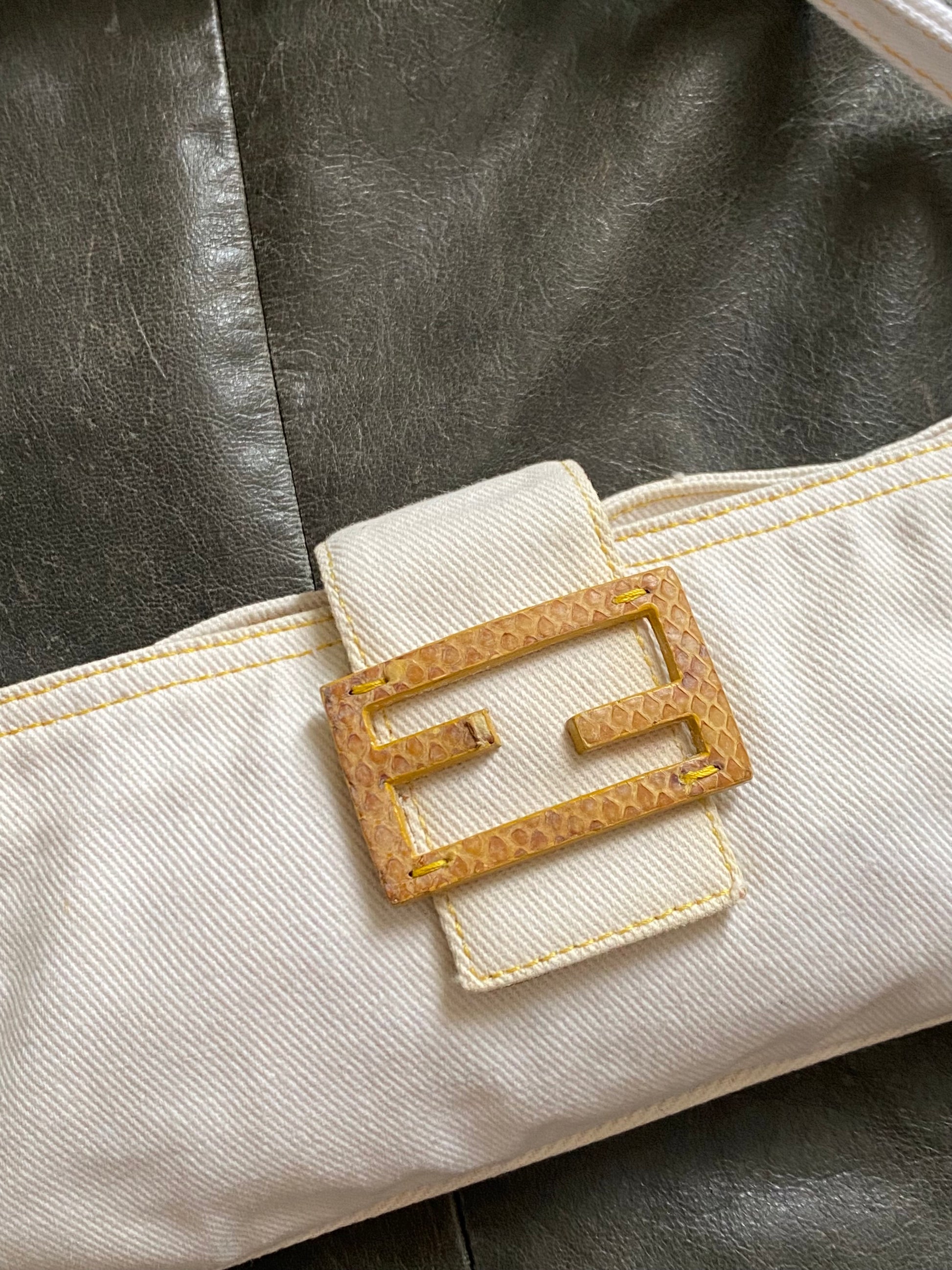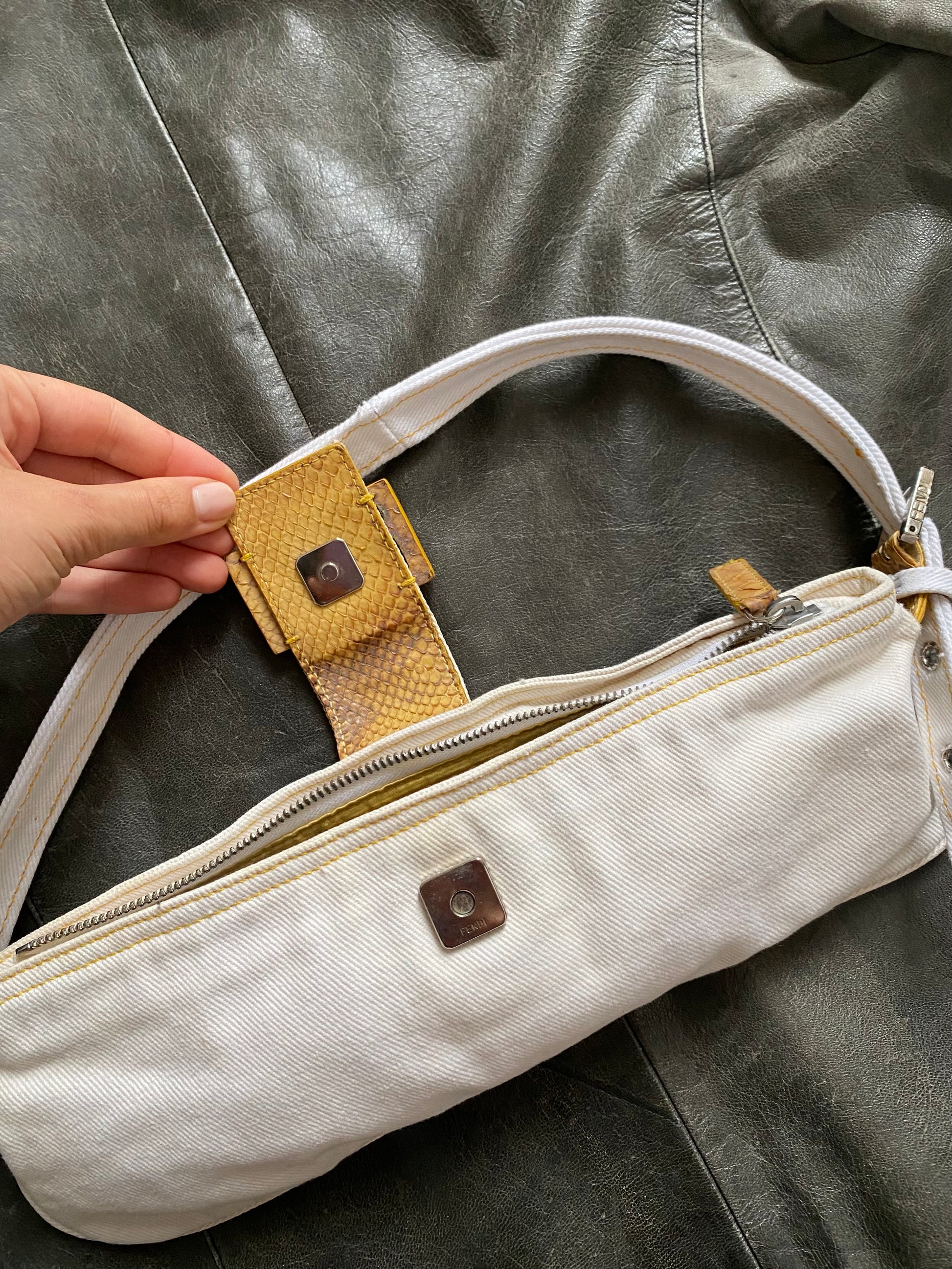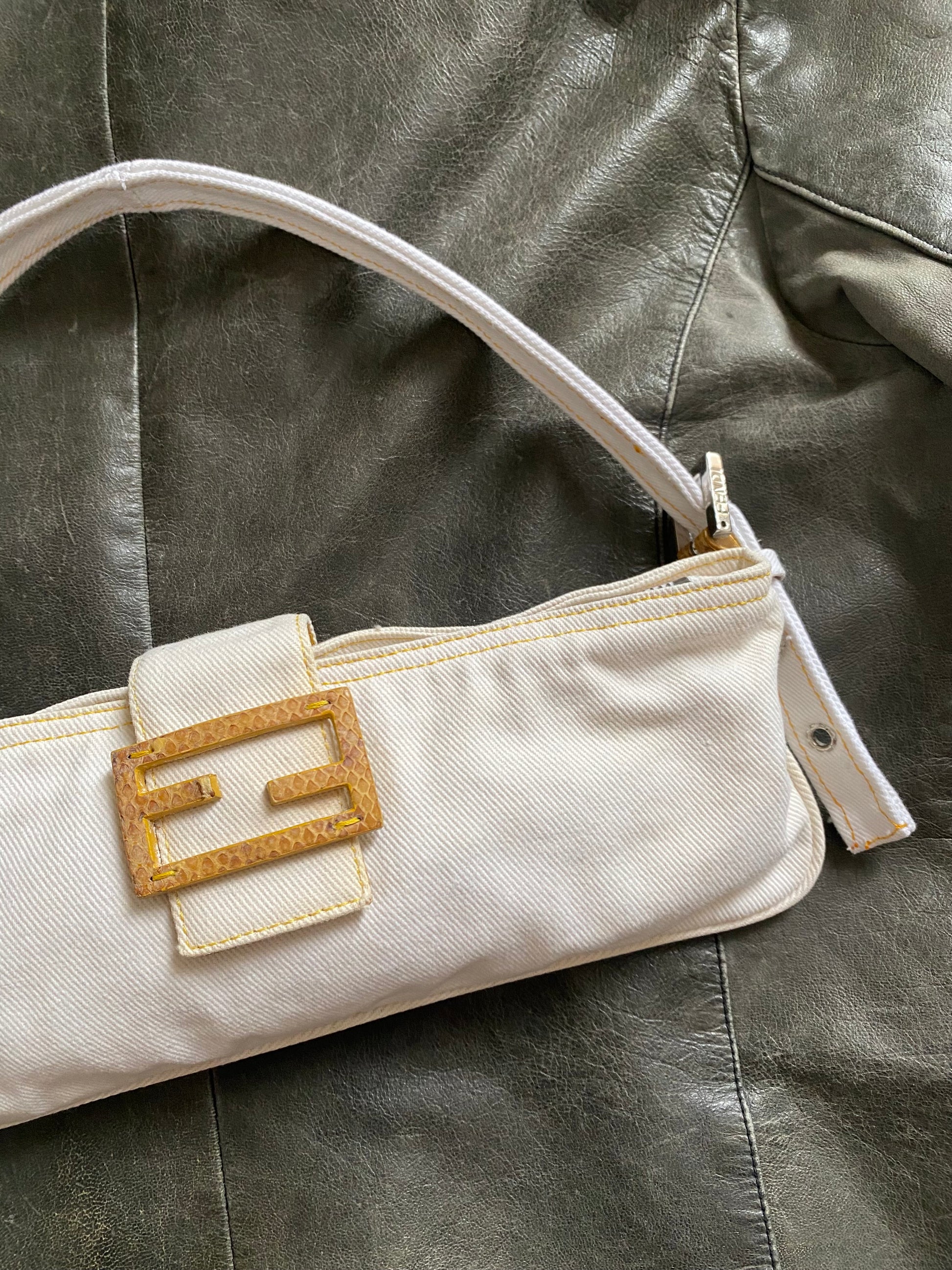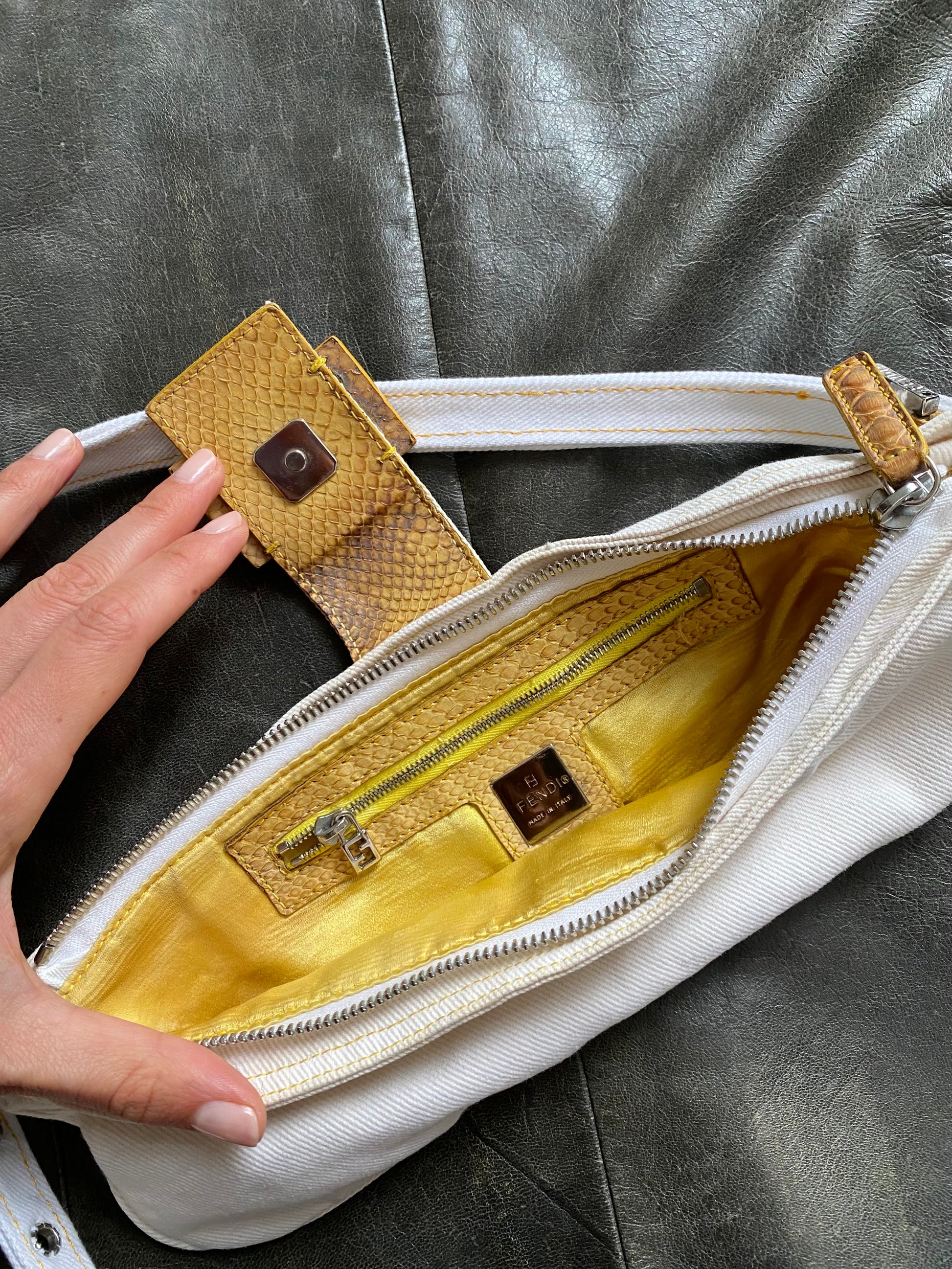 Stupenda baguette di Fendi in denim bianco con dettagli in pelle di pitone texturizzata. Interno perfetto in seta gialla. Leggero alone blu nell’angolino sul retro (foto), usata con qualche lieve segno ma buone condizioni generali.