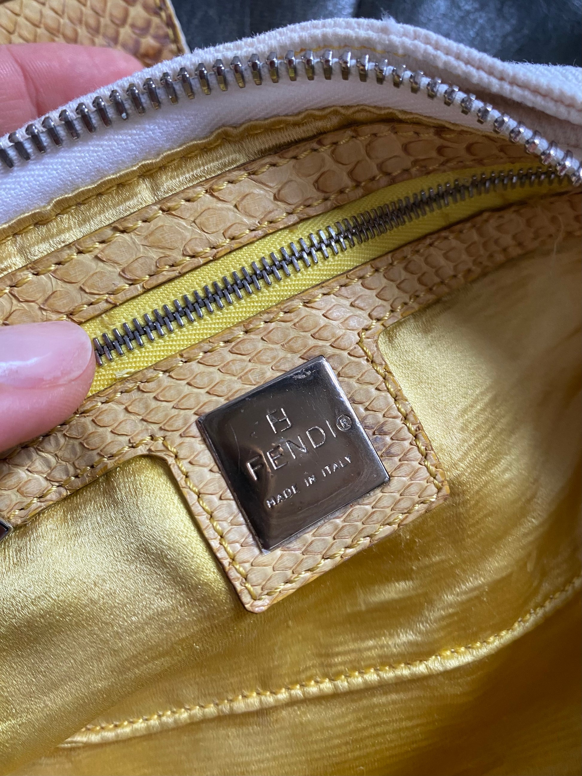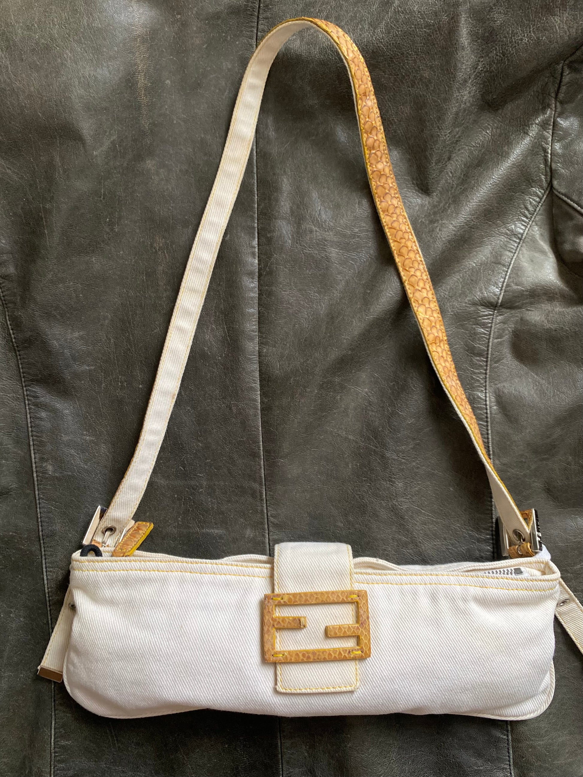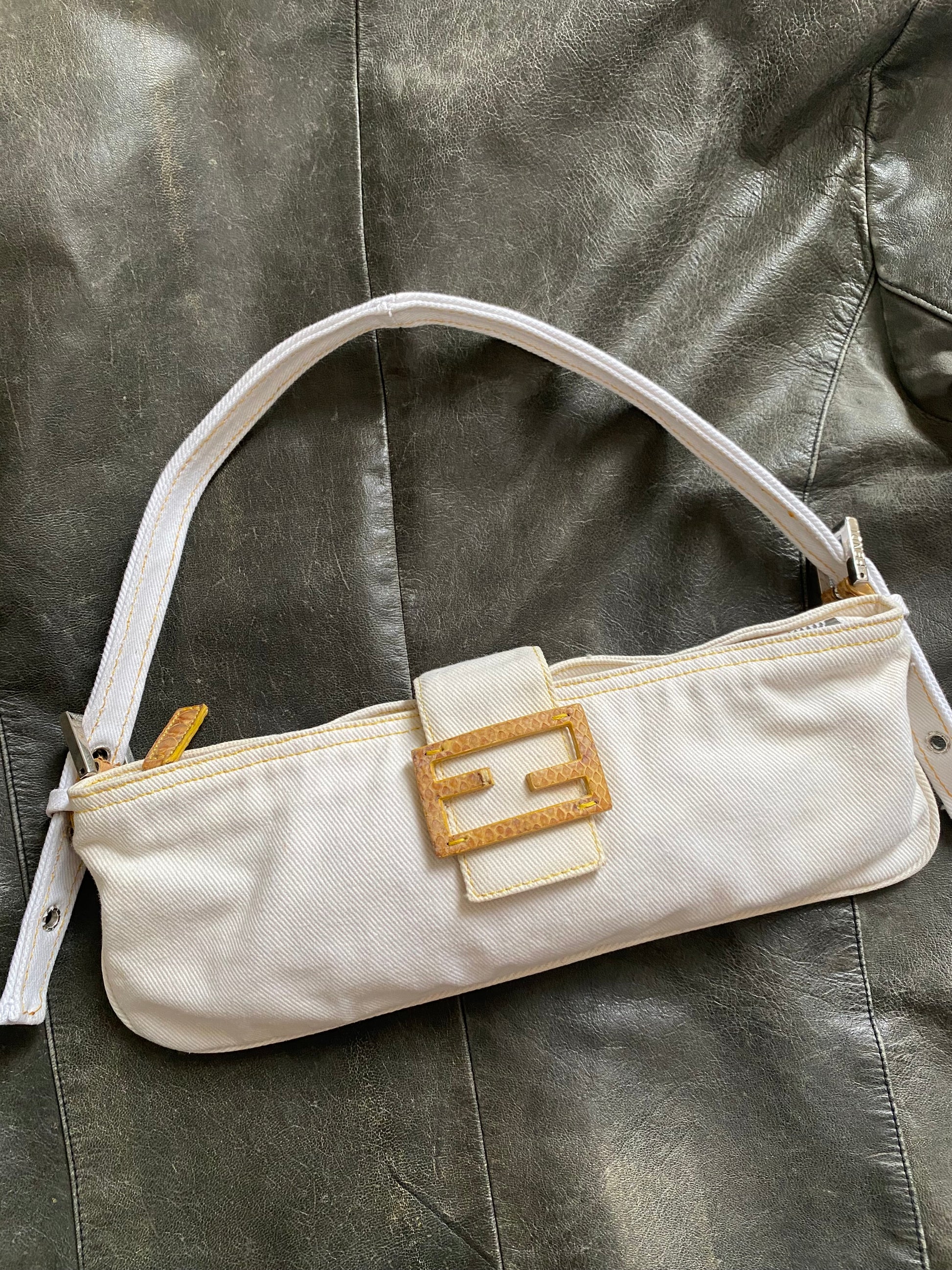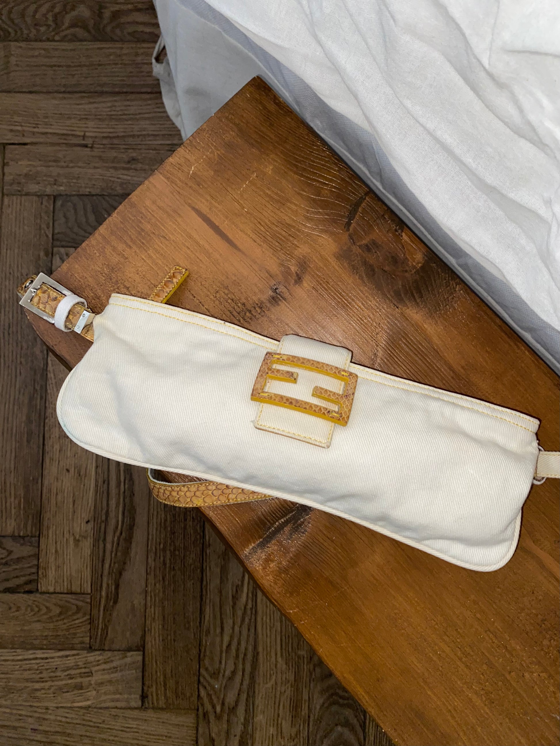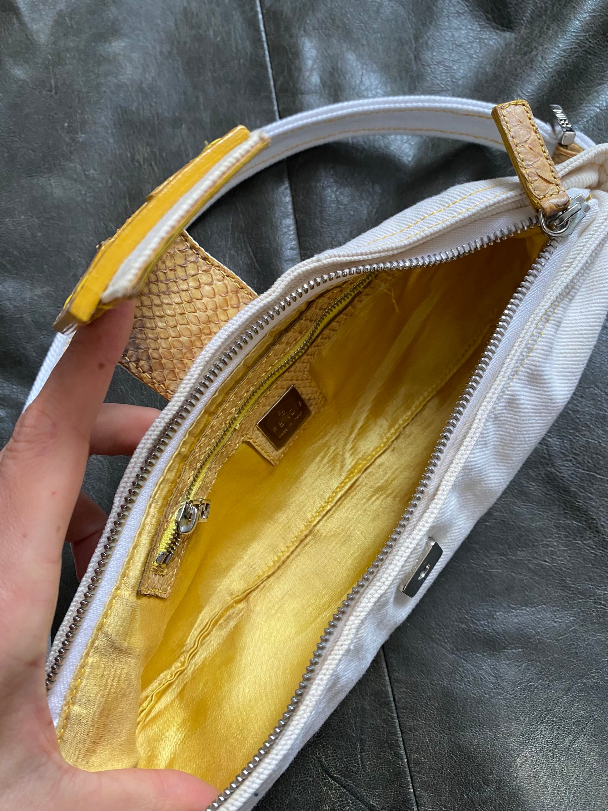 Stupenda baguette di Fendi in denim bianco con dettagli in pelle di pitone texturizzata. Interno perfetto in seta gialla. Leggero alone blu nell’angolino sul retro (foto), usata con qualche lieve segno ma buone condizioni generali.