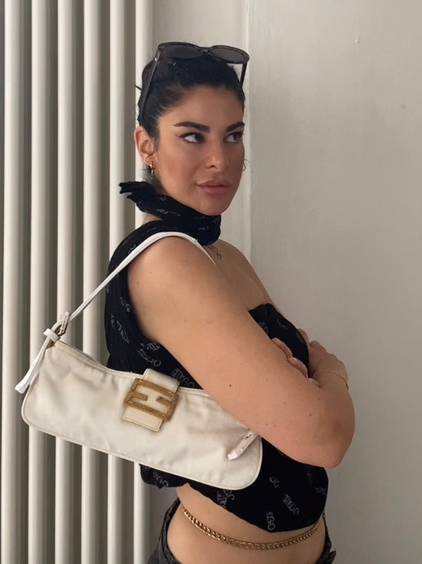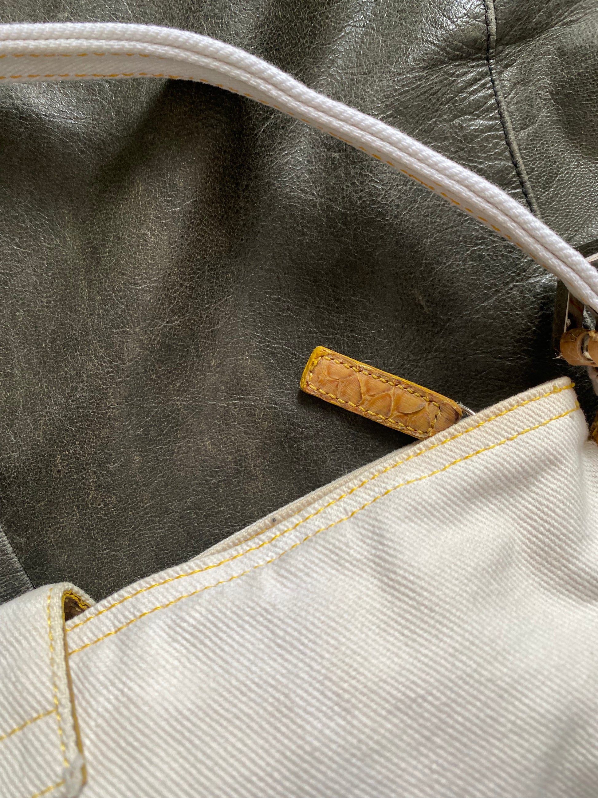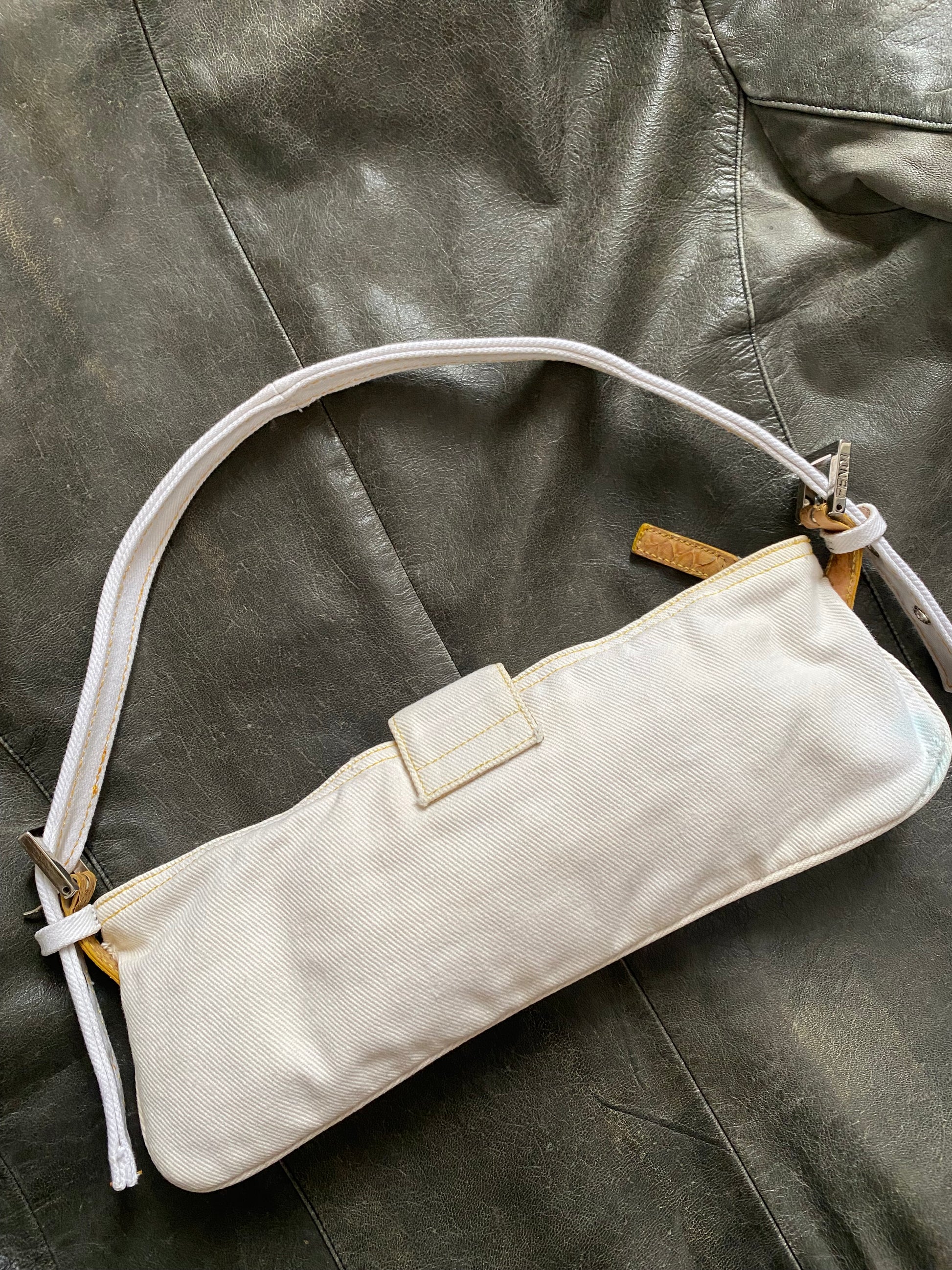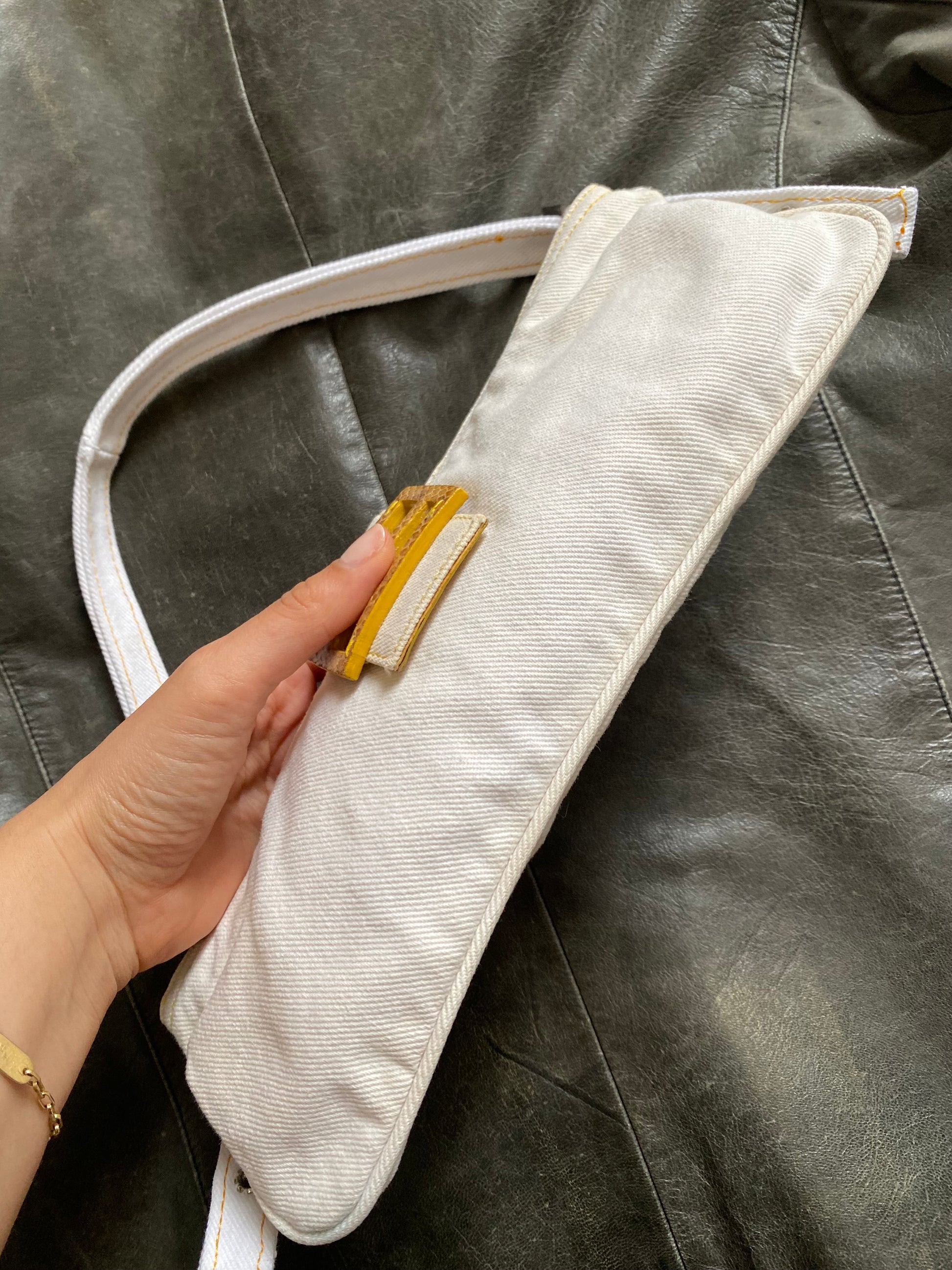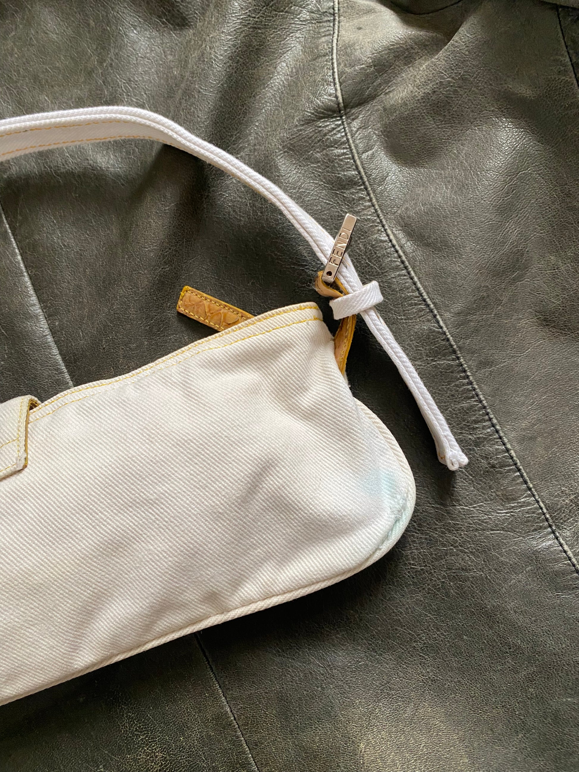 Stupenda baguette di Fendi in denim bianco con dettagli in pelle di pitone texturizzata. Interno perfetto in seta gialla. Leggero alone blu nell’angolino sul retro (foto), usata con qualche lieve segno ma buone condizioni generali.