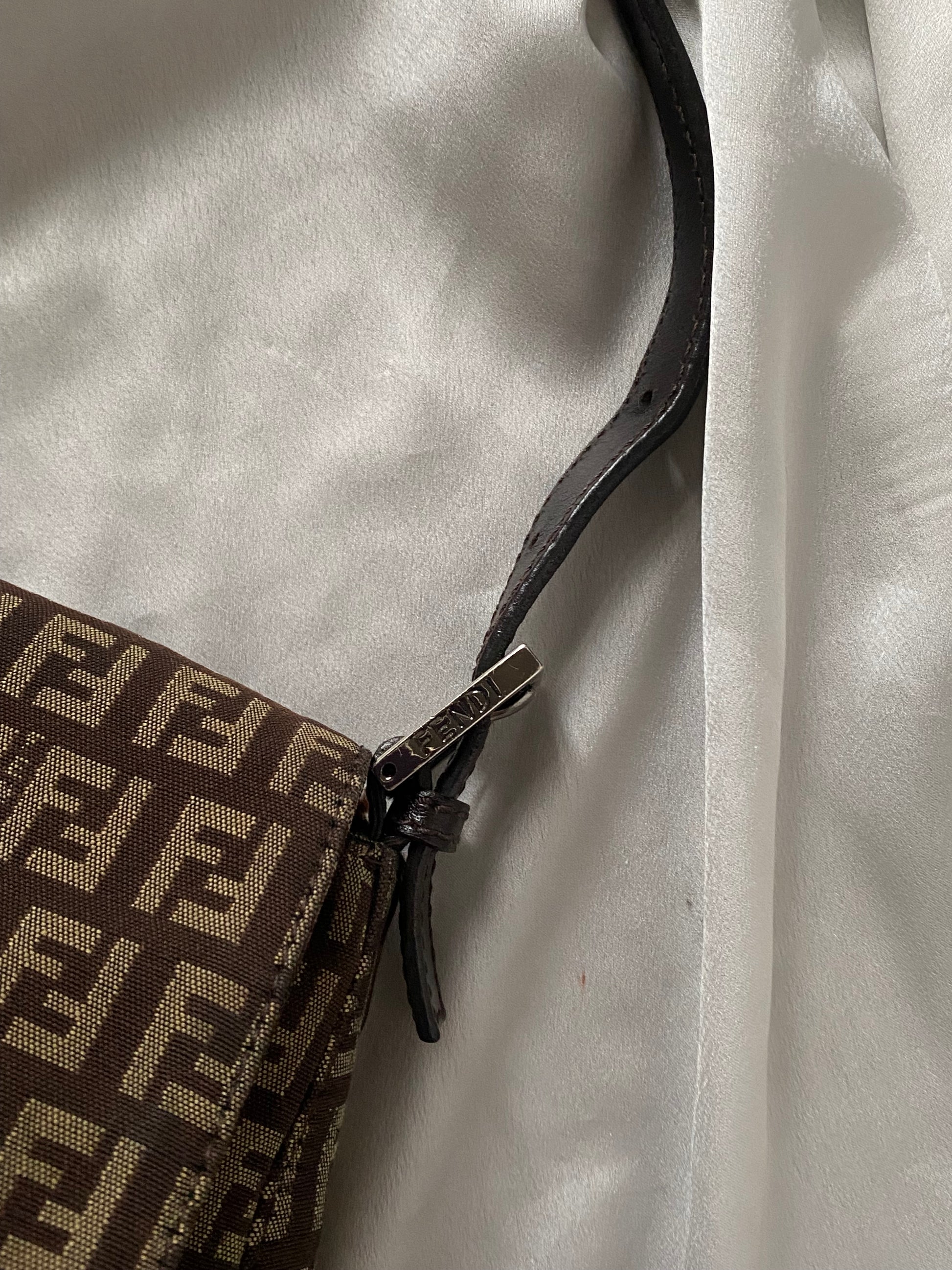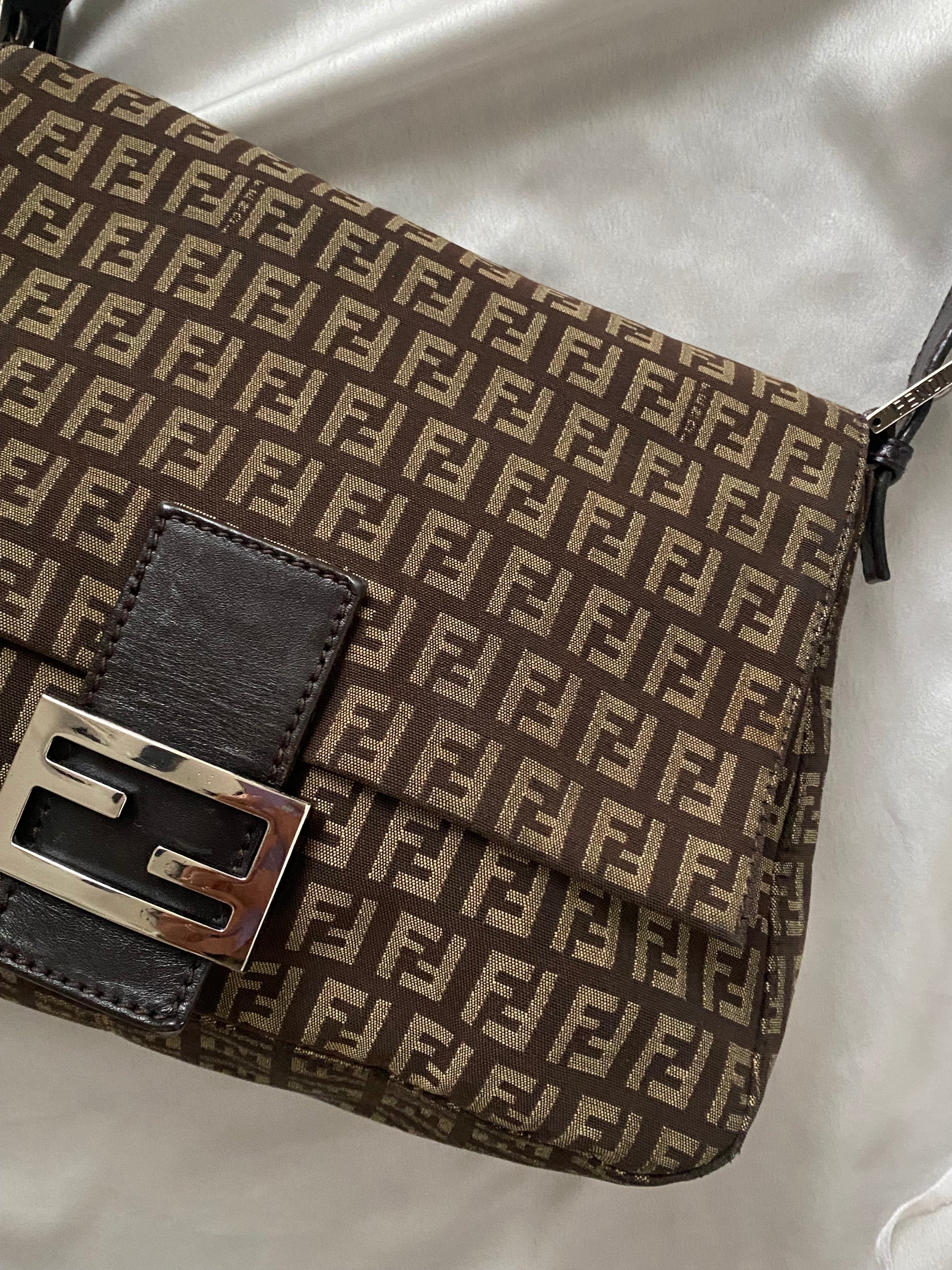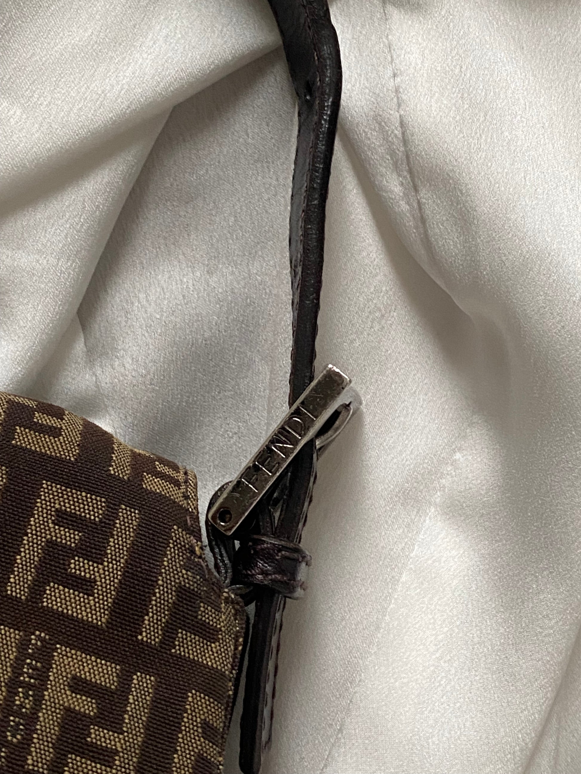 Stupenda Fendi mamma baguette in monogram zucchino marrone e beige. Qualche segno sull’hardware, che è stato lucidato con cura, ma buonissime condizioni generali.