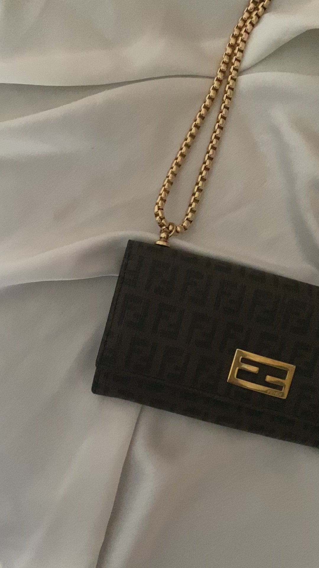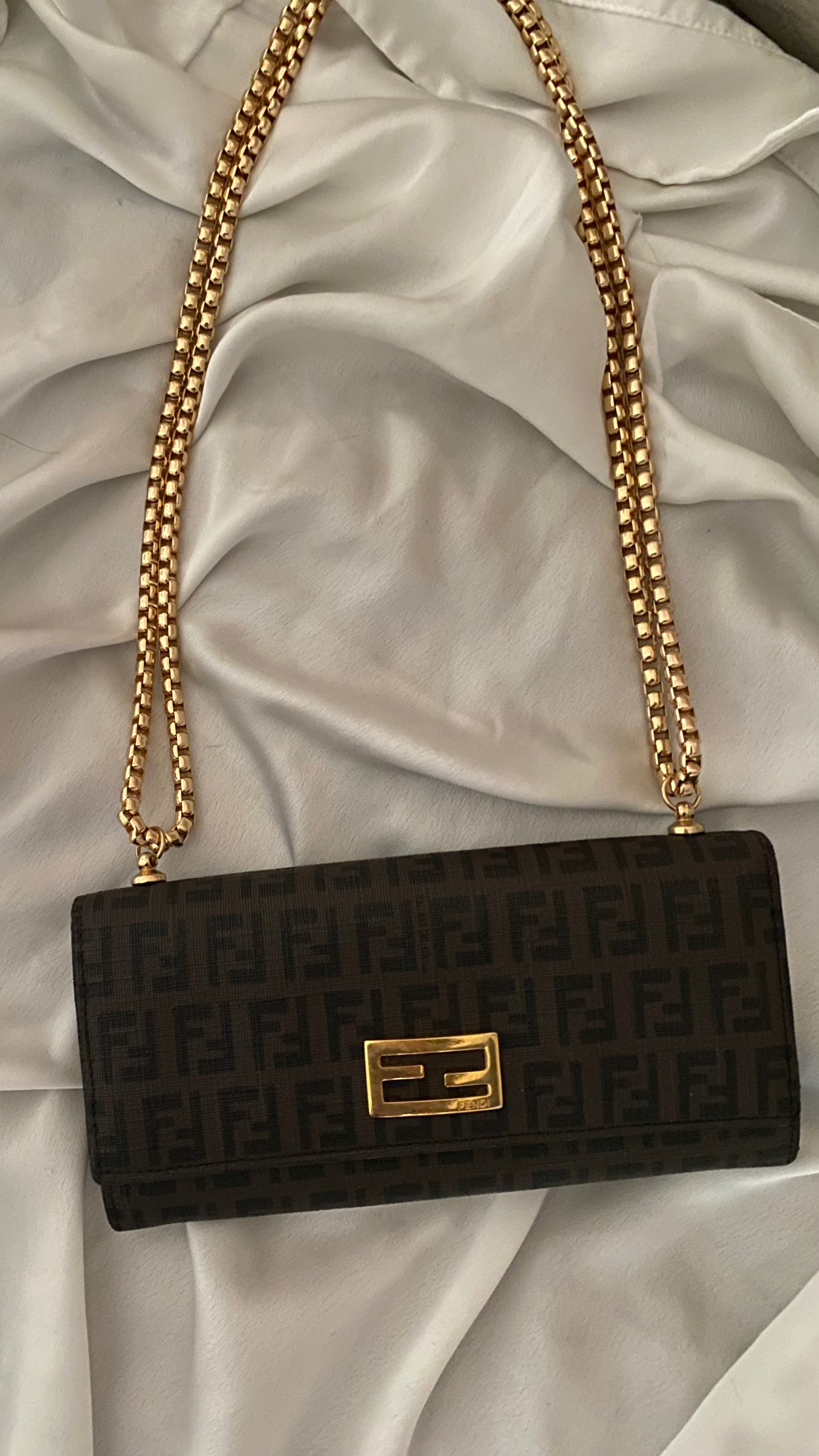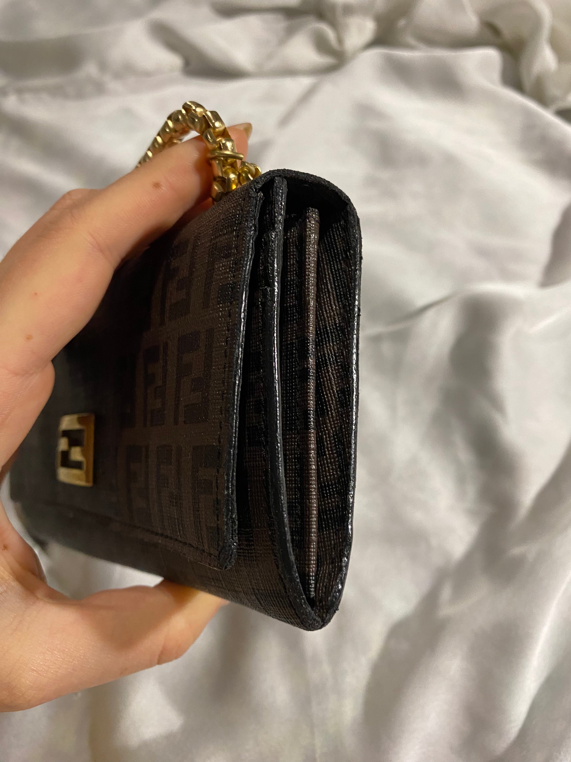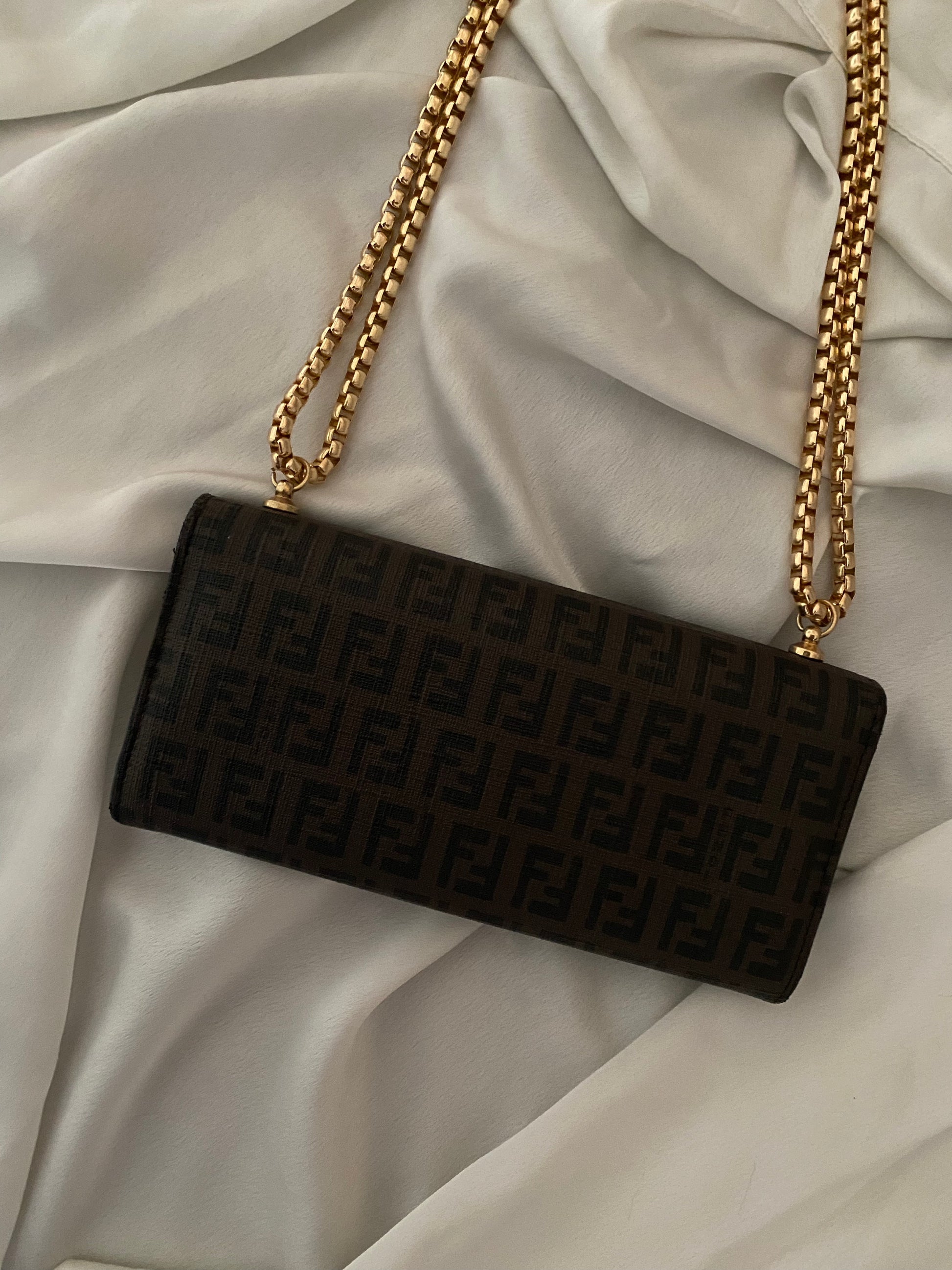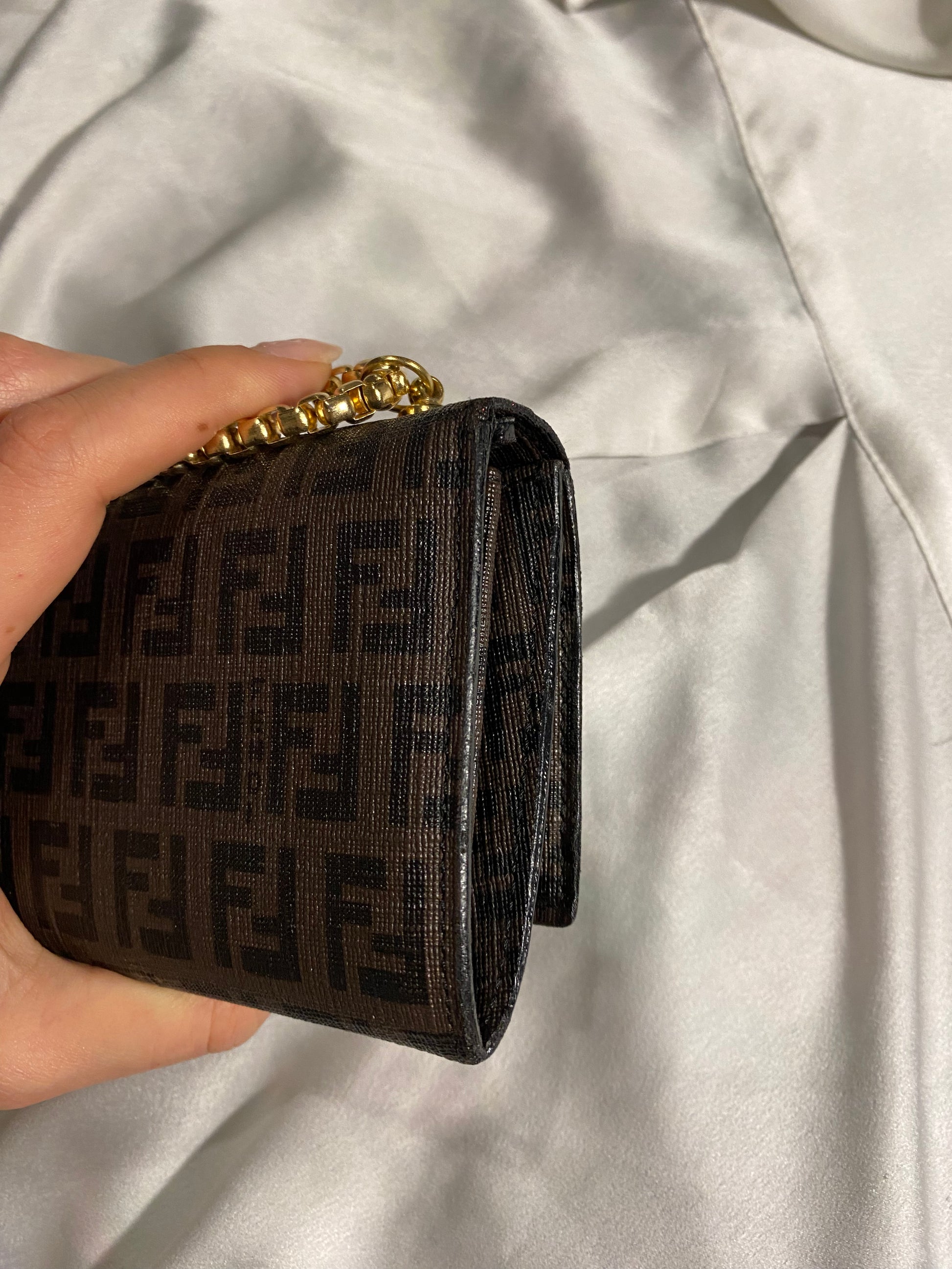Bellissima pochette Fendi brown con classico pattern. Hardware placcato in oro 24 carati. Bordi completamente restaurati. Bottone leggermente morbido. Buonissime condizioni generali. Possibile portarla a spalla e tracolla. Entra un cellulare, carte contanti. Misure: 18x9x3cm