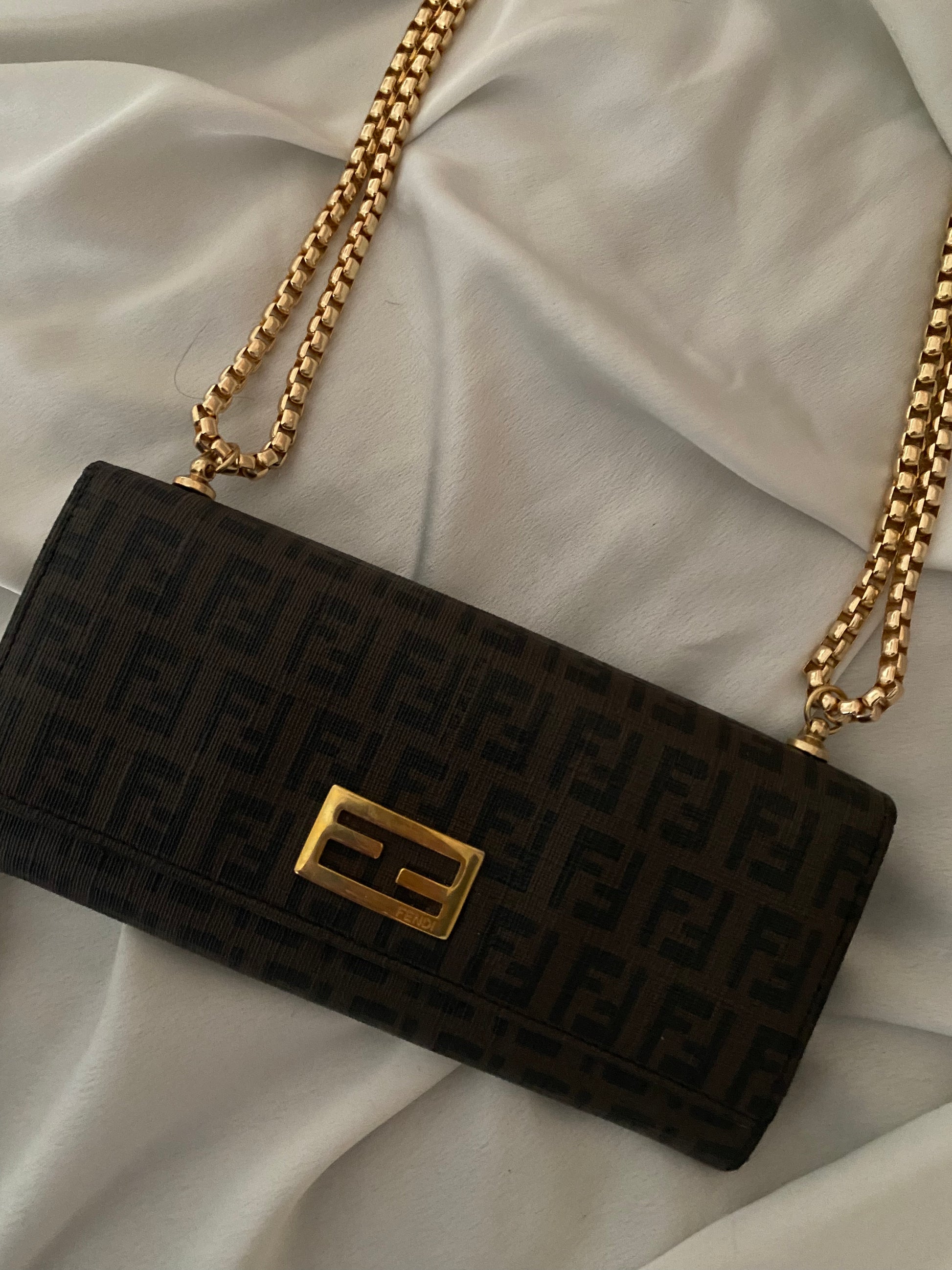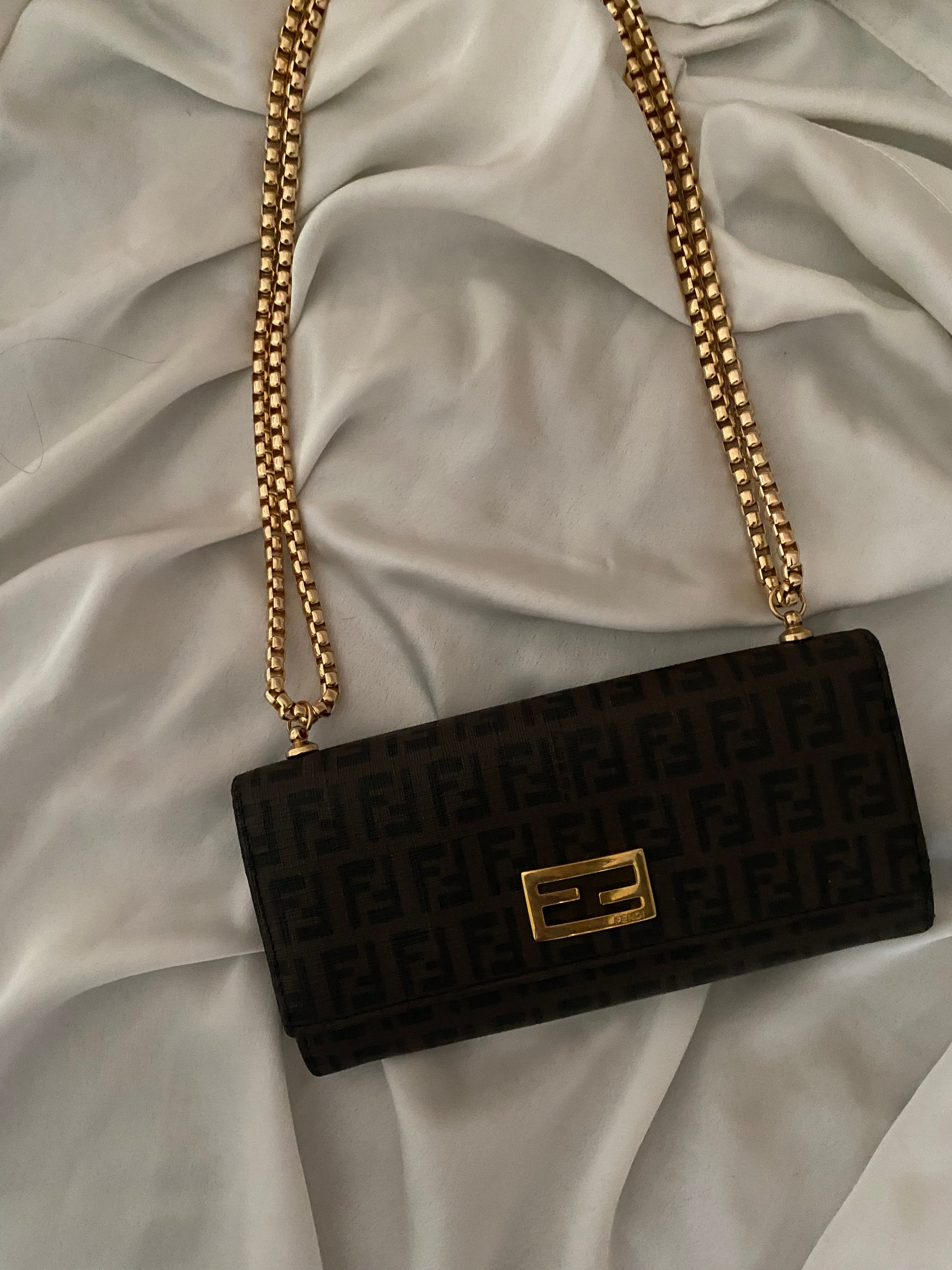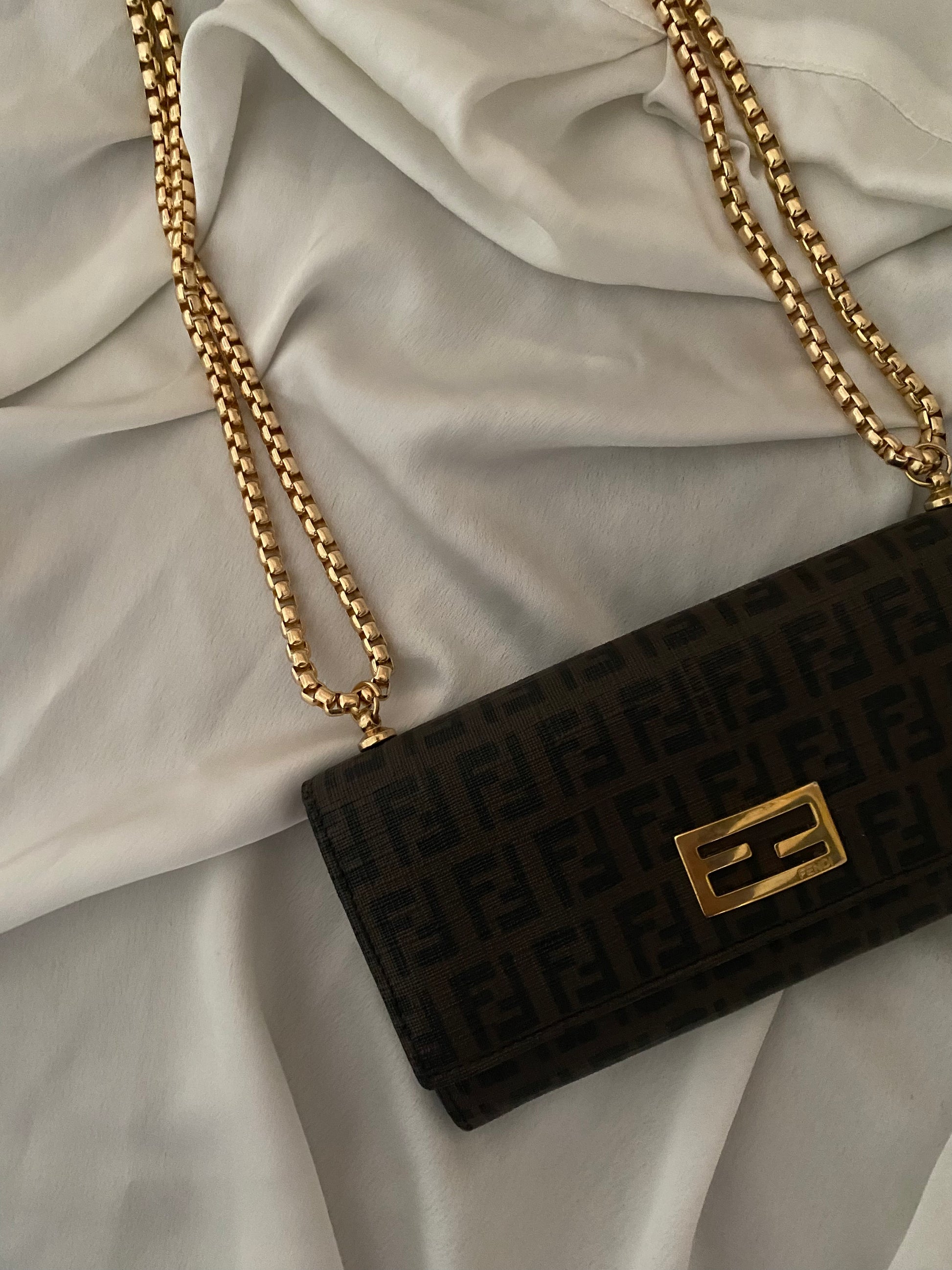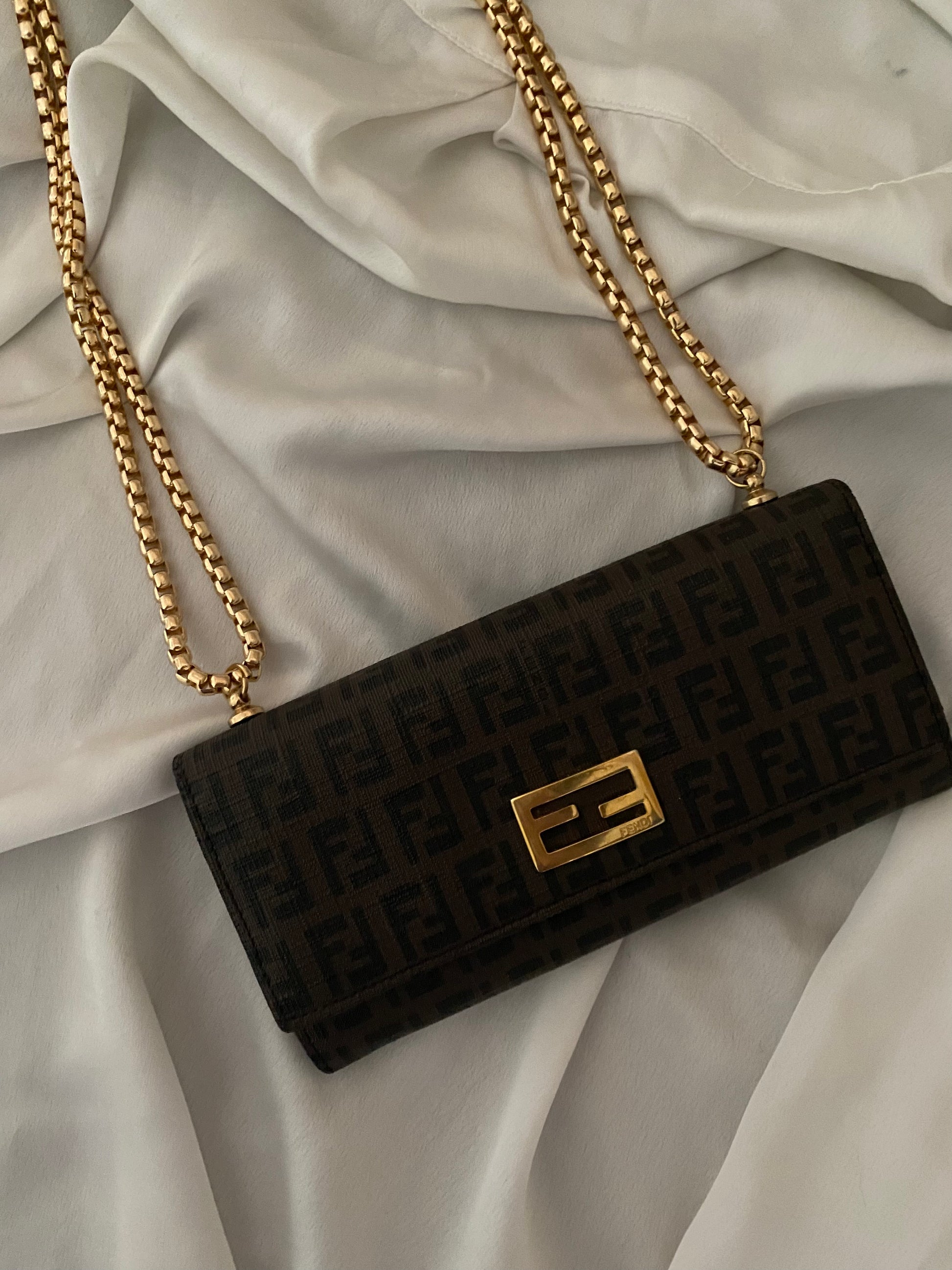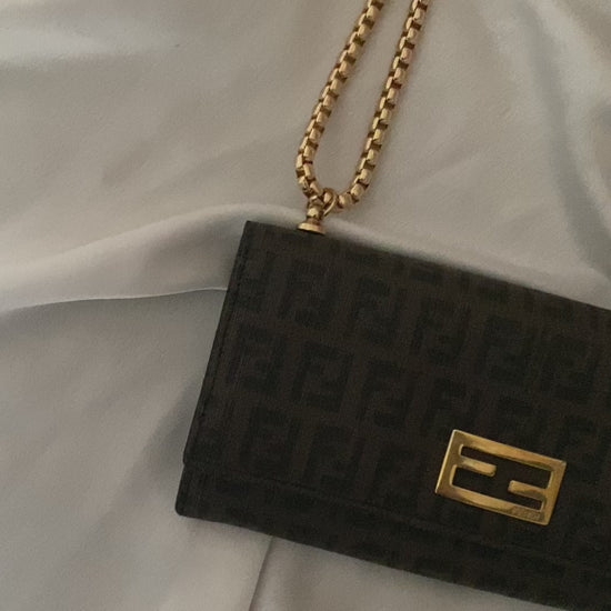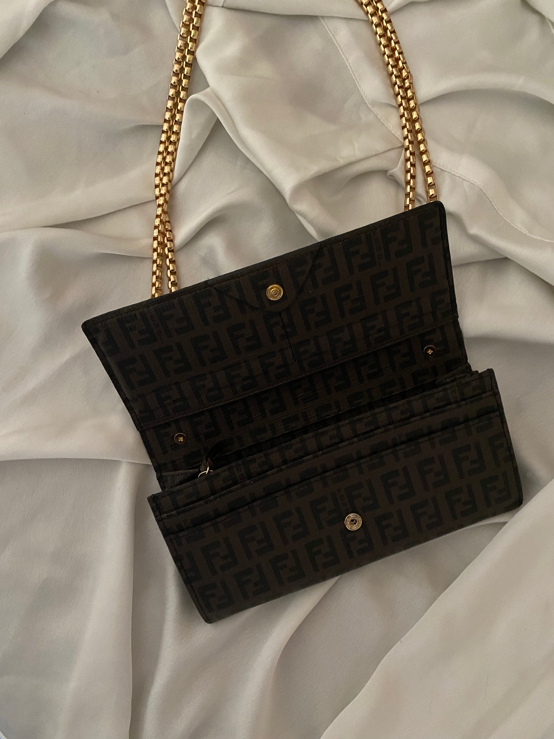 Bellissima pochette Fendi brown con classico pattern. Hardware placcato in oro 24 carati. Bordi completamente restaurati. Bottone leggermente morbido. Buonissime condizioni generali. Possibile portarla a spalla e tracolla. Entra un cellulare, carte contanti. Misure: 18x9x3cm