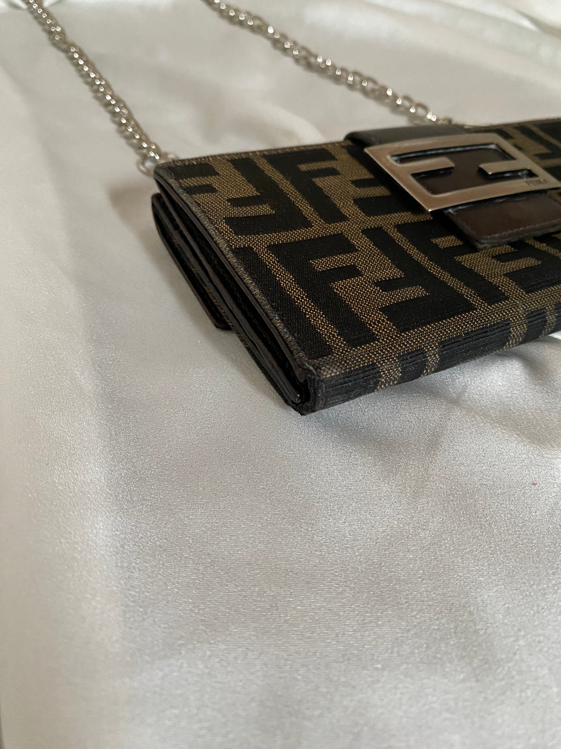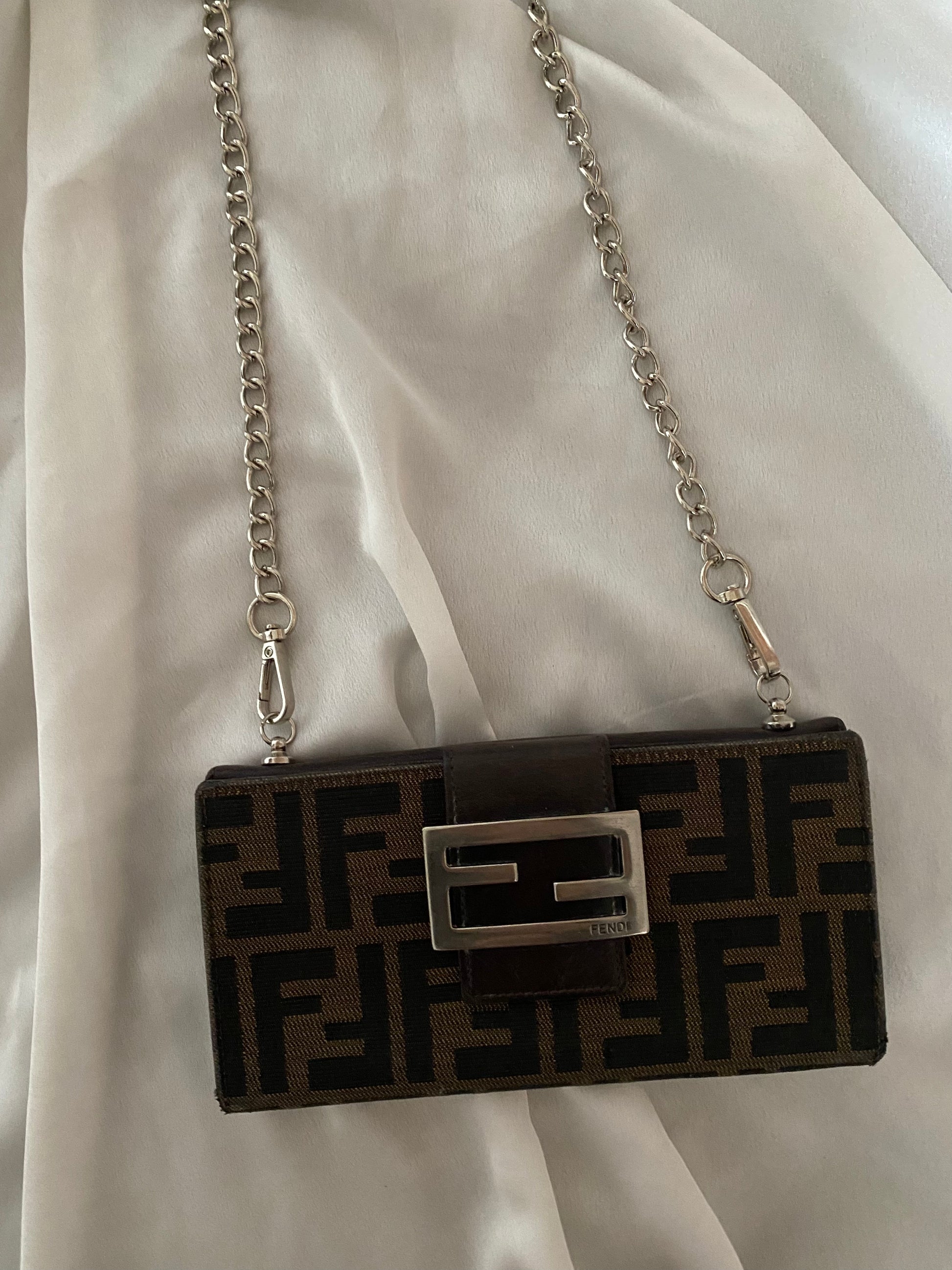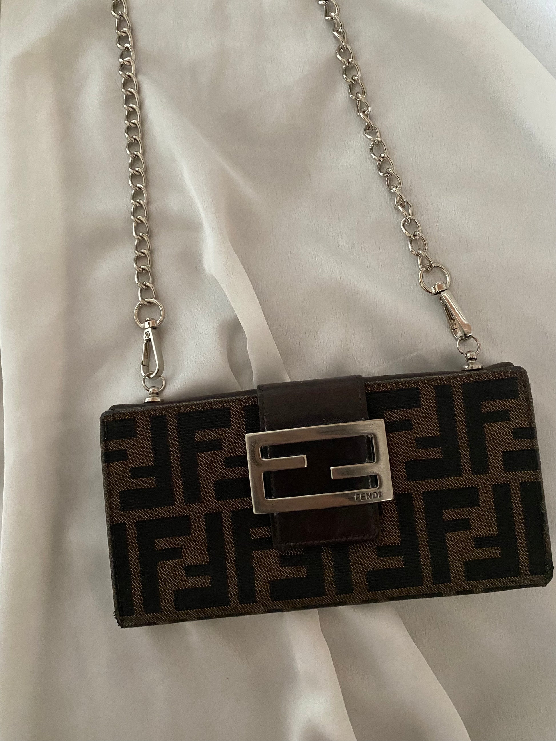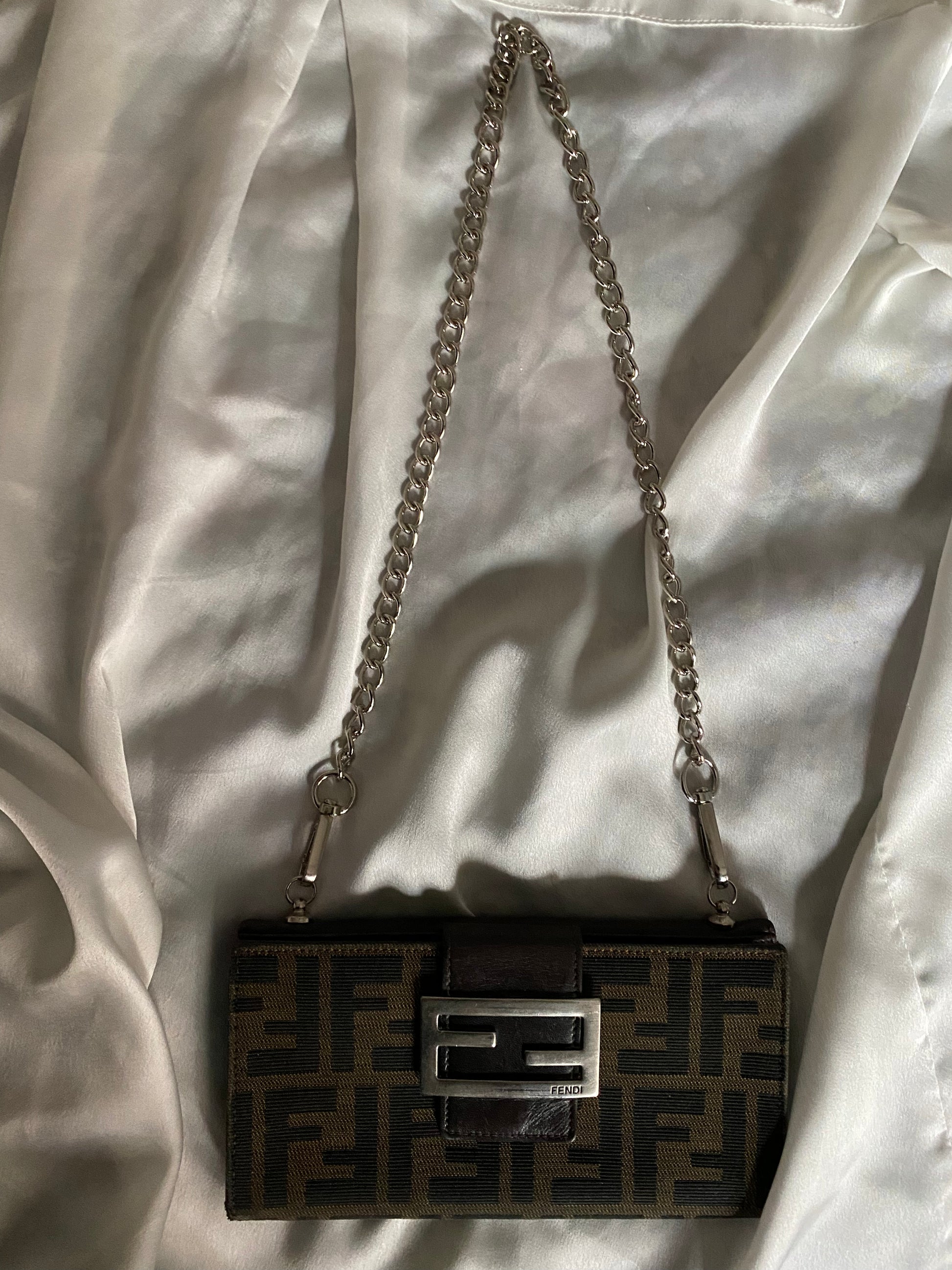 splendida pochette Fendi zucca con hardware argento. Motivo iconico in jacquard. Bordi restaurati, buonissime condizioni generali. Si può portare a spalla e a tracolla grazie al sistema di catene.