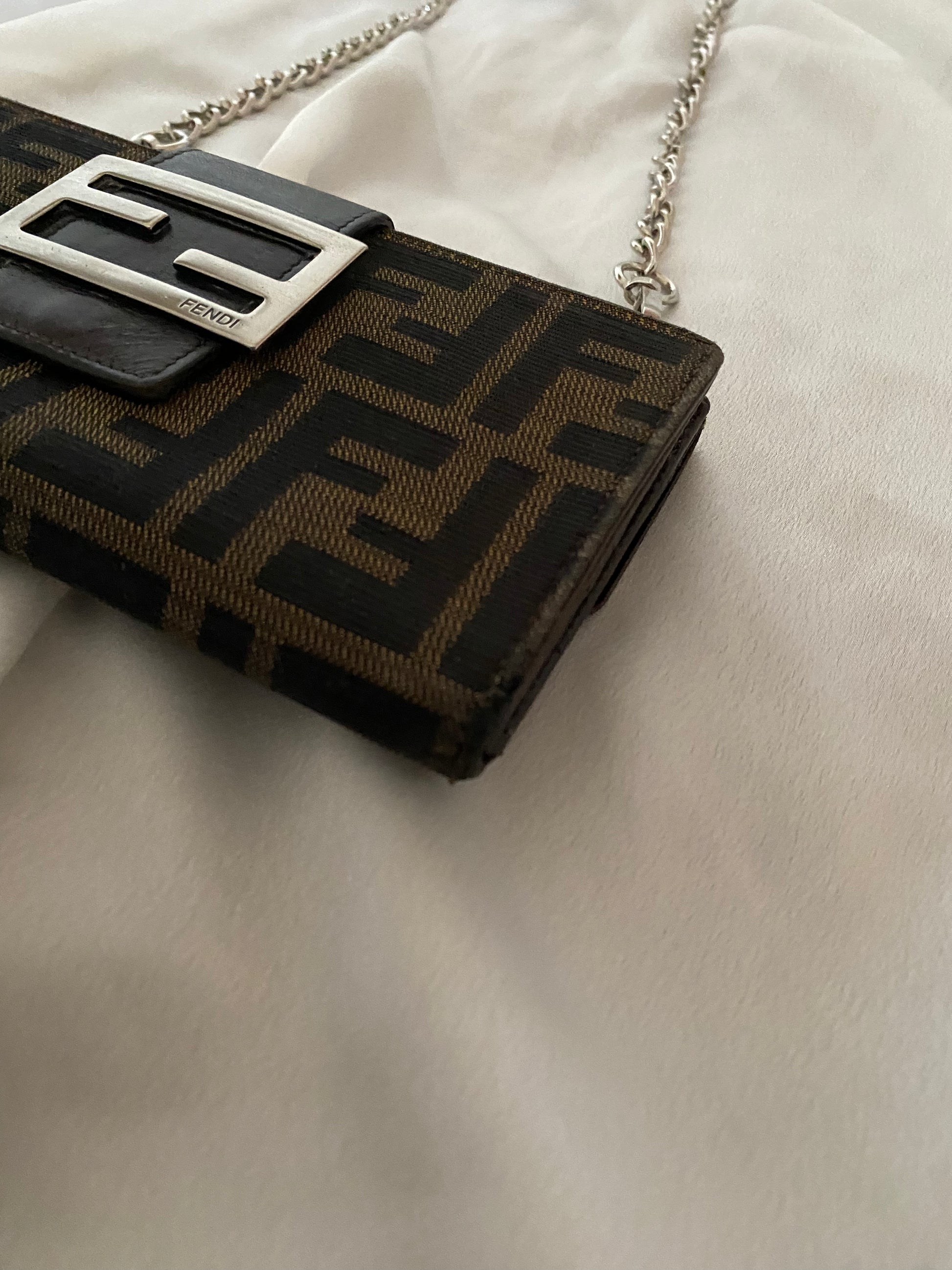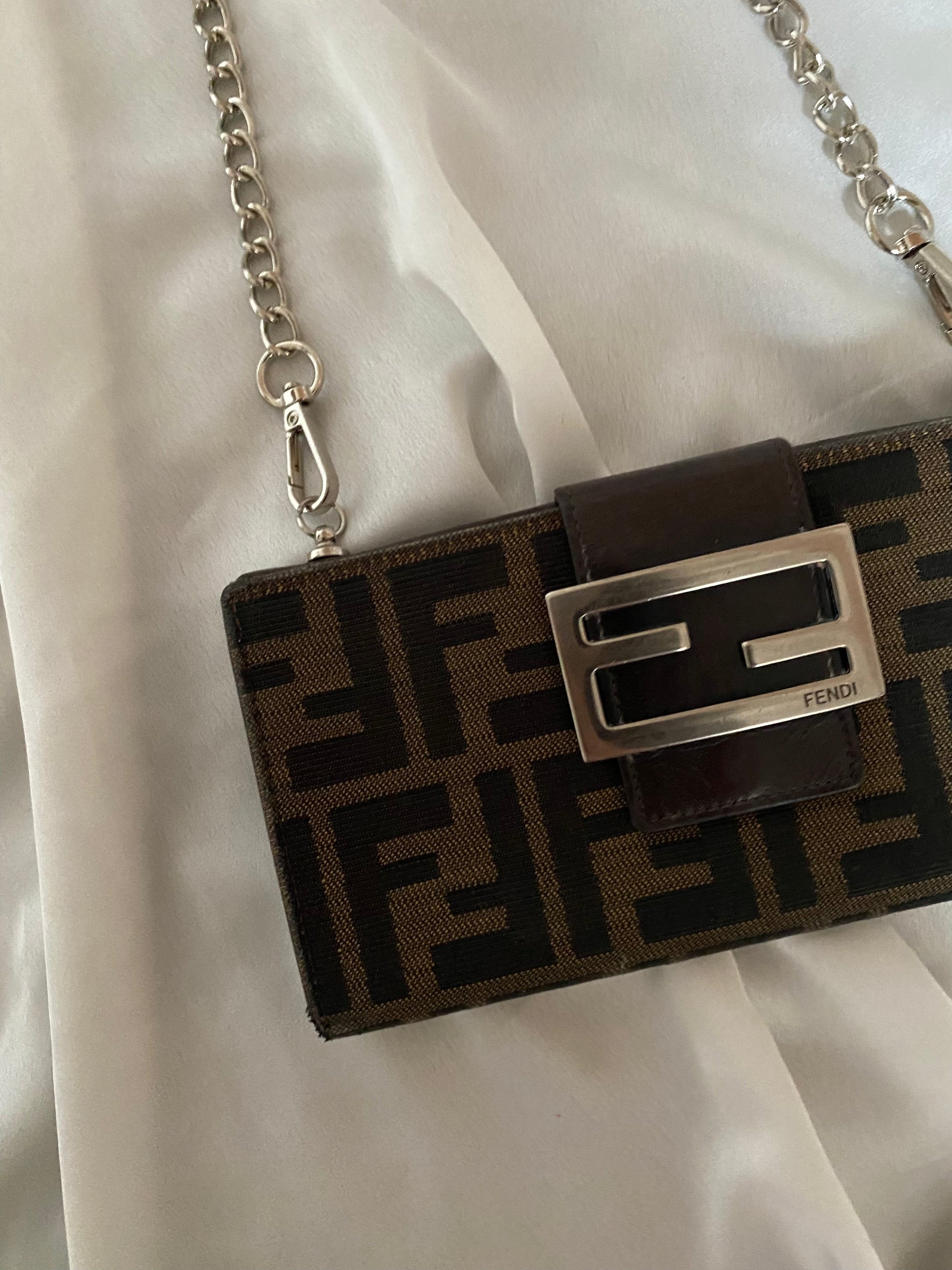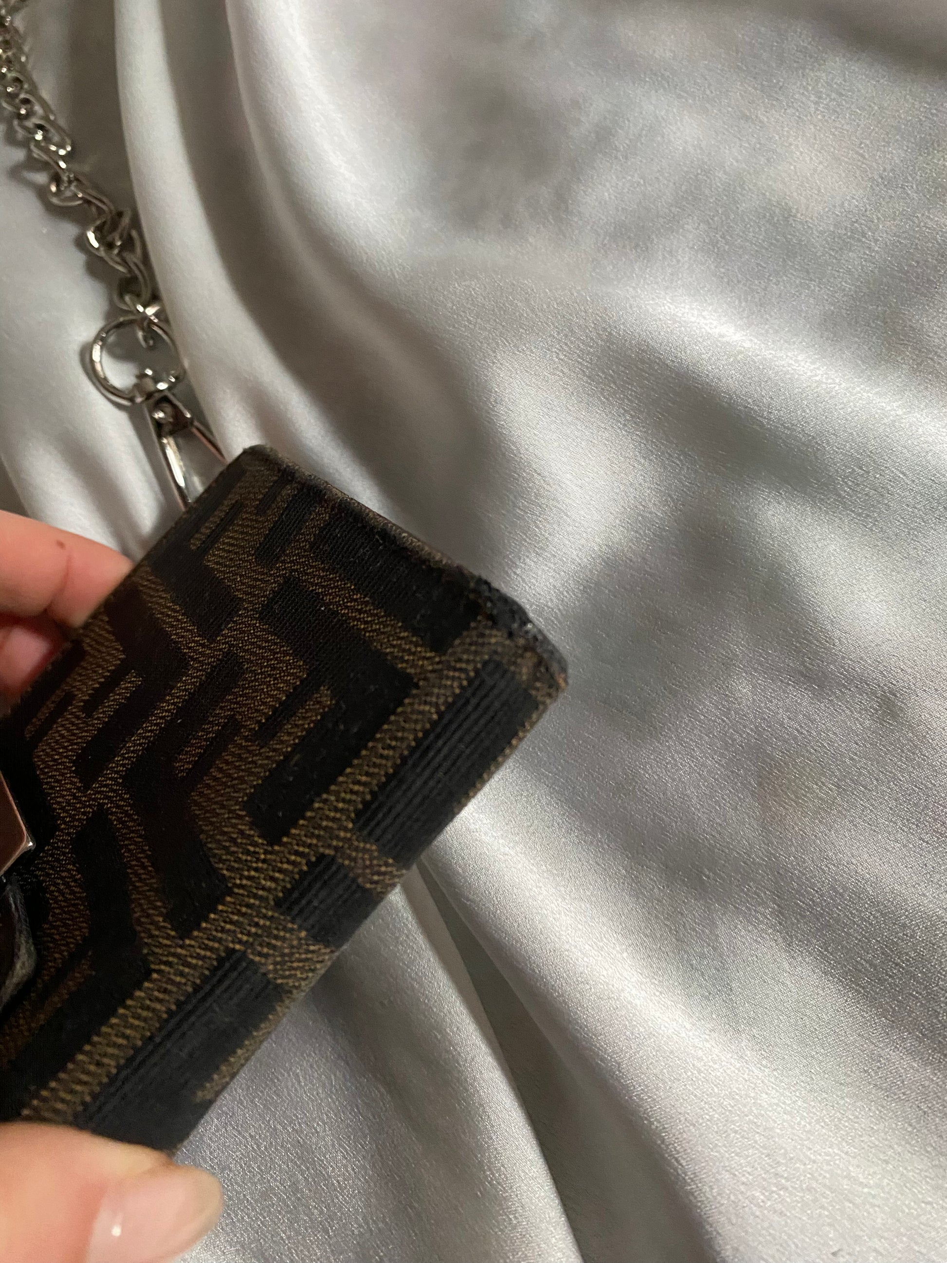 splendida pochette Fendi zucca con hardware argento. Motivo iconico in jacquard. Bordi restaurati, buonissime condizioni generali. Si può portare a spalla e a tracolla grazie al sistema di catene.