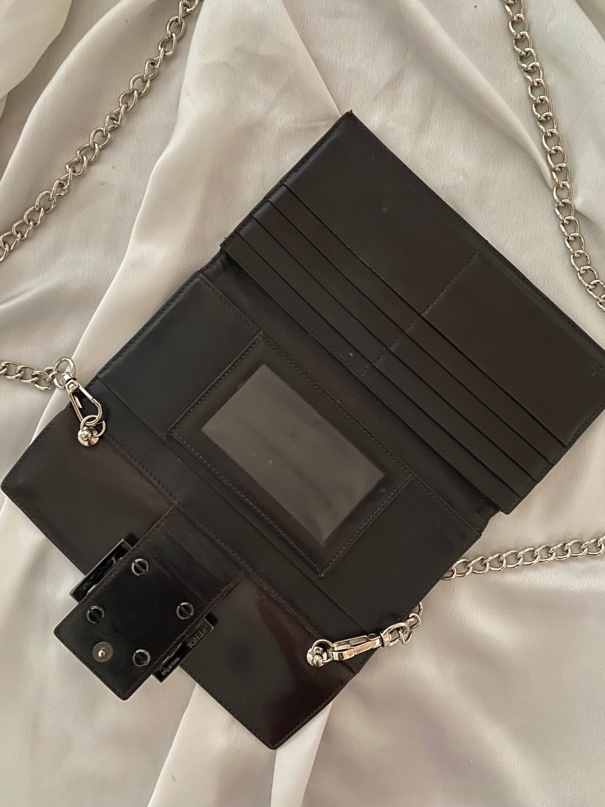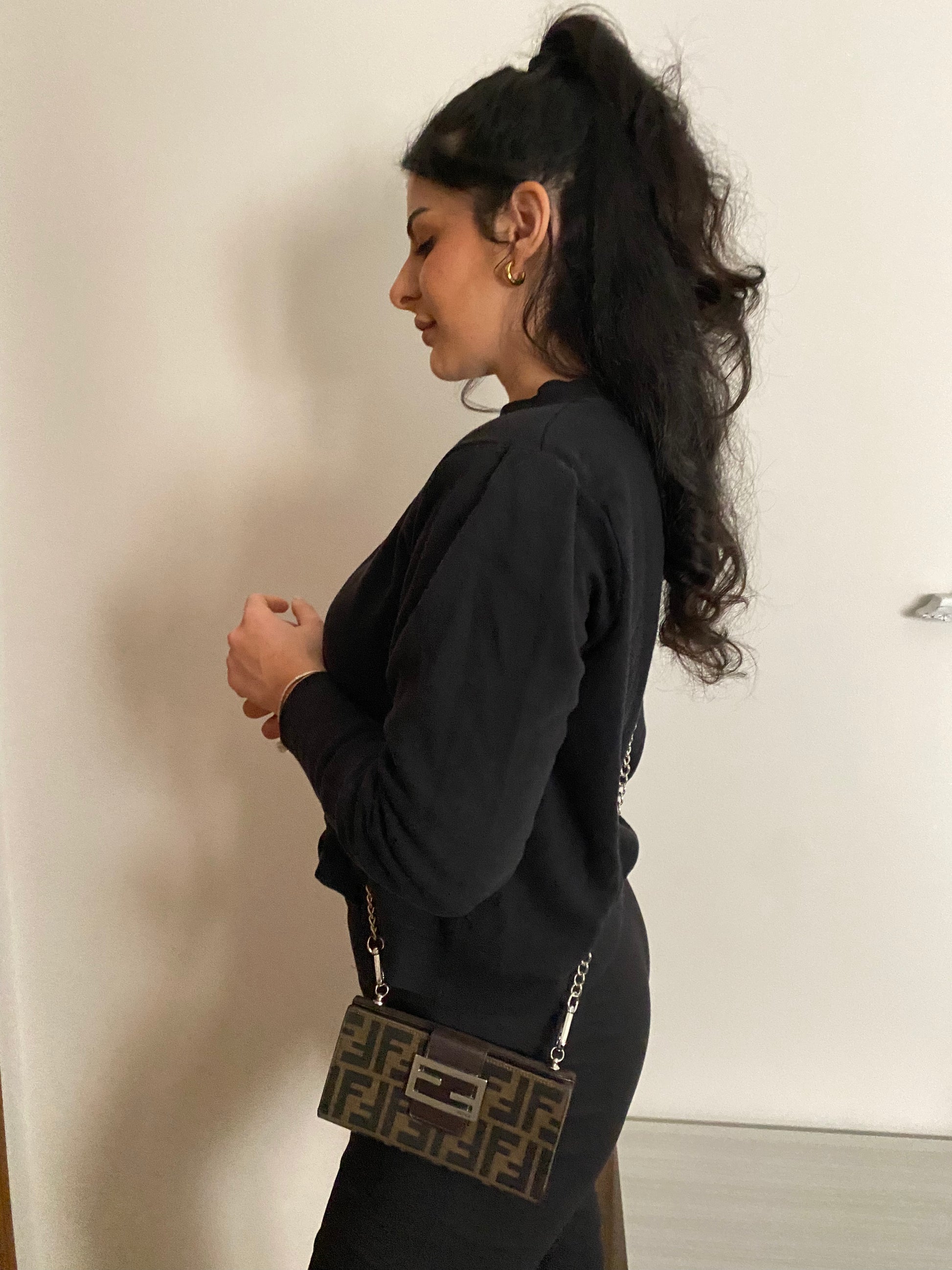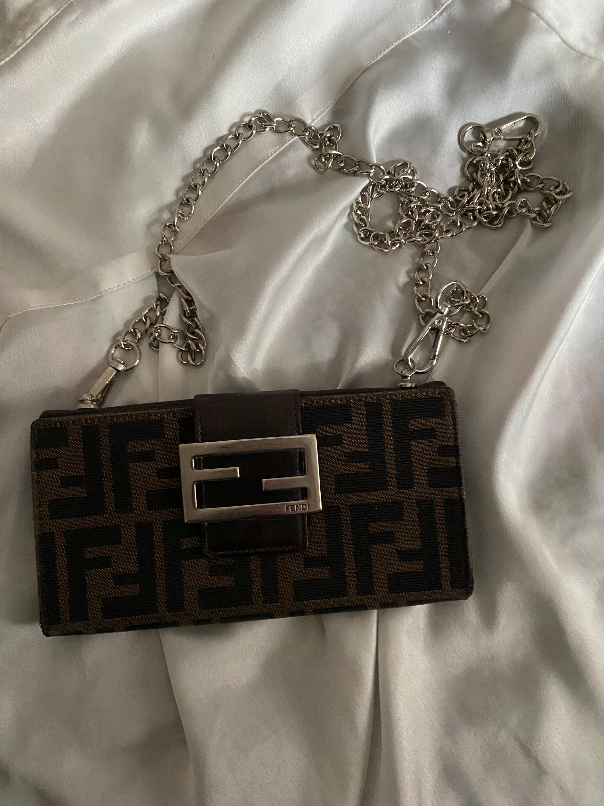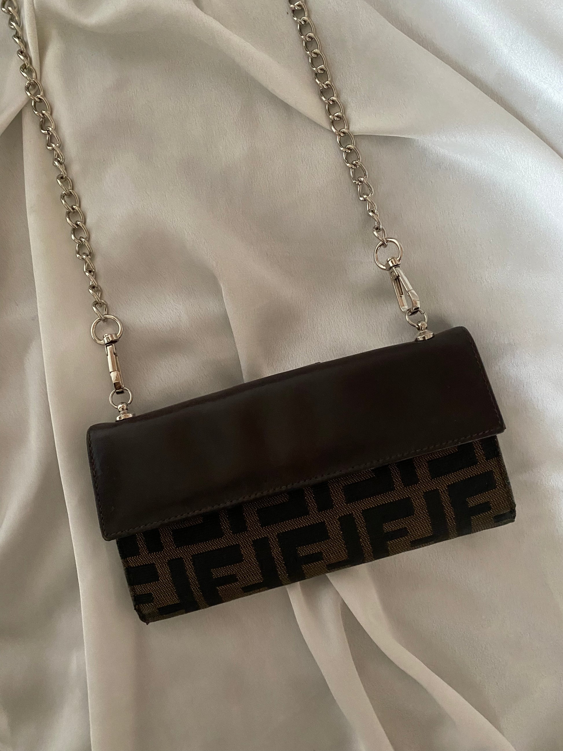 splendida pochette Fendi zucca con hardware argento. Motivo iconico in jacquard. Bordi restaurati, buonissime condizioni generali. Si può portare a spalla e a tracolla grazie al sistema di catene.