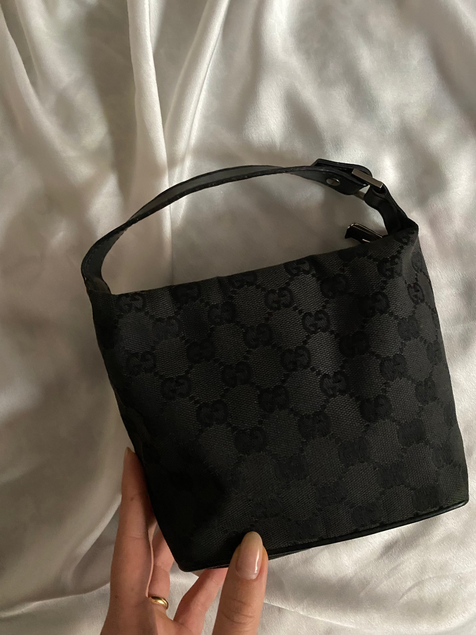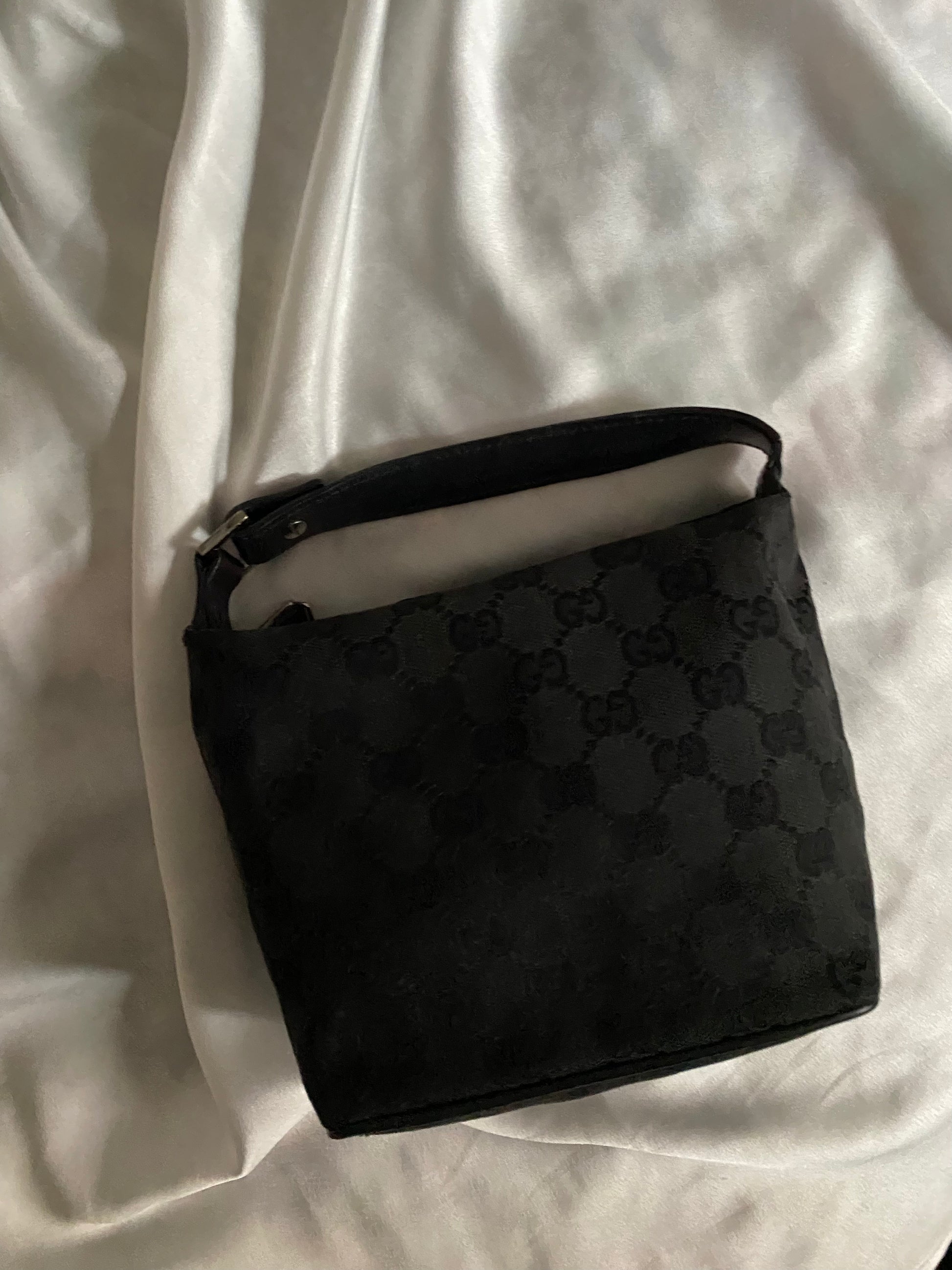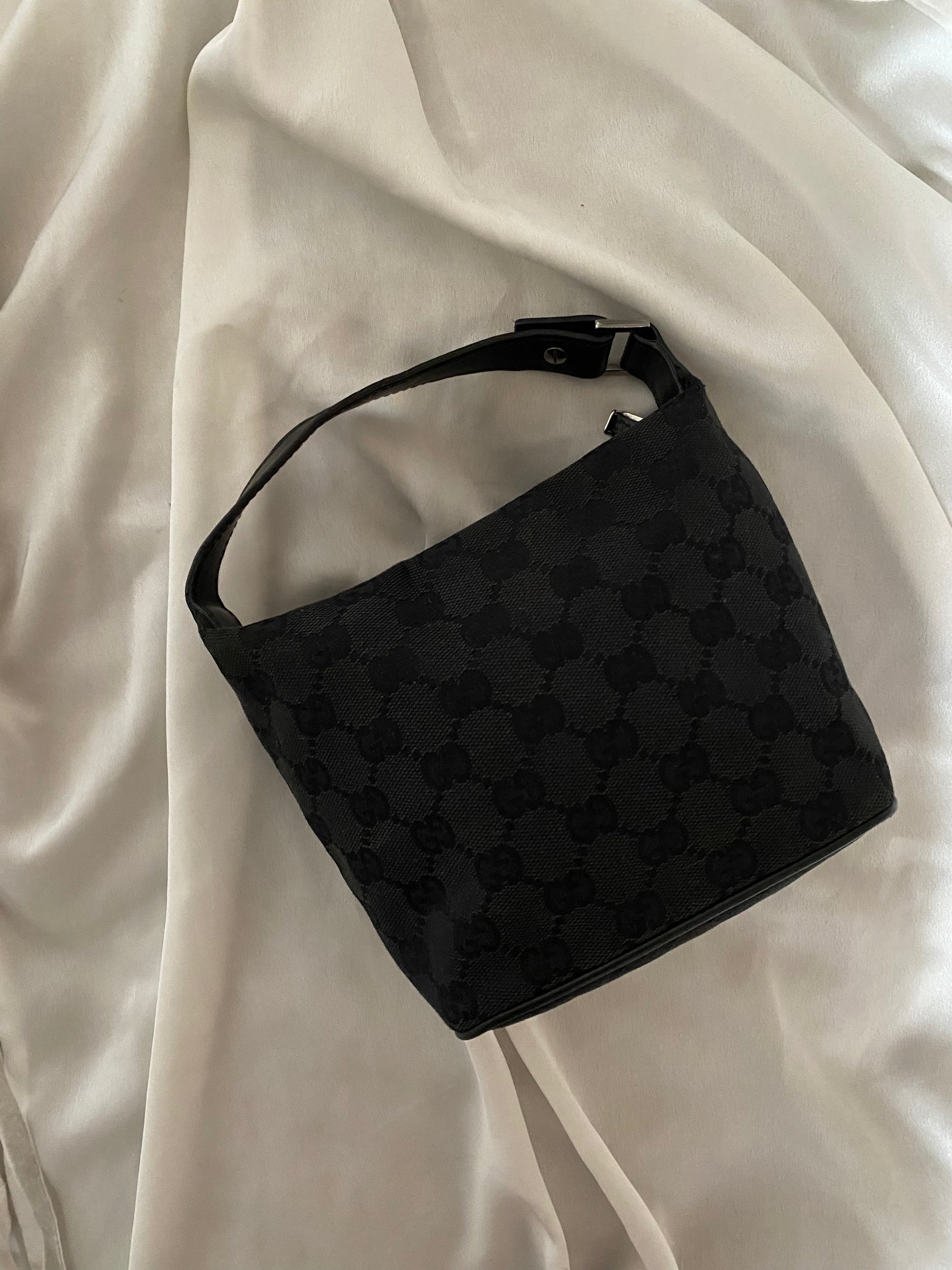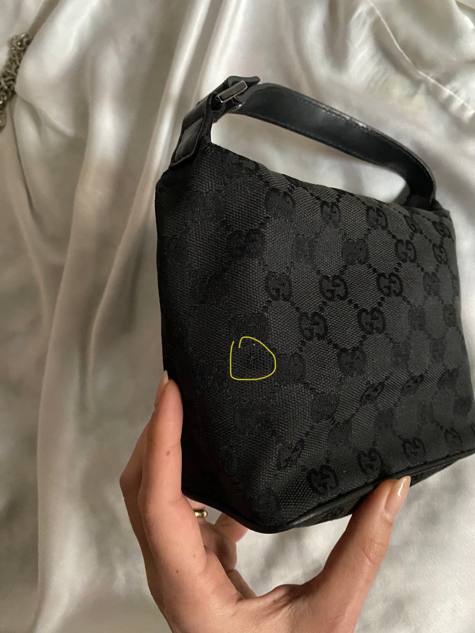 Meravigliosa Gucci mini hobo in tessuto monogram nero. Manico in pelle d’agnello. Hardware argento. 2 piccolissimi segni sul retro della tela, poco visibili (evidenziati in foto). Misure 20x14x9cm. Molto spaziosa: entra un cellulare, chiavi, portacarte, lipgloss e altro.