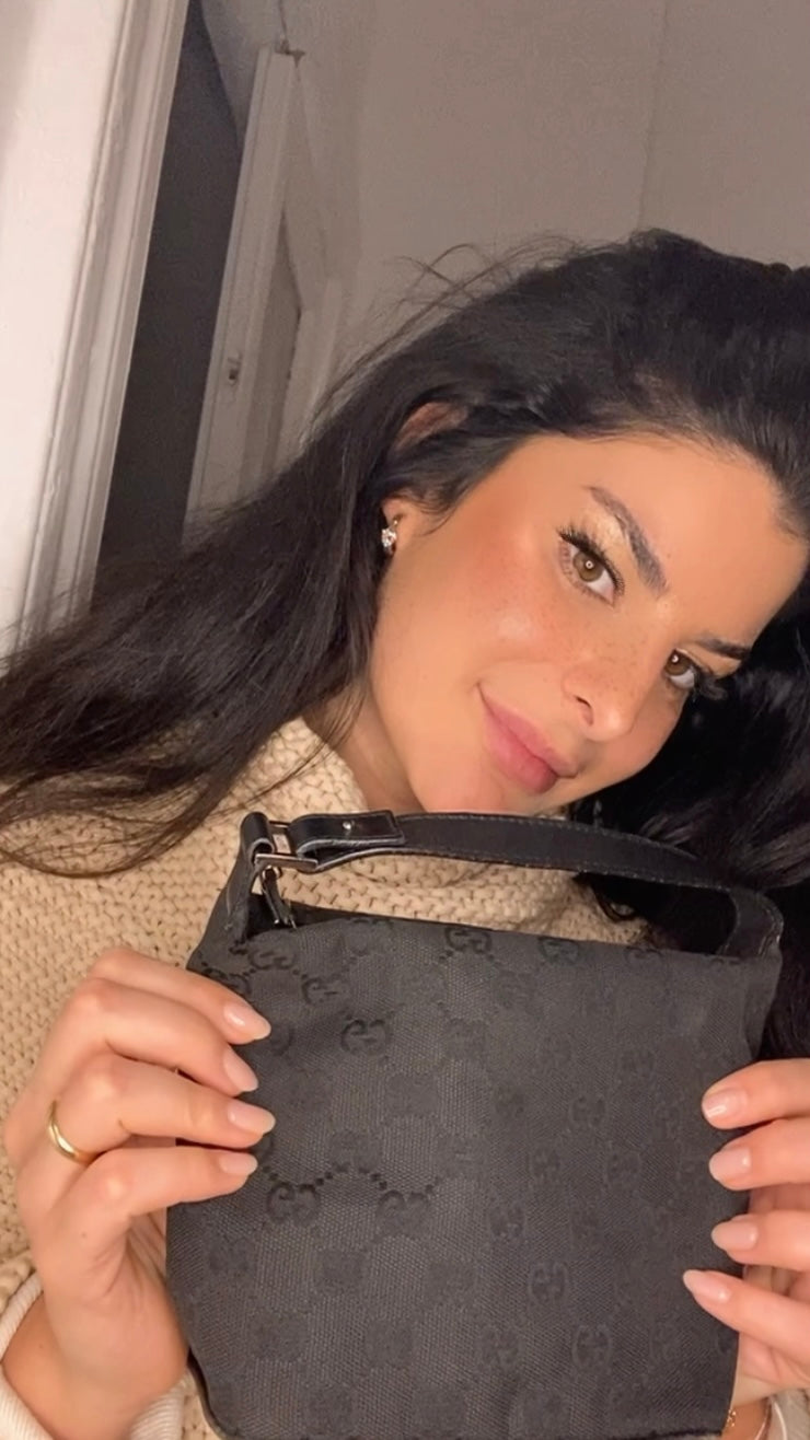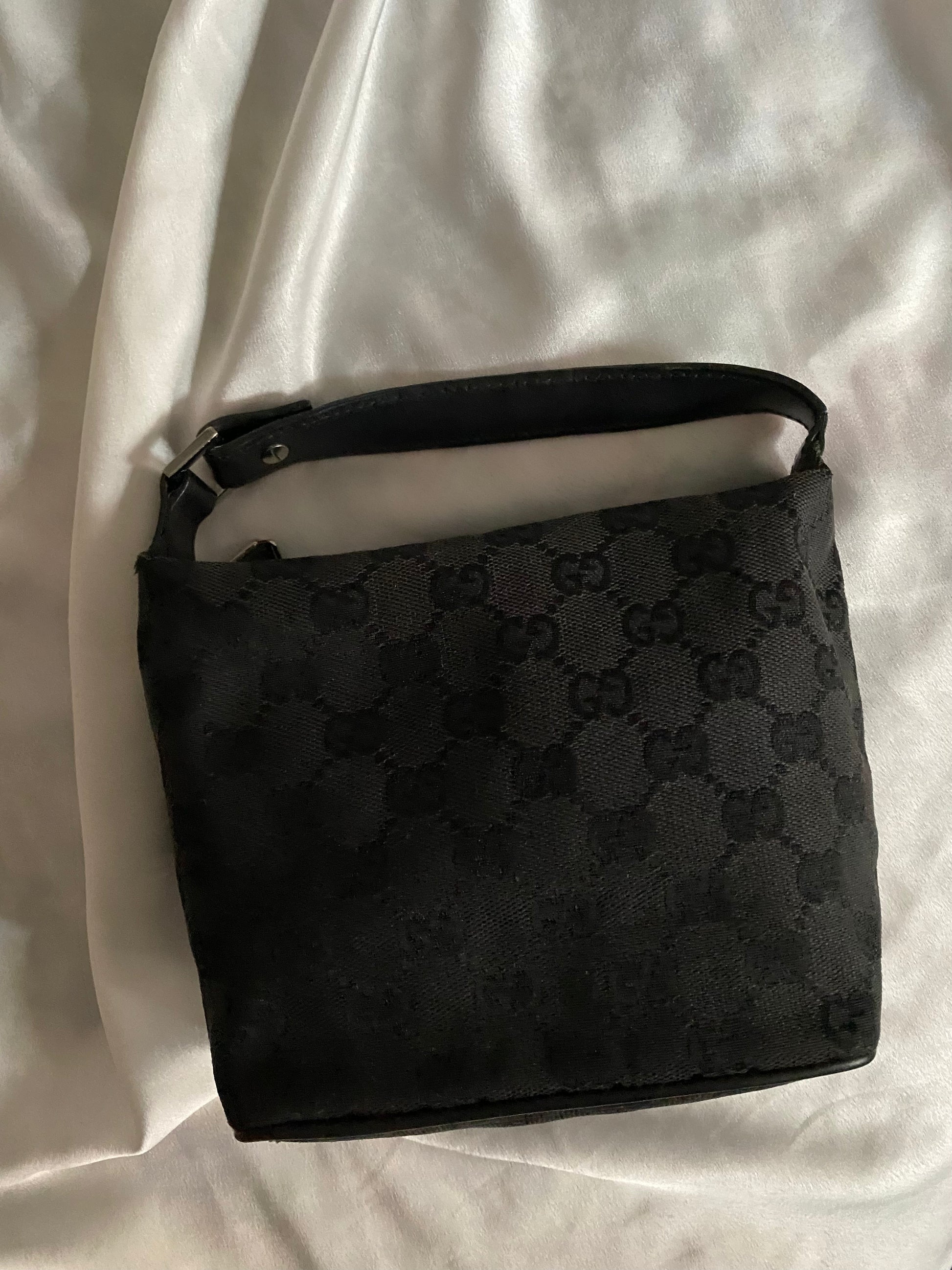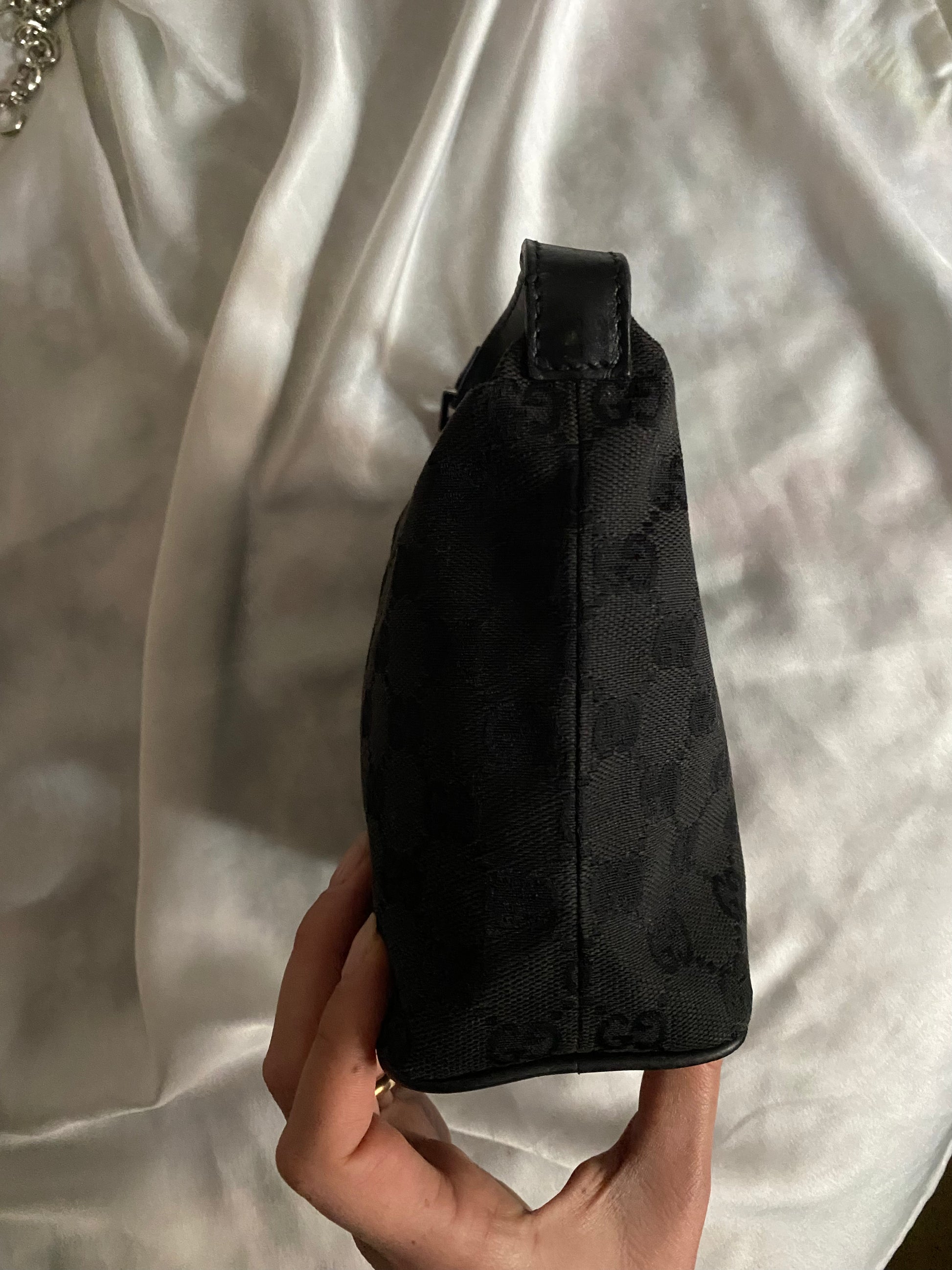 Meravigliosa Gucci mini hobo in tessuto monogram nero. Manico in pelle d’agnello. Hardware argento. 2 piccolissimi segni sul retro della tela, poco visibili (evidenziati in foto). Misure 20x14x9cm. Molto spaziosa: entra un cellulare, chiavi, portacarte, lipgloss e altro.