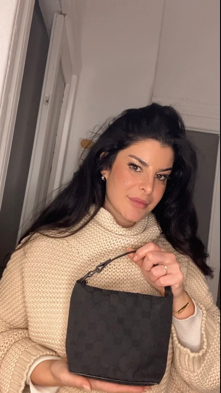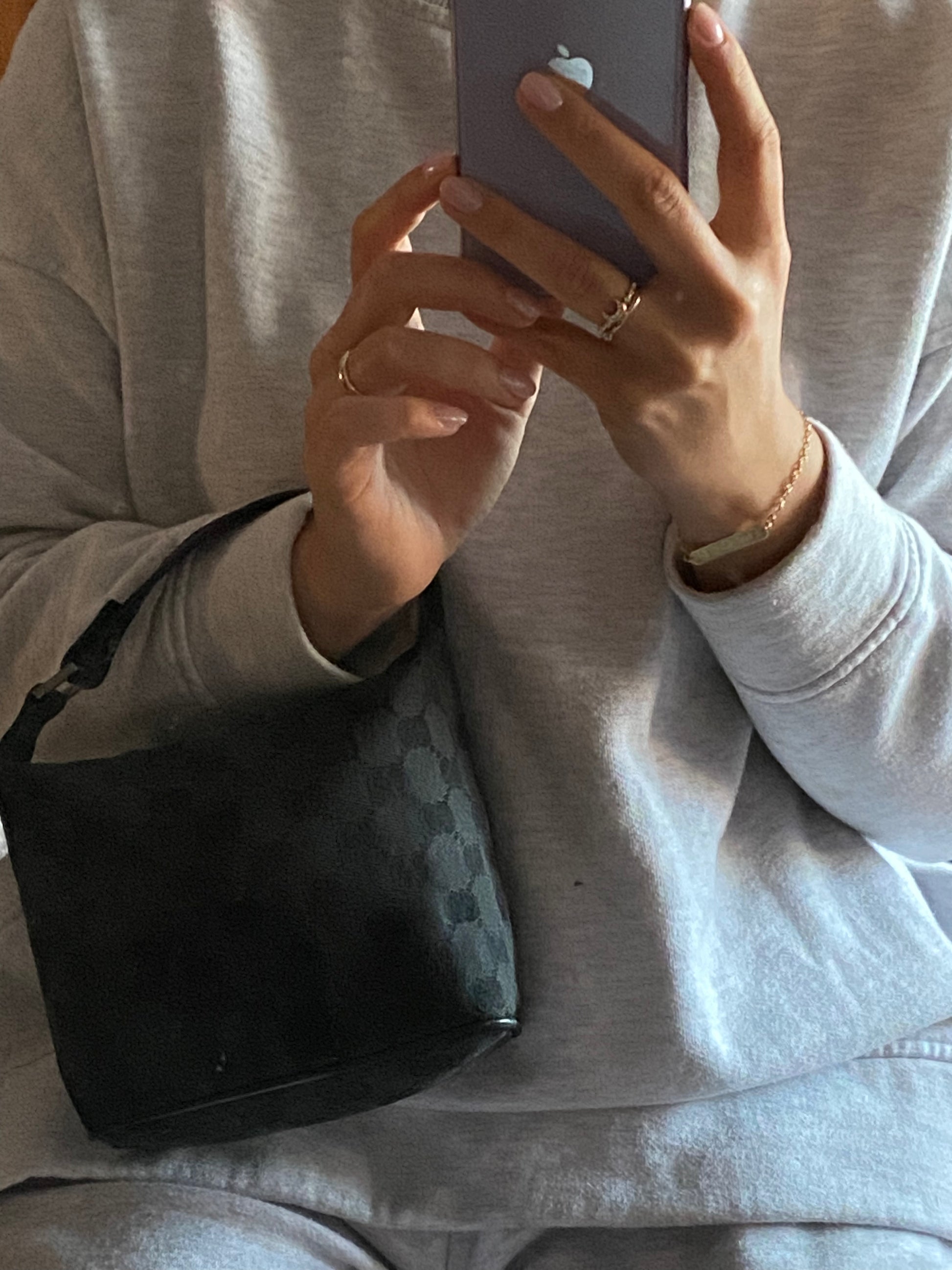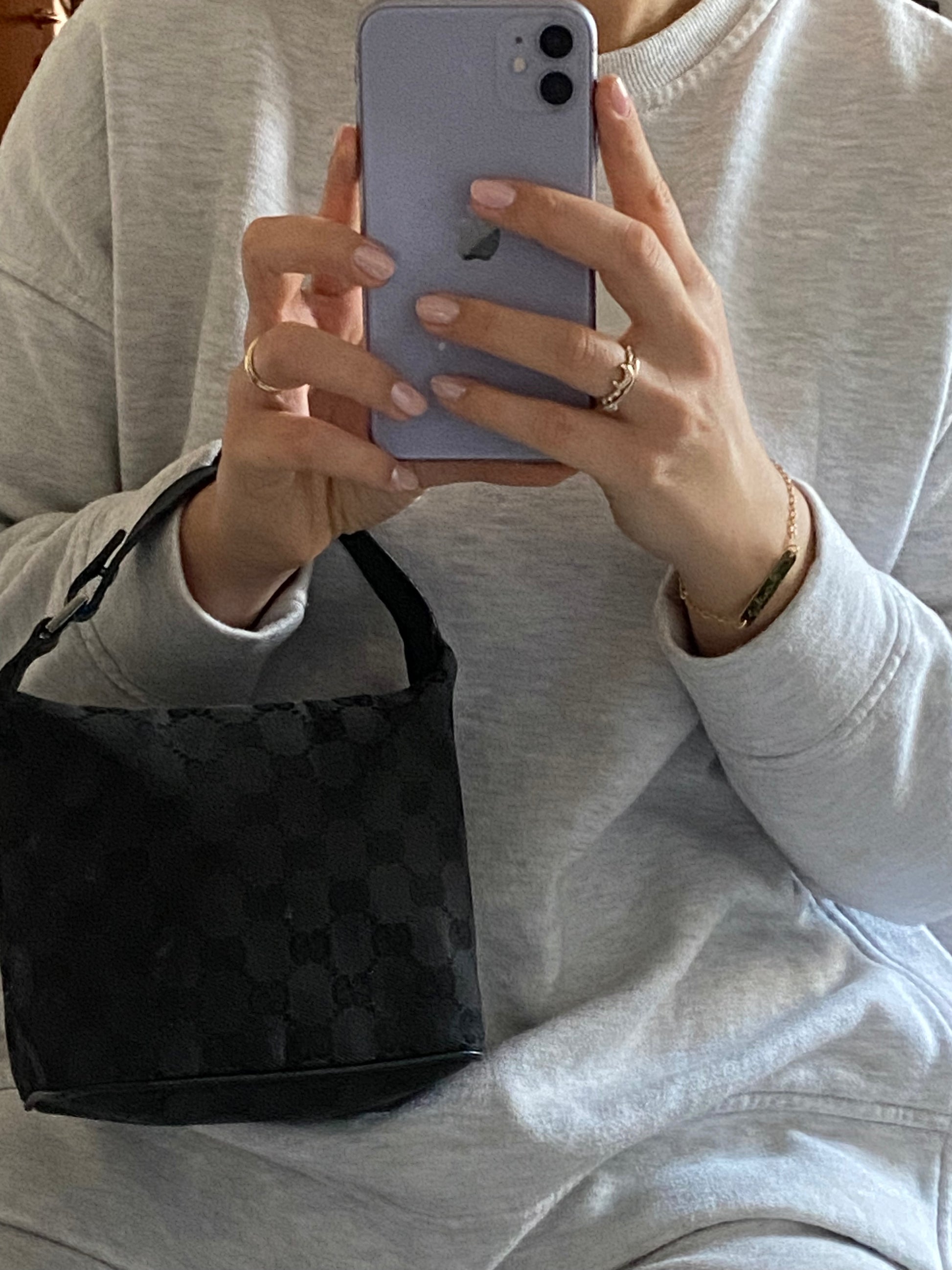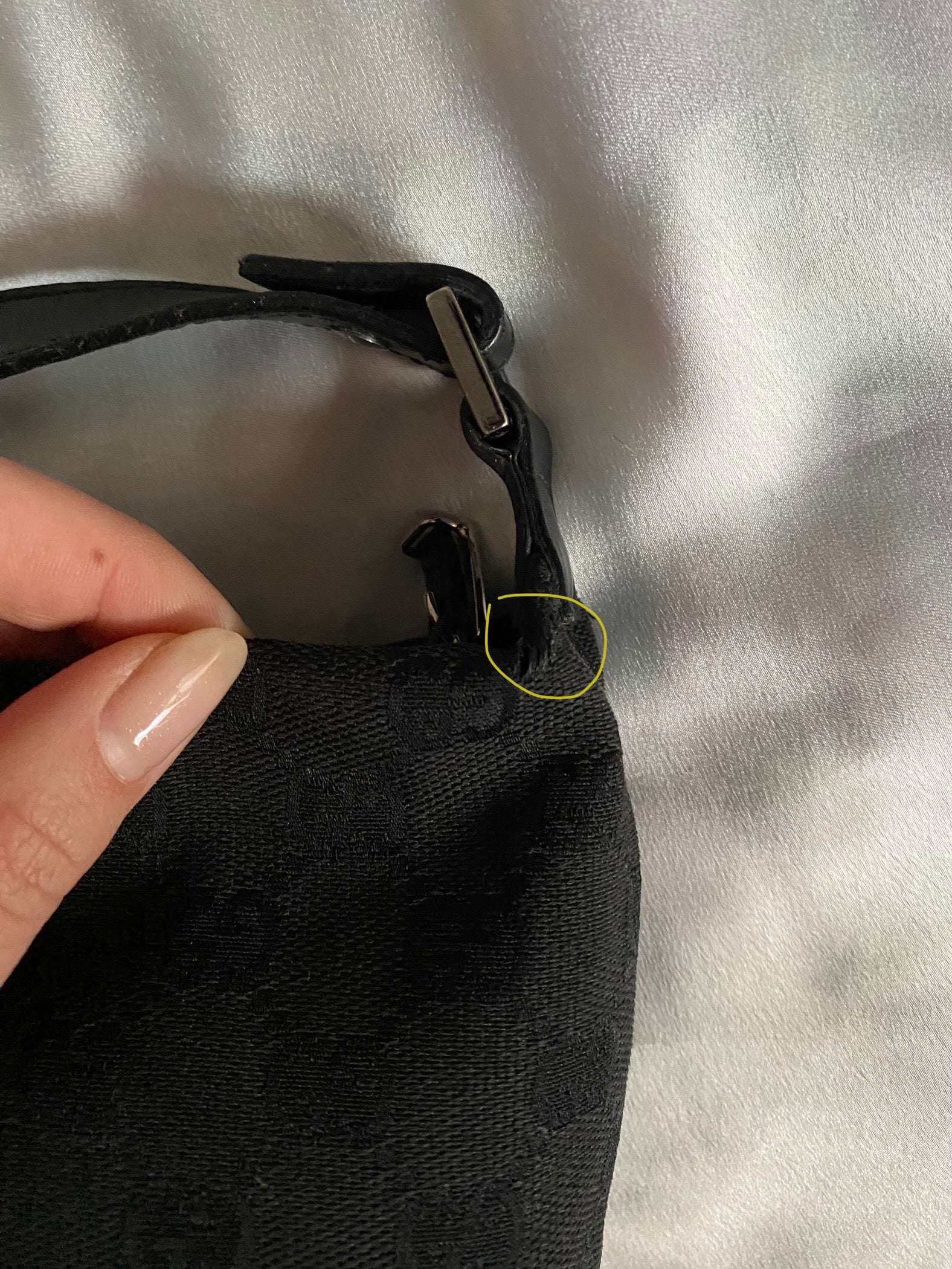 Meravigliosa Gucci mini hobo in tessuto monogram nero. Manico in pelle d’agnello. Hardware argento. 2 piccolissimi segni sul retro della tela, poco visibili (evidenziati in foto). Misure 20x14x9cm. Molto spaziosa: entra un cellulare, chiavi, portacarte, lipgloss e altro.