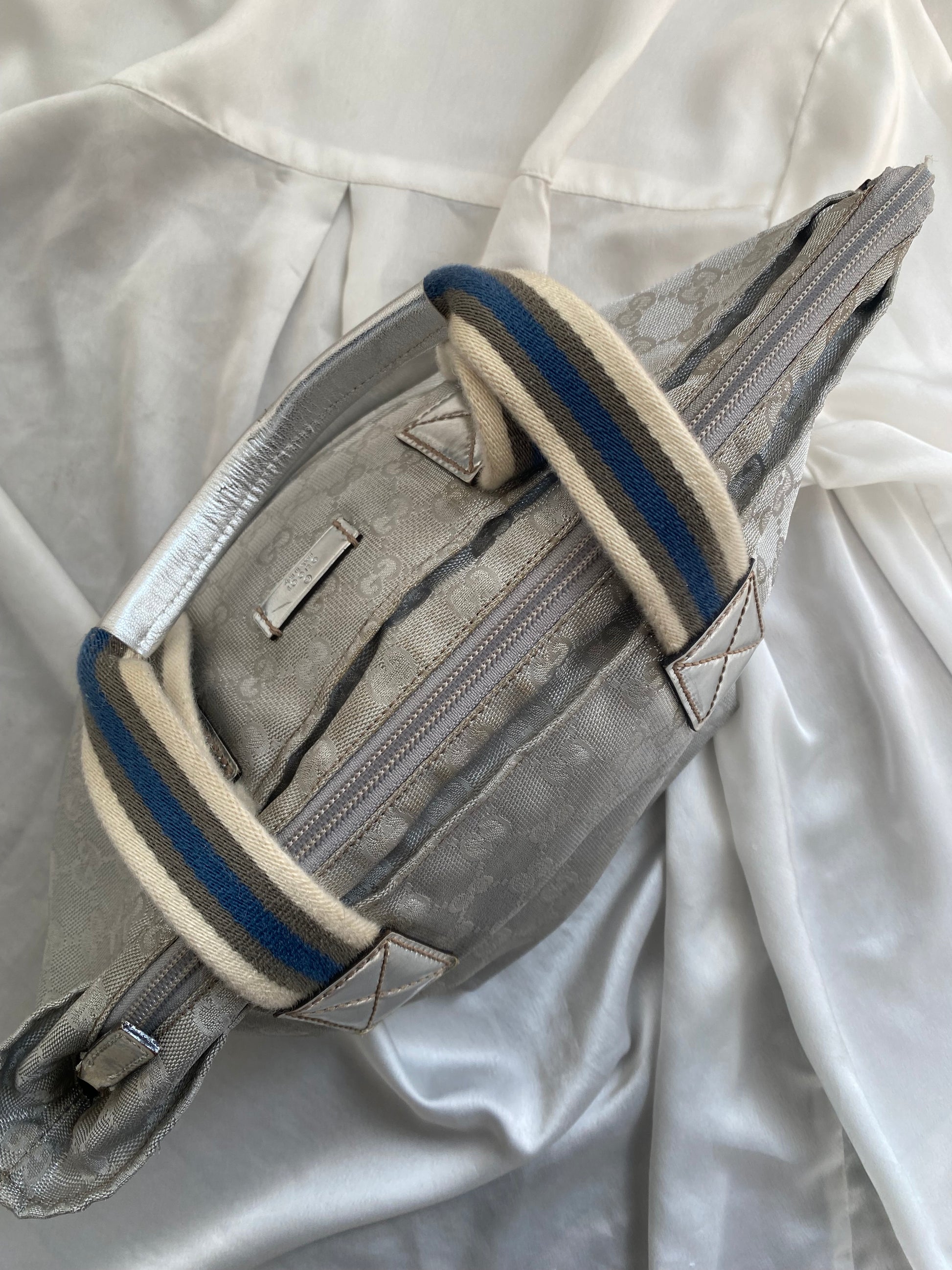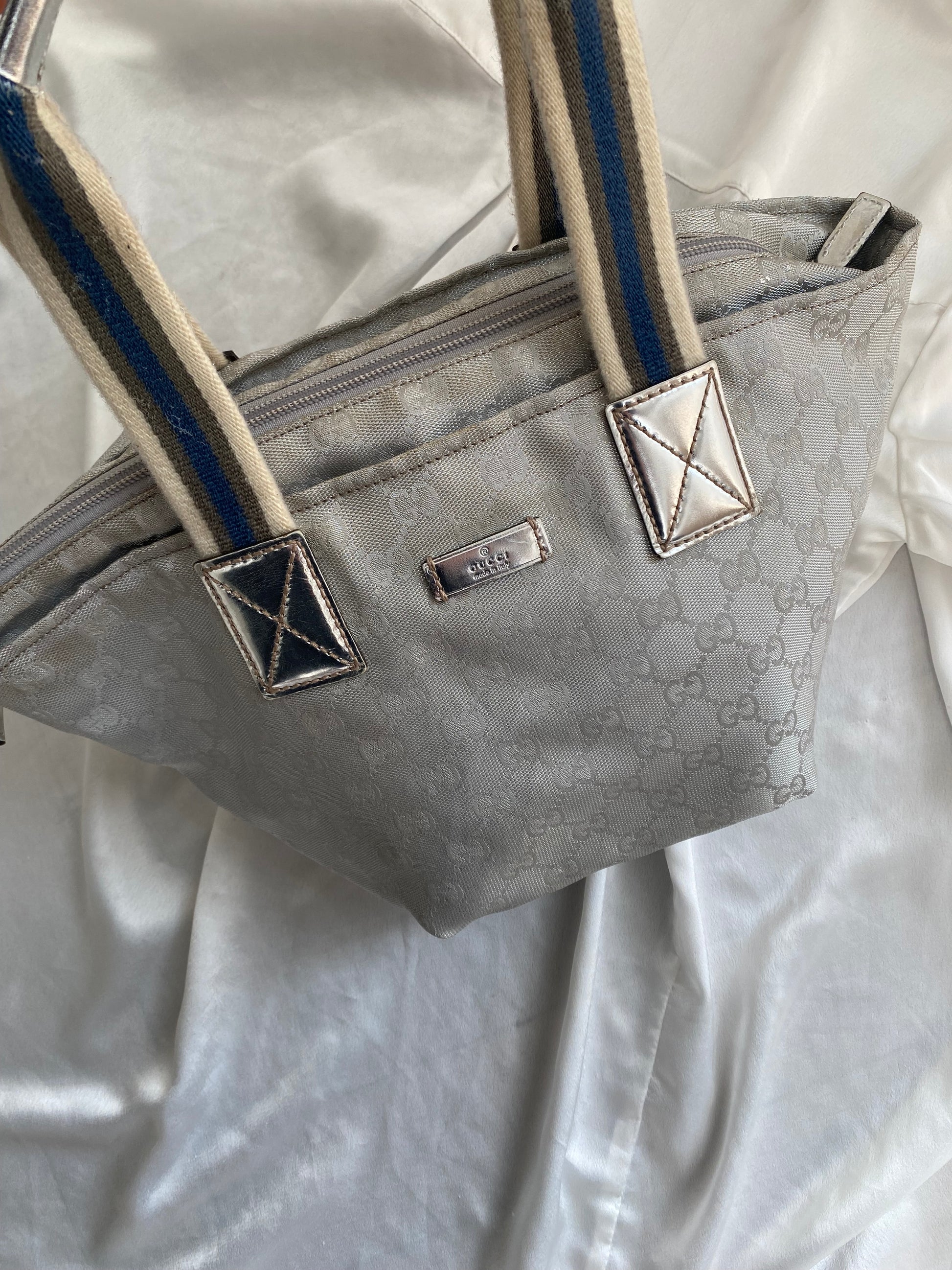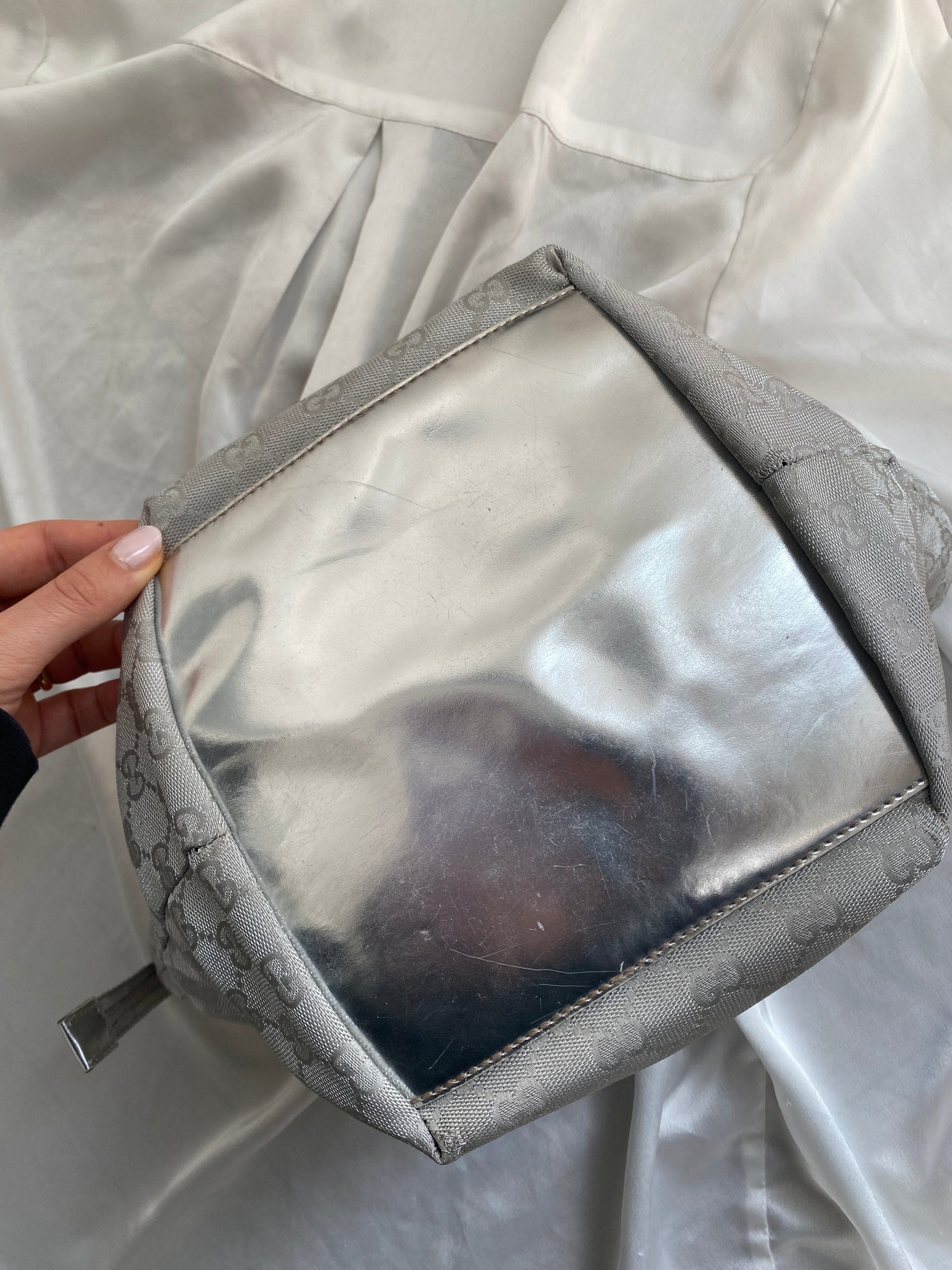bellissima Gucci Shelly, mini tote argento metallizzato. Usata con qualche segno sulle parti in pelle e sulla tela, buone condizioni generali. Modello molto versatile.
