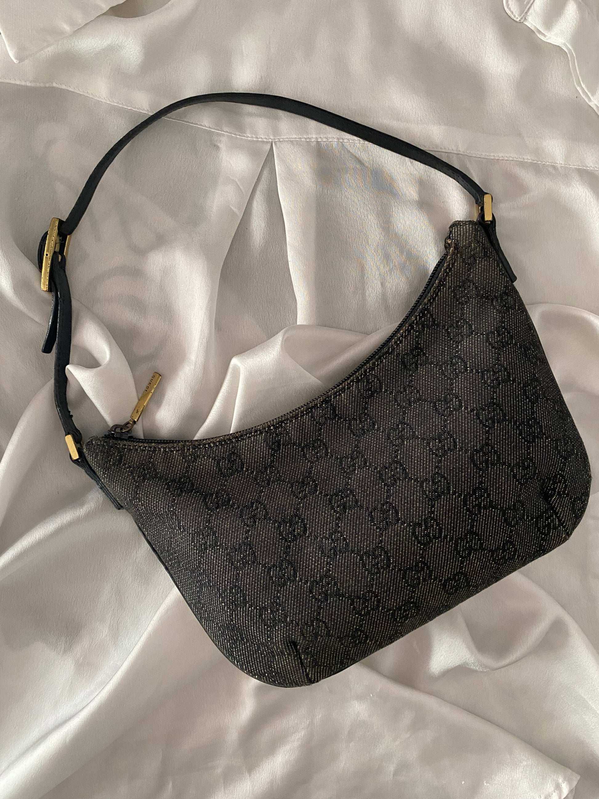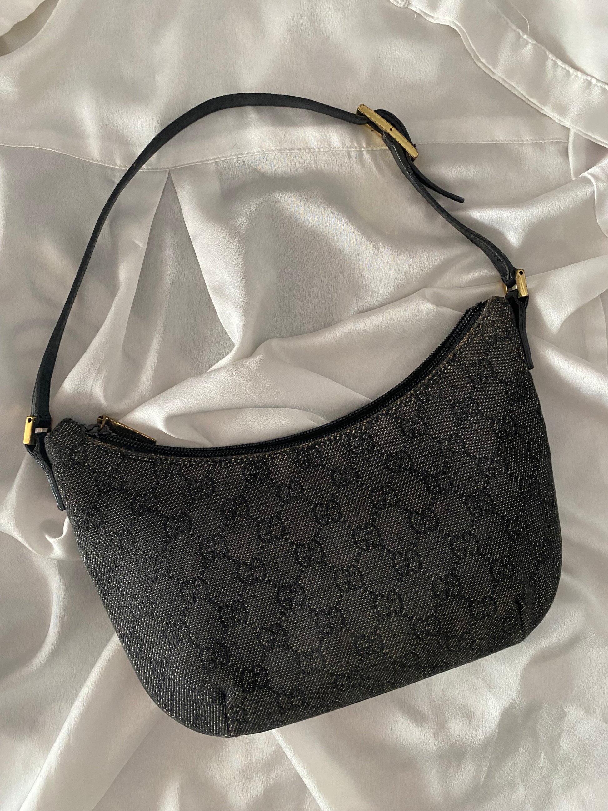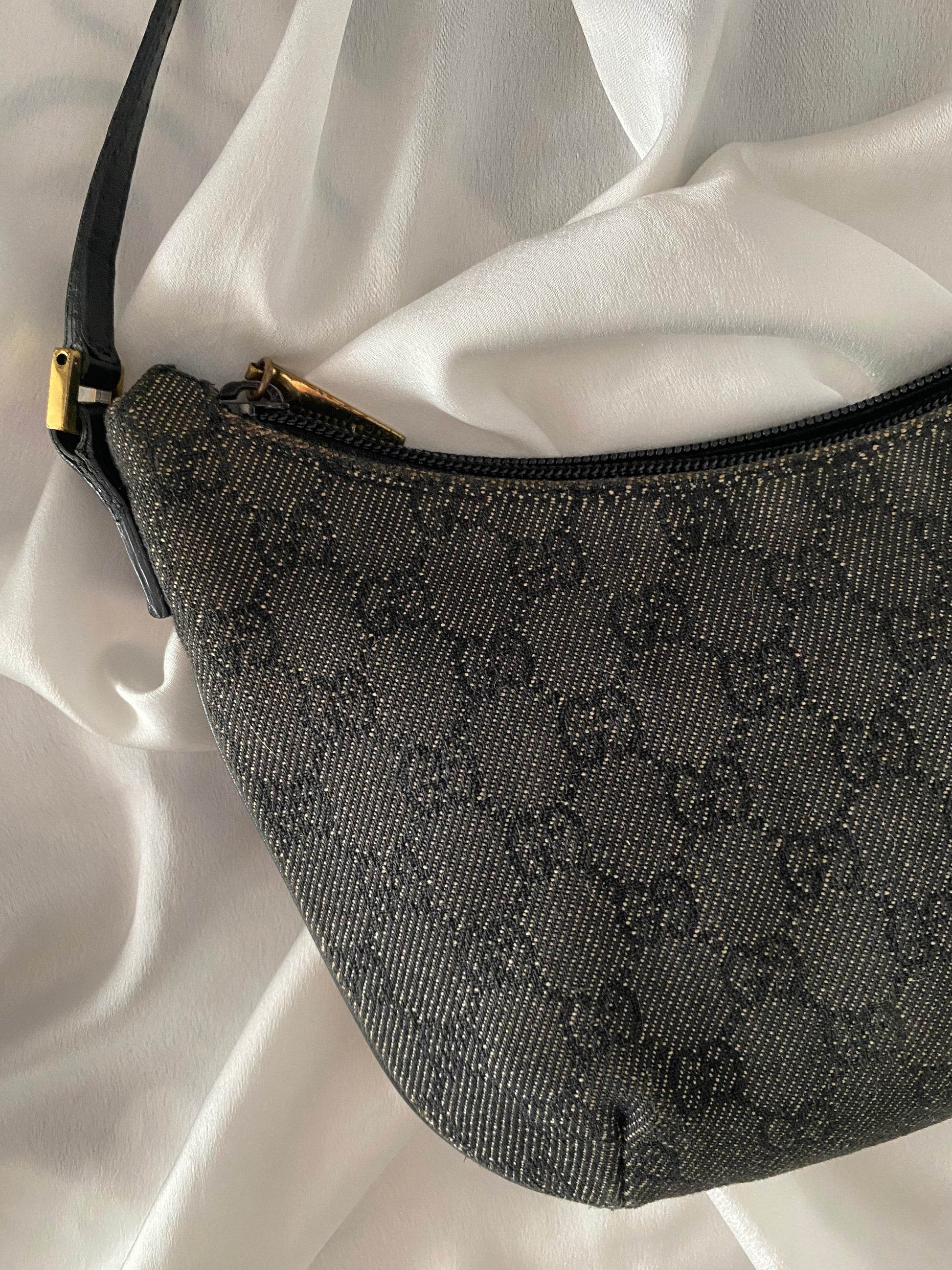 Iconica Gucci Moon Hobo in Denim Grigia e nera 🥹🥹🥹 profili in pelle, forma PAZZESCA! Manico rinforzato per evitare problema classico di questo modello, qualche segnetto sui bordini superiori, poco visibile. Buonissime condizioni generali 😍