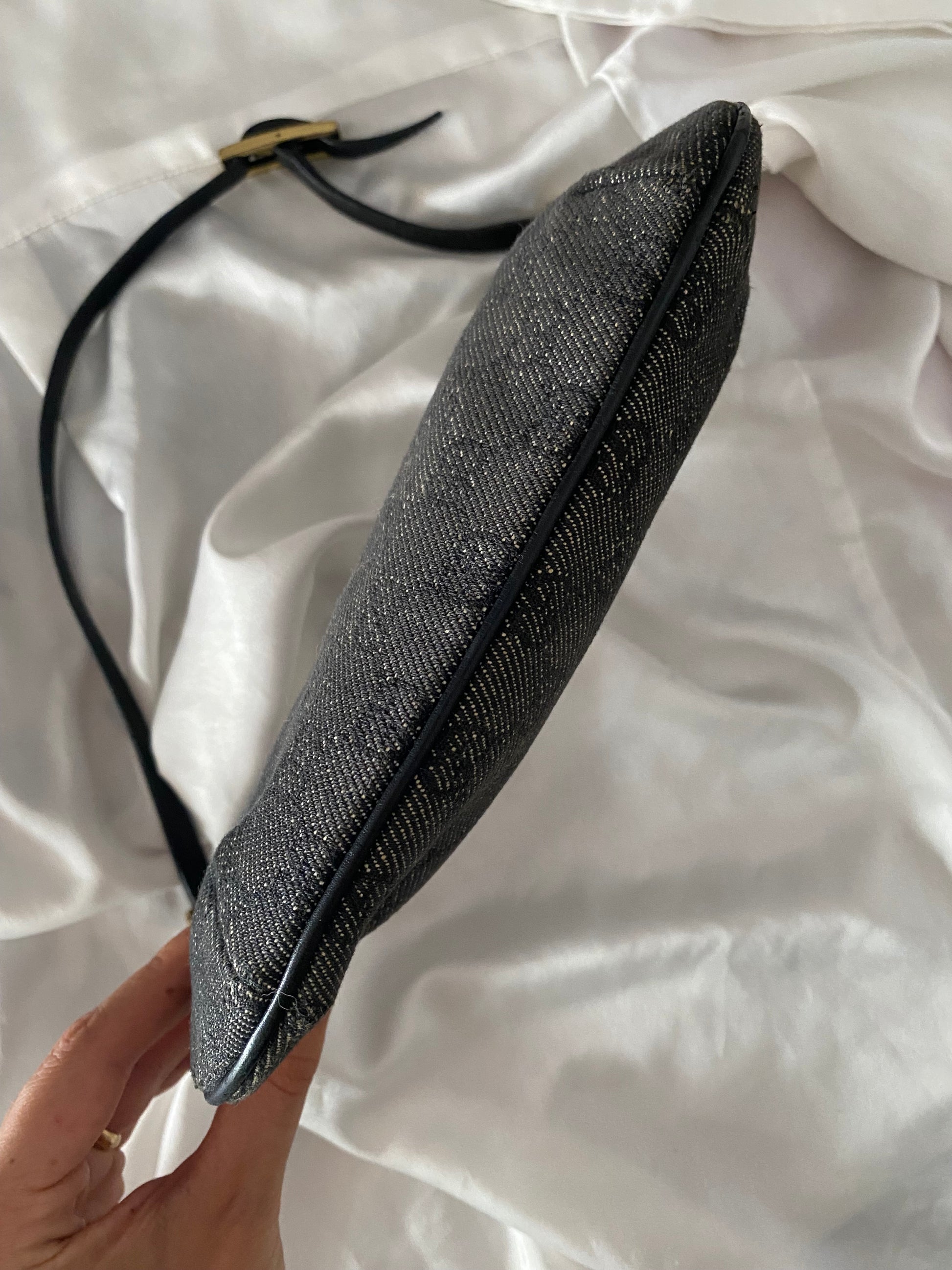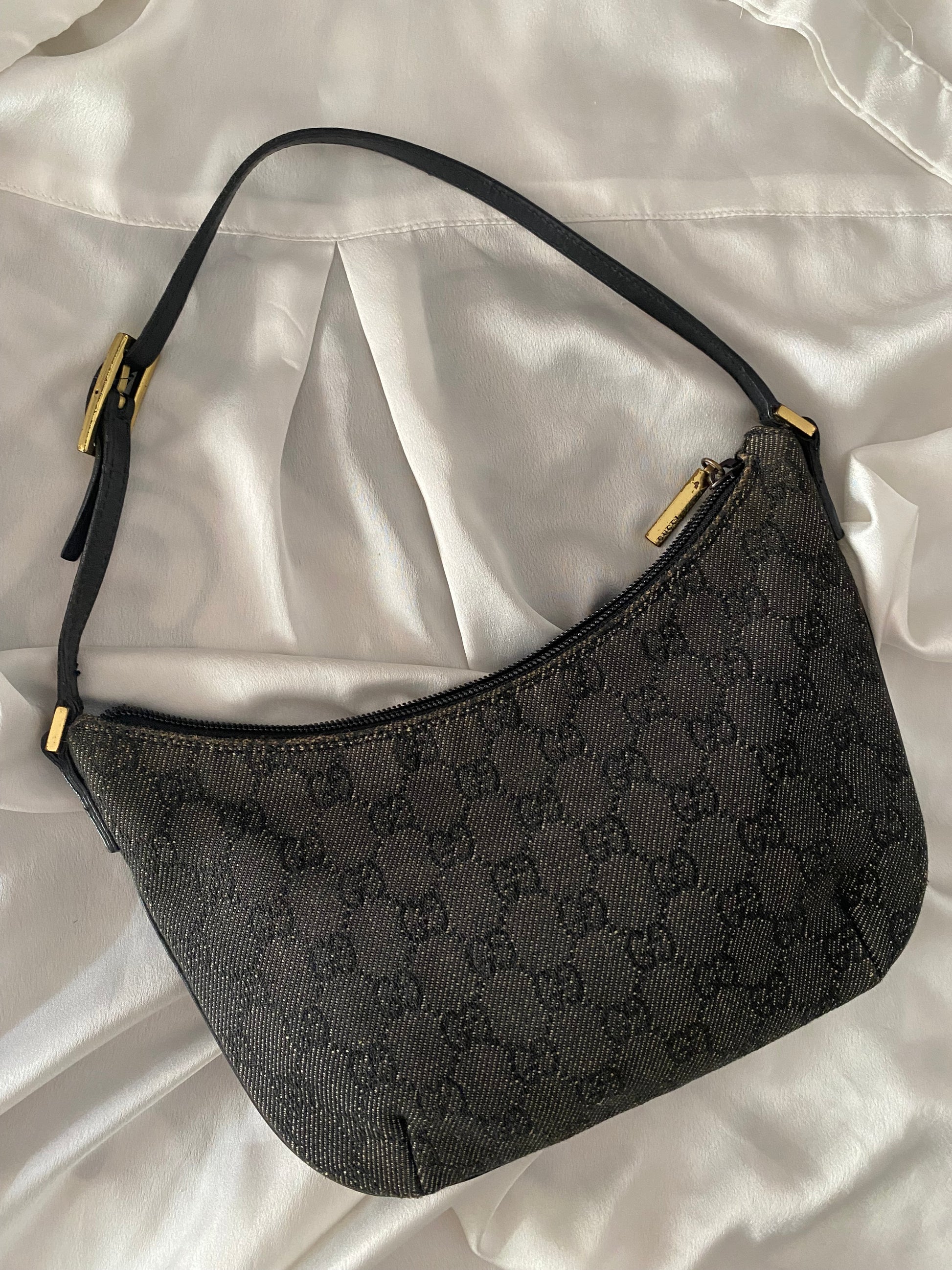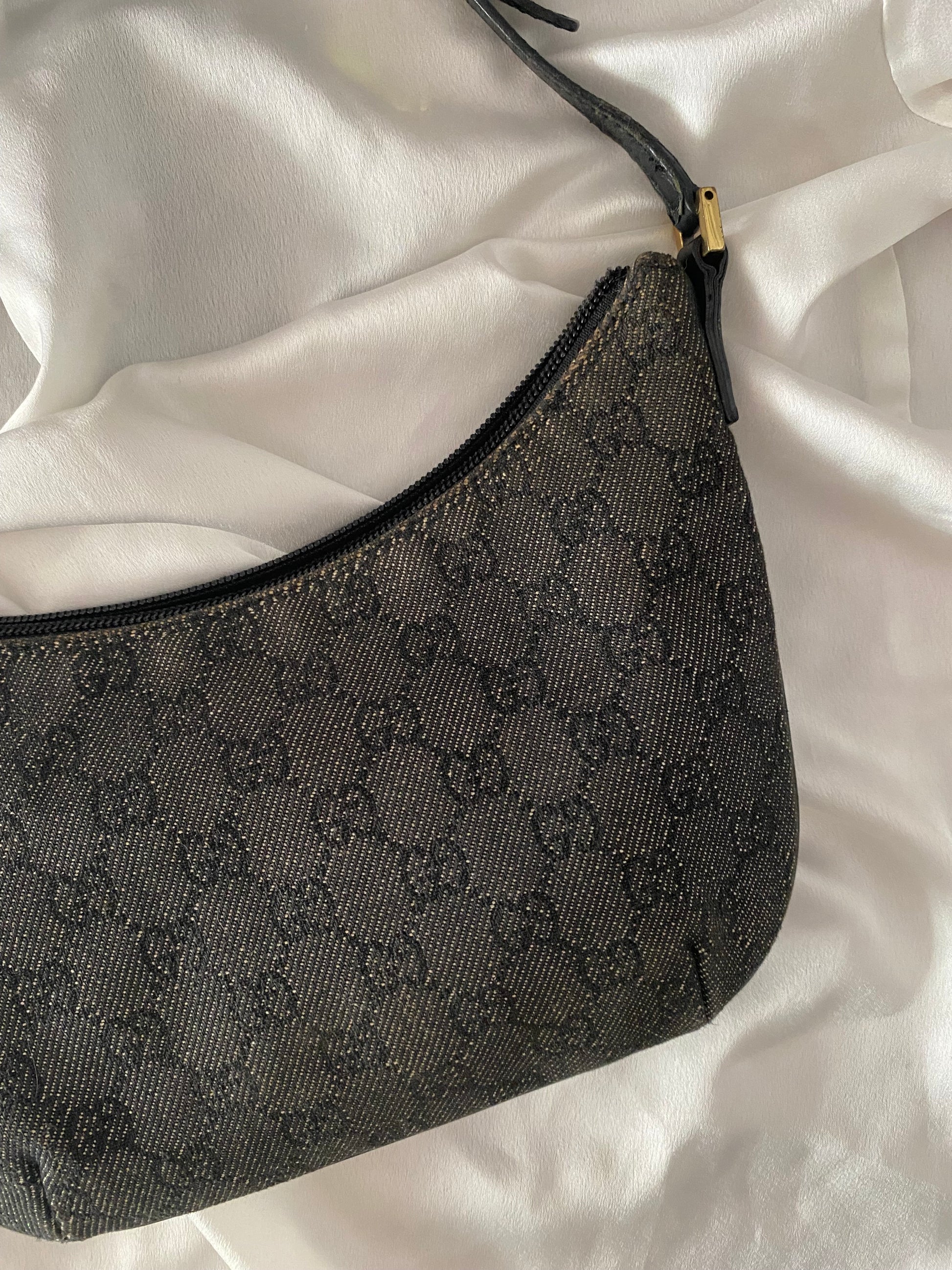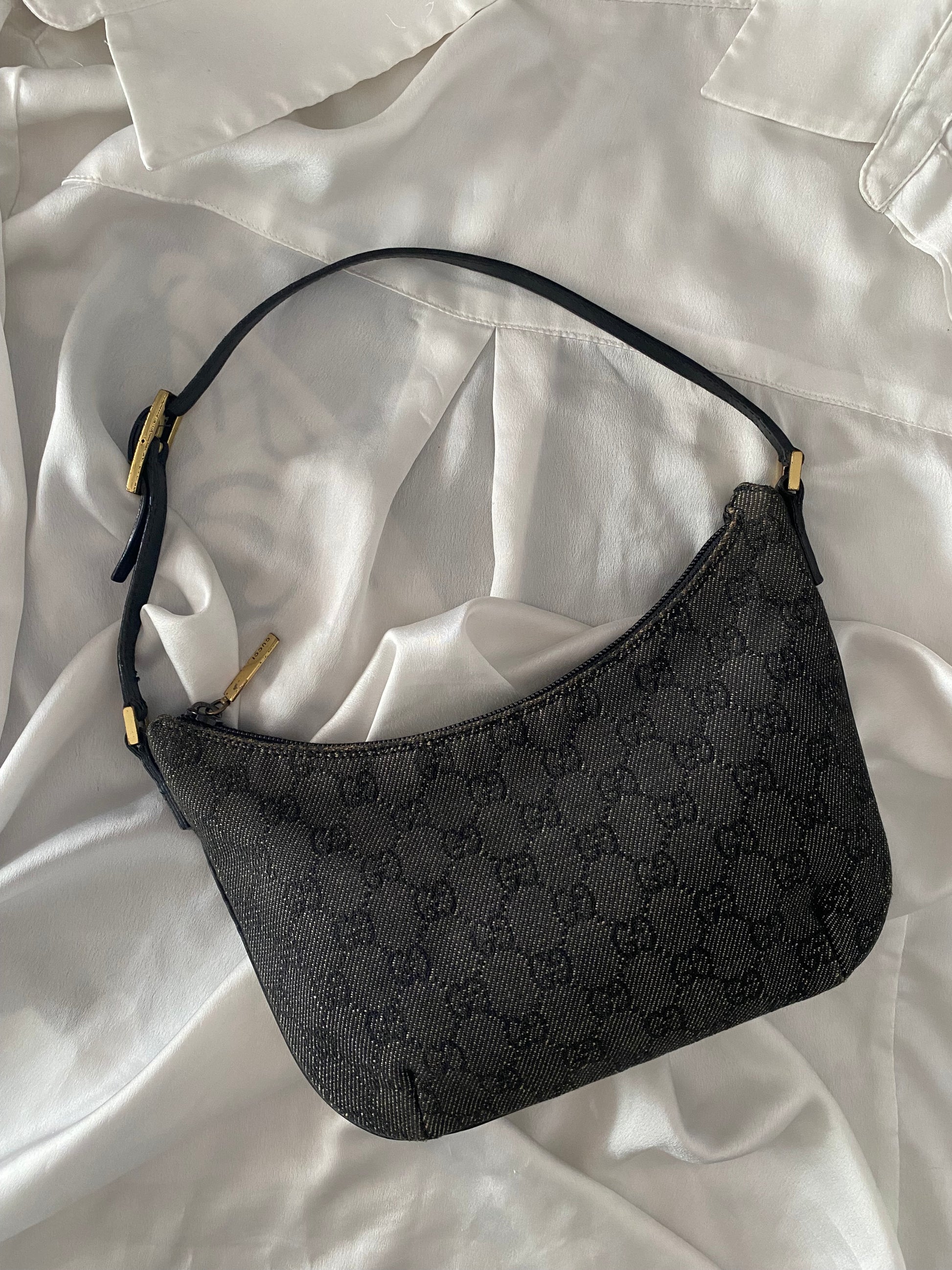 Iconica Gucci Moon Hobo in Denim Grigia e nera 🥹🥹🥹 profili in pelle, forma PAZZESCA! Manico rinforzato per evitare problema classico di questo modello, qualche segnetto sui bordini superiori, poco visibile. Buonissime condizioni generali 😍