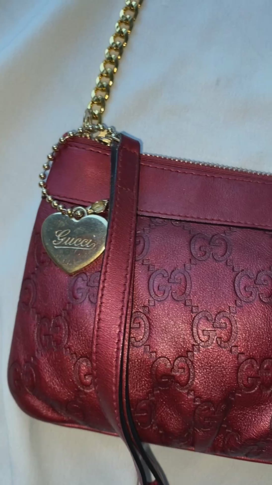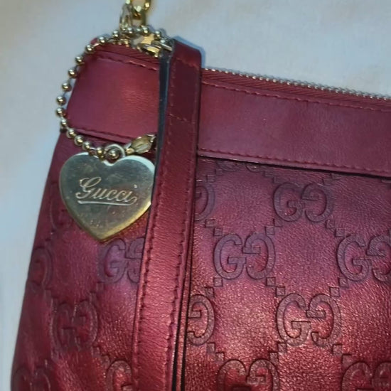 Magnifica pochette Gucci burgundy con riflessi iridescenti rubino in pelle con monogram intagliato.