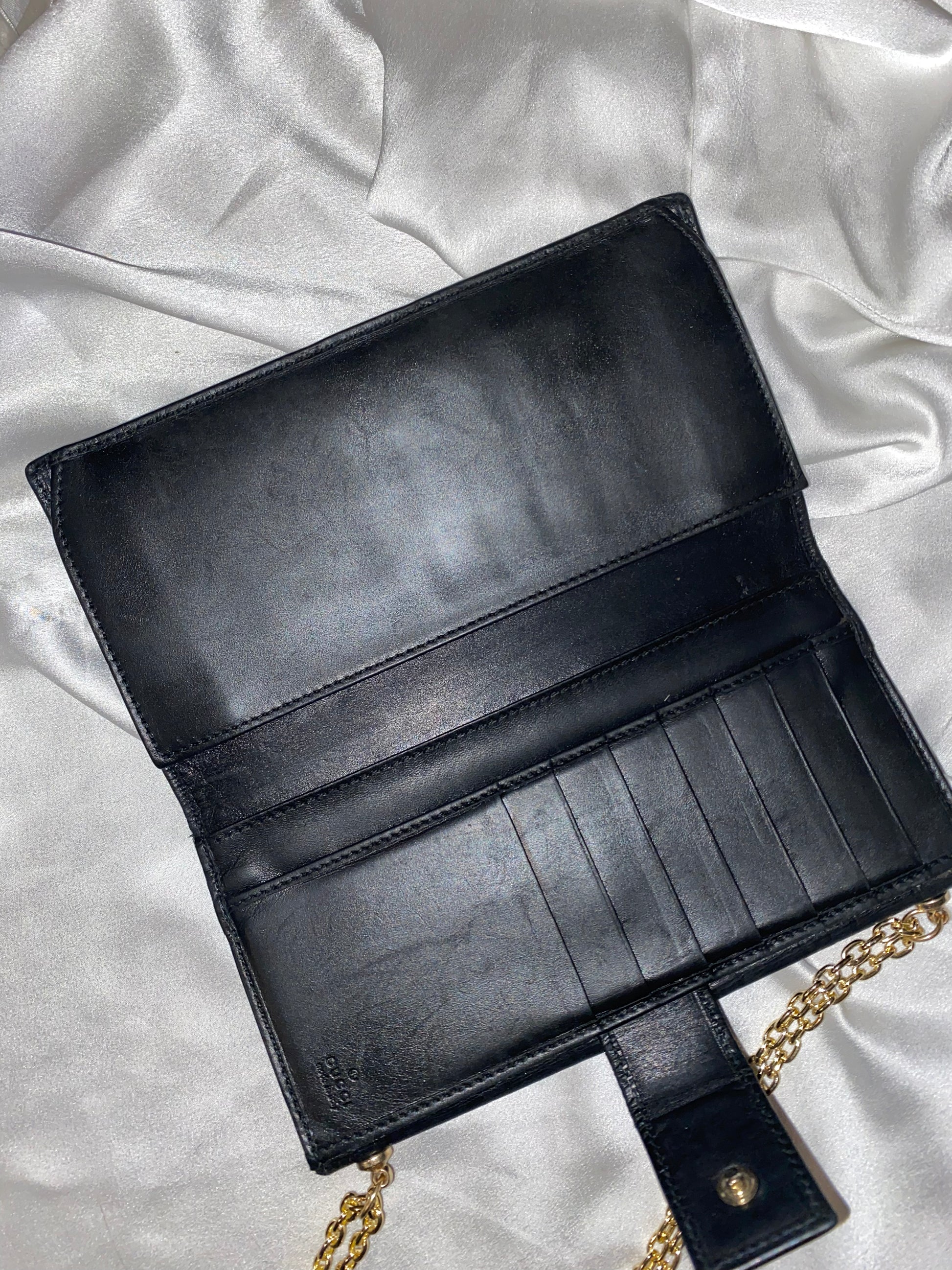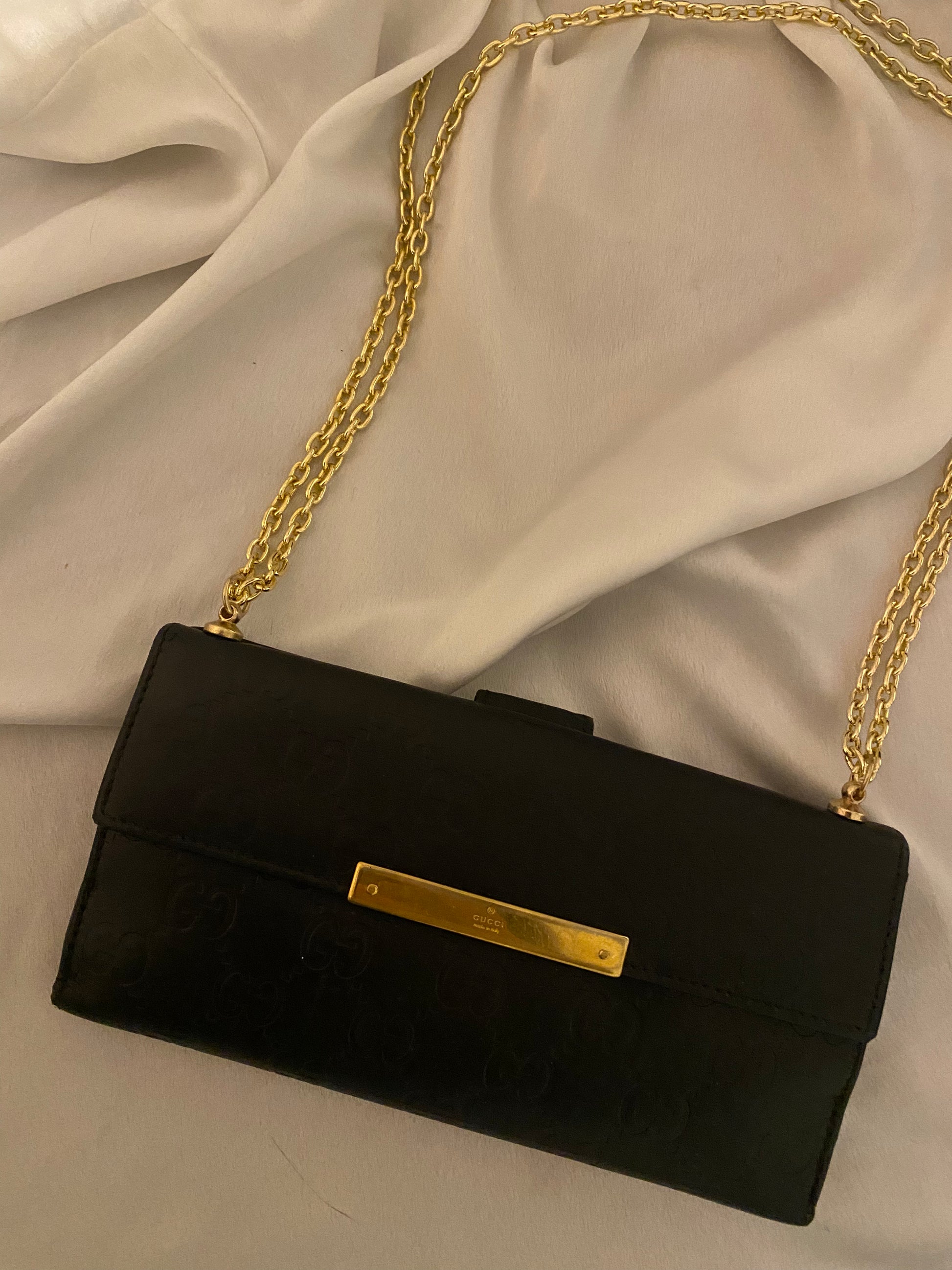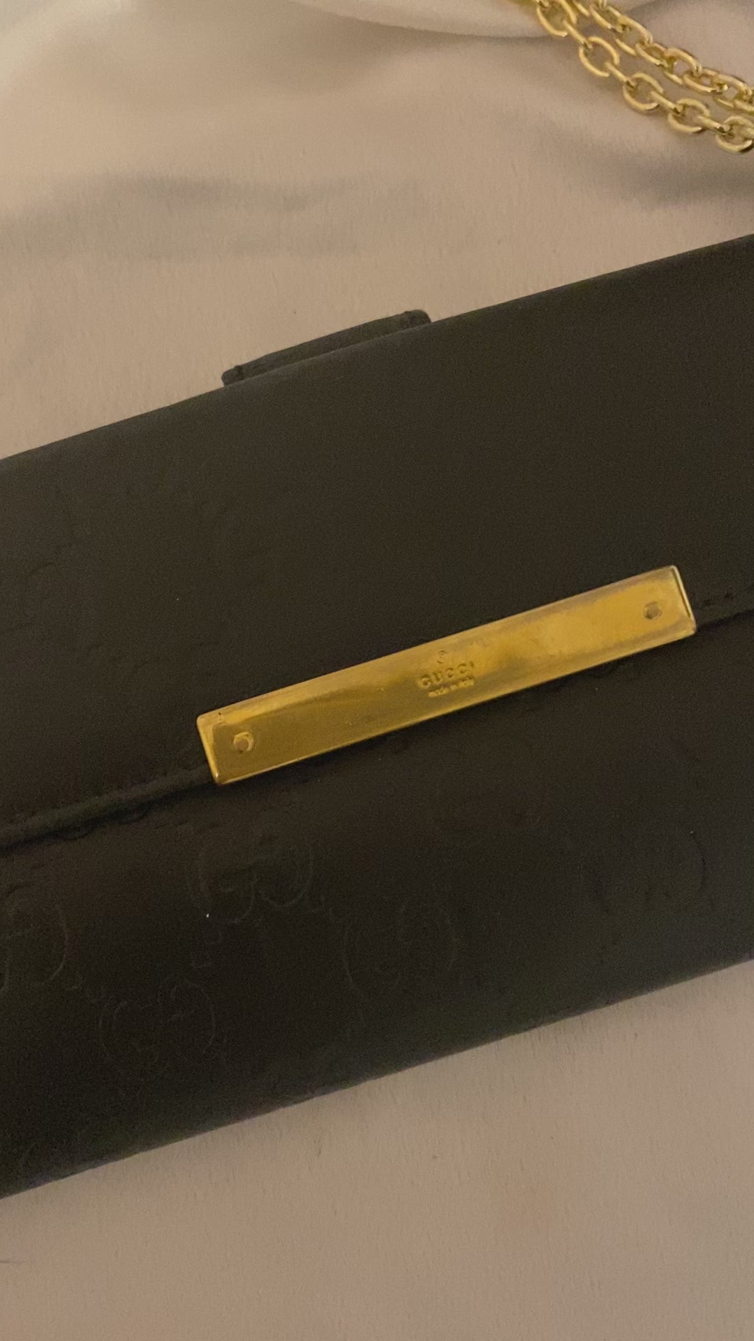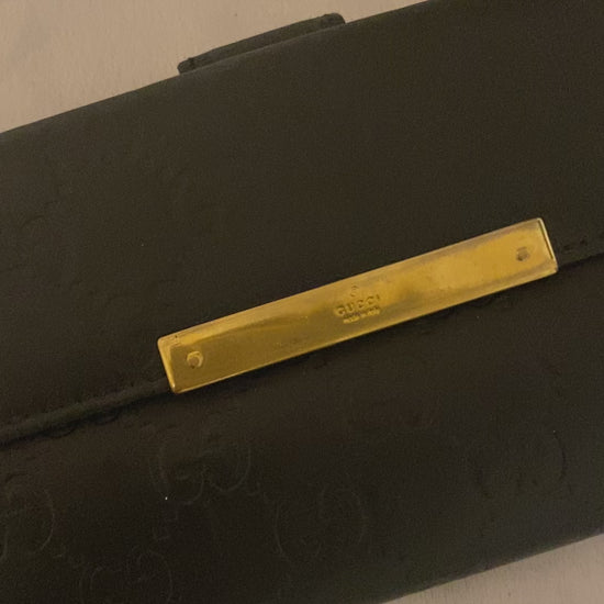 Pochette Gucci con loghi embossed nera, hardware brillante.