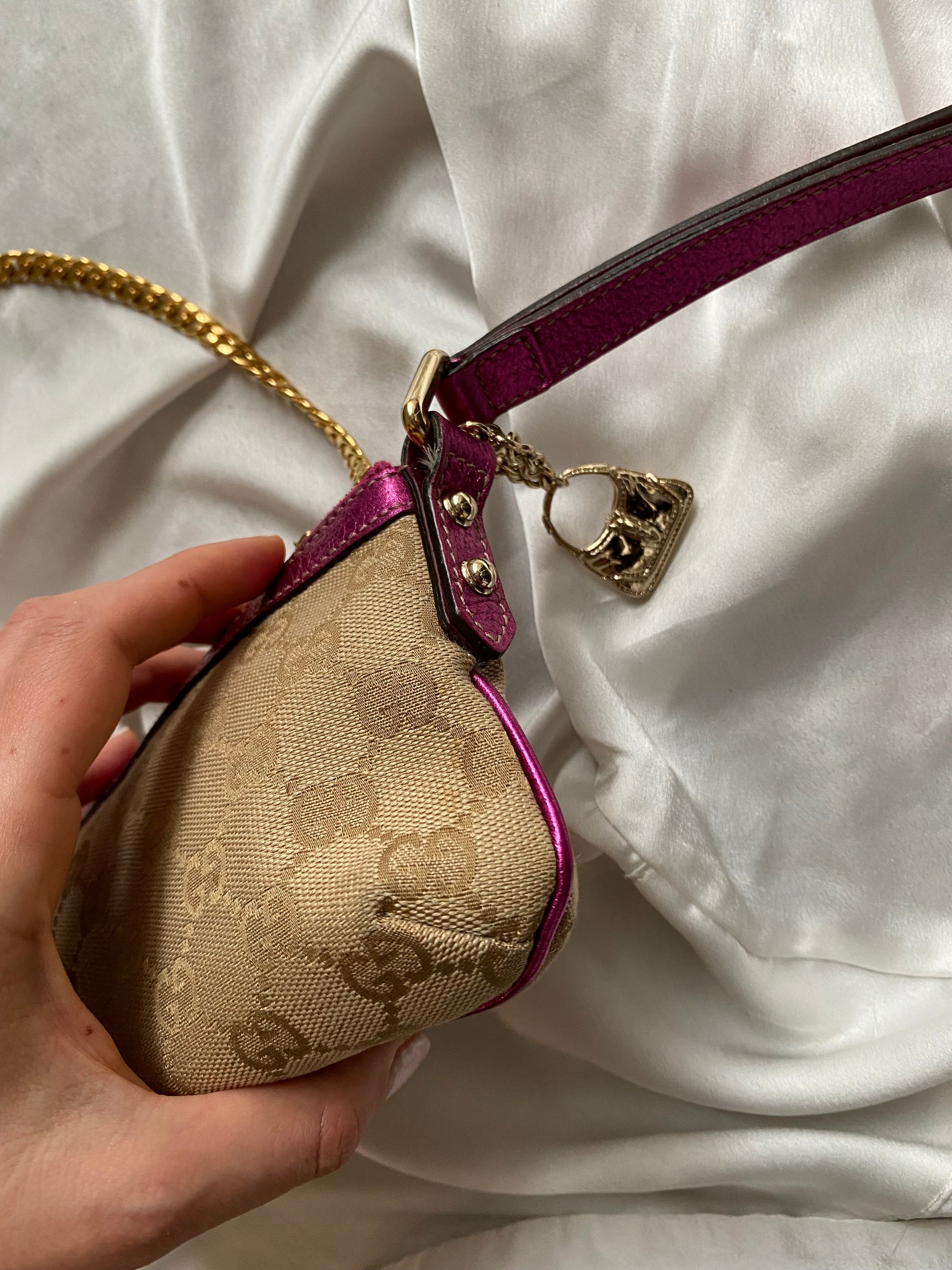 Bellissima e rarissima pochette di Gucci in monogram beige con profili in pelle metallizzata fucsia. Catena aggiunta per portarla a spalla. È incluso il portachiavi con la mini Jackie che è meraviglioso!!!