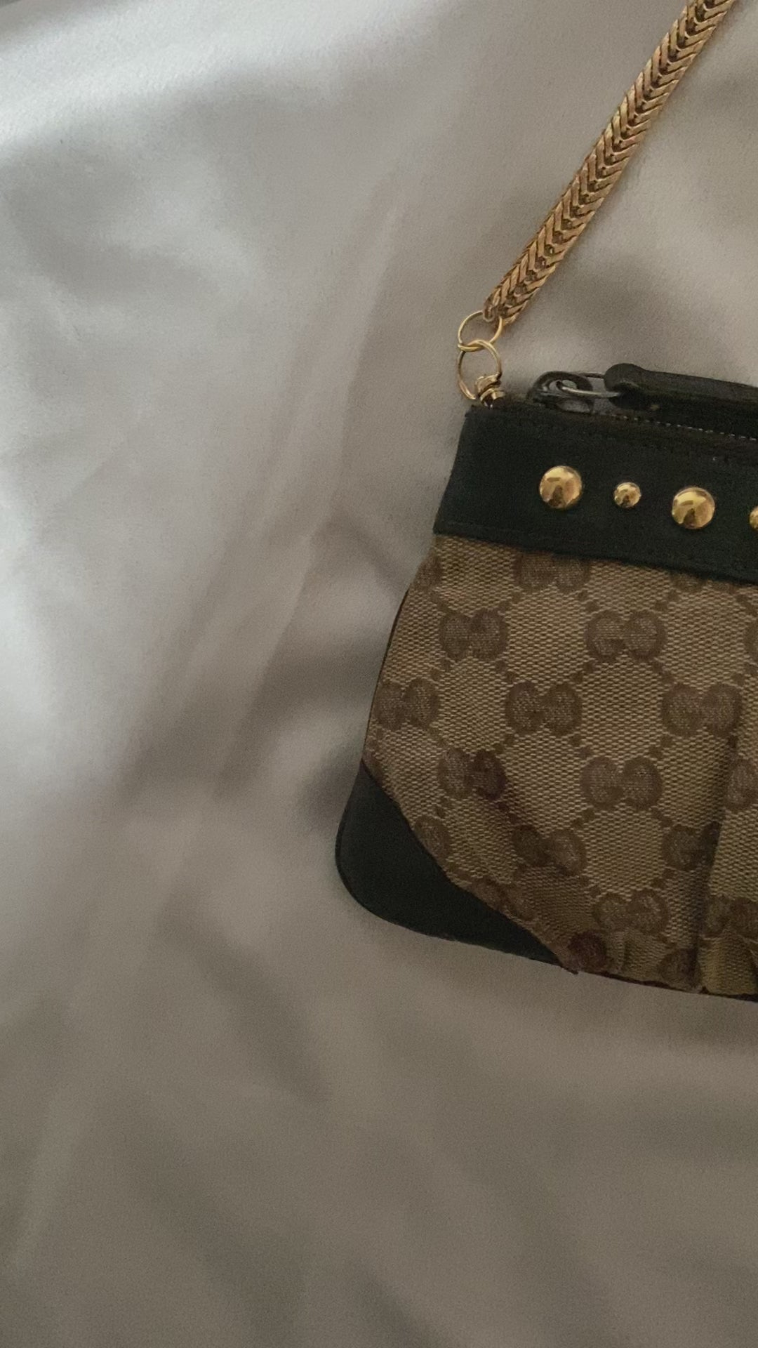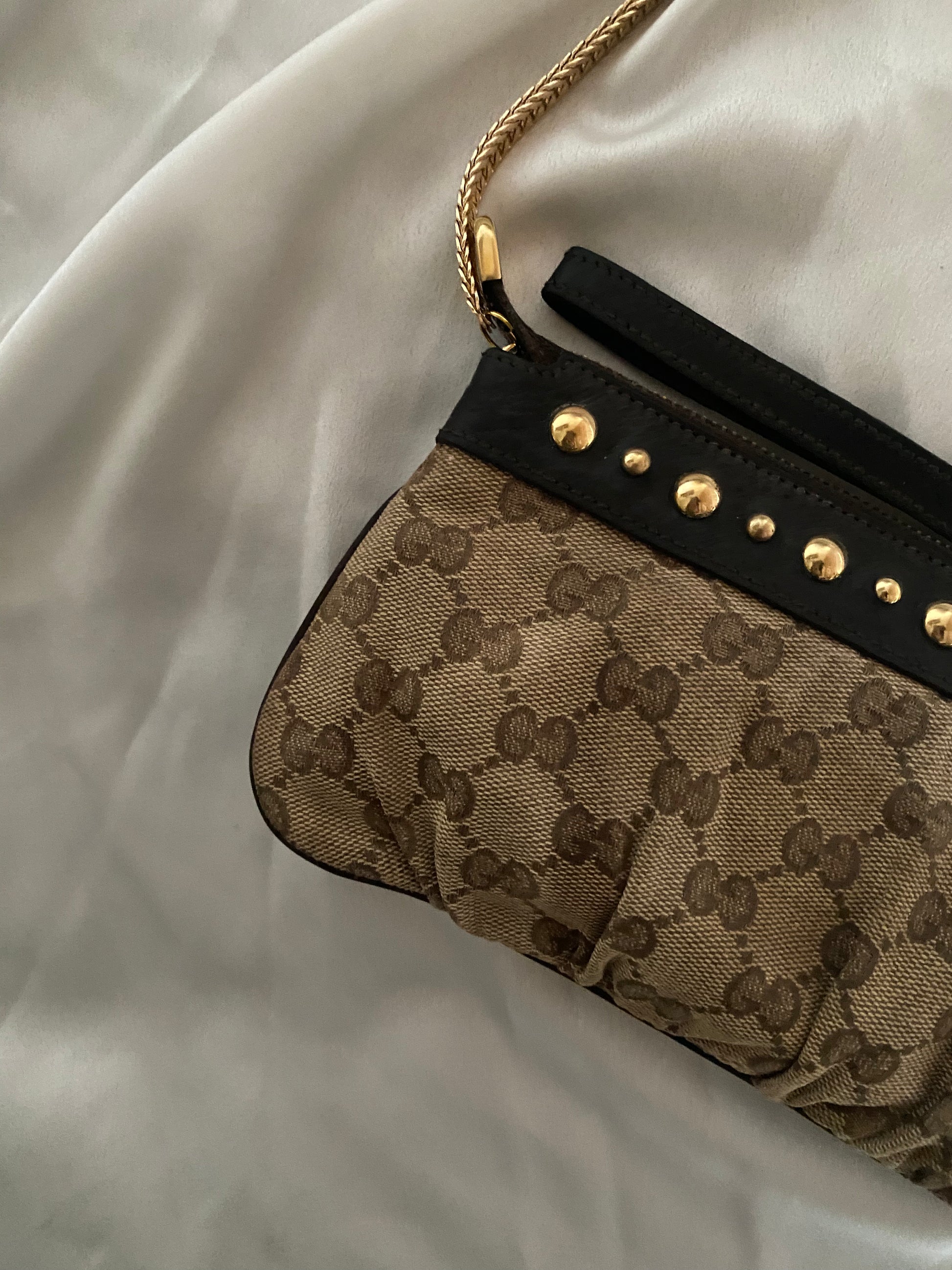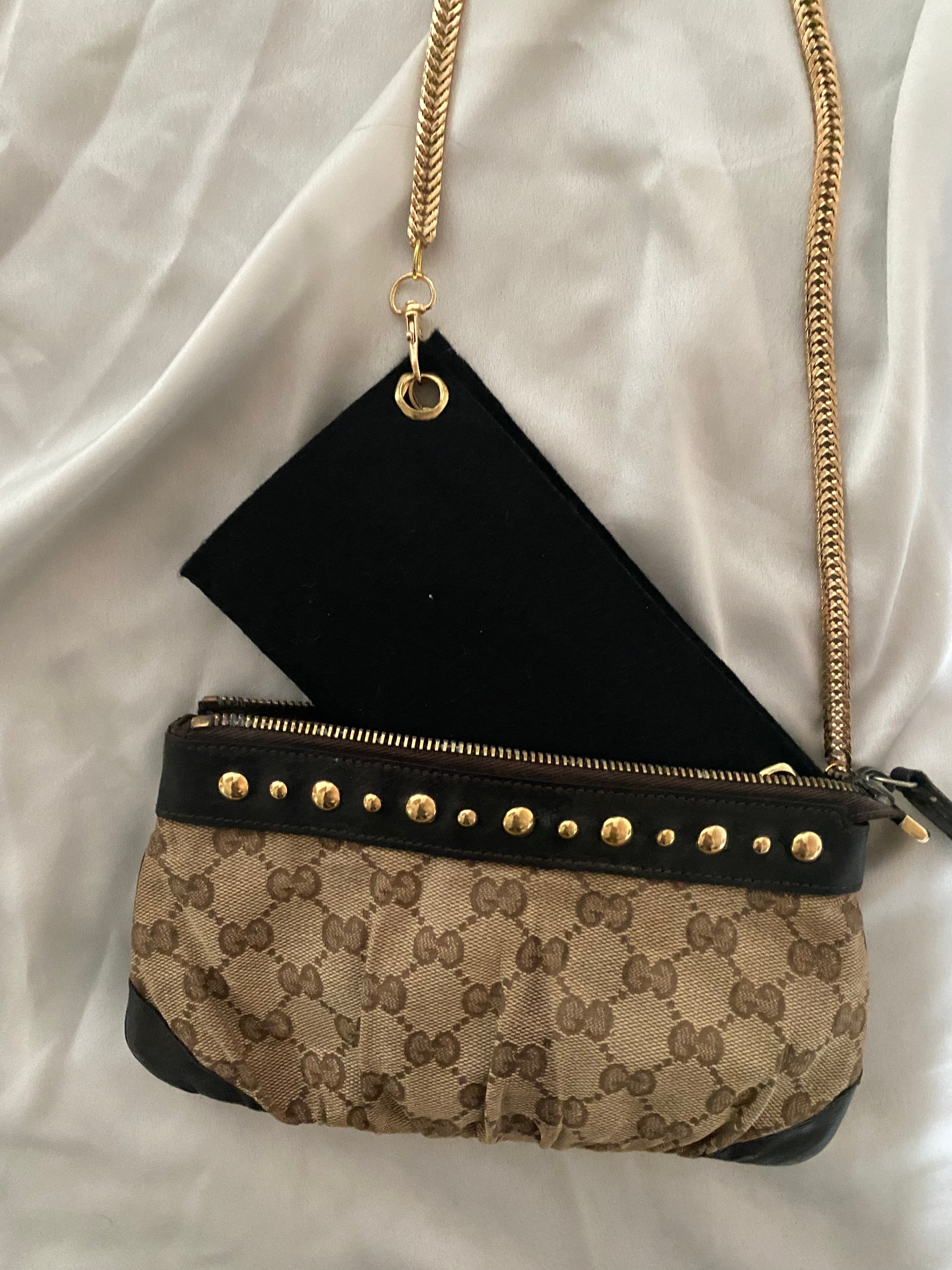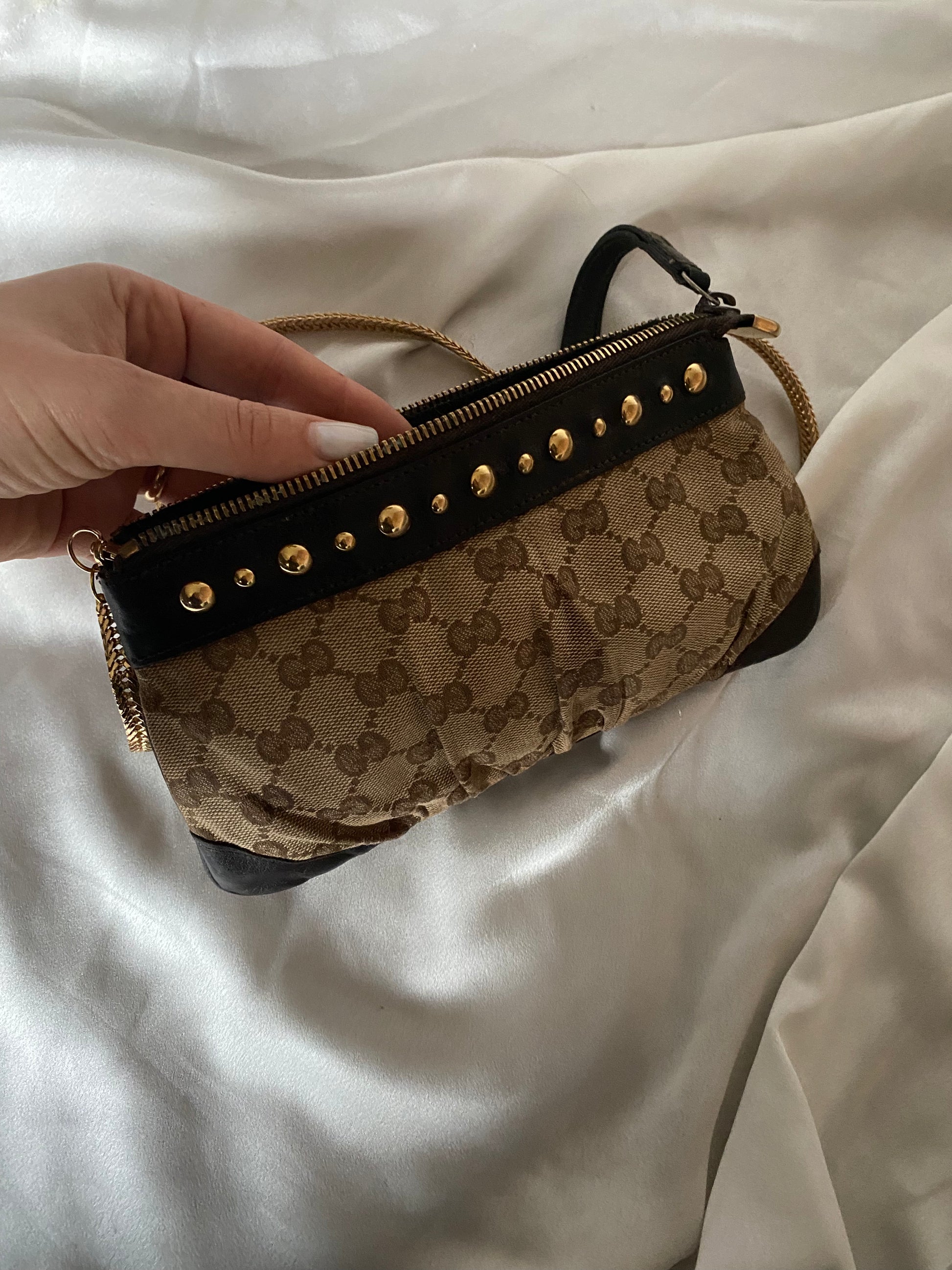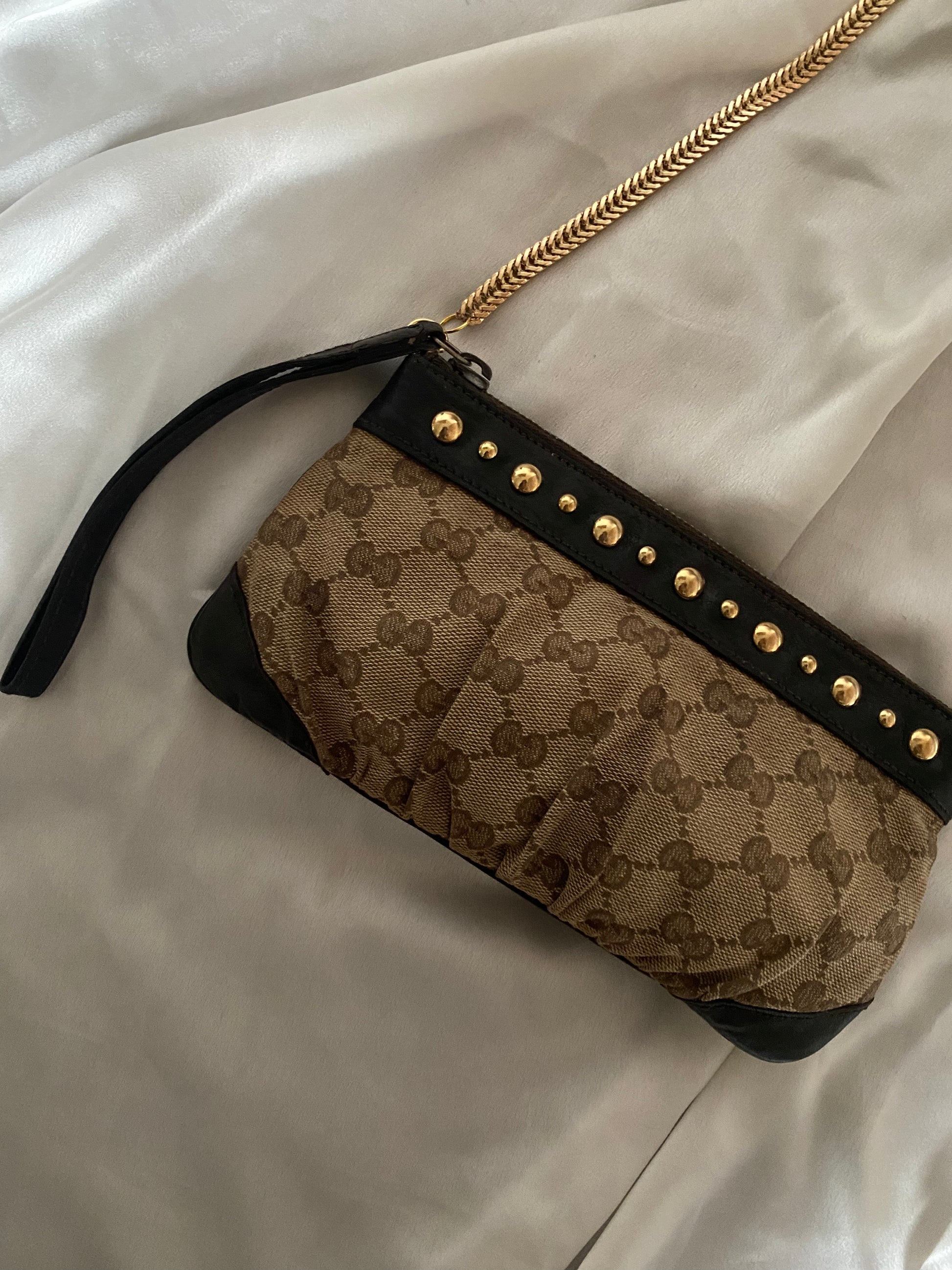 Bellissima pochette gucci in pelle marrone e tela monogram con borchiette placcate in oro 24 carati.